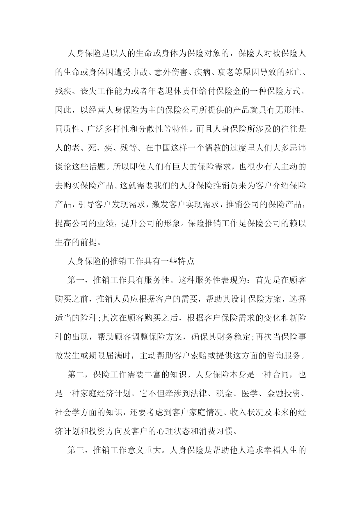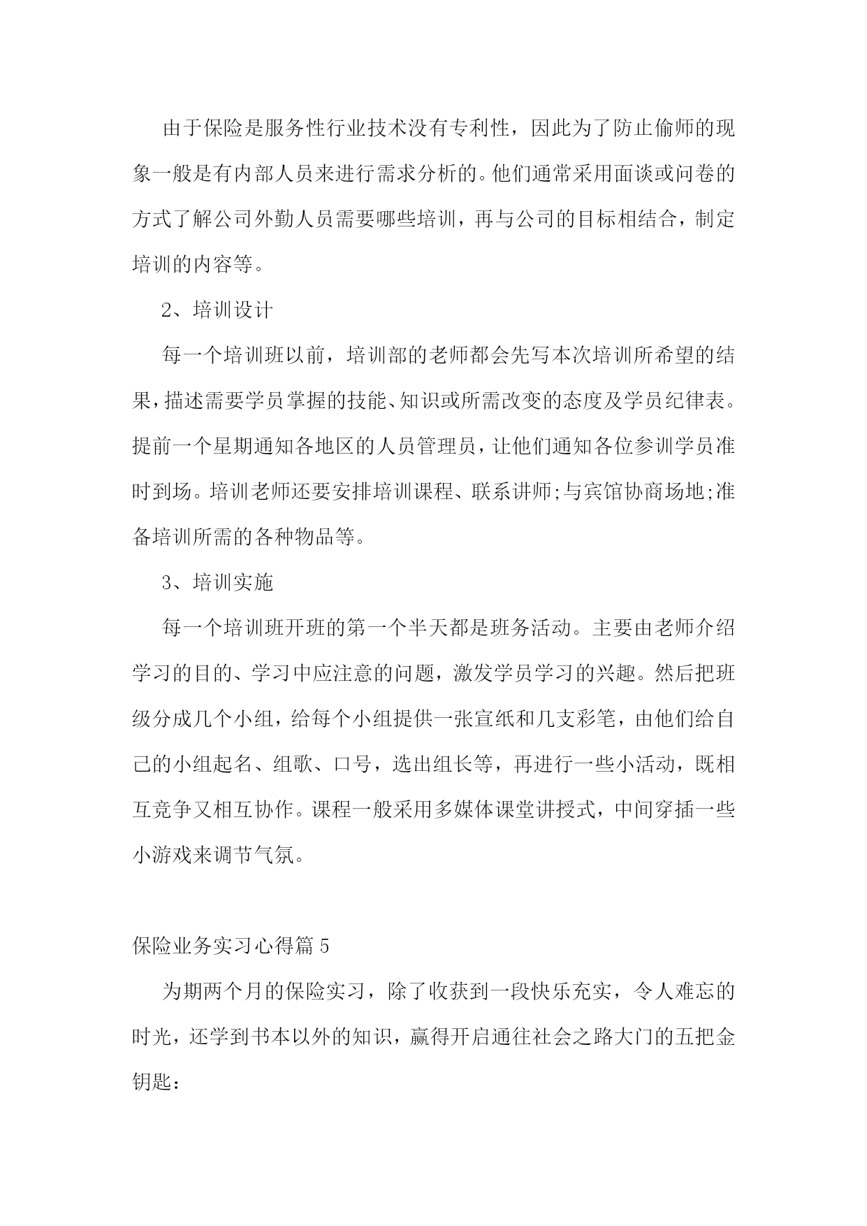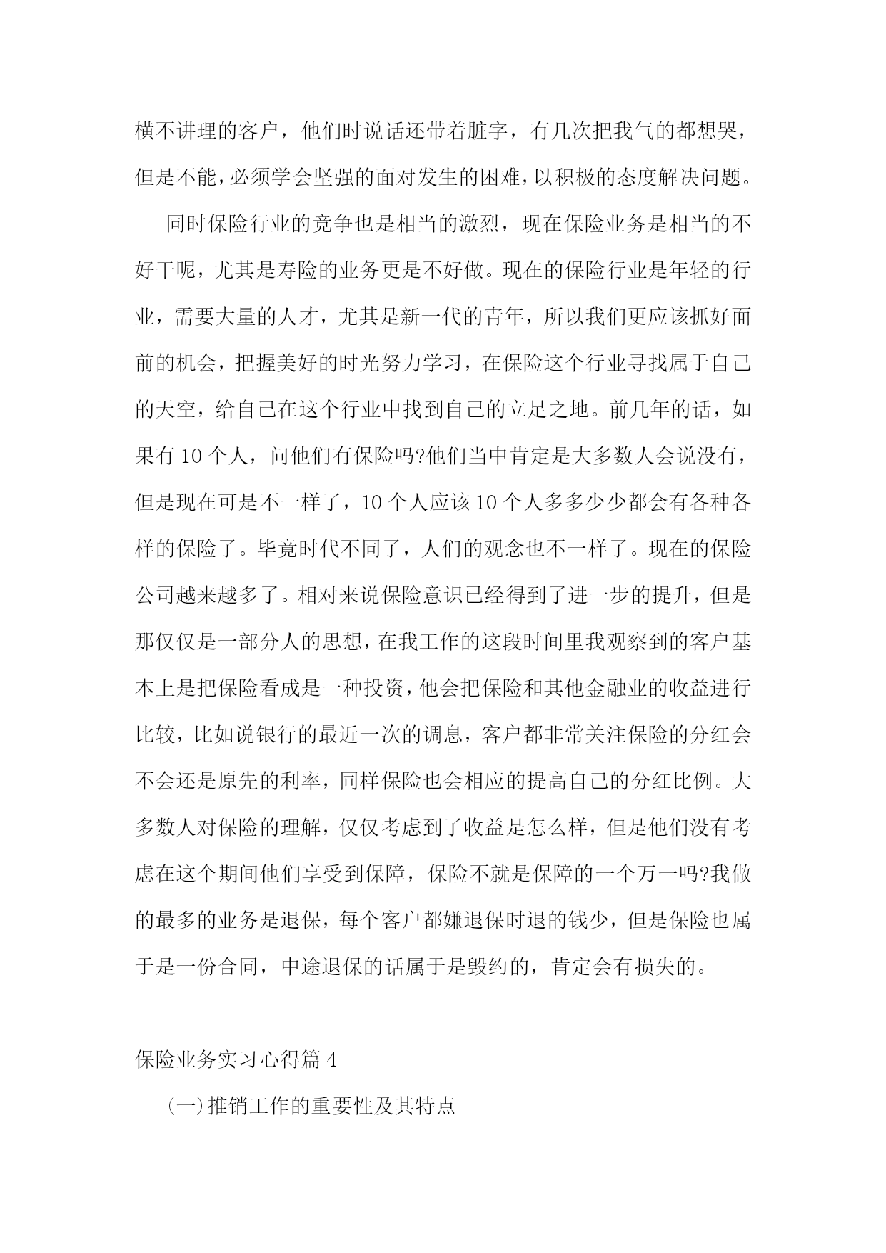 保险业务实习心得保险业务实习心得篇1我的主要工作就是整理档案,算来都是一些很琐碎,比较没有技术含量的事情,可是它同样教会了我许多东西。在外人看来,这样的工作是个人都会做,不就是数数,写字,录入数据嘛,可它也并不如想象中的简单。它难就难在不仅非常繁琐,要足够认真仔细,核对清楚,还有就是工作量大。我和其他11个实习生一起,在狭小的工作间完成了湖北地区从20__年6月到20__年8月的个险、团险、员福档案的整理工作。从将理赔档案按顺序装订成册到装盒,到将数据录入电脑,到最后的装箱,送入仓库,我们的工作包括了这整个流程。别小看这工作,我们在做这个事情的时候还是花了脑筋的。新华保险带我们的老师,每次都只是把一堆工作放在我们面前,再教会我们怎么做就不管了。面对如此多的工作,我们为了提高效率,自觉分工合作,真正尝到了分工合作的甜头,也真正理解了书中常说的,人类社会的进步,就体现在社会劳动的高度分工。还有,在这个过程中,我更学会了如何与人合作,如何融入团队,如何取人之长补己之短。一个人的力量是有限的,集体的力量是无限的。在社会上打拼,要想做成某项事情,一个人都不可能做成功,我们需要其他人的参与,需要发挥团体的力量,而这,就必须有很好的团队合作精神。在团队中,不能过度强调自己的个人作用,每个人都只是这个团体中的一份子,就好像是化合物中的一个构成元素,谁都不能少,谁都起着不可替代的作用。与人相处,最重要的就是沟通,而且要及时沟通,以避免不必要的误会,也有利于做到行动一致。由此看来,选择及时、保险的沟通方式也就尤为重要。面对这个看似很枯燥无趣的工作,我们却觉得充满了乐趣。曾以为犹如28个世纪漫长的28天会把我们折磨死,却突然发现它已经在我们的不知不觉中,伴随着我们的谈笑声悄悄流逝。我们也曾在讨论案例时激烈辩论,但是,我们就事论事,求同存异,并没有把这种纯观点上的意见带到日常相处中。28天下来,我们12个人都成为了朋友,甚至比班上很多已经相处两年的同学还要亲。保险业务实习心得篇2自从X开始在新华人寿保险公司实习以来,到现在已经学习了20天了。虽然自己仍然一个单子也没有做成,还交了400元的各项费用和押金,但是学到了很多东西。在学校里一直认为工作了什么事情就都简单了,不用那么用功学习了,可是在新华的这段时间我发现,越是工作越需要学习。在新华不仅仅新的员工需要学习(比如:保险法的相关知识,考取代理人资格证书以及相关的业务技能培训),而且各个级别的都需要不断的培训学习。而且这里的工作氛围很好,每天都有晨会,大家高高兴兴的一起学习,分享经验,是快乐的工作。在这里,能学到很多的知识保险公司实习心得体会(3篇)保险公司实习心得体会(3篇)。不仅仅是保险的,而且有关理财的知识、人际交往的知识等。退一步说,即使我以后不适合作保险,也锻炼了自己,增强了自身的一些素质。另外,我们新华保险公司有很多的激励机制不断的鼓励我们去奋斗,挑战自我。我感觉不仅仅是作保险需要这样,人的生活也是这样的。以前从没有穿过西服、打过领带,来到公司这些都是需要的(当然,现在去应聘都得这样)。学习了一些基本的礼仪还有针对同行业的竞争,我们是绝不能说一些诋毁的话语。虽然这些都是一些基本的职业道德,但是我却经常听同学说其他保险公司诋毁我们保险公司实习心得体会(3篇)心得体会。这一点我感到很欣慰。一个公司不是把精力放在自夸和贬低对手上,而是切切实实的去为了客户的利益去努力的服务。总之,我是被新华十年的发展速度折服了!他那过硬的产品、深厚的文化氛围等深深地吸引住我了。我会不断的学习,早日成为新华的正式员工!保险业务实习心得篇3通过在X人寿保险公司这段时间的学习,我从这里学到了很多,包括各个方面的。这段时间使自己有了一个很大的提升,在这里我得到了很好的锻炼,非常庆幸自己有一个这么好的机会。在X人寿的时候,我担任的岗位是保全岗,可能有的人还是不太理解这个岗位是干什么的,它主要是和客户打交道的,一切以客户为中心的,在这个岗位你可以接触到形形色色的人物,有的人特别和气,有的人却是特别难对付,在我这段工作的时间内曾经也遇到了一些蛮横不讲理的客户,他们时说话还带着脏字,有几次把我气的都想哭,但是不能,必须学会坚强的面对发生的困难,以积极的态度解决问题。同时保险行业的竞争也是相当的激烈,现在保险业务是相当的不好干呢,尤其是寿险的业务更是不好做。现在的保险行业是年轻的行业,需要大量的人才,尤其是新一代的青年,所以我们更应该抓好面前的机会,把握美好的时光努力学习,在保险这个行业寻找属于自己的天空,给自己在这个行业中找到自己的立足之地。前几年的话,如果有10个人,问他们有保险吗?他们当中肯定是大多数人会说没有,但是现在可是不一样了,10个人应该10个人多多少少都会有各种各样的保险了。毕竟时代不