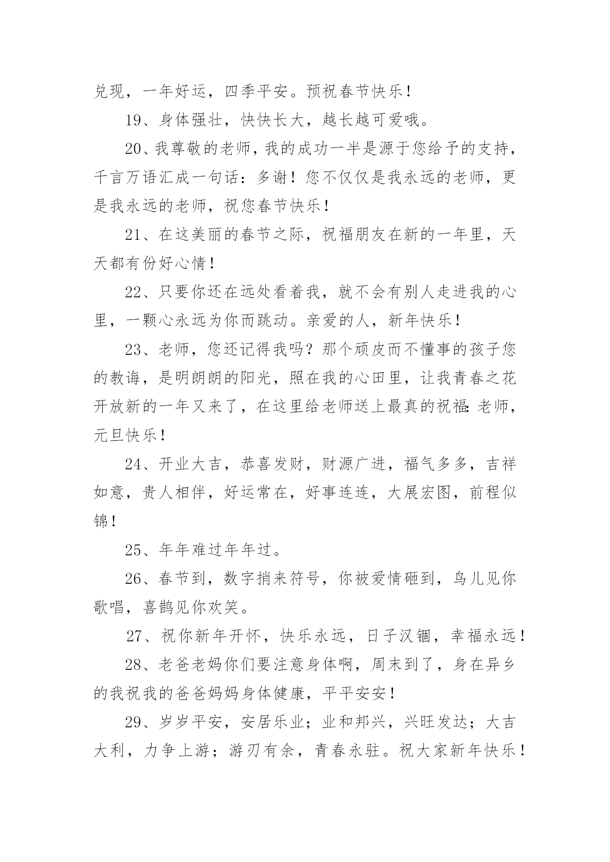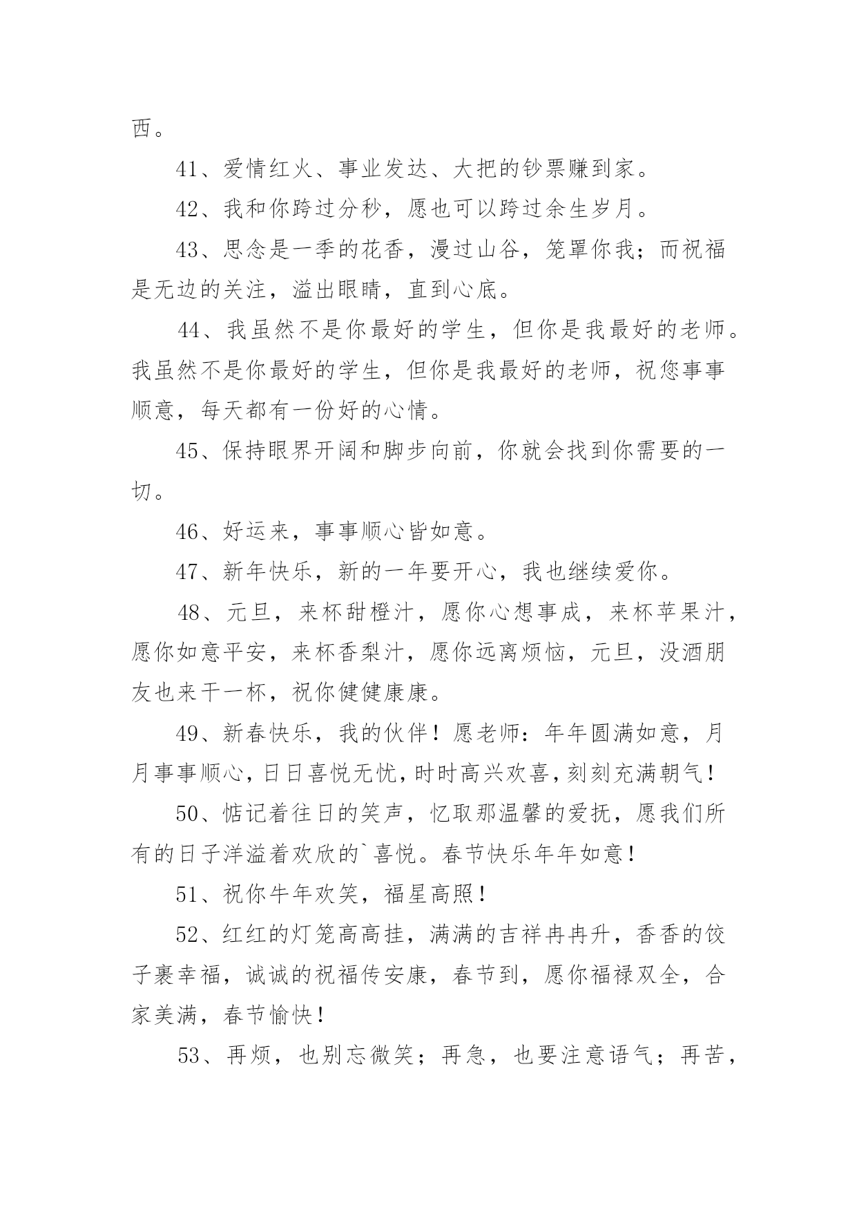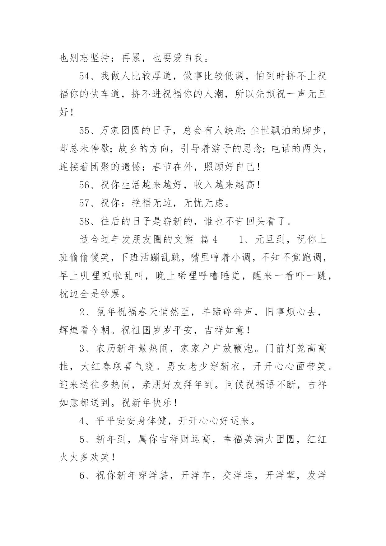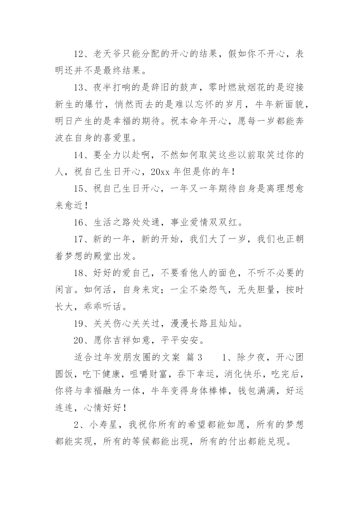 适合过年发朋友圈的文案适合过年发朋友圈的文案在学习、工作乃至生活中,越来越多人喜欢在网上发布文案,文案用于记录和分享生活中有意义的事。还在苦苦寻找优秀经典的文案吗?以下是小编为大家收集的适合过年发朋友圈的文案,欢迎阅读与收藏。适合过年发朋友圈的文案篇11、新年祝愿您:工作舒心,薪水合心,被窝暖心,朋友知心,爱人同心,一切顺心,永远开心,事事称心!2、春节快乐!许个美好的心愿祝你快乐连连!许个美妙的心愿祝你事业圆圆!许个美丽的心愿祝你爱情甜甜!3、春运开始,吉祥号列车已发车,现已沿幸福铁轨,以迅雷不及掩耳的速度,以大站不歇小站不停的气势,向你奔驰而去,将祝福捎给你!祝春节快乐!4、无数的星辰亮起,在天空写下你的名字,当雪花飘落时,就能将我的思念与祝福传送给你!新年快乐!5、把你赞;愿你新春快乐,幸福吉祥每一天!6、不要让别人告诉你,你不能做什么。那些做不到的人总要告诉你,你也不行。只要有梦想,就要去追求。7、朋友的问候是一盏灯,为你点亮心情;朋友的祝福是一把伞,为你遮挡风雨。除夕临近,愿我的.问候和祝福能为你驱散冬日的严寒,带来佳节的温暖!8、春风敲响了新年的大门,春雨滋润了新年的雄心,春雷唤醒了新年的壮志,春花装点了新年的温馨,祝福你在红火火的新年里,财源滚滚,虎年快乐!9、驾照一次通过,教师资格证面试一次通过!!!10、过年期间千万别给我发什么节日祝福,一个红包就可以让我感受到你的诚意。适合过年发朋友圈的文案篇21、愿幸福永远缠着你,本命年到,祝福到,祝你啥都好!2、一世无忧幸福共,灿烂花开正葱茏。3、平安顺利走起,祝本命年愉快。4、新的一年,新的收获,新的期待,新的辉煌。5、平安顺利走起,祝本命年愉快!6、本命年不管犯不冲太岁的,都需要把日子过好,愿平安永随。7、又到今年初,本命年才刚开始,暗自为自己定好这一年的`企业愿景。想说什么,却一句话也说不出口,仿佛遗失了表述的工作能力。爱他人,更好好爱自己。愿五年后,有着更好的自己。8、本命年:恶灵退散,事事顺心。9、一定不要在惦记着本命年运气差了,再不全力以赴就晚了,确实就晚了。10、青春永驻,传承万年。11、阳光明媚月满圆,美景良辰好新春,岁岁当歌随处颂,离落圆号越鼠年,道别鼠年迎牛年,本命年已来,一切事事顺心。12、老天爷只能分配的开心的结果,假如你不开心,表明还并不是最终结果。13、夜半打响的是辞旧的鼓声,零时燃放烟花的是迎接新生的爆竹,悄然而去的是难以忘怀的岁月,牛年新面貌,明日产生的是幸福的期待。祝本命年开心,愿每一岁都能奔波在自身的喜爱里。14、要全力以赴啊,不然如何取笑这些以前取笑过你的人,祝自己生日开心,20xx年但是你的年!15、祝自己生日开心,一年又一年期待自身是离理想愈来愈近!16、生活之路处处通,事业爱情双双红。17、新的一年,新的开始,我们大了一岁,我们也正朝着梦想的殿堂出发。18、好好的爱自己,不要看他人的面色,不听不必要的闲言。如何活,自身来定;一尘不染怨气,无失胆量,按时长大,乖乖听话。19、关关伤心关关过,漫漫长路且灿灿。20、愿你吉祥如意,平平安安。适合过年发朋友圈的文案篇31、除夕夜,开心团圆饭,吃下健康,咀嚼财富,吞下幸运,消化快乐,吃完后,你将与幸福融为一体,牛年变得身体棒棒,钱包满满,好运连连,心情好好!2、小寿星,我祝你所有的希望都能如愿,所有的梦想都能实现,所有的等候都能出现,所有的付出都能兑现。3、老师,大家都说您培养着祖国的栋梁;我却要说,您就是祖国的栋梁。正是您,支撑起我们一代人的脊梁!祝老师元旦快乐,阖家幸福!4、祝福是份真心意,不是千言万语的表白。一首心曲,愿姐姐你年年平安,岁岁如意!5、祝你,诸事顺利,诸事顺心。6、新春到来菩萨忙,各路神仙送吉祥,亲爱的,愿福星伴你走四方!春节快乐!7、我的祝福发出去,好运财富都找你。8、您的声音,总在我耳畔响起;您的教诲,常驻在我心田。新年到了,也要送上我的祝福,老师,新年快乐!9、新春又至,祝你新一年里一切随愿!10、要过年啦,愿顺遂,愿安康。11、带着祝福来拜年,愿老师今后多赚钱,好运不断喜事紧相连;带着开心贺新岁,愿老师春花开富贵,工作不累,生活陶醉!12、元旦表示年新的一年,新的开始,万事从头起,良好的开端是成功的一半祝你永远是成功者。13、愿你把回忆留给过去,把幸福带进本命年!14、老爸老妈你们要注意身体啊,周末到了,身在异乡的我祝我的爸爸妈妈身体健康,平平安安!15、鼠年祝福春天悄然至,羊蹄碎碎声,旧事烦心去,辉煌看今朝。祝祖国岁岁平安,吉祥如意!16、以真挚热诚的祝愿,在春节之际表示思念之情。祝春节快乐,新年快乐!17、新年快到了,我怕我的祝福没有悍马的力度;奔驰的速度;宝马的风度。无法挤上短信的高速公路,只好让信息驼着我的祝福即刻上路。18、又是一年春来到,祝福满