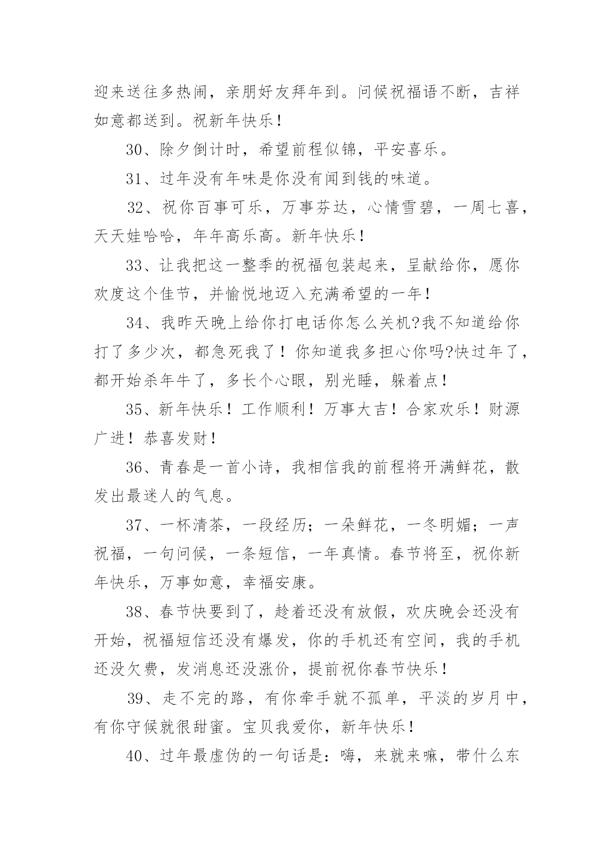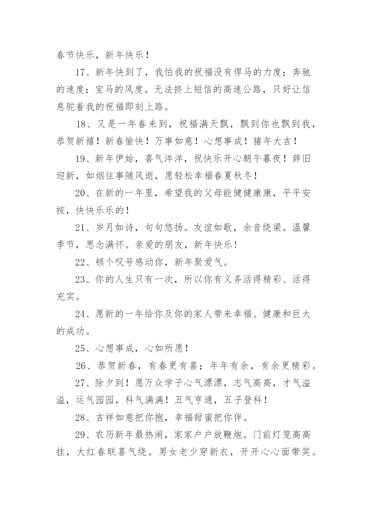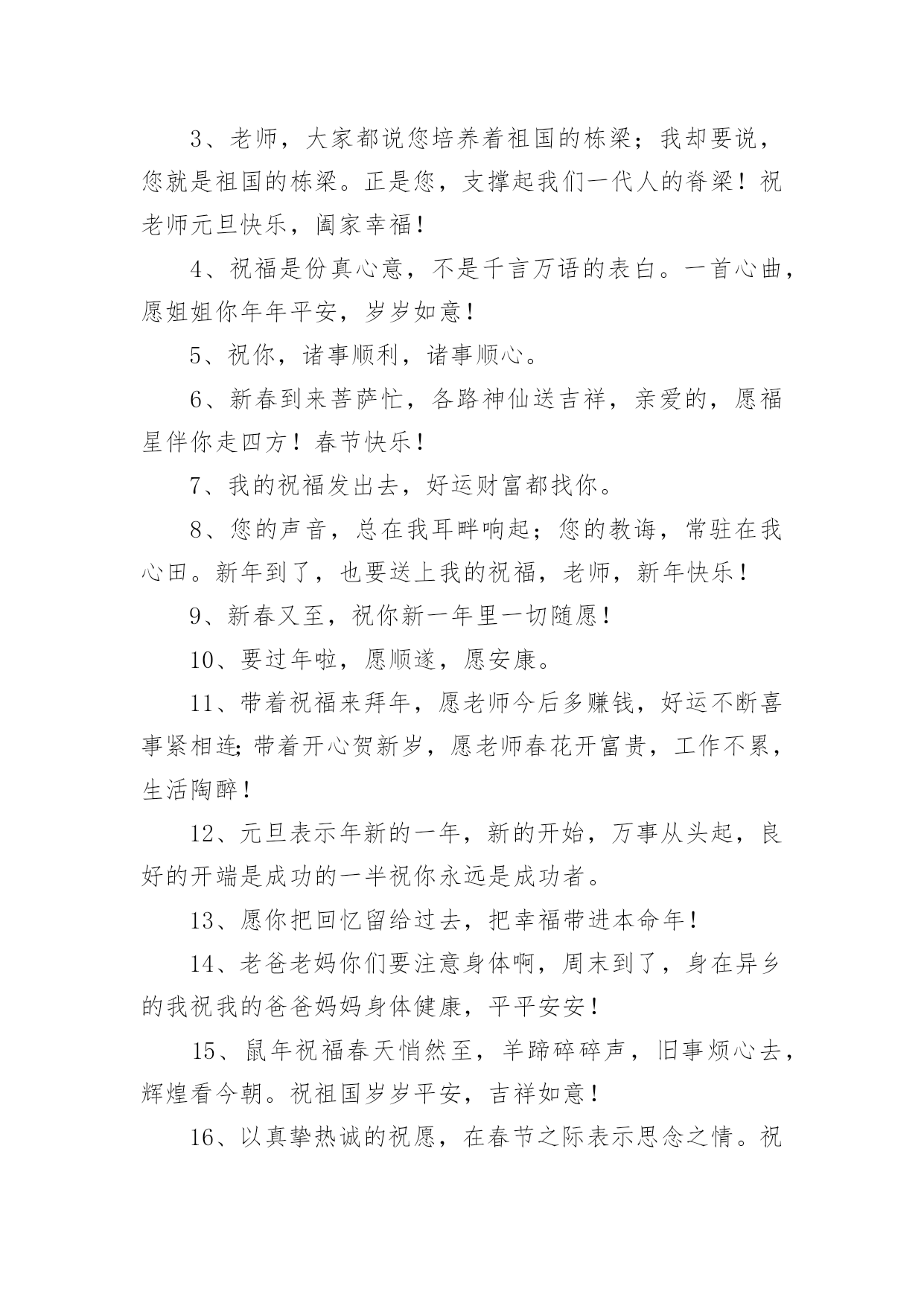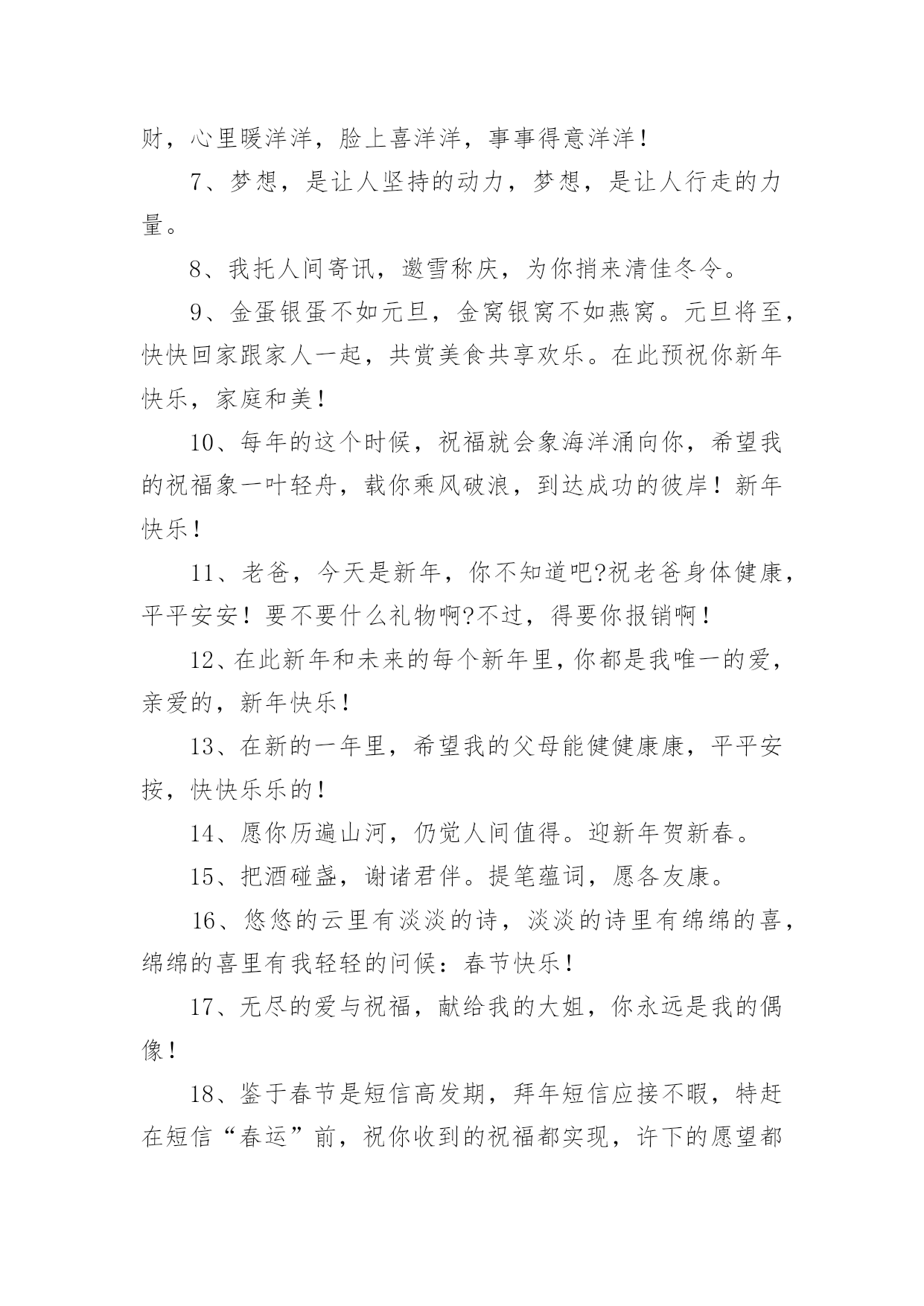 适合过年发朋友圈的文案适合过年发朋友圈的文案在学习、工作乃至生活中,越来越多人喜欢在网上发布文案,文案用于记录和分享生活中有意义的事。还在苦苦寻找优秀经典的文案吗?以下是小编为大家收集的适合过年发朋友圈的文案,欢迎阅读与收藏。适合过年发朋友圈的文案篇11、新年祝愿您:工作舒心,薪水合心,被窝暖心,朋友知心,爱人同心,一切顺心,永远开心,事事称心!2、春节快乐!许个美好的心愿祝你快乐连连!许个美妙的心愿祝你事业圆圆!许个美丽的心愿祝你爱情甜甜!3、春运开始,吉祥号列车已发车,现已沿幸福铁轨,以迅雷不及掩耳的速度,以大站不歇小站不停的气势,向你奔驰而去,将祝福捎给你!祝春节快乐!4、无数的星辰亮起,在天空写下你的名字,当雪花飘落时,就能将我的思念与祝福传送给你!新年快乐!5、把你赞;愿你新春快乐,幸福吉祥每一天!6、不要让别人告诉你,你不能做什么。那些做不到的人总要告诉你,你也不行。只要有梦想,就要去追求。7、朋友的问候是一盏灯,为你点亮心情;朋友的祝福是一把伞,为你遮挡风雨。除夕临近,愿我的.问候和祝福能为你驱散冬日的严寒,带来佳节的温暖!8、春风敲响了新年的大门,春雨滋润了新年的雄心,春雷唤醒了新年的壮志,春花装点了新年的温馨,祝福你在红火火的新年里,财源滚滚,虎年快乐!9、驾照一次通过,教师资格证面试一次通过!!!10、过年期间千万别给我发什么节日祝福,一个红包就可以让我感受到你的诚意。适合过年发朋友圈的文案篇21、愿幸福永远缠着你,本命年到,祝福到,祝你啥都好!2、一世无忧幸福共,灿烂花开正葱茏。3、平安顺利走起,祝本命年愉快。4、新的一年,新的收获,新的期待,新的辉煌。5、平安顺利走起,祝本命年愉快!6、本命年不管犯不冲太岁的,都需要把日子过好,愿平安永随。7、又到今年初,本命年才刚开始,暗自为自己定好这一年的`企业愿景。想说什么,却一句话也说不出口,仿佛遗失了表述的工作能力。爱他人,更好好爱自己。愿五年后,有着更好的自己。8、本命年:恶灵退散,事事顺心。9、一定不要在惦记着本命年运气差了,再不全力以赴就晚了,确实就晚了。10、青春永驻,传承万年。11、阳光明媚月满圆,美景良辰好新春,岁岁当歌随处颂,离落圆号越鼠年,道别鼠年迎牛年,本命年已来,一切事事顺心。12、老天爷只能分配的开心的结果,假如你不开心,表明还并不是最终结果。13、夜半打响的是辞旧的鼓声,零时燃放烟花的是迎接新生的爆竹,悄然而去的是难以忘怀的岁月,牛年新面貌,明日产生的是幸福的期待。祝本命年开心,愿每一岁都能奔波在自身的喜爱里。14、要全力以赴啊,不然如何取笑这些以前取笑过你的人,祝自己生日开心,20xx年但是你的年!15、祝自己生日开心,一年又一年期待自身是离理想愈来愈近!16、生活之路处处通,事业爱情双双红。17、新的一年,新的开始,我们大了一岁,我们也正朝着梦想的殿堂出发。18、好好的爱自己,不要看他人的面色,不听不必要的闲言。如何活,自身来定;一尘不染怨气,无失胆量,按时长大,乖乖听话。19、关关伤心关关过,漫漫长路且灿灿。20、愿你吉祥如意,平平安安。适合过年发朋友圈的文案篇31、除夕夜,开心团圆饭,吃下健康,咀嚼财富,吞下幸运,消化快乐,吃完后,你将与幸福融为一体,牛年变得身体棒棒,钱包满满,好运连连,心情好好!2、小寿星,我祝你所有的希望都能如愿,所有的梦想都能实现,所有的等候都能出现,所有的付出都能兑现。3、老师,大家都说您培养着祖国的栋梁;我却要说,您就是祖国的栋梁。正是您,支撑起我们一代人的脊梁!祝老师元旦快乐,阖家幸福!4、祝福是份真心意,不是千言万语的表白。一首心曲,愿姐姐你年年平安,岁岁如意!5、祝你,诸事顺利,诸事顺心。6、新春到来菩萨忙,各路神仙送吉祥,亲爱的,愿福星伴你走四方!春节快乐!7、我的祝福发出去,好运财富都找你。8、您的声音,总在我耳畔响起;您的教诲,常驻在我心田。新年到了,也要送上我的祝福,老师,新年快乐!9、新春又至,祝你新一年里一切随愿!10、要过年啦,愿顺遂,愿安康。11、带着祝福来拜年,愿老师今后多赚钱,好运不断喜事紧相连;带着开心贺新岁,愿老师春花开富贵,工作不累,生活陶醉!12、元旦表示年新的一年,新的开始,万事从头起,良好的开端是成功的一半祝你永远是成功者。13、愿你把回忆留给过去,把幸福带进本命年!14、老爸老妈你们要注意身体啊,周末到了,身在异乡的我祝我的爸爸妈妈身体健康,平平安安!15、鼠年祝福春天悄然至,羊蹄碎碎声,旧事烦心去,辉煌看今朝。祝祖国岁岁平安,吉祥如意!16、以真挚热诚的祝愿,在春节之际表示思念之情。祝春节快乐,新年快乐!17、新年快到了,我怕我的祝福没有悍马的力度;奔驰的速度;宝马的风度。无法挤上短信的高速公路,只好让信息驼着我的祝福即刻上路。18、又是一年春来到,祝福满