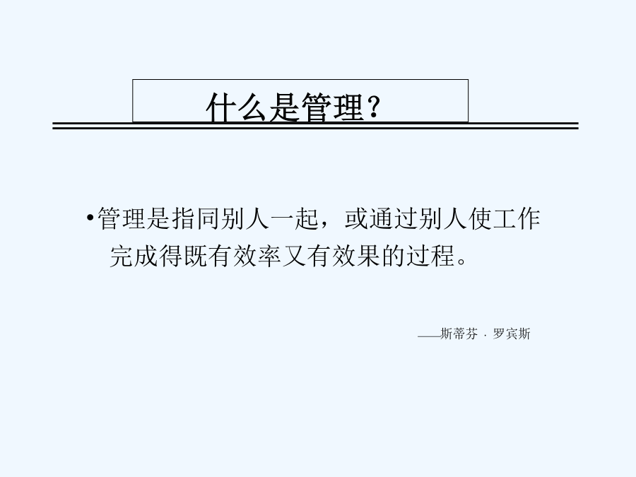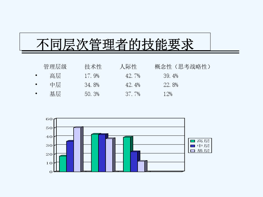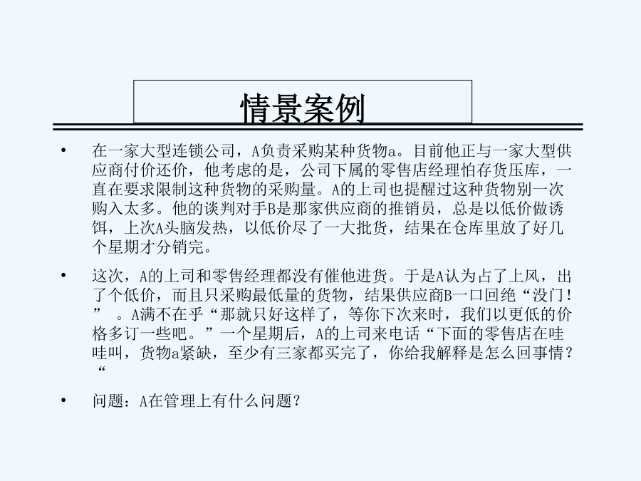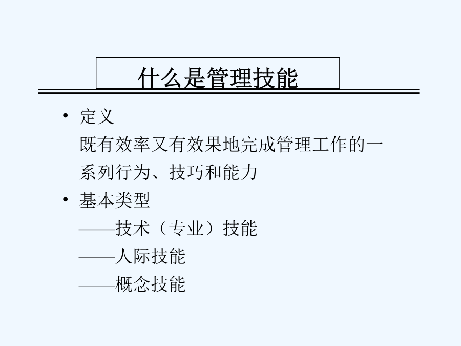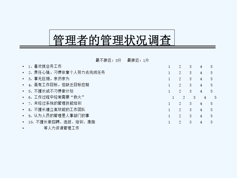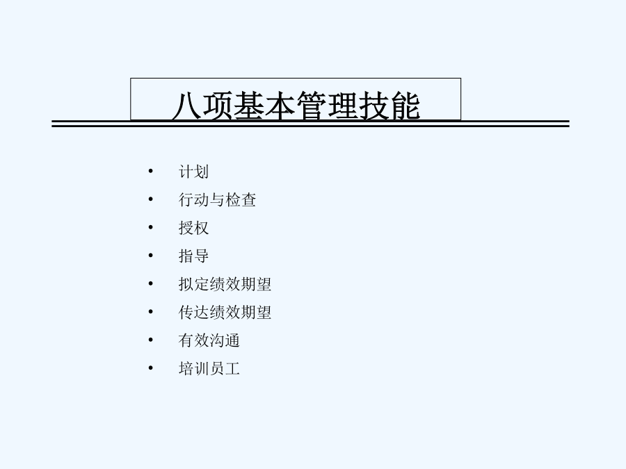 八项基本管理技能讲义关于我自己管理者的管理状况调查什么是管理?管理追求效率和效果什么是管理技能不同层次管理者的技能要求大家应该也有点累了,稍作休息情景案例八项基本管理技能第一单元计划学习重点学习目的案例人物示意图案例讨论:行动计划案例讨论:错误的出发点为什么不愿意制定计划?制定计划的好处制定计划的七个因素制定计划的七个因素目标的SMART原则制定计划的七个因素制定计划的七个因素制定计划的七个因素制定计划的七个因素制定计划的七个因素制定计划的七个因素什么是制定计划的七个因素?制定计划的七个因素管理者坦言计划的完整周期:PDCA管理技能的总结:计划第二单元行动和检查学习重点学习目的缺失的一环:从目标到结果时间管理MINT问卷时间管理MINI问卷总结你的时间控制案例讨论:像我这样的人案例讨论:出色的计划者怎样应付“救火”现象?怎样应付“救火”现象?怎样应付“救火”现象?完成任务的行动步骤行动步骤一行动步骤二旅行计划的优先顺序最新优先顺序行动步骤三时间管理象限图时间管理象限图举例时间管理象限图:事务分类价值25000美元的建议互动:拼图游戏为什么需要检查?检查工作的技巧管理技能的总结:行动与检查第三单元授权学习重点学习目的亨利·福特:对与错亨利·福特:对与错亨利·福特:对与错管理者坦言案例讨论:激励案例讨论:提高你的效率授权的必要性授权的好处领导者不授权的原因如何进行授权什么样的任务可以授权对什么人进行授权授权的不同程度如何进行授权授权的八大原则授权不是授责授权的风险与控制授权的要诀管理技能的总结:授权第四单元指导学习重点学习目的案例讨论:不仅仅只是问案例讨论:制定细节指导的形式为什么有些员工不愿意接受指导指导的4C原则尽量不使用对方不理解的术语用浅显易懂的语言交流准确详尽讲明自已的观点尽量提供明确的信息尽量提供简洁的信息必须提供关键的信息尽量提供全面的信息考虑员工的实际情况如何给予适合个人的指导采用何种合适的方法如何指导员工有效管理时间给予指导的六个步骤反馈时的三个特征反馈的两种类型重点:指导的4C原则管理技能的总结:指导第五单元拟定绩效期望学习重点学习目的案例讨论:流砂拟定绩效期望的两个方面拟定绩效期望的好处制定职位说明书的原则职位说明书的基本内容如何制定有效的绩效目标绩效目标的SMART原则应该避免使用的词汇精确的评估“员工应该随时表现出紧迫感。”“接到客户的投诉电话后,相关工作人员应该在30分钟内为客户解决问题。”“在明年1月1日前,尽量减少当前经营所需的固定成本。”“在不增加费用的前提下,于11月15日前男用手表的销售量增加8%。”案例:绩效期望不同的冲突管理技能的总结:拟定绩效期望第六单元传达绩效期望学习重点学习目的案例讨论:完美主义者案例讨论:表扬表扬与批评员工的艺术案例:批评的艺术绩效不佳:问题背后的问题传达绩效期望的原则宽容不合标准的绩效会降低整个团队的工作效率绩效的区别考评制度管理技能的总结:传达绩效期望第七单元有效沟通学习重点学习目的管理就是沟通角色扮演活动案便讨论:事实就是事实什么是沟通?有效沟通的目标有效沟通的基本原则有效沟通:说的艺术有效沟通:听的艺术有效沟通的障碍错觉:她是谁?错觉:a与b,哪个大?有效沟通七步法管理技能的总结:沟通第八单元培训员工学习重点学习目的技术培训的五个步骤什么是培训培训的内容案例研究:躁动演出如何进行员工培训S.M.A.R.T.P.E.R.S.O.N.法则管理者坦言管理技能的总结:培训员工八项基本管理技能管理技能:自我总结成功管理者的三个关键管理者要练好基本功管理者要从改变自己开始管理者要以结果为中心