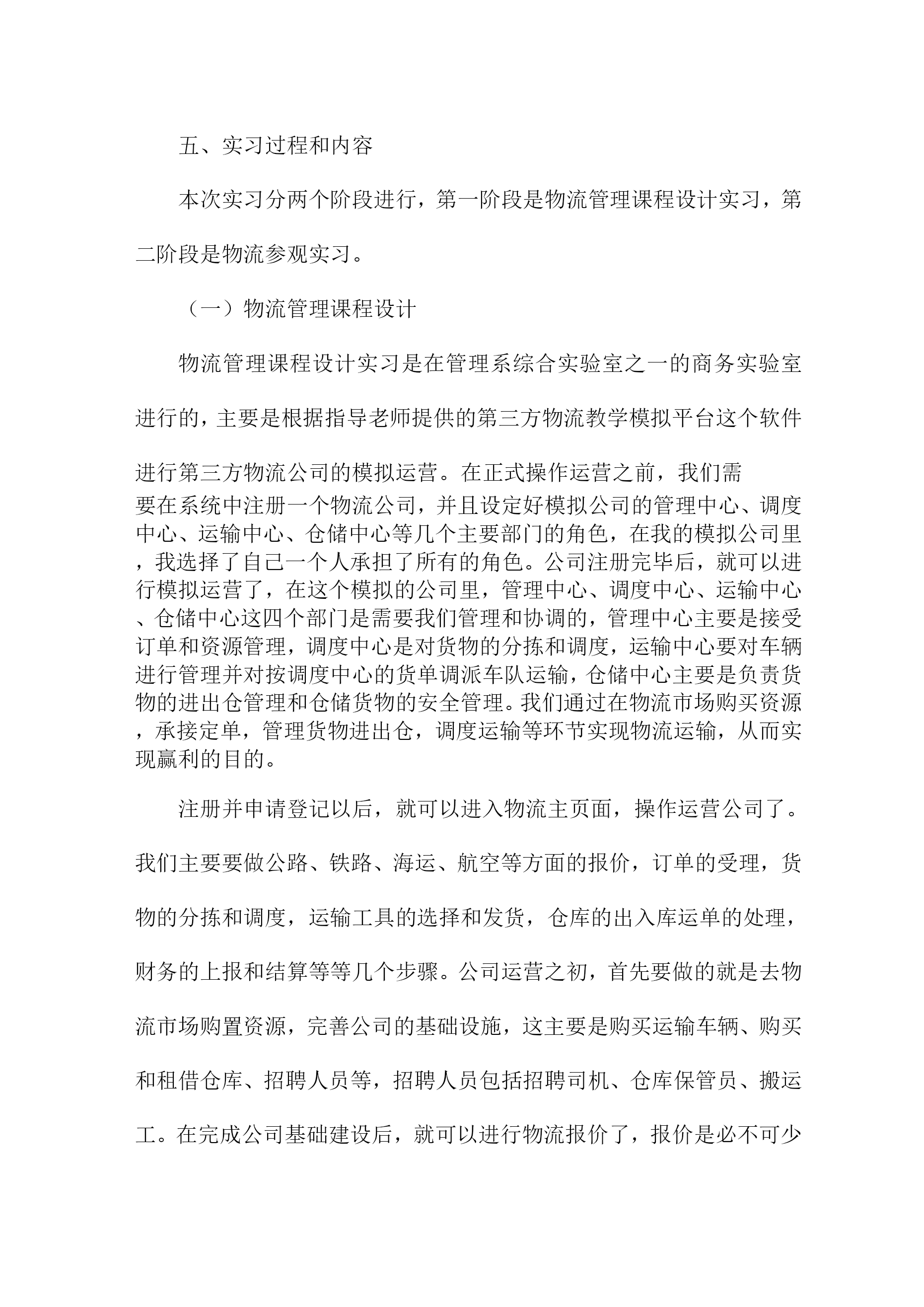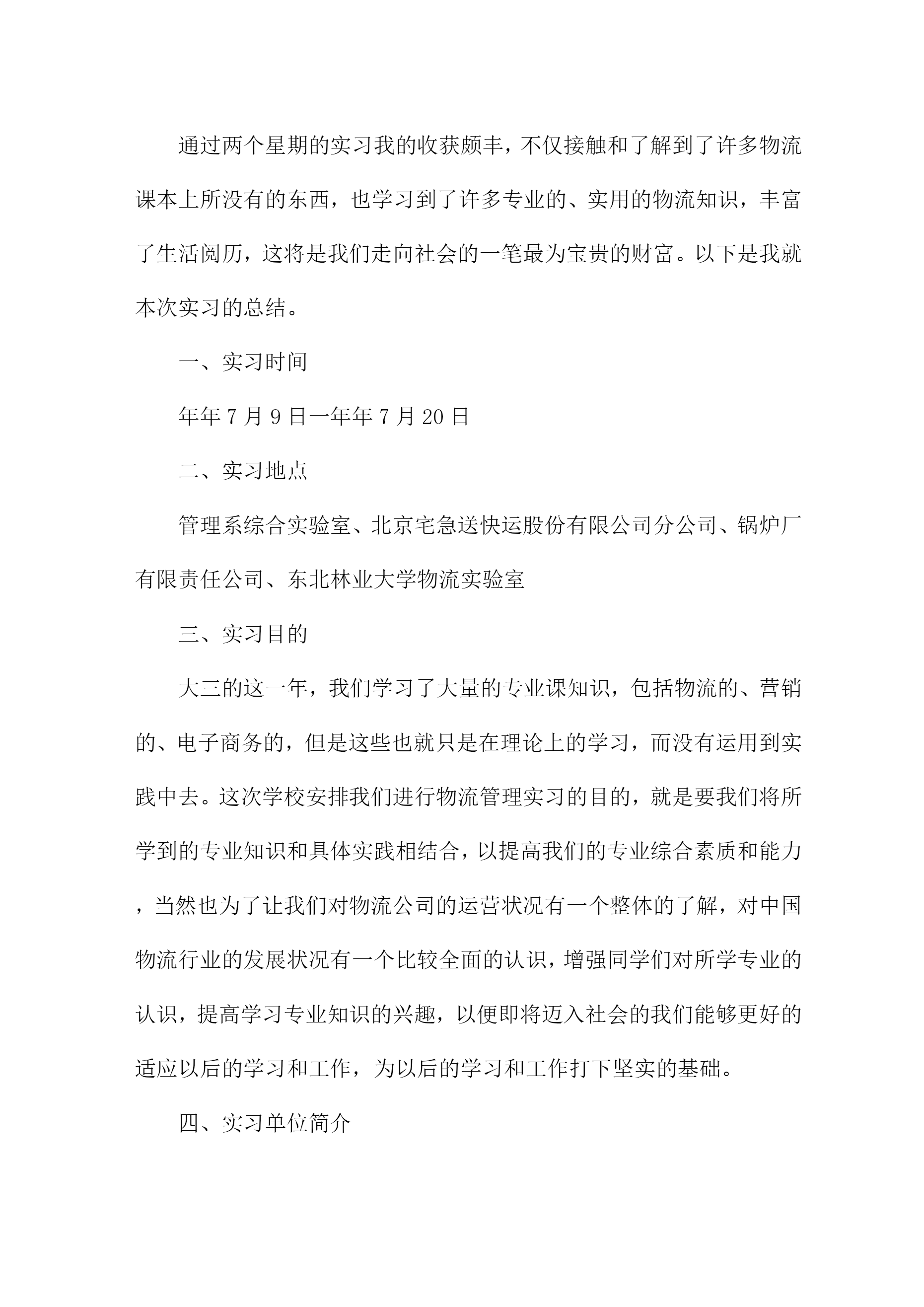 物流实习总结范文(5篇)物流实习总结范文精选篇1一、实习的目的:经过两年系统的物流理论知识的学习,对物流定义、基本功能、各个作业流程有了一定的理论知识的了解,通过实习希望能够使理论和实践进行相结合,在实践中提高运用知识的能力。二、公司的概况张家港天澜百货是一家初具规模的百货连锁企业,主要经营服装、饰品、鞋子等生活用品。主要针对15到35岁的中低消费客户群体。本着让更多人漂亮起来的经营理念,经营宗旨是尽我们的努力帮助顾客获得最有价值的商品和享受快乐的服务。在将近十余年的时间里连锁店已经覆盖张家港、扬中、江阴、昆山、扬州、兴化、盛泽、启东、通州、宜兴等多个城市。三、实习环境实习期间,我是在天澜百货的物流部的制单组担任制单员一职,主要从事的工作就是负责把采购部门采购过来的货品归类之后以最快的速度发往店铺。在物流部分为三个组:制单组、仓库组、理货组,总共有40余人。四、实习过程了解过程起初,刚刚来到这里的时候,这里的一切对我来说都是陌生的。这里的工作环境也不是非常的好,呈现在我眼前的一切都是那么的茫然。第一天的时间里制单组长给我安排了办公位置和一些日常工作中需要的用品等等。把一些工作中的注意事项和最基本的流程用a4纸打印出来,先自己熟悉一下。然后把公司的软件erp每个模块让我熟悉一下。实习的第一天,我熟悉了我的岗位的大概,体验到社会上工作的感觉,在工作地同时慢慢的熟悉整个部门熟悉整个公司的文化。作为初次到社会上去工作的学生来说,对于社会的了解以及工作单位各方面的情况的了解都是极其陌生的。一开始我对公司的各种规章制度和制单员的基本流程都不了解,于是我就慢慢的翻阅公司的考勤制度等等,想制单组的同事们请教了解工作中的相关事项,通过他们的帮助,我对自己的工作很快就能顺利的操作了。不过就是在操作的过程中会时不时的出现错误,给同事们造成不必要的麻烦,心里很是过意不去,但我相信我一定可以突破自己,能够在工作中取得优异的成绩的。摸索过程对物流部环境有所了解和熟悉后,开始有些紧张的心开始平静下来,工作期间,每天按时上班,上班工作之前公司的所有成员要集合到一块开会,讲讲小故事大道理,玩玩游戏,这样可以激发我们的斗志。之后我们就会回到各自的岗位上进行工作。采购差不多每天都会有货品会来,我们就要每天做好准备输单。输单最基本的步骤就是在erp的上找到采购订单录入一采购入库录入一采购分货录入这三个模块是用的最多的,然后电脑会自动汇总我们在打印分店分货单,对每家的货品进行手工对货,如果数据全部是正确的就可以把数据下发到店铺。这是我作为一个制单员要学会的最最基本的东西。(3)熟练掌握,并能负起相应的责任在物流部的制单组的两个月的时间的学习我能够熟练的操作衣服、饰品、鞋子的采购登记单的录入,并且自己对每天所学的知识进行相应的记录总结。对制单的流程的总结如下:这是增资料的一个界面,里面特别注意的就是吊牌价。在制单员的工作中,需要注意的事项很多很多,每次我都是在犯过一次错误之后才知道这样的事情是不允许发生的。例如:在起初的增资料中,要十分十分的仔细,稍一不留神就会把进价增城卖价,这样一来会给公司造成很大的损失。物流实习总结范文精选篇2一、实习目的为了以后能更好的适应工作和学习,为期30天的实习。主要是熟悉物流的作业流程,掌握物流的工作流程,以便对我国的物流业能有更深的了解。二、实习要求了解物流特点,物流工作流程,工作设备,并针对这些实践依靠自我所学的理论提出自我的观点和看法。三、实习感想随着世界经济一体化步伐的加快,国际经济贸易发展日益活跃,我国的物流行业得到迅速发展。虽然这次实习时间很短,却给我上了人生历程中不可或缺的一课。对于物流,我只是明白它是集:运输、储存、搬运、包装、流通加工、配送、信息处理等基本功能实施的有机结合。但没有想到它的实际操作却没有这么的简单。透过十一点作为国人的物流人士有着切肤的体会。货物运转速度慢,货差货损率高难以避免,高层货架利用率严天的简单了解,使我对于物流配送有了更加深刻的认识。中国的物流业虽然没有国外发达,但这并代表中国物流业的落后,一些原则性[譬如中国劳动力廉价的国情]严重的制约了中国物流业信息技术化的发展速度。野蛮的装卸态度更是制约中国物流业发展的瓶颈之一。这次实习让我从实践中了解到了物流,使实践与理论更好的结合。在那里我深刻的领悟到了一个观点:推动你的事业,不要让你的事业来推动你。四、实习结论及推荐1、进货堆放货物时不能只顾着一时的方便,就应思考到出货时的方便,不能耽误客户的时间,因此要按照标准把货物堆起,堆放要整齐合理,以免倒塌。2、要严格按照仓储管理的要求,对于过期的货物要及时与厂家联系,并得到应允后及时销毁,不要堆积在仓库中,浪费仓库容积,更不要和正常的商品同放一齐