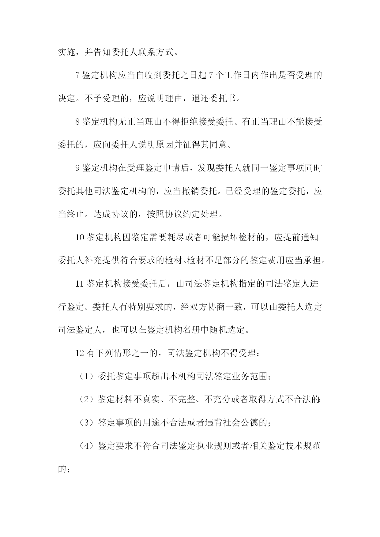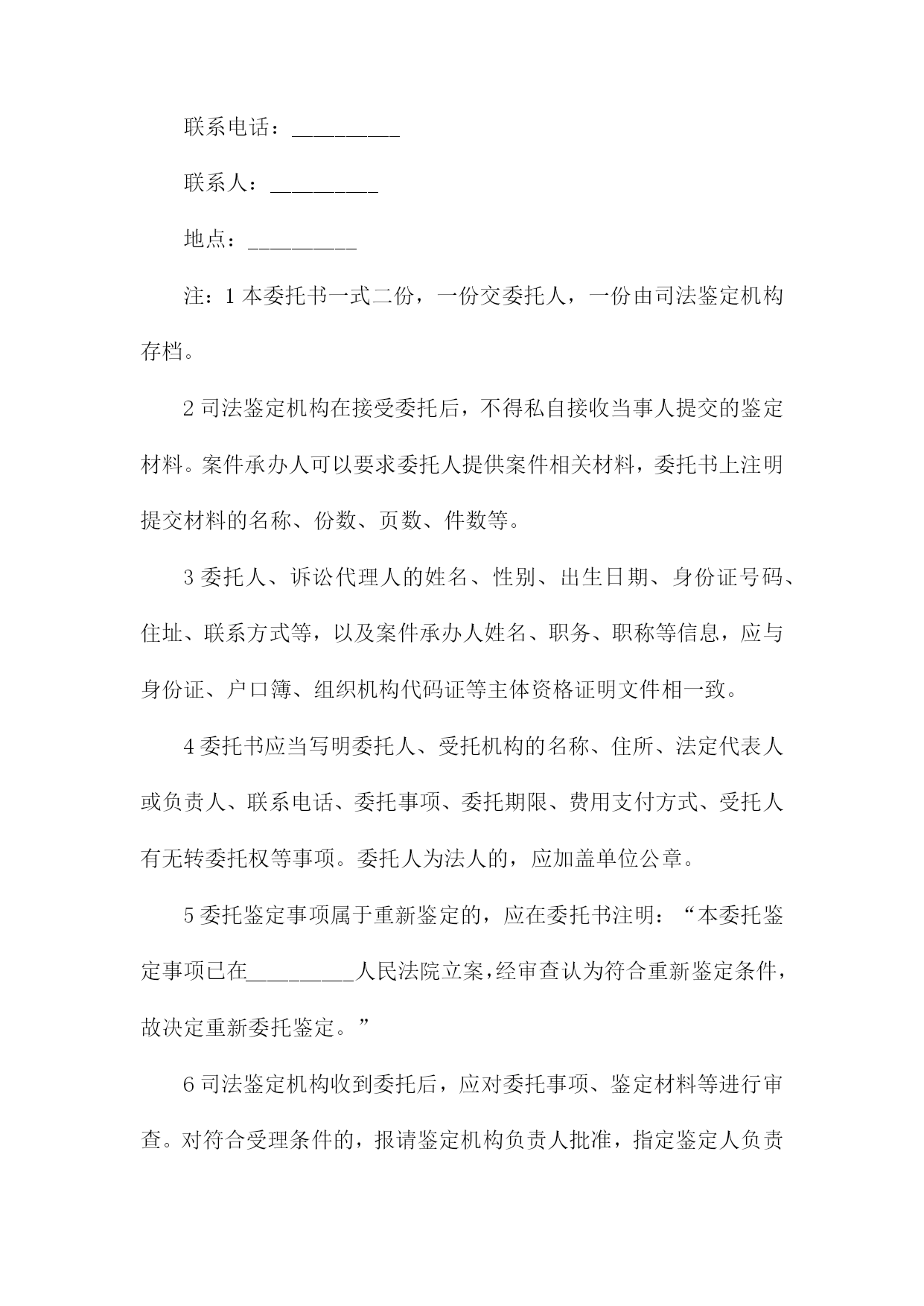 司法鉴定摇号委托书根据你的要求,这里是《司法鉴定摇号委托书》的模板人民法院()司发委20号委托单位:__________,法定代表人:__________,地址:__________,联系电话:__________。受托机构:__________,法定代表人:__________,地址:__________,联系电话:__________。案由:__________。鉴定事项:__________。委托人选择摇号方式确定鉴定机构,摇号应当在法院工作人员在场的情况下进行,必要时可邀请社会监督员到场监督。摇号结果应当在摇号结束后2日内告知委托人。特此委托。委托单位:_____法定代表人:_________年____月____日(院印)联系电话:__________联系人:__________地点:__________注:1本委托书一式二份,一份交委托人,一份由司法鉴定机构存档。2司法鉴定机构在接受委托后,不得私自接收当事人提交的鉴定材料。案件承办人可以要求委托人提供案件相关材料,委托书上注明提交材料的名称、份数、页数、件数等。3委托人、诉讼代理人的姓名、性别、出生日期、身份证号码、住址、联系方式等,以及案件承办人姓名、职务、职称等信息,应与身份证、户口簿、组织机构代码证等主体资格证明文件相一致。4委托书应当写明委托人、受托机构的名称、住所、法定代表人或负责人、联系电话、委托事项、委托期限、费用支付方式、受托人有无转委托权等事项。委托人为法人的,应加盖单位公章。5委托鉴定事项属于重新鉴定的,应在委托书注明:“本委托鉴定事项已在__________人民法院立案,经审查认为符合重新鉴定条件,故决定重新委托鉴定。”6司法鉴定机构收到委托后,应对委托事项、鉴定材料等进行审查。对符合受理条件的,报请鉴定机构负责人批准,指定鉴定人负责实施,并告知委托人联系方式。7鉴定机构应当自收到委托之日起7个工作日内作出是否受理的决定。不予受理的,应说明理由,退还委托书。8鉴定机构无正当理由不得拒绝接受委托。有正当理由不能接受委托的,应向委托人说明原因并征得其同意。9鉴定机构在受理鉴定申请后,发现委托人就同一鉴定事项同时委托其他司法鉴定机构的,应当撤销委托。已经受理的鉴定委托,应当终止。达成协议的,按照协议约定处理。10鉴定机构因鉴定需要耗尽或者可能损坏检材的,应提前通知委托人补充提供符合要求的检材。检材不足部分的鉴定费用应当承担。11鉴定机构接受委托后,由司法鉴定机构指定的司法鉴定人进行鉴定。委托人有特别要求的,经双方协商一致,可以由委托人选定司法鉴定人,也可以在鉴定机构名册中随机选定。12有下列情形之一的,司法鉴定机构不得受理:(1)委托鉴定事项超出本机构司法鉴定业务范围;(2)鉴定材料不真实、不完整、不充分或者取得方式不合法的;(3)鉴定事项的用途不合法或者违背社会公德的;(4)鉴定要求不符合司法鉴定执业规则或者相关鉴定技术规范的;(5)鉴定要求超出本机构技术条件和鉴定能力的;(6)其他不符合法律、法规、规章和本通知规定的情形。13司法鉴定机构决定受理鉴定申请后,应当与鉴定申请人签订司法鉴定委托书。司法鉴定委托书应当载明下列事项:(1)委托人和司法鉴定机构的基本信息;(2)委托鉴定的事项、用途、要求以及鉴定事项的简要说明;(3)鉴定事项的主要内容;(4)鉴定过程和鉴定方法;(5)鉴定时限;(6)鉴定费用及其支付方式;(7)鉴定文书的送达方式;(8)其他需要载明的事项。14鉴定机构受理鉴定申请后,应当按照相关规定进行鉴定。鉴定机构应当在鉴定前随机确定鉴定人,并按照规定指派鉴定人主持鉴定、解答有关鉴定问题并签字确认。15鉴定机构应当将鉴定过程中形成的鉴定文书及相关资料整理立卷、归档。16鉴定机构应当妥善保管鉴定文书及相关资料。鉴定文书及清单应当由鉴定人签名并加盖鉴定机构印章。17鉴定机构有下列情形之一的,应当终止鉴定:(1)发现委托人要求或者暗示司法鉴定机构、司法鉴定人按其意图或者特定目的进行鉴定的;(2)鉴定材料发生耗尽、损坏或者灭失等情况的;(3)委托人不履行司法鉴定委托书规定的义务或者鉴定活动受到严重干扰,致使鉴定无法继续进行的;(4)委托人主动撤销鉴定委托或者委托人拒绝支付鉴定费用的;(5)因不可抗力致使鉴定无法继续进行的;(6)其他需要终止鉴定的情形。18司法鉴定机构终止鉴定的,应当按照规定出具终止鉴定意见书,并载明终止鉴定的原因、依据和恢复鉴定及补充鉴定的时间。19司法鉴定机构因鉴定需要,可以委托具备相应资质的专业机构或者人员对专门性问题进行检验、检测、评估、评价、鉴定、审计等,并出具书面意见。20司法鉴定机构应当对委托鉴定事项、鉴