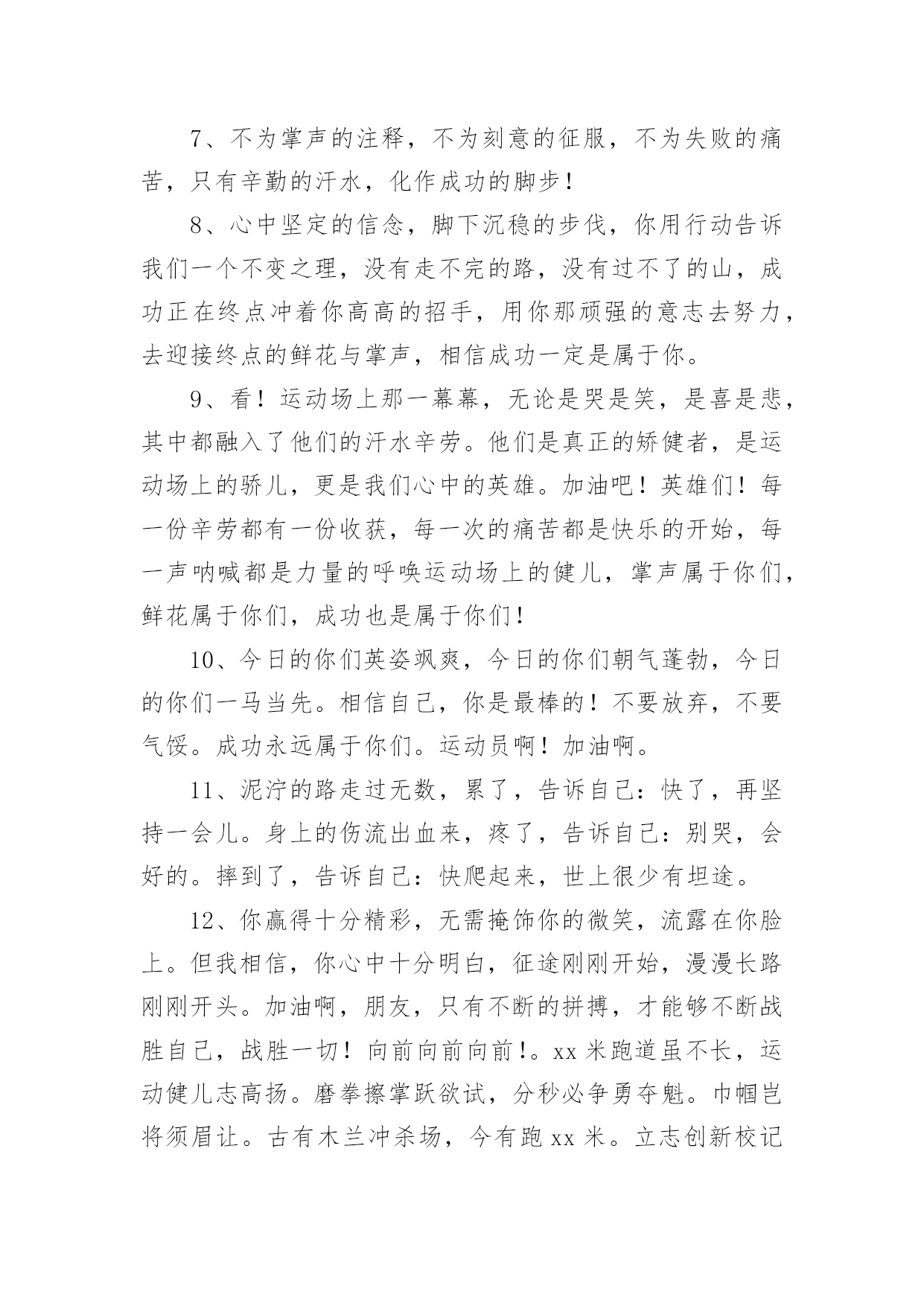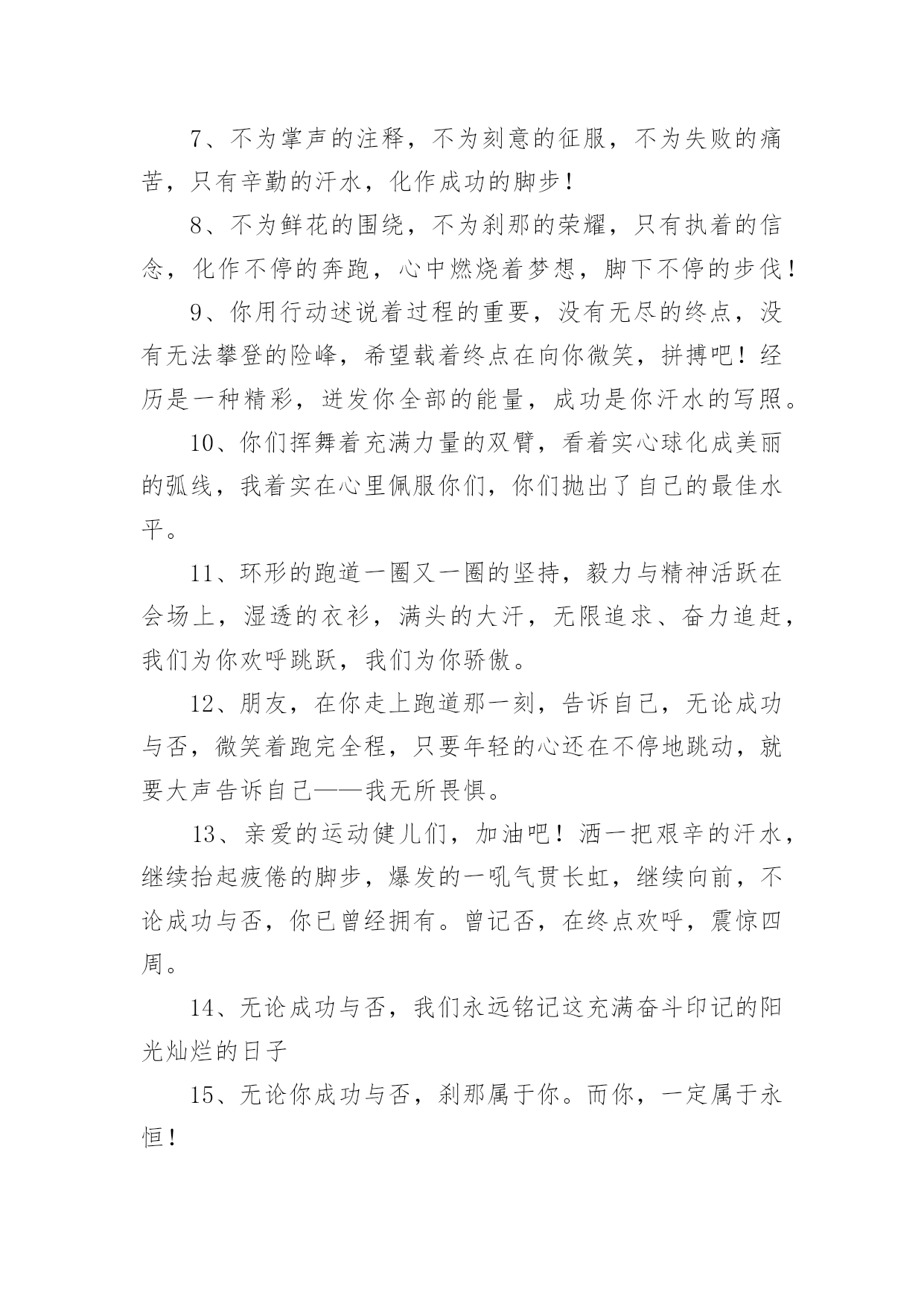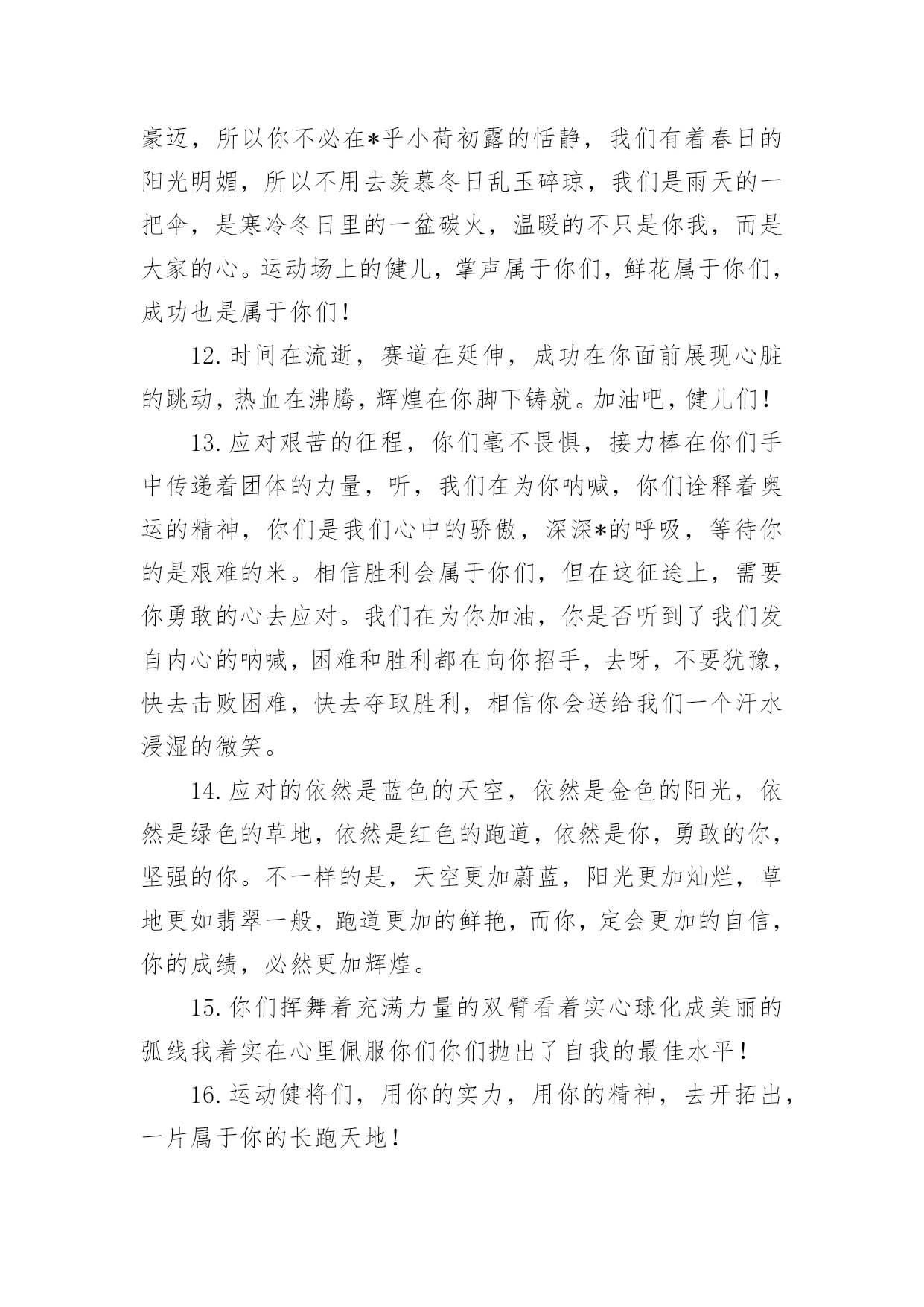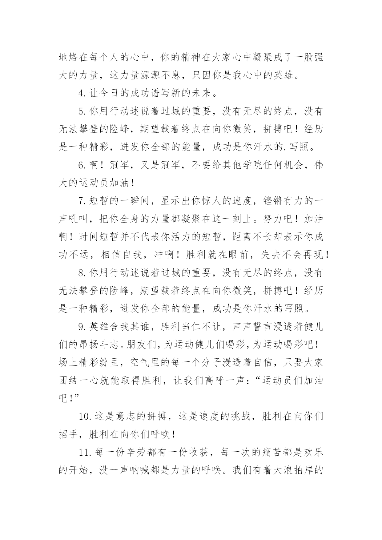 运动会加油稿运动会加油稿15篇【热】在学习、工作生活中,需要使用加油稿的情境愈发增多,加油稿有着正向的鼓动作用。相信写加油稿是一个让许多人都头痛的问题,下面是小编收集整理的运动会加油稿,仅供参考,欢迎大家阅读。运动会加油稿11.虽然你们在场上的时间很短暂,但你们的身影依然停留在人们的脑海里,因为你们是赛场上最可爱的人。2.应对艰苦的征程,你们毫不畏惧,接力棒在你们手中传递着团体的力量,听,我们在为你呐喊,你们诠释着奥运的精神,你们是我们心中的骄傲,深深的呼吸,等待你的是艰难的米。相信胜利会属于你们,但在这征途上,需要你勇敢的心去应对。我们在为你加油,你是否听到了我们发自内心的呐喊,困难和胜利都在向你招手,去呀,不要犹豫,快去击败困难,快去夺取胜利,相信你会送给我们一个汗水浸湿的微笑。3.你是我心中的英雄有人说,运动场上狂奔的男儿,是一匹匹黑色的骏马。有人说,运动场上活跃的巾帼,是一道道亮丽的风景。我说,你们都是我心中的英雄,你的飒爽英姿,你的顽强拼搏,你的永不屈服,你的自我挑战,都深深地烙在每个人的心中,你的精神在大家心中凝聚成了一股强大的力量,这力量源源不息,只因你是我心中的英雄。4.让今日的成功谱写新的未来。5.你用行动述说着过城的重要,没有无尽的终点,没有无法攀登的险峰,期望载着终点在向你微笑,拼搏吧!经历是一种精彩,迸发你全部的能量,成功是你汗水的.写照。6.啊!冠军,又是冠军,不要给其他学院任何机会,伟大的运动员加油!7.短暂的一瞬间,显示出你惊人的速度,铿锵有力的一声吼叫,把你全身的力量都凝聚在这一刻上。努力吧!加油啊!时间短暂并不代表你活力的短暂,距离不长却表示你成功不远,相信自我,冲啊!胜利就在眼前,失去不会再现!8.你用行动述说着过城的重要,没有无尽的终点,没有无法攀登的险峰,期望载着终点在向你微笑,拼搏吧!经历是一种精彩,迸发你全部的能量,成功是你汗水的写照。9.英雄舍我其谁,胜利当仁不让,声声誓言浸透着健儿们的昂扬斗志。朋友们,为运动健儿们喝彩,为运动喝彩吧!场上精彩纷呈,空气里的每一个分子浸透着自信,只要大家团结一心就能取得胜利,让我们高呼一声:“运动员们加油吧!”10.这是意志的拼搏,这是速度的挑战,胜利在向你们招手,胜利在向你们呼唤!11.每一份辛劳都有一份收获,每一次的痛苦都是欢乐的开始,没一声呐喊都是力量的呼唤。我们有着大浪拍岸的豪迈,所以你不必在*乎小荷初露的恬静,我们有着春日的阳光明媚,所以不用去羡慕冬日乱玉碎琼,我们是雨天的一把伞,是寒冷冬日里的一盆碳火,温暖的不只是你我,而是大家的心。运动场上的健儿,掌声属于你们,鲜花属于你们,成功也是属于你们!12.时间在流逝,赛道在延伸,成功在你面前展现心脏的跳动,热血在沸腾,辉煌在你脚下铸就。加油吧,健儿们!13.应对艰苦的征程,你们毫不畏惧,接力棒在你们手中传递着团体的力量,听,我们在为你呐喊,你们诠释着奥运的精神,你们是我们心中的骄傲,深深*的呼吸,等待你的是艰难的米。相信胜利会属于你们,但在这征途上,需要你勇敢的心去应对。我们在为你加油,你是否听到了我们发自内心的呐喊,困难和胜利都在向你招手,去呀,不要犹豫,快去击败困难,快去夺取胜利,相信你会送给我们一个汗水浸湿的微笑。14.应对的依然是蓝色的天空,依然是金色的阳光,依然是绿色的草地,依然是红色的跑道,依然是你,勇敢的你,坚强的你。不一样的是,天空更加蔚蓝,阳光更加灿烂,草地更如翡翠一般,跑道更加的鲜艳,而你,定会更加的自信,你的成绩,必然更加辉煌。15.你们挥舞着充满力量的双臂看着实心球化成美丽的弧线我着实在心里佩服你们你们抛出了自我的最佳水平!16.运动健将们,用你的实力,用你的精神,去开拓出,一片属于你的长跑天地!17.看,终点就在眼前,听,同学为你呼喊。鼓起勇气奋力向前,用你的荣誉带给我们期望。18.青春的脚步,青春的速度,青春的活力,青春的活力,将会在你们的身上尽情体现。迎接自我,挑战自我,战胜自我!我们相信你们必须能行,加油吧,运动员!终点就在眼前!19.虽然你们在场上的时间很短暂,但你们的身影依然停留在人们的脑海里,因为你们是赛场上最可爱的人。20.坚定而又有力量,眼睛看着的不是眼前的跑道,而是那最终的目标,不管汗洒如雨,步伐迟缓到后,不退缩,不气馁,加油,健儿!21.像一出舞台剧,有主角,配角,也有无名的幕后工作者,我们的运动会也在这样的配合中进行着,在赛场上展现英姿的是那些运动员,还有那些为比赛筹措,进行贡献的工作人员们。还有那些拉拉队员们。22.运动场上彩旗飘,运动健儿显英豪,跳跃身姿轻如燕,铅球飞落地动摇,百米冲刺如猛虎。23.赛场风云赛场上叱咤风光,风云下你们挥汗如雨,看台上呐喊声震天,呐喊中饱含期望,期望成功,期望胜利!24.茫茫的跑道中,你把自我青春活力尽情挥