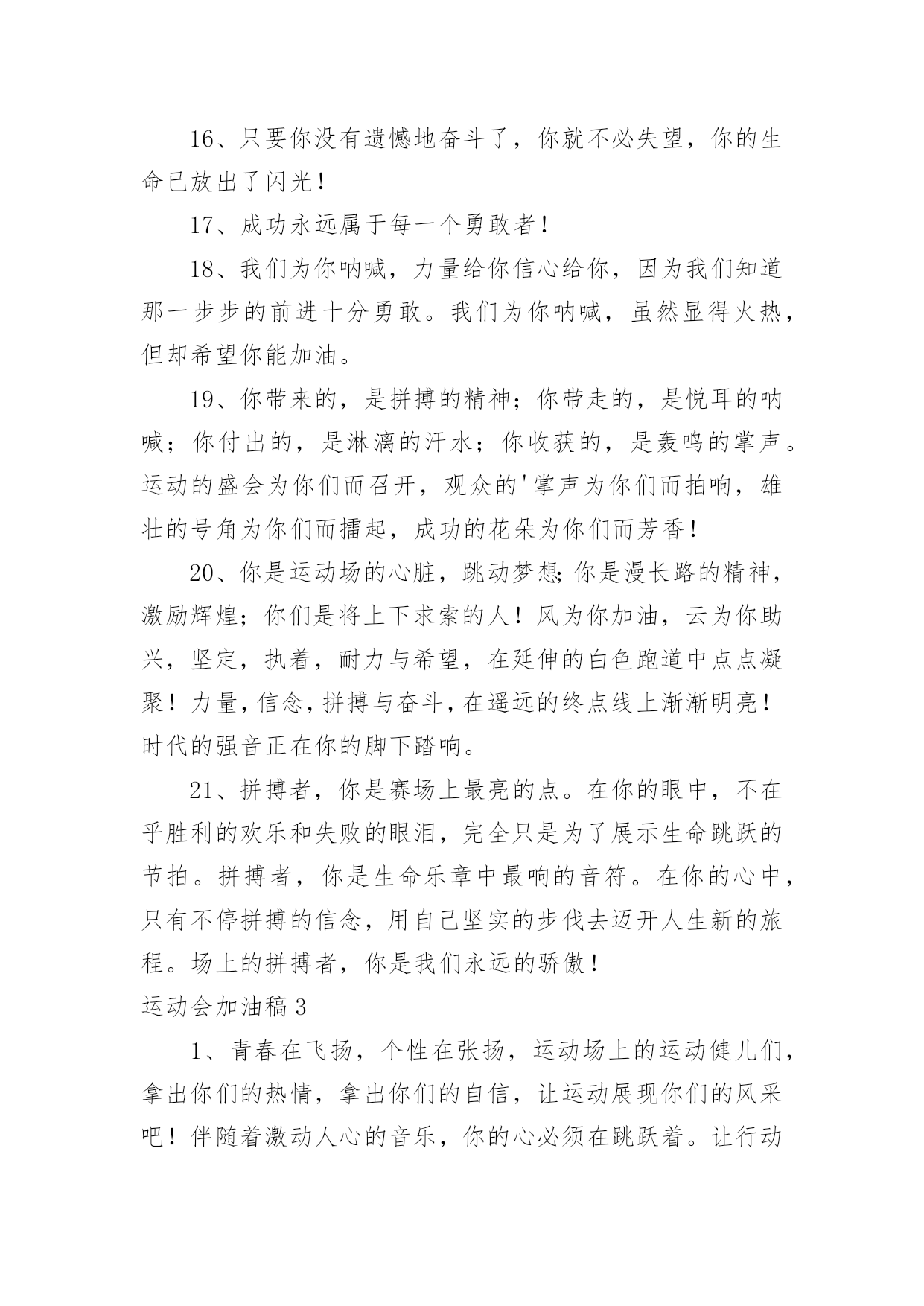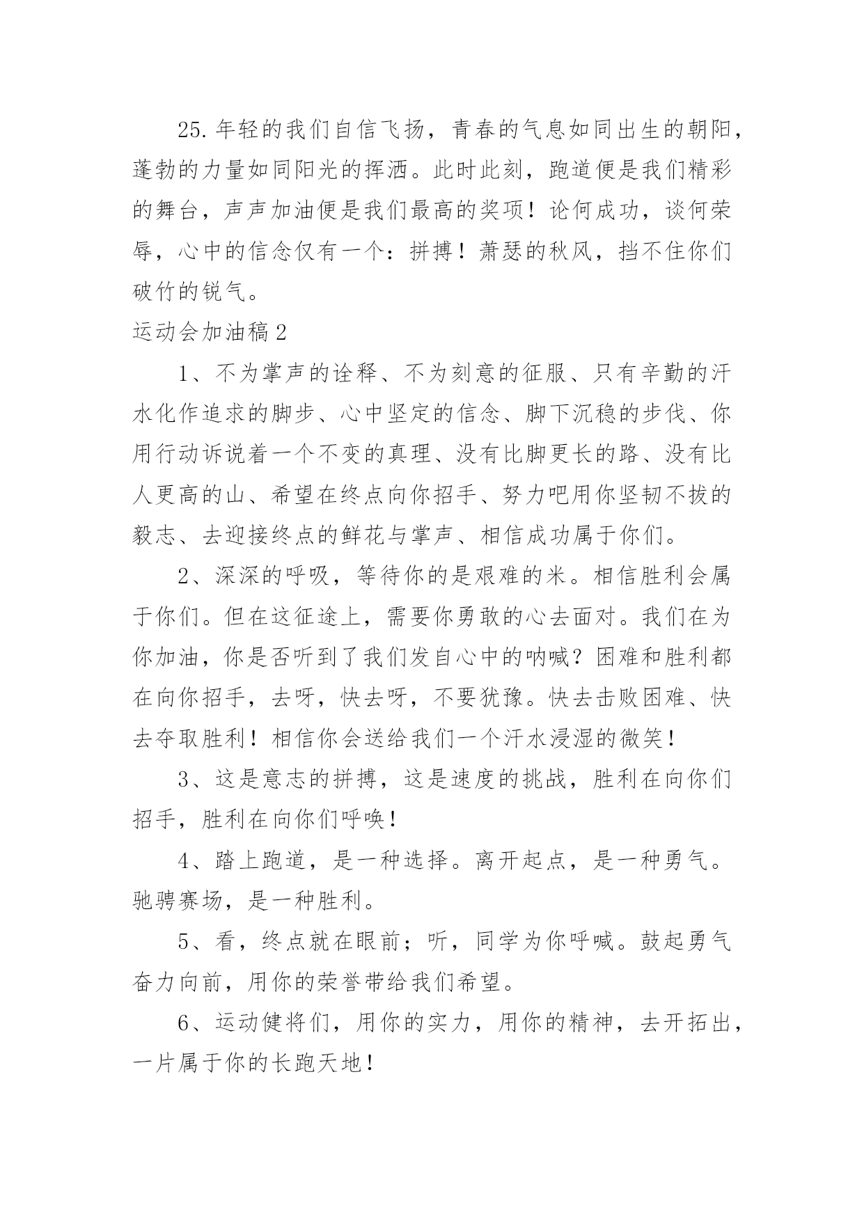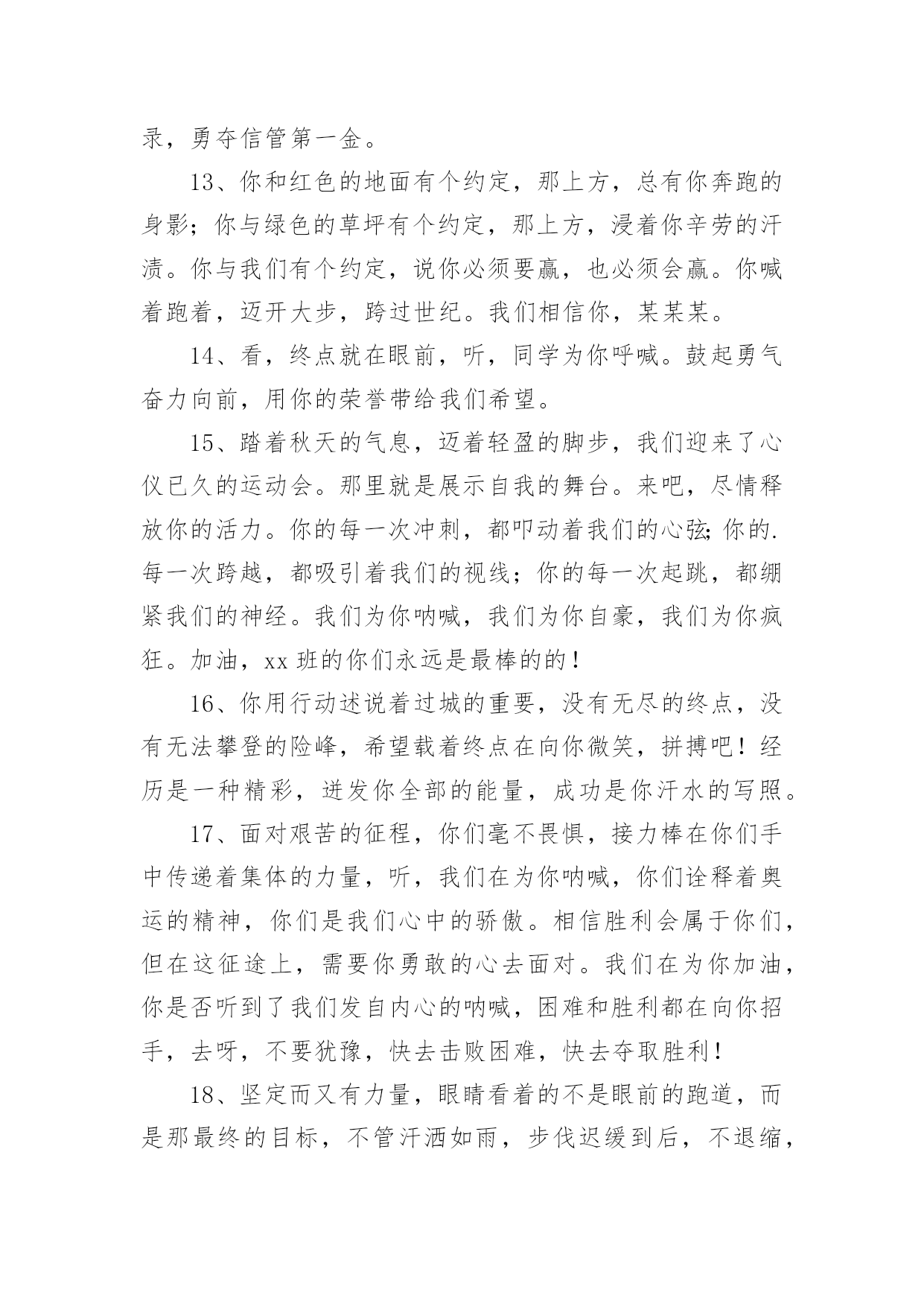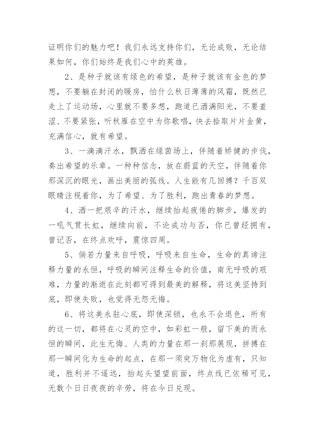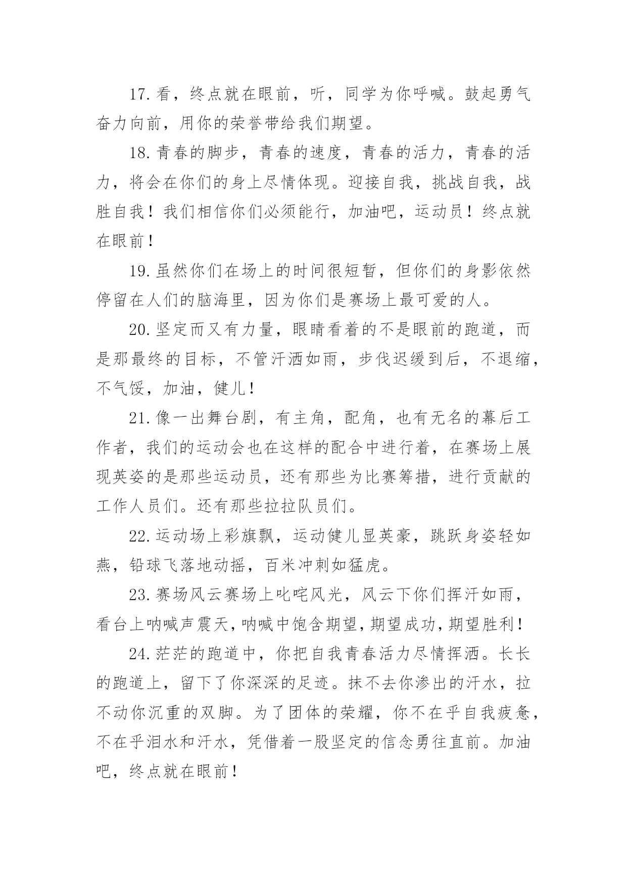 运动会加油稿运动会加油稿15篇【热】在学习、工作生活中,需要使用加油稿的情境愈发增多,加油稿有着正向的鼓动作用。相信写加油稿是一个让许多人都头痛的问题,下面是小编收集整理的运动会加油稿,仅供参考,欢迎大家阅读。运动会加油稿11.虽然你们在场上的时间很短暂,但你们的身影依然停留在人们的脑海里,因为你们是赛场上最可爱的人。2.应对艰苦的征程,你们毫不畏惧,接力棒在你们手中传递着团体的力量,听,我们在为你呐喊,你们诠释着奥运的精神,你们是我们心中的骄傲,深深的呼吸,等待你的是艰难的米。相信胜利会属于你们,但在这征途上,需要你勇敢的心去应对。我们在为你加油,你是否听到了我们发自内心的呐喊,困难和胜利都在向你招手,去呀,不要犹豫,快去击败困难,快去夺取胜利,相信你会送给我们一个汗水浸湿的微笑。3.你是我心中的英雄有人说,运动场上狂奔的男儿,是一匹匹黑色的骏马。有人说,运动场上活跃的巾帼,是一道道亮丽的风景。我说,你们都是我心中的英雄,你的飒爽英姿,你的顽强拼搏,你的永不屈服,你的自我挑战,都深深地烙在每个人的心中,你的精神在大家心中凝聚成了一股强大的力量,这力量源源不息,只因你是我心中的英雄。4.让今日的成功谱写新的未来。5.你用行动述说着过城的重要,没有无尽的终点,没有无法攀登的险峰,期望载着终点在向你微笑,拼搏吧!经历是一种精彩,迸发你全部的能量,成功是你汗水的.写照。6.啊!冠军,又是冠军,不要给其他学院任何机会,伟大的运动员加油!7.短暂的一瞬间,显示出你惊人的速度,铿锵有力的一声吼叫,把你全身的力量都凝聚在这一刻上。努力吧!加油啊!时间短暂并不代表你活力的短暂,距离不长却表示你成功不远,相信自我,冲啊!胜利就在眼前,失去不会再现!8.你用行动述说着过城的重要,没有无尽的终点,没有无法攀登的险峰,期望载着终点在向你微笑,拼搏吧!经历是一种精彩,迸发你全部的能量,成功是你汗水的写照。9.英雄舍我其谁,胜利当仁不让,声声誓言浸透着健儿们的昂扬斗志。朋友们,为运动健儿们喝彩,为运动喝彩吧!场上精彩纷呈,空气里的每一个分子浸透着自信,只要大家团结一心就能取得胜利,让我们高呼一声:“运动员们加油吧!”10.这是意志的拼搏,这是速度的挑战,胜利在向你们招手,胜利在向你们呼唤!11.每一份辛劳都有一份收获,每一次的痛苦都是欢乐的开始,没一声呐喊都是力量的呼唤。我们有着大浪拍岸的豪迈,所以你不必在*乎小荷初露的恬静,我们有着春日的阳光明媚,所以不用去羡慕冬日乱玉碎琼,我们是雨天的一把伞,是寒冷冬日里的一盆碳火,温暖的不只是你我,而是大家的心。运动场上的健儿,掌声属于你们,鲜花属于你们,成功也是属于你们!12.时间在流逝,赛道在延伸,成功在你面前展现心脏的跳动,热血在沸腾,辉煌在你脚下铸就。加油吧,健儿们!13.应对艰苦的征程,你们毫不畏惧,接力棒在你们手中传递着团体的力量,听,我们在为你呐喊,你们诠释着奥运的精神,你们是我们心中的骄傲,深深*的呼吸,等待你的是艰难的米。相信胜利会属于你们,但在这征途上,需要你勇敢的心去应对。我们在为你加油,你是否听到了我们发自内心的呐喊,困难和胜利都在向你招手,去呀,不要犹豫,快去击败困难,快去夺取胜利,相信你会送给我们一个汗水浸湿的微笑。14.应对的依然是蓝色的天空,依然是金色的阳光,依然是绿色的草地,依然是红色的跑道,依然是你,勇敢的你,坚强的你。不一样的是,天空更加蔚蓝,阳光更加灿烂,草地更如翡翠一般,跑道更加的鲜艳,而你,定会更加的自信,你的成绩,必然更加辉煌。15.你们挥舞着充满力量的双臂看着实心球化成美丽的弧线我着实在心里佩服你们你们抛出了自我的最佳水平!16.运动健将们,用你的实力,用你的精神,去开拓出,一片属于你的长跑天地!17.看,终点就在眼前,听,同学为你呼喊。鼓起勇气奋力向前,用你的荣誉带给我们期望。18.青春的脚步,青春的速度,青春的活力,青春的活力,将会在你们的身上尽情体现。迎接自我,挑战自我,战胜自我!我们相信你们必须能行,加油吧,运动员!终点就在眼前!19.虽然你们在场上的时间很短暂,但你们的身影依然停留在人们的脑海里,因为你们是赛场上最可爱的人。20.坚定而又有力量,眼睛看着的不是眼前的跑道,而是那最终的目标,不管汗洒如雨,步伐迟缓到后,不退缩,不气馁,加油,健儿!21.像一出舞台剧,有主角,配角,也有无名的幕后工作者,我们的运动会也在这样的配合中进行着,在赛场上展现英姿的是那些运动员,还有那些为比赛筹措,进行贡献的工作人员们。还有那些拉拉队员们。22.运动场上彩旗飘,运动健儿显英豪,跳跃身姿轻如燕,铅球飞落地动摇,百米冲刺如猛虎。23.赛场风云赛场上叱咤风光,风云下你们挥汗如雨,看台上呐喊声震天,呐喊中饱含期望,期望成功,期望胜利!24.茫茫的跑道中,你把自我青春活力尽情挥
