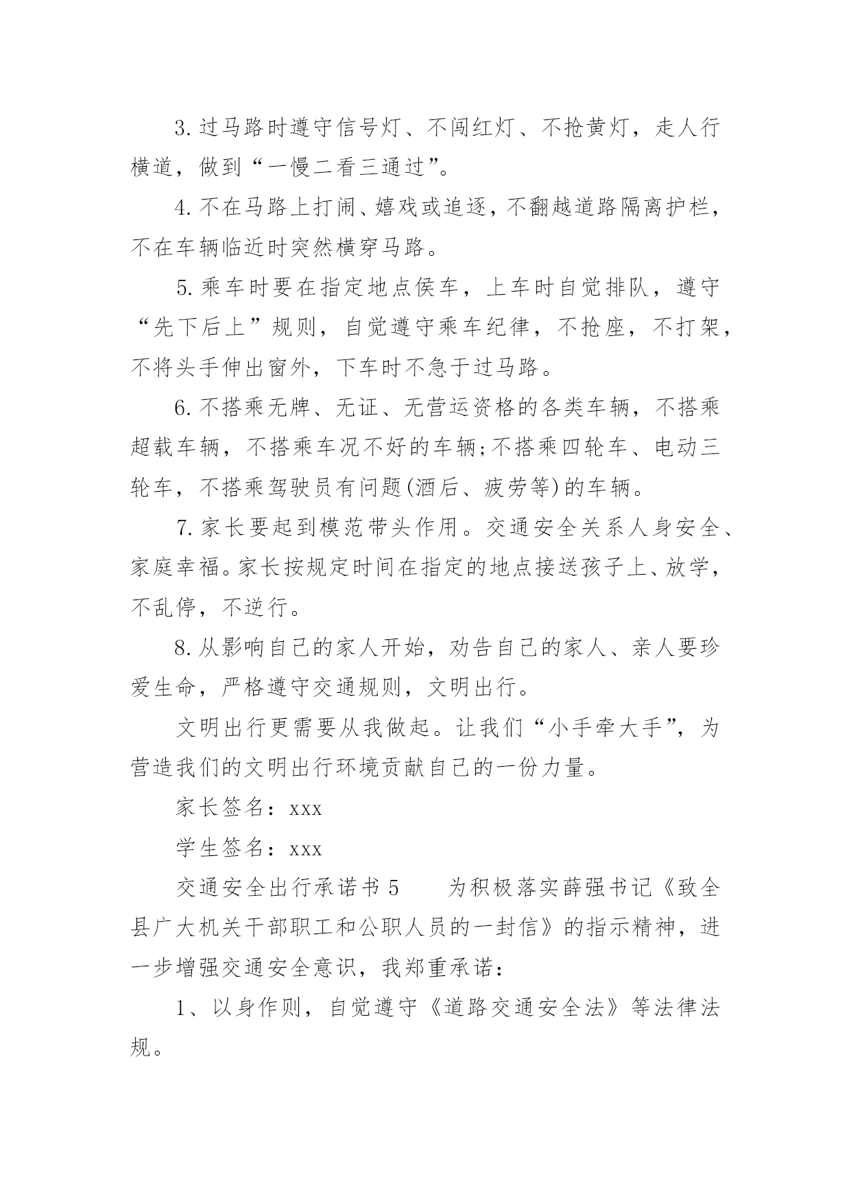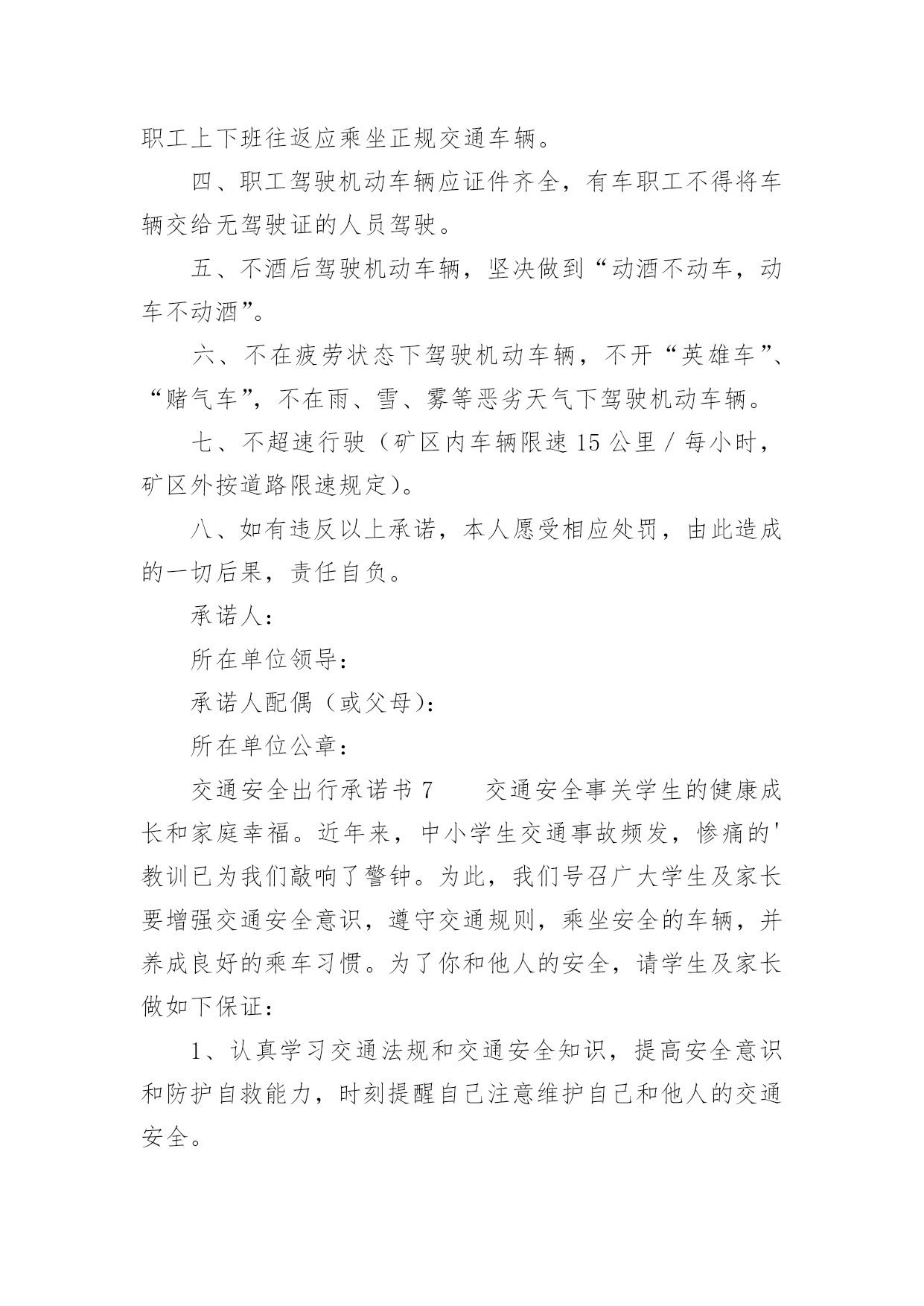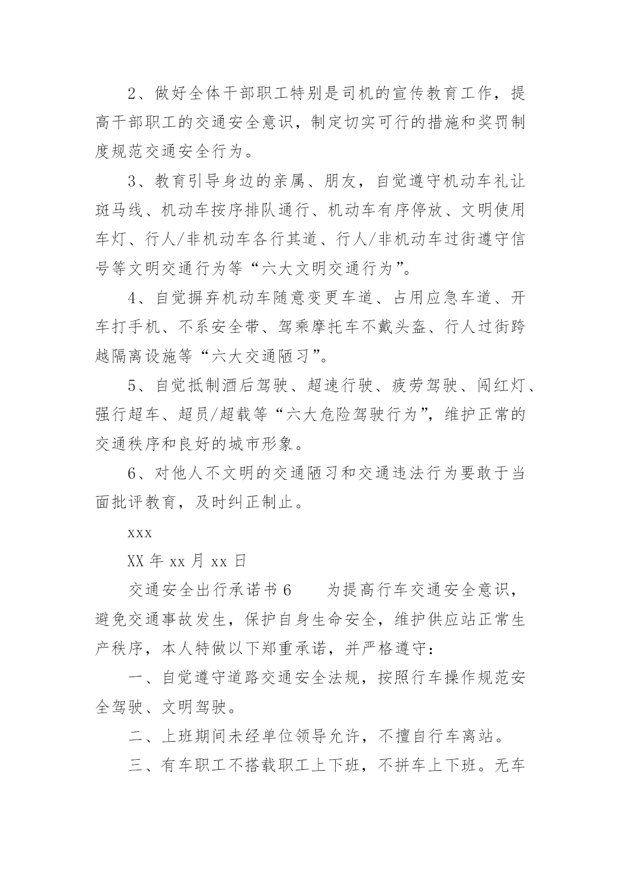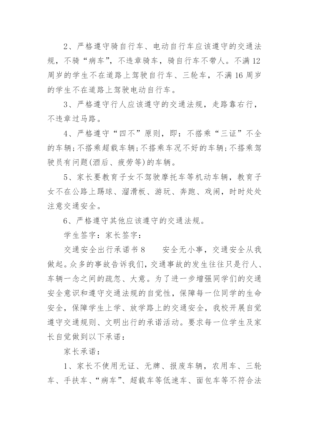 交通安全出行承诺书交通安全出行承诺书(精选8篇)在现实社会中,我们使用上承诺书的情况与日俱增,承诺书是单方意思表示,不具有合同效力。那么你有了解过承诺书吗?以下是小编为大家整理的交通安全出行承诺书(精选8篇),欢迎阅读,希望大家能够喜欢。交通安全出行承诺书1“遵章守法,从每一步做起。”作为xx小学四年级三班的一份子,为了维护道路交通安全秩序,预防和减少道路交通事故,确保我们生命健康安全,作为一名交通参与者,我们自觉承诺做到:1、已认真学习《BMW小学生交通安全读本》和交通安全知识,并已了解了相关交通安全知识,提高自己的安全意识和防护自救能力,时刻提醒自己注意维护自己和他人的交通安全。2、我们未满12周岁,不骑自行车上下学,没有非机动车道的靠路边右侧顺行。不在马路上互相追逐、并行或攀扶其他车辆。转弯前减速慢行,伸手示意,不突然猛拐。3、步行时做到“一停二看三通过"、“红灯停,绿灯行”,走路靠右行,走斑马线或过街设施,不乱穿马路。4、乘车时不将头手伸出窗外,上车时不拥挤、遵守"先下后上"规则,下车时不急于过马路。拒绝乘坐“黑校车”或无牌无证电瓶三轮车、拖拉机等存在安全隐患的车况差、超载的车辆。不搭乘驾驶员有问题(酒后、疲劳等)的车辆。5、服从交警指挥,严格遵守其他应该遵守的交通法规。本人自愿遵守以上承诺,对本人行为负责,做文明守法公民。xxxXX年xx月xx日交通安全出行承诺书2我们生活在一个喧嚣繁华的城镇里,我们每天都要在行人、车辆拥挤的街道上行走,公司门口正在分半扩建维修,拥挤的车辆在我们眼前来来往往。因为上班赶时间不遵守交通法规或存有麻痹和侥幸心理,我们看到了血的事实,经受了血的教训。多少惨痛的教训和血的代价让我们深深地体悟到维护交通安全的重要性,遵守交通法规是我们应尽的责任和义务,只有遵守交通法规,平安才会伴我们一生,只有文明交通,事故才会与我们无缘。为了珍惜和关爱自己和他人的生命,做一名自觉遵守交通法规的模范,我们承诺如下:一、认真学习交通法规知识,自觉遵守交通法规规定,文明交通,各行其道,养成良好的交通习惯。二、行路走人行道,没有人行道的,须靠右边行走;过马路走斑马线,不准穿越、倚坐人行道、车行道和铁路道口的护栏。三、乘车时不准携带易燃、易爆等危险物品,不准乘坐货车、农用车、无牌无证以及非客运车辆。乘坐公交车时需在站台等候,不得追车或强行拦车。四、骑自行车、电瓶车和摩托车等非机动车时要走非机动车道,骑车时不戴耳塞听歌,不双手离车,不攀扶其他车辆或手中持物行驶;不牵引车辆或被其他车辆牵引,不扶身并行,互相追逐曲折竞驶;进出公司大门时要减速慢行或下车推行,未戴头盔或无驾驶证不驾驶摩托车,不违规带人,不驾驶“三无”车辆。五、驾驶机动车辆时,不酒后或服用药物后驾驶,做到开车不喝酒,酒后不开车;不无证驾车、不闯红灯不飚车,自觉遵守交通规定。生命只有一次,遵守交通法规,就是珍爱生命,我们要从自身做起,增强交通安全意识,积极维护交通秩序,行安全路,做文明人,以上承诺我坚决遵守,若有违反后果自负。xxxXX年xx月xx日交通安全出行承诺书3为维护道路交通秩序,杜绝重特大交通事故发生,在参与交通时,本人慎重承诺:1、自觉遵守《安全生产法》、《道路交通安全法》、《中华人民共和国道路运输条例》、《陕西省道路运输管理条例》等法律法规的相关规定。2、按照操作规范安全驾驶、文明行驶,坚决做到“七不”,即:不超载、不超员、不超速、不争道抢行、不闯红灯、不酒后驾驶、不疲劳驾驶(在身体状况不好时不驾车)。3、保证定期对车辆进行检测和维护,保持车辆的安全技术性能状况良好,保持车容车貌洁净,随车配备安全锤、灭火器等必要安全设施。4、保证营运车辆各种牌、证齐全有效(与所驾驶的车辆相适应的驾驶证、行车证、营运证等),并参保机动车交通事故强制责任险和乘车人员保险。5、发生突发性公共事件时,服从和有关部门的统一调度、管理和指挥。以上承诺条款,本人已认真仔细阅读,将自觉遵守道路运输行业管理的规定,服从各级交通主管部门、道路运输管理机构及相关单位的管理。如因违法、违规行车、驾驶,而导致发生交通安全事故,本人自愿承担由此带来的一切法律后果及相应的赔偿责任,自愿按规定接受管理部门处罚。承诺人签字:XX年xx月xx日交通安全出行承诺书4生命无价,安全为先。安全出行是每一个公民的愿望,营造一个文明和谐的交通环境,是每一位公民的责任,遵守交通法规,是每个公民的义务。为了时光少在拥堵中虚耗,生命不在事故中流逝,让我们一起来做文明出行的好榜样。我和爸爸妈妈一起郑重作出以下承诺:1.认真学习交通安全知识,牢固树立文明交通意识,提高防护自救能力。2.不骑“故障车”,不骑车带人,12岁以下同学不得骑车上路。3.过马路时遵守信号灯、不闯红灯、不抢黄灯,走人行横道,做到“一慢二看三通过”