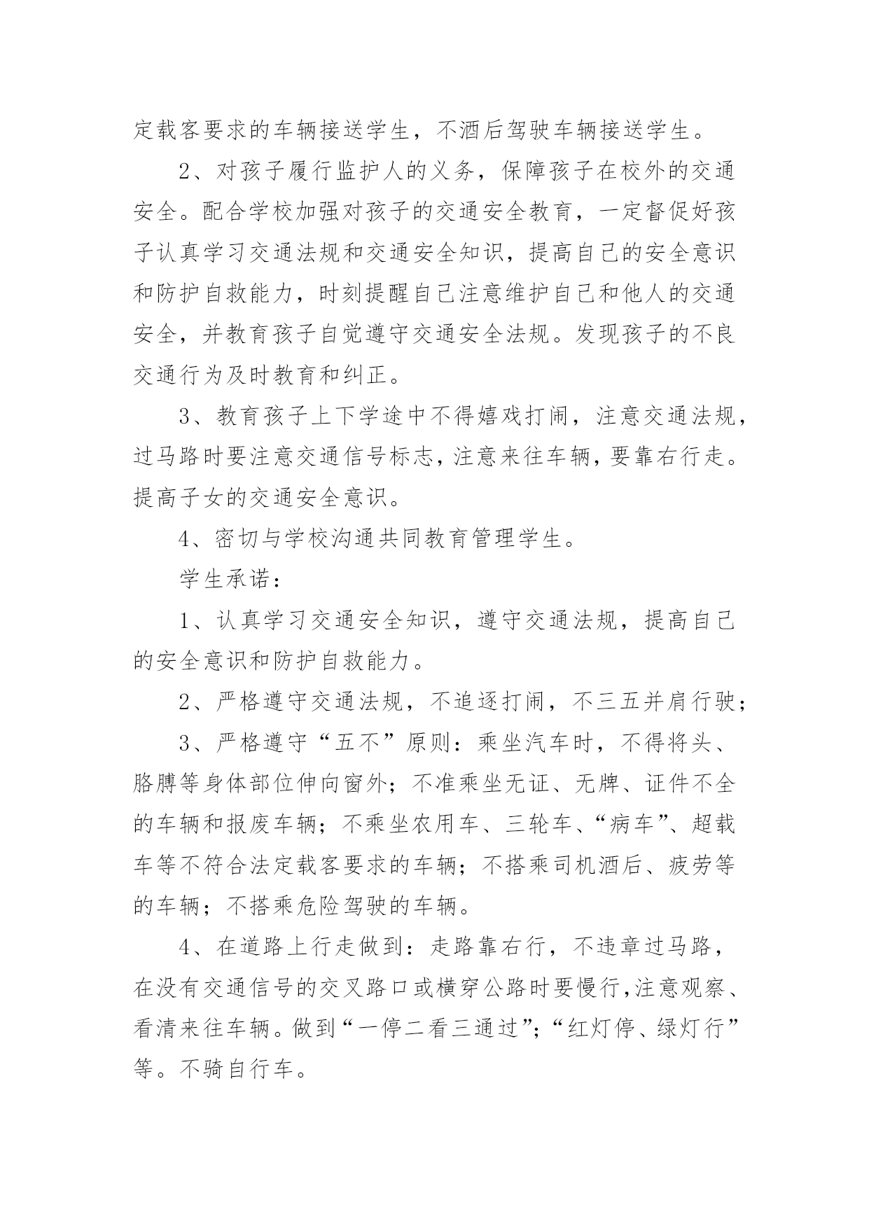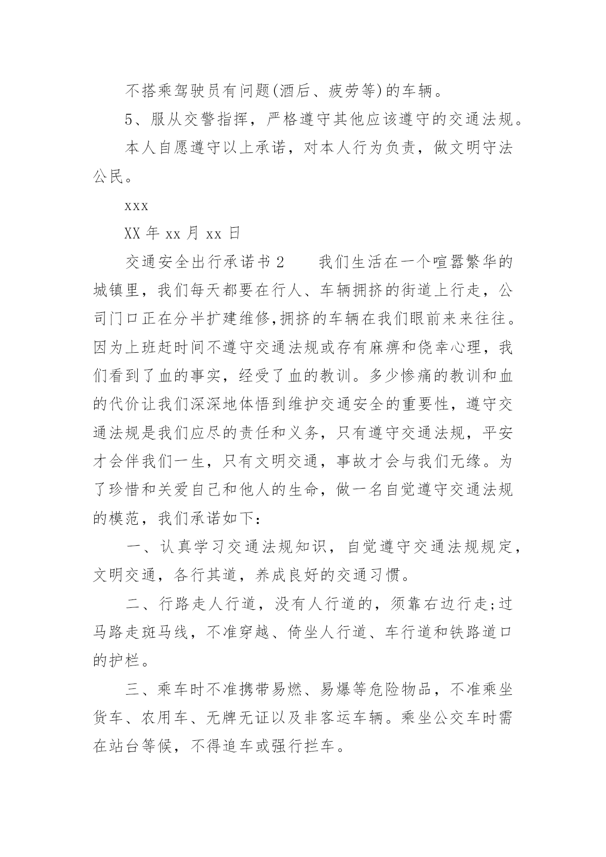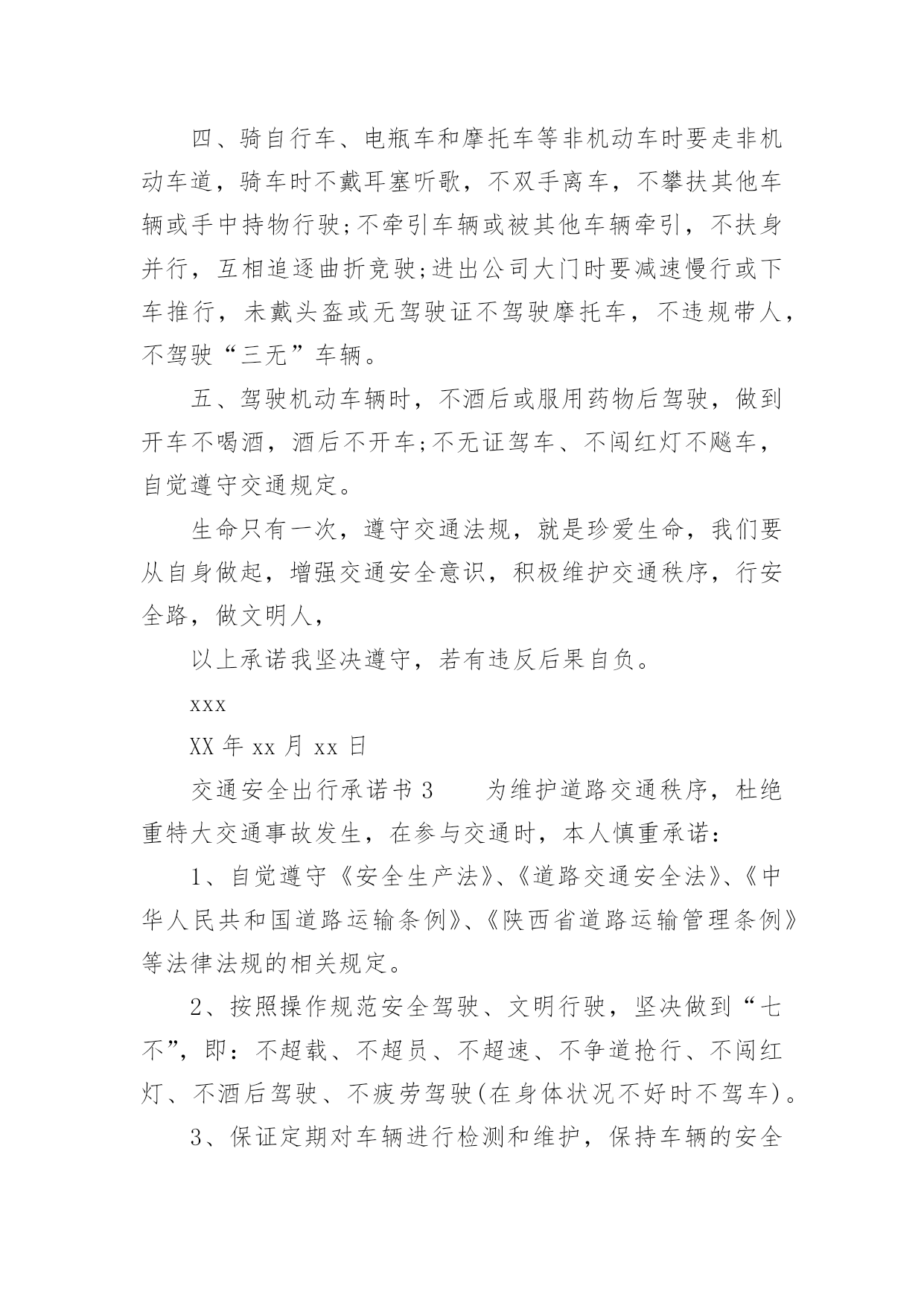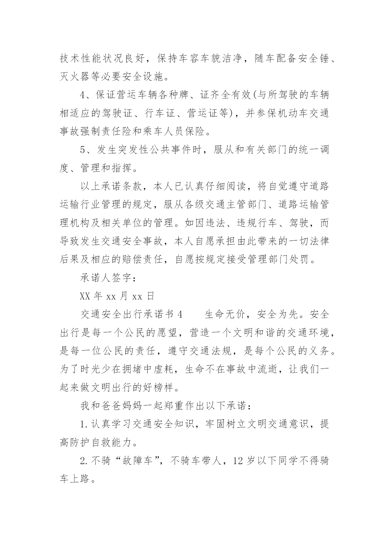 交通安全出行承诺书交通安全出行承诺书(精选8篇)在现实社会中,我们使用上承诺书的情况与日俱增,承诺书是单方意思表示,不具有合同效力。那么你有了解过承诺书吗?以下是小编为大家整理的交通安全出行承诺书(精选8篇),欢迎阅读,希望大家能够喜欢。交通安全出行承诺书1“遵章守法,从每一步做起。”作为xx小学四年级三班的一份子,为了维护道路交通安全秩序,预防和减少道路交通事故,确保我们生命健康安全,作为一名交通参与者,我们自觉承诺做到:1、已认真学习《BMW小学生交通安全读本》和交通安全知识,并已了解了相关交通安全知识,提高自己的安全意识和防护自救能力,时刻提醒自己注意维护自己和他人的交通安全。2、我们未满12周岁,不骑自行车上下学,没有非机动车道的靠路边右侧顺行。不在马路上互相追逐、并行或攀扶其他车辆。转弯前减速慢行,伸手示意,不突然猛拐。3、步行时做到“一停二看三通过"、“红灯停,绿灯行”,走路靠右行,走斑马线或过街设施,不乱穿马路。4、乘车时不将头手伸出窗外,上车时不拥挤、遵守"先下后上"规则,下车时不急于过马路。拒绝乘坐“黑校车”或无牌无证电瓶三轮车、拖拉机等存在安全隐患的车况差、超载的车辆。不搭乘驾驶员有问题(酒后、疲劳等)的车辆。5、服从交警指挥,严格遵守其他应该遵守的交通法规。本人自愿遵守以上承诺,对本人行为负责,做文明守法公民。xxxXX年xx月xx日交通安全出行承诺书2我们生活在一个喧嚣繁华的城镇里,我们每天都要在行人、车辆拥挤的街道上行走,公司门口正在分半扩建维修,拥挤的车辆在我们眼前来来往往。因为上班赶时间不遵守交通法规或存有麻痹和侥幸心理,我们看到了血的事实,经受了血的教训。多少惨痛的教训和血的代价让我们深深地体悟到维护交通安全的重要性,遵守交通法规是我们应尽的责任和义务,只有遵守交通法规,平安才会伴我们一生,只有文明交通,事故才会与我们无缘。为了珍惜和关爱自己和他人的生命,做一名自觉遵守交通法规的模范,我们承诺如下:一、认真学习交通法规知识,自觉遵守交通法规规定,文明交通,各行其道,养成良好的交通习惯。二、行路走人行道,没有人行道的,须靠右边行走;过马路走斑马线,不准穿越、倚坐人行道、车行道和铁路道口的护栏。三、乘车时不准携带易燃、易爆等危险物品,不准乘坐货车、农用车、无牌无证以及非客运车辆。乘坐公交车时需在站台等候,不得追车或强行拦车。四、骑自行车、电瓶车和摩托车等非机动车时要走非机动车道,骑车时不戴耳塞听歌,不双手离车,不攀扶其他车辆或手中持物行驶;不牵引车辆或被其他车辆牵引,不扶身并行,互相追逐曲折竞驶;进出公司大门时要减速慢行或下车推行,未戴头盔或无驾驶证不驾驶摩托车,不违规带人,不驾驶“三无”车辆。五、驾驶机动车辆时,不酒后或服用药物后驾驶,做到开车不喝酒,酒后不开车;不无证驾车、不闯红灯不飚车,自觉遵守交通规定。生命只有一次,遵守交通法规,就是珍爱生命,我们要从自身做起,增强交通安全意识,积极维护交通秩序,行安全路,做文明人,以上承诺我坚决遵守,若有违反后果自负。xxxXX年xx月xx日交通安全出行承诺书3为维护道路交通秩序,杜绝重特大交通事故发生,在参与交通时,本人慎重承诺:1、自觉遵守《安全生产法》、《道路交通安全法》、《中华人民共和国道路运输条例》、《陕西省道路运输管理条例》等法律法规的相关规定。2、按照操作规范安全驾驶、文明行驶,坚决做到“七不”,即:不超载、不超员、不超速、不争道抢行、不闯红灯、不酒后驾驶、不疲劳驾驶(在身体状况不好时不驾车)。3、保证定期对车辆进行检测和维护,保持车辆的安全技术性能状况良好,保持车容车貌洁净,随车配备安全锤、灭火器等必要安全设施。4、保证营运车辆各种牌、证齐全有效(与所驾驶的车辆相适应的驾驶证、行车证、营运证等),并参保机动车交通事故强制责任险和乘车人员保险。5、发生突发性公共事件时,服从和有关部门的统一调度、管理和指挥。以上承诺条款,本人已认真仔细阅读,将自觉遵守道路运输行业管理的规定,服从各级交通主管部门、道路运输管理机构及相关单位的管理。如因违法、违规行车、驾驶,而导致发生交通安全事故,本人自愿承担由此带来的一切法律后果及相应的赔偿责任,自愿按规定接受管理部门处罚。承诺人签字:XX年xx月xx日交通安全出行承诺书4生命无价,安全为先。安全出行是每一个公民的愿望,营造一个文明和谐的交通环境,是每一位公民的责任,遵守交通法规,是每个公民的义务。为了时光少在拥堵中虚耗,生命不在事故中流逝,让我们一起来做文明出行的好榜样。我和爸爸妈妈一起郑重作出以下承诺:1.认真学习交通安全知识,牢固树立文明交通意识,提高防护自救能力。2.不骑“故障车”,不骑车带人,12岁以下同学不得骑车上路。3.过马路时遵守信号灯、不闯红灯、不抢黄灯,走人行横道,做到“一慢二看三通过”