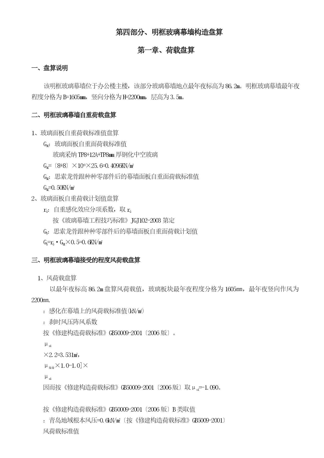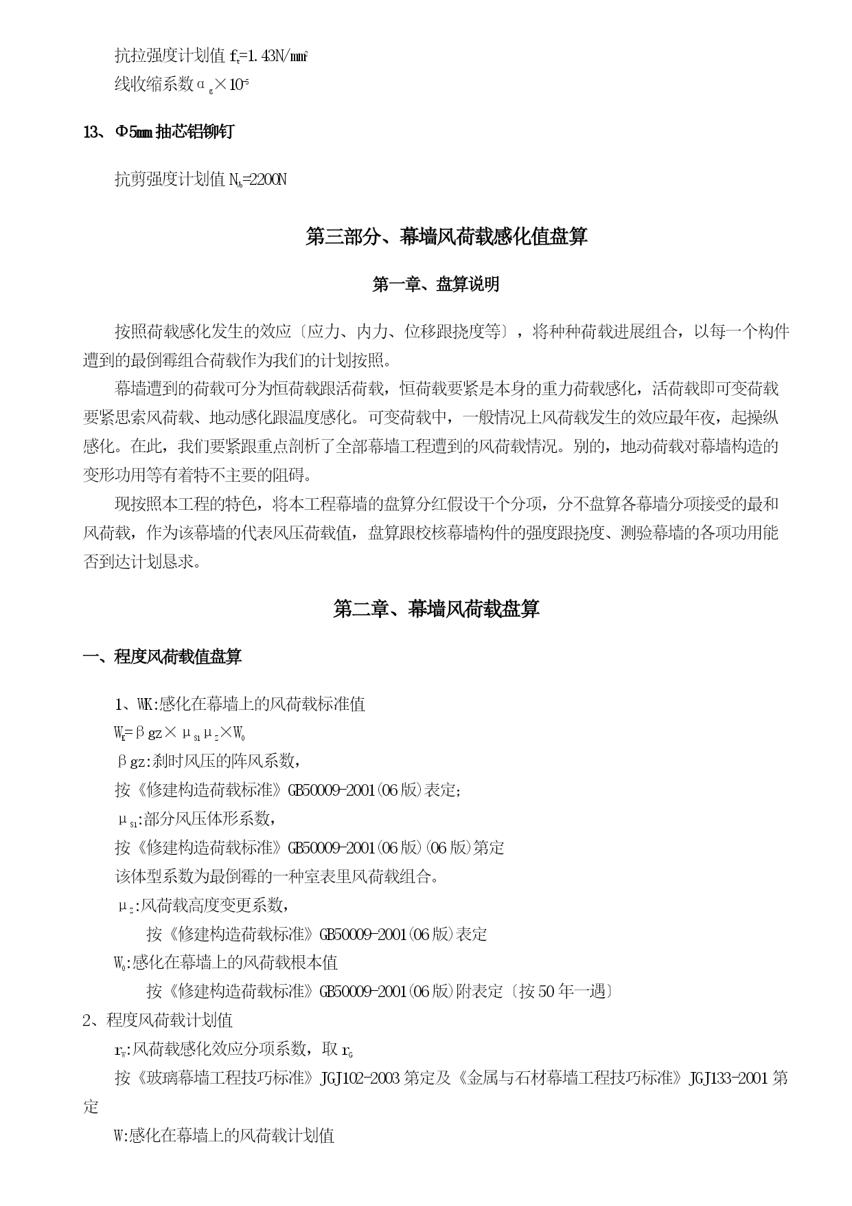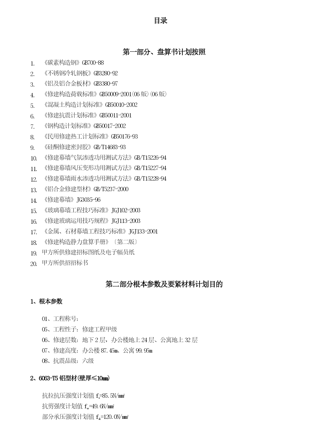 目录TOC\o"1-3"\h\z\uHYPERLINK"_Toc169337300"第一部分、盘算书计划按照PAGEREF_Toc169337300\h9HYPERLINK"_Toc169337301"第二部分根本参数及要紧材料计划目的PAGEREF_Toc169337301\h10HYPERLINK"_Toc169337302"1、根本参数PAGEREF_Toc169337302\h10HYPERLINK"_Toc169337303"2、6063-T5铝型材(壁厚≤10mm)PAGEREF_Toc169337303\h10HYPERLINK"_Toc169337304"3、6063A-T5铝型材(壁厚≤10mm)PAGEREF_Toc169337304\h11HYPERLINK"_Toc169337305"4、浮法玻璃〔厚度5~12mm〕PAGEREF_Toc169337305\h11HYPERLINK"_Toc169337306"5、钢化玻璃〔厚度5~12mm〕PAGEREF_Toc169337306\h11HYPERLINK"_Toc169337307"6、3003铝单板〔、厚〕PAGEREF_Toc169337307\h11HYPERLINK"_Toc169337308"7、构造硅酮密封胶PAGEREF_Toc169337308\h12HYPERLINK"_Toc169337309"8、Q235B钢PAGEREF_Toc169337309\h12HYPERLINK"_Toc169337310"9、构造用不锈钢(0Gr18Ni9)PAGEREF_Toc169337310\h12HYPERLINK"_Toc169337311"10、奥氏体不锈钢螺栓〔A2-70〕PAGEREF_Toc169337311\h12HYPERLINK"_Toc169337312"11、焊缝(Ⅱ级焊缝,焊缝厚度或直径d≤16mm)PAGEREF_Toc169337312\h12HYPERLINK"_Toc169337313"12、C30钢筋混凝土PAGEREF_Toc169337313\h13HYPERLINK"_Toc169337314"13、Φ5mm抽芯铝铆钉PAGEREF_Toc169337314\h13HYPERLINK"_Toc169337315"第三部分、幕墙风荷载感化值盘算PAGEREF_Toc169337315\h13HYPERLINK"_Toc169337316"第一章、盘算说明PAGEREF_Toc169337316\h13HYPERLINK"_Toc169337317"第二章、幕墙风荷载盘算PAGEREF_Toc169337317\h13HYPERLINK"_Toc169337318"一、程度风荷载值盘算PAGEREF_Toc169337318\h13HYPERLINK"_Toc169337319"二、各幕墙分项风荷载盘算值PAGEREF_Toc169337319\h15HYPERLINK"_Toc169337320"第四部分、明框玻璃幕墙构造盘算PAGEREF_Toc169337320\h17HYPERLINK"_Toc169337321"第一章、荷载盘算PAGEREF_Toc169337321\h17HYPERLINK"_Toc169337322"一、盘算说明PAGEREF_Toc169337322\h17HYPERLINK"_Toc169337323"二、明框玻璃幕墙自重荷载盘算PAGEREF_Toc169337323\h17HYPERLINK"_Toc169337324"三、明框玻璃幕墙接受的程度风荷载盘算PAGEREF_Toc169337324\h17HYPERLINK"_Toc169337325"四、明框玻璃幕墙接受的程度地动荷载盘算PAGEREF_Toc169337325\h18HYPERLINK"_Toc169337326"五、荷载组合PAGEREF_Toc169337326\h18HYPERLINK"_Toc169337327"第二章、玻璃面板盘算PAGEREF_Toc169337327\h19HYPERLINK"_Toc169337328"一、盘算说明P