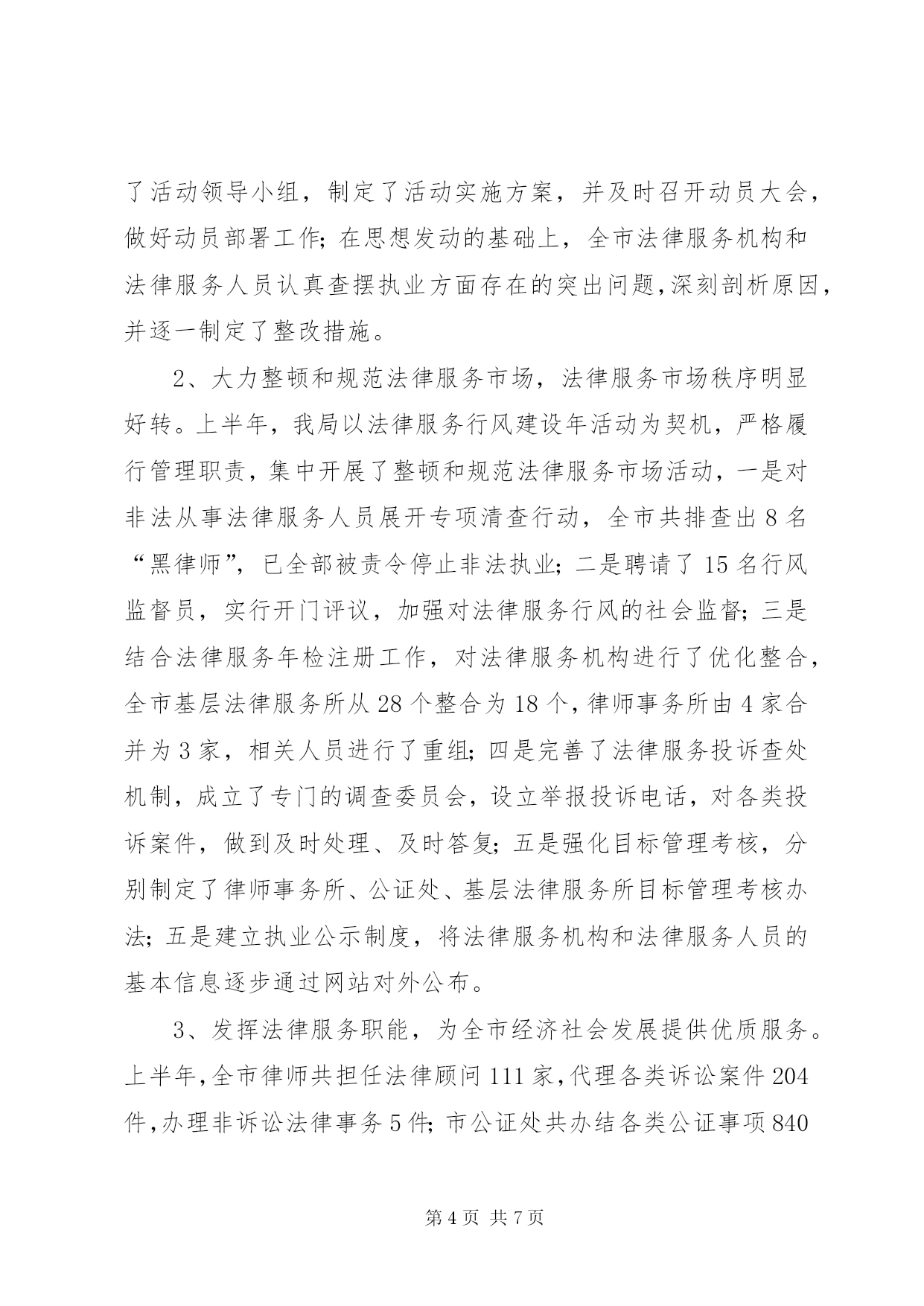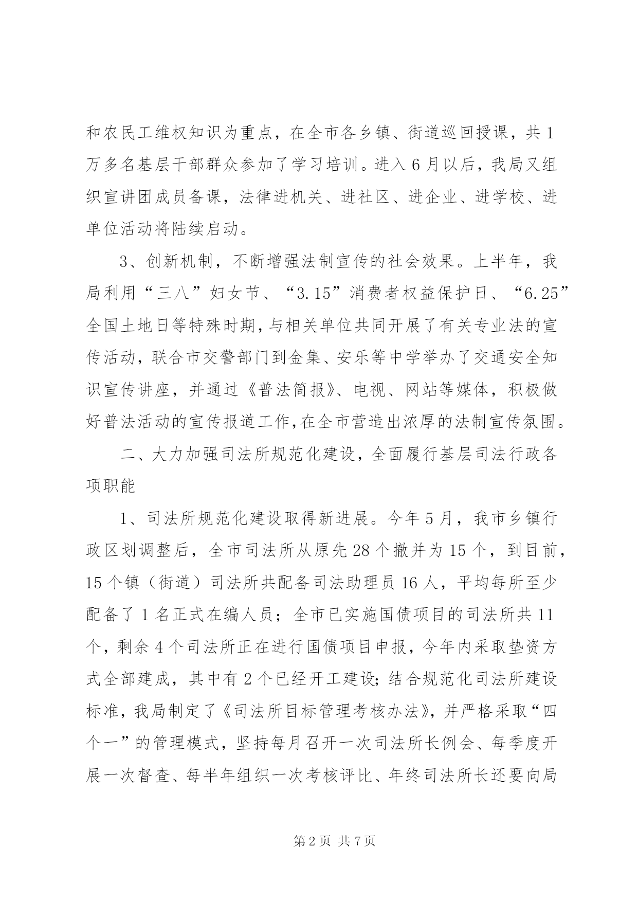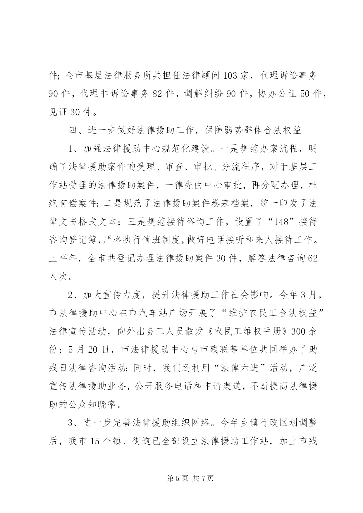 第PAGE\*Arabic\*MERGEFORMAT7页共NUMPAGES\*MERGEFORMAT7页司法局本年上半年工作总结2010年上半年,我市司法行政工作在市委、市政府的正确领导下,深入贯彻全省、市司法行政工作会议精神,围绕全市“三大工程”建设,全力做好法制宣传、法律服务和法律保障工作,大力加强司法行政队伍作风和法律服务行风建设,司法行政各项职能得到了充分发挥,为维护社会稳定、促进经济发展、构建和谐天长作出了积极贡献。一、扎实推进“五五”普法和“法律六进”活动,营造良好的社会法治环境1、落实规划,加大组织实施力度。为保证“五五”普法规划顺利实施,我局研究制定了2010年度法制宣传工作计划,并于年初组织检查,督促各乡镇(街道)、市直各单位及时制定“五五”普法规划、建立普法台帐。上半年,我局还完成了“五五”普法全国统编教材的征订发行工作,全市共组织征订《农民法律知识读本》、《干部法律知识读本》、《公务员法律知识读本》2000多册。2、突出重点,深入开展“法律六进”活动。今年3月,市委宣传部、市司法局联合下发了“法律六进”工作实施方案,并抽调18名法律专业人员成立“五五”普法宣讲团,在试讲演练的基础上,于今年4月率先完成“法律进乡村”活动,宣讲团成员结合农村实际,以《宪法》、《信访条例》、《公证法》、《继承法》和农民工维权知识为重点,在全市各乡镇、街道巡回授课,共1万多名基层干部群众参加了学习培训。进入6月以后,我局又组织宣讲团成员备课,法律进机关、进社区、进企业、进学校、进单位活动将陆续启动。3、创新机制,不断增强法制宣传的社会效果。上半年,我局利用“三八”妇女节、“3.15”消费者权益保护日、“6.25”全国土地日等特殊时期,与相关单位共同开展了有关专业法的宣传活动,联合市交警部门到金集、安乐等中学举办了交通安全知识宣传讲座,并通过《普法简报》、电视、网站等媒体,积极做好普法活动的宣传报道工作,在全市营造出浓厚的法制宣传氛围。二、大力加强司法所规范化建设,全面履行基层司法行政各项职能1、司法所规范化建设取得新进展。今年5月,我市乡镇行政区划调整后,全市司法所从原先28个撤并为15个,到目前,15个镇(街道)司法所共配备司法助理员16人,平均每所至少配备了1名正式在编人员;全市已实施国债项目的司法所共11个,剩余4个司法所正在进行国债项目申报,今年内采取垫资方式全部建成,其中有2个已经开工建设;结合规范化司法所建设标准,我局制定了《司法所目标管理考核办法》,并严格采取“四个一”的管理模式,坚持每月召开一次司法所长例会、每季度开展一次督查、每半年组织一次考核评比、年终司法所长还要向局党组述职汇报一次,确保规范化要求落到实处。2、人民调解工作发挥了重要作用。今年我局统一了人民调解卷宗的制作格式,要求每个司法所全年形成规范化调解卷宗不少于20件,进一步健全和完善了纠纷月排查制度、纠纷月报告制度,积极做好矛盾纠纷排查工作,上半年,全市司法所和各人民调解组织共调解纠纷286起,调解成功率98%,防止民转刑案件2起,制止群体性上访1件,防止群众性械斗1起,较好地发挥了人民调解在维护社会稳定中的“第一道防线”作用。3、刑释解教人员帮教安置工作实现建档管理。上半年,我局组织开展了刑释解教人员调查摸底专项活动,基本做到了底数清、情况明,全市共排查出2004-2006年刑释解教人员437人,其中已衔接367人,逐人登记并建立了《刑释解教人员详细情况表》,对未衔接人员已向公安部门作了通报,力争查明去向。各基层司法所进一步规范了刑释解教人员的卷宗档案,定期组织开展帮教活动,并按要求做好帮教记录,无一脱管、漏管,有效预防和减少了重新犯罪。三、积极开展“法律服务行风建设年活动”,努力培育健康有序的法律服务市场1、全市“法律服务行风建设年活动”取得阶段性成果。根据省厅、市司法局统一部署,结合办理市政协相关提案,今年3月以来,我局在全市开展法律服务行风建设年活动,局机关成立了活动领导小组,制定了活动实施方案,并及时召开动员大会,做好动员部署工作;在思想发动的基础上,全市法律服务机构和法律服务人员认真查摆执业方面存在的突出问题,深刻剖析原因,并逐一制定了整改措施。2、大力整顿和规范法律服务市场,法律服务市场秩序明显好转。上半年,我局以法律服务行风建设年活动为契机,严格履行管理职责,集中开展了整顿和规范法律服务市场活动,一是对非法从事法律服务人员展开专项清查行动,全市共排查出8名“黑律师”,已全部被责令停止非法执业;二是聘请了15名行风监督员,实行开门评议,加强对法律服务行风的社会监督;三是结合法律服务年检注册工作,对法律服务机构进行了优化整合,全市基层法律服务所从28个整合为18个,律师事务所由4家合并为3家,相关人员进行了重组;