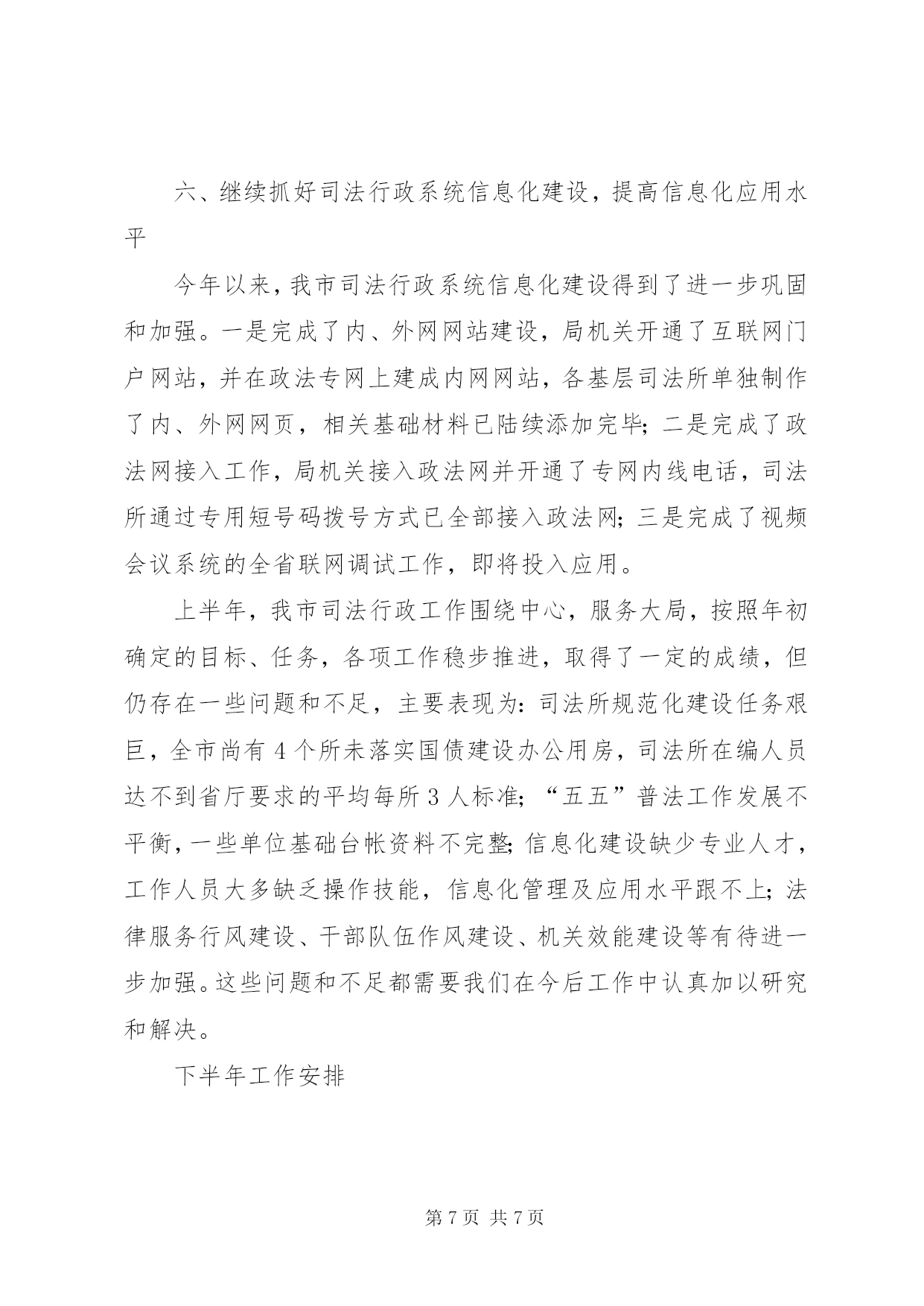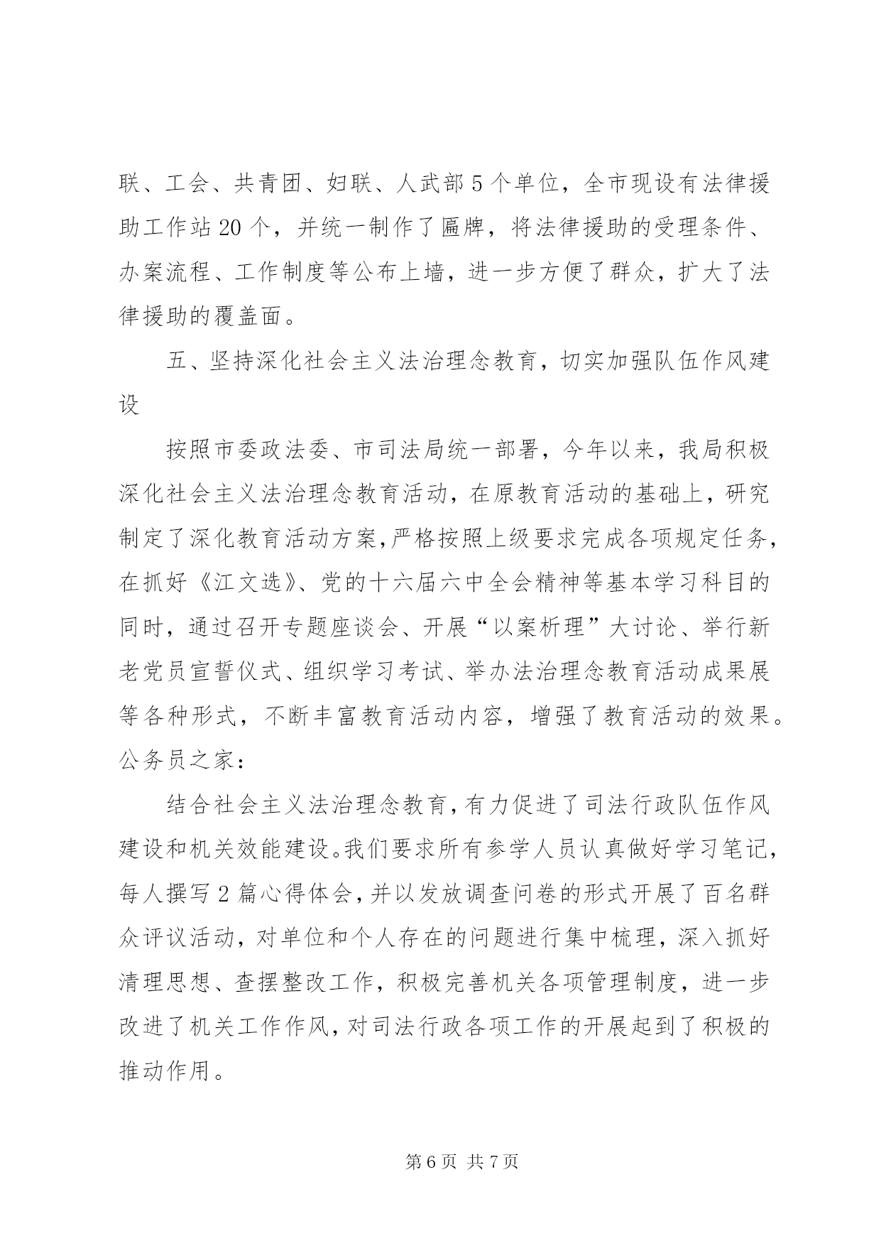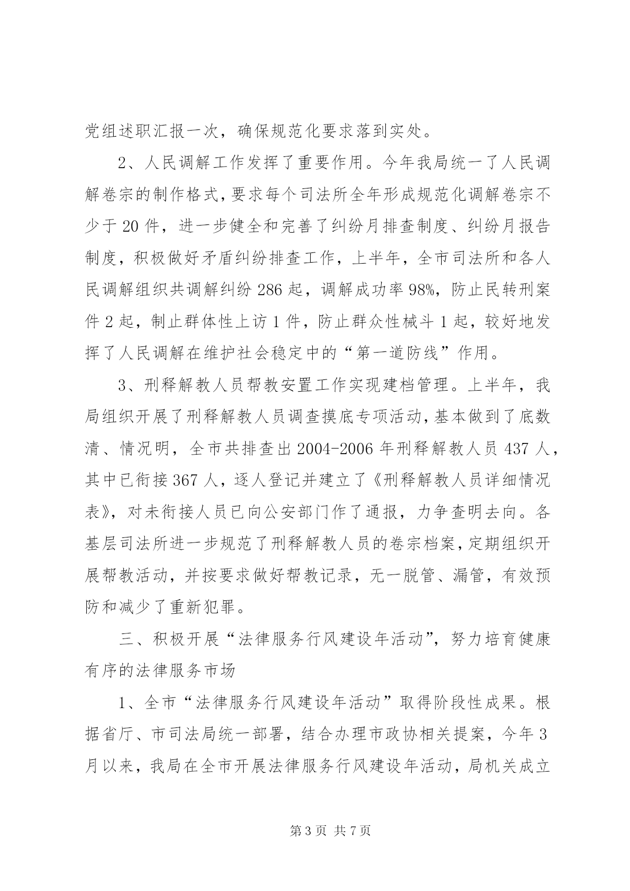 第PAGE\*Arabic\*MERGEFORMAT7页共NUMPAGES\*MERGEFORMAT7页司法局本年上半年工作总结2010年上半年,我市司法行政工作在市委、市政府的正确领导下,深入贯彻全省、市司法行政工作会议精神,围绕全市“三大工程”建设,全力做好法制宣传、法律服务和法律保障工作,大力加强司法行政队伍作风和法律服务行风建设,司法行政各项职能得到了充分发挥,为维护社会稳定、促进经济发展、构建和谐天长作出了积极贡献。一、扎实推进“五五”普法和“法律六进”活动,营造良好的社会法治环境1、落实规划,加大组织实施力度。为保证“五五”普法规划顺利实施,我局研究制定了2010年度法制宣传工作计划,并于年初组织检查,督促各乡镇(街道)、市直各单位及时制定“五五”普法规划、建立普法台帐。上半年,我局还完成了“五五”普法全国统编教材的征订发行工作,全市共组织征订《农民法律知识读本》、《干部法律知识读本》、《公务员法律知识读本》2000多册。2、突出重点,深入开展“法律六进”活动。今年3月,市委宣传部、市司法局联合下发了“法律六进”工作实施方案,并抽调18名法律专业人员成立“五五”普法宣讲团,在试讲演练的基础上,于今年4月率先完成“法律进乡村”活动,宣讲团成员结合农村实际,以《宪法》、《信访条例》、《公证法》、《继承法》和农民工维权知识为重点,在全市各乡镇、街道巡回授课,共1万多名基层干部群众参加了学习培训。进入6月以后,我局又组织宣讲团成员备课,法律进机关、进社区、进企业、进学校、进单位活动将陆续启动。3、创新机制,不断增强法制宣传的社会效果。上半年,我局利用“三八”妇女节、“3.15”消费者权益保护日、“6.25”全国土地日等特殊时期,与相关单位共同开展了有关专业法的宣传活动,联合市交警部门到金集、安乐等中学举办了交通安全知识宣传讲座,并通过《普法简报》、电视、网站等媒体,积极做好普法活动的宣传报道工作,在全市营造出浓厚的法制宣传氛围。二、大力加强司法所规范化建设,全面履行基层司法行政各项职能1、司法所规范化建设取得新进展。今年5月,我市乡镇行政区划调整后,全市司法所从原先28个撤并为15个,到目前,15个镇(街道)司法所共配备司法助理员16人,平均每所至少配备了1名正式在编人员;全市已实施国债项目的司法所共11个,剩余4个司法所正在进行国债项目申报,今年内采取垫资方式全部建成,其中有2个已经开工建设;结合规范化司法所建设标准,我局制定了《司法所目标管理考核办法》,并严格采取“四个一”的管理模式,坚持每月召开一次司法所长例会、每季度开展一次督查、每半年组织一次考核评比、年终司法所长还要向局党组述职汇报一次,确保规范化要求落到实处。2、人民调解工作发挥了重要作用。今年我局统一了人民调解卷宗的制作格式,要求每个司法所全年形成规范化调解卷宗不少于20件,进一步健全和完善了纠纷月排查制度、纠纷月报告制度,积极做好矛盾纠纷排查工作,上半年,全市司法所和各人民调解组织共调解纠纷286起,调解成功率98%,防止民转刑案件2起,制止群体性上访1件,防止群众性械斗1起,较好地发挥了人民调解在维护社会稳定中的“第一道防线”作用。3、刑释解教人员帮教安置工作实现建档管理。上半年,我局组织开展了刑释解教人员调查摸底专项活动,基本做到了底数清、情况明,全市共排查出2004-2006年刑释解教人员437人,其中已衔接367人,逐人登记并建立了《刑释解教人员详细情况表》,对未衔接人员已向公安部门作了通报,力争查明去向。各基层司法所进一步规范了刑释解教人员的卷宗档案,定期组织开展帮教活动,并按要求做好帮教记录,无一脱管、漏管,有效预防和减少了重新犯罪。三、积极开展“法律服务行风建设年活动”,努力培育健康有序的法律服务市场1、全市“法律服务行风建设年活动”取得阶段性成果。根据省厅、市司法局统一部署,结合办理市政协相关提案,今年3月以来,我局在全市开展法律服务行风建设年活动,局机关成立了活动领导小组,制定了活动实施方案,并及时召开动员大会,做好动员部署工作;在思想发动的基础上,全市法律服务机构和法律服务人员认真查摆执业方面存在的突出问题,深刻剖析原因,并逐一制定了整改措施。2、大力整顿和规范法律服务市场,法律服务市场秩序明显好转。上半年,我局以法律服务行风建设年活动为契机,严格履行管理职责,集中开展了整顿和规范法律服务市场活动,一是对非法从事法律服务人员展开专项清查行动,全市共排查出8名“黑律师”,已全部被责令停止非法执业;二是聘请了15名行风监督员,实行开门评议,加强对法律服务行风的社会监督;三是结合法律服务年检注册工作,对法律服务机构进行了优化整合,全市基层法律服务所从28个整合为18个,律师事务所由4家合并为3家,相关人员进行了重组;