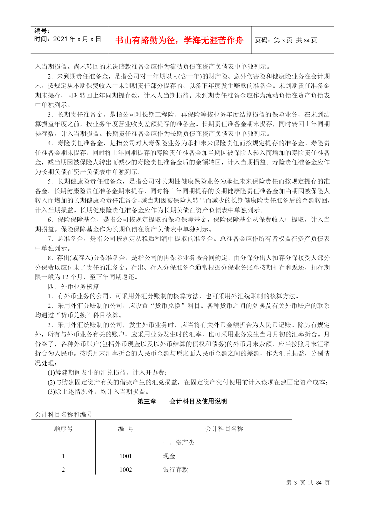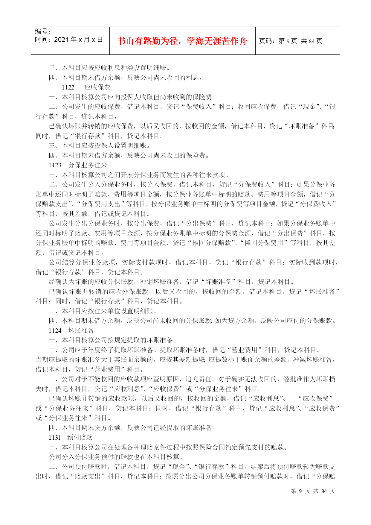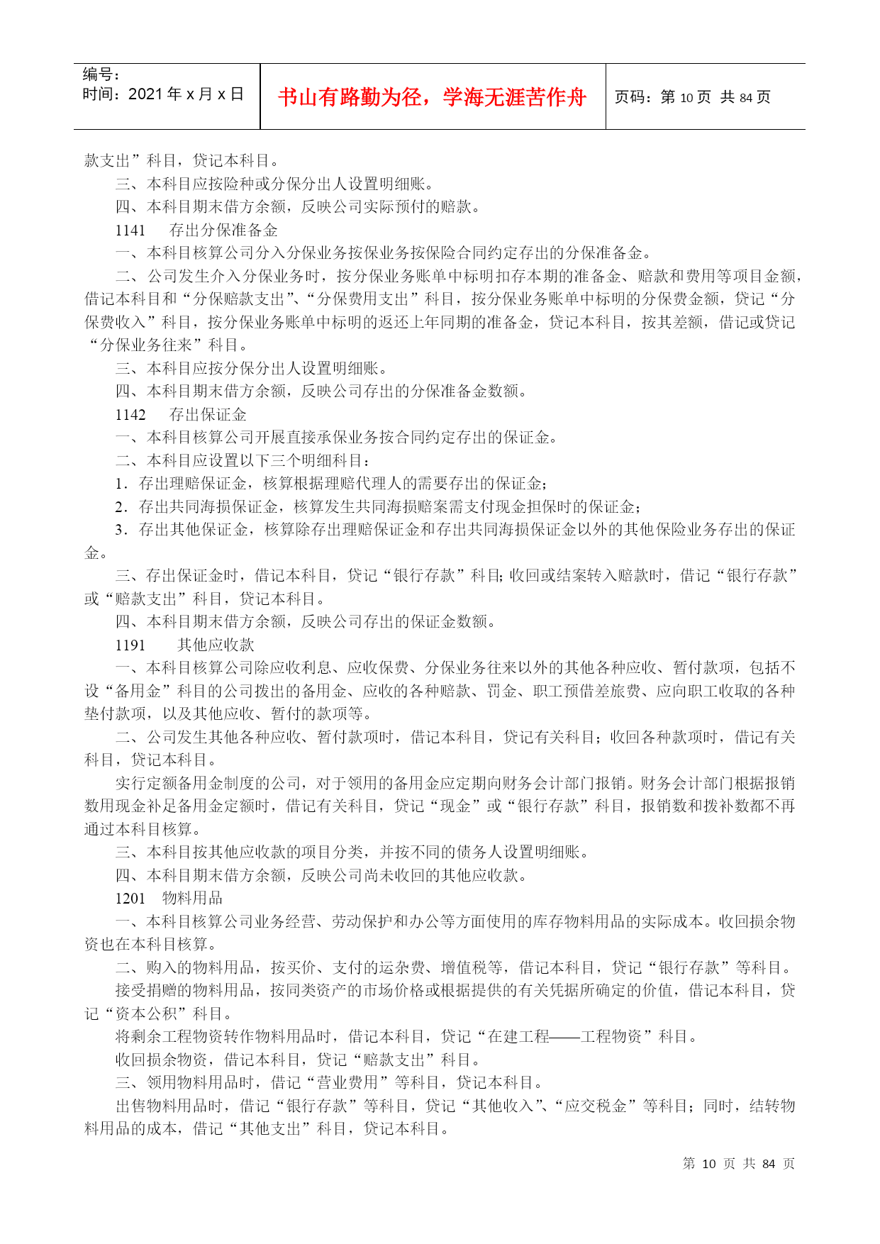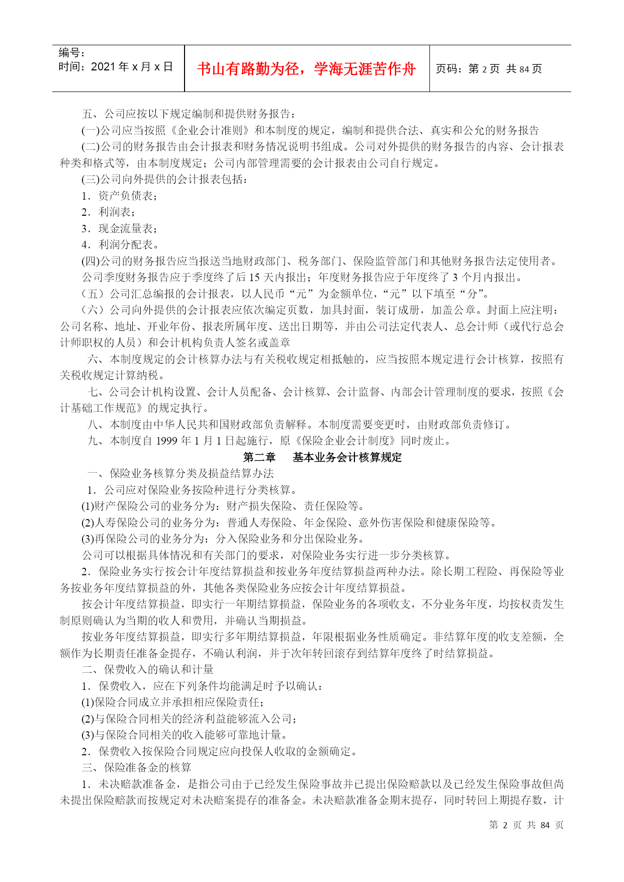 编号:时间:2021年x月x日书山有路勤为径,学海无涯苦作舟页码:第PAGE84页共NUMPAGES84页第PAGE\*MERGEFORMAT84页共NUMPAGES\*MERGEFORMAT84页保险公司会计制度1998年12月8日财政部财会字(1998)60号文发布**此文如下:各省、自治区、直辖市、计划单列市财政厅(局),中保财产保险有限公司,中保人寿保险有限公司,中保再保险有限公司,中国太平洋保险有限公司,中国平安保险有限公司,华泰财产保险有限公司,泰康人寿保险股份有限公司,新华人寿保险股份有限公司,天安保险公司,永安财产保险股份有限公司,新疆兵团保险公司:为了适应我国社会主义市场经济的发展,规范和加强保险公司的会计核算工作,满足保险监管的需要,根据《中华人民共和国会计法》、《中华人民共和国保险法》、《企业会计准则》以及国家其他有关法律、法规,我们对1993年制定的《保险企业会计制度》([93]财会字第07号)进行了系统地修订。现将修订的《保险公司会计制度》印发给你们,请布置所属保险公司自1999年1月1日起执行。保险公司原执行的会计制度同时废止。执行中有何问题,请及时函告我部。目录第一章总则第二章基本业务会计核算规定第三章会计科目及使用说明第三章会计报表及编制说明附录:主要会计事项分录举例第一章总则一、为了适应我国社会主义市场经济发展的需要,加强保险公司会计核算工作,维护投资者和债权人的合法权益,根据《中华人民共和国会计法》、《中华人民共和国保险法》、《企业会计准则》以及国家其他有关法律、法规,制定本制度。二、本制度适用于按照规定程序,经批准设立的保险公司(以下简称公司)。三、公司应当按照(企业会计准则)规定的一般原则和本制度的要求,进行会计核算。公司在不违背《企业会计准则》和本制度规定的前提下,可结合本公司的具体情况,制定本公司的会计制度。四、公司应按以下规定运用会计科目:(一)本制度统一规定会计科目的编号,以便于编制会计凭证,登记账簿,查阅账目,实行会计电算化。公司不应随意改变或打乱重编。在某些会计科目之间留有空号,供增设会计科目之用。(二)公司应按本制度的规定,设置和使用会计科目。在不影响会计核算要求和会计报表指标汇总,以及对外提供统一会计报表的前提下,可以根据实际情况自行增设、减少或合并某些会计科目。明细科目的设置,除本制度已有规定者外,在不违反统一会计核算要求的前提下,公司可以根据需要,自行规定。(三)公司在填制会计凭证、登记账簿时,应填制会计科目的名称,或者同时填制会计科目的名称和编号,不应只填科目编号,不填科目名称。五、公司应按以下规定编制和提供财务报告:(一)公司应当按照《企业会计准则》和本制度的规定,编制和提供合法、真实和公允的财务报告(二)公司的财务报告由会计报表和财务情况说明书组成。公司对外提供的财务报告的内容、会计报表种类和格式等,由本制度规定;公司内部管理需要的会计报表由公司自行规定。(三)公司向外提供的会计报表包括:1.资产负债表;2.利润表;3.现金流量表;4.利润分配表。(四)公司的财务报告应当报送当地财政部门、税务部门、保险监管部门和其他财务报告法定使用者。公司季度财务报告应于季度终了后15天内报出;年度财务报告应于年度终了3个月内报出。(五)公司汇总编报的会计报表,以人民币“元”为金额单位,“元”以下填至“分”。(六)公司向外提供的会计报表应依次编定页数,加具封面,装订成册,加盖公章。封面上应注明:公司名称、地址、开业年份、报表所属年度、送出日期等,并由公司法定代表人、总会计师(或代行总会计师职权的人员)和会计机构负责人签名或盖章六、本制度规定的会计核算办法与有关税收规定相抵触的,应当按照本规定进行会计核算,按照有关税收规定计算纳税。七、公司会计机构设置、会计人员配备、会计核算、会计监督、内部会计管理制度的要求,按照《会计基础工作规范》的规定执行。八、本制度由中华人民共和国财政部负责解释。本制度需要变更时,由财政部负责修订。九、本制度自1999年1月1日起施行,原《保险企业会计制度》同时废止。第二章基本业务会计核算规定一、保险业务核算分类及损益结算办法1.公司应对保险业务按险种进行分类核算。(1)财产保险公司的业务分为:财产损失保险、责任保险等。(2)人寿保险公司的业务分为:普通人寿保险、年金保险、意外伤害保险和健康保险等。(3)再保险公司的业务分为:分入保险业务和分出保险业务。公司可以根据具体情况和有关部门的要求,对保险业务实行进一步分类核算。2.保险业务实行按会计年度结算损益和按业务年度结算损益两种办法。除长期工程险、再保险等业务按业务年度结算损益的外,其他各类
