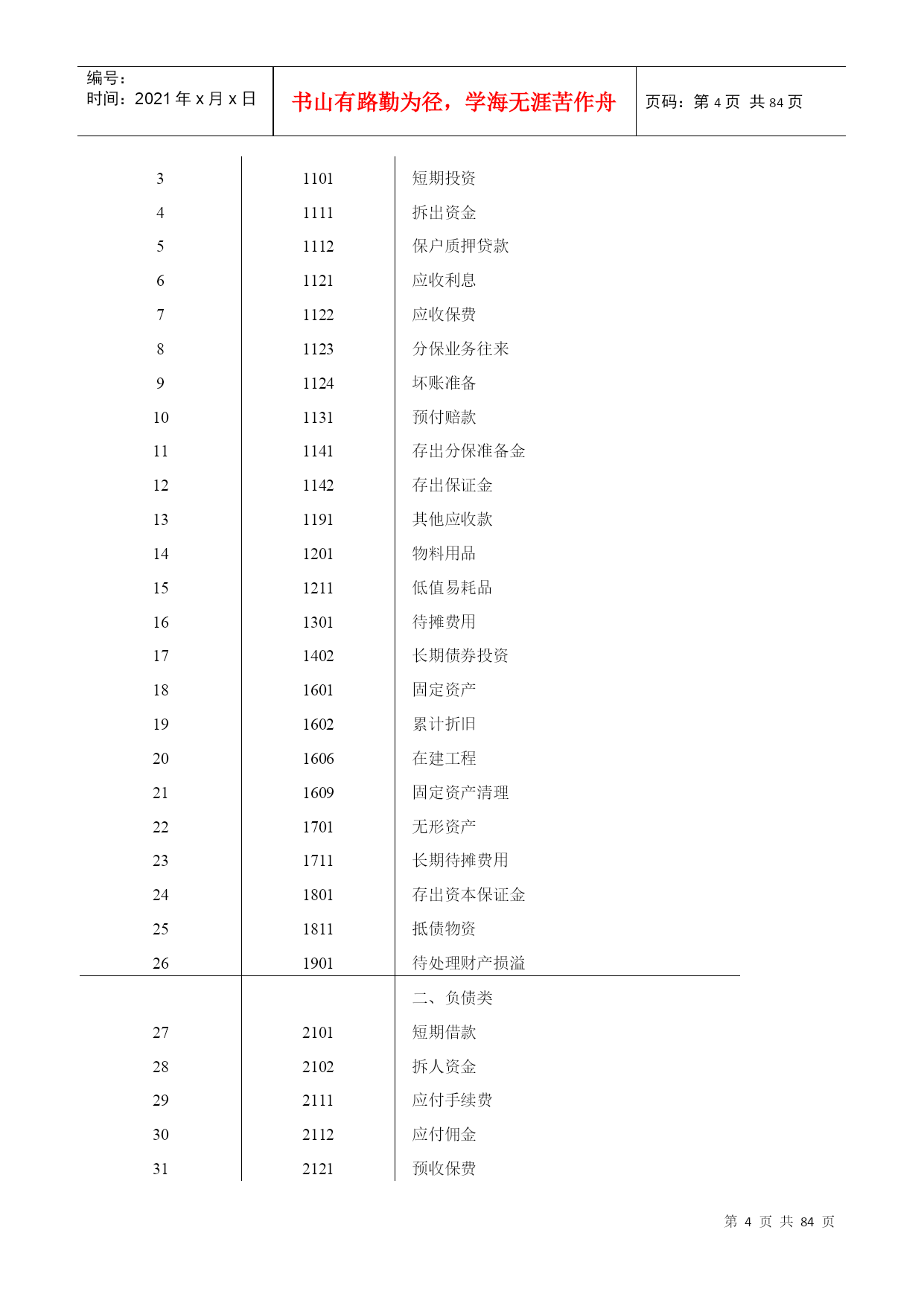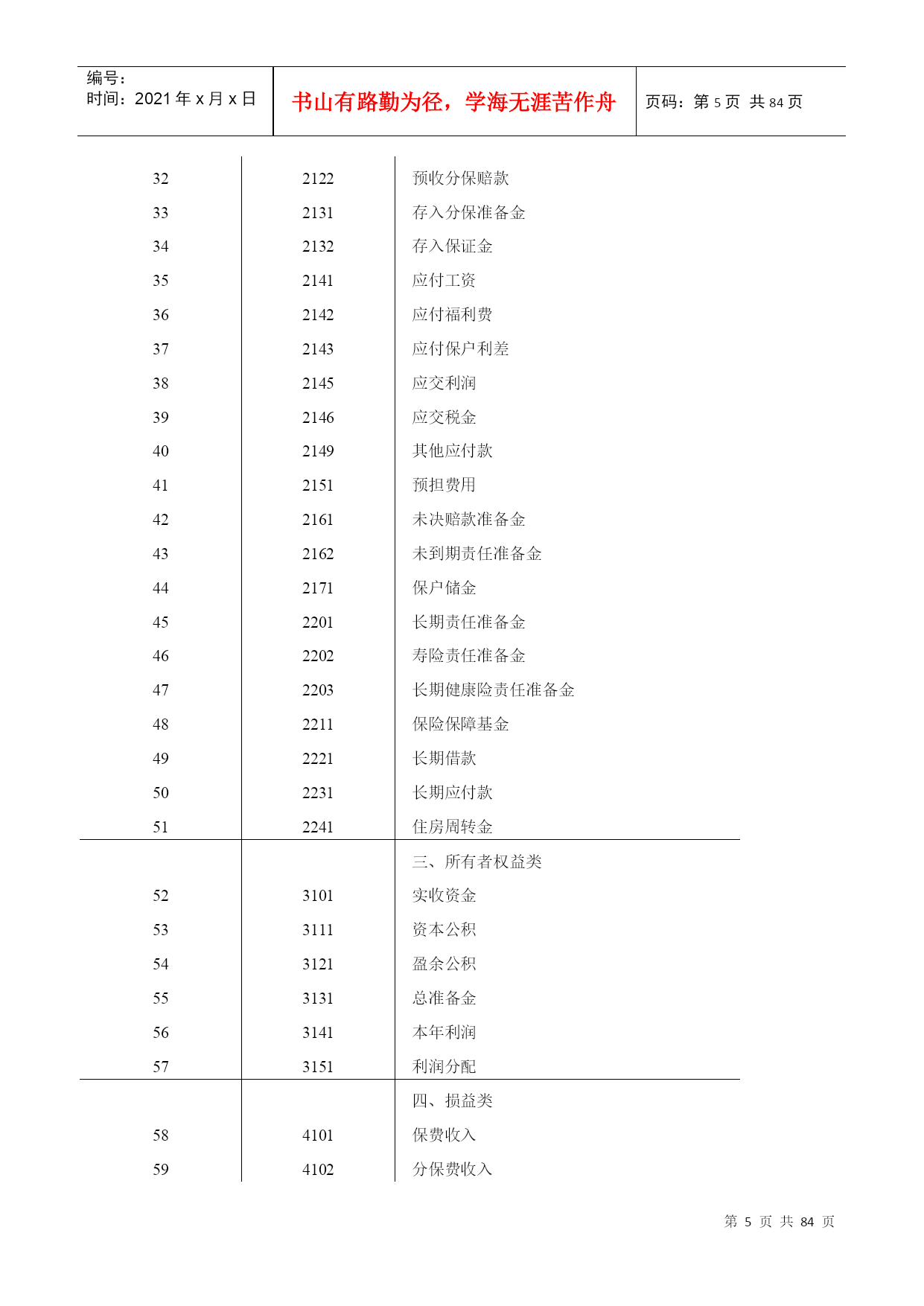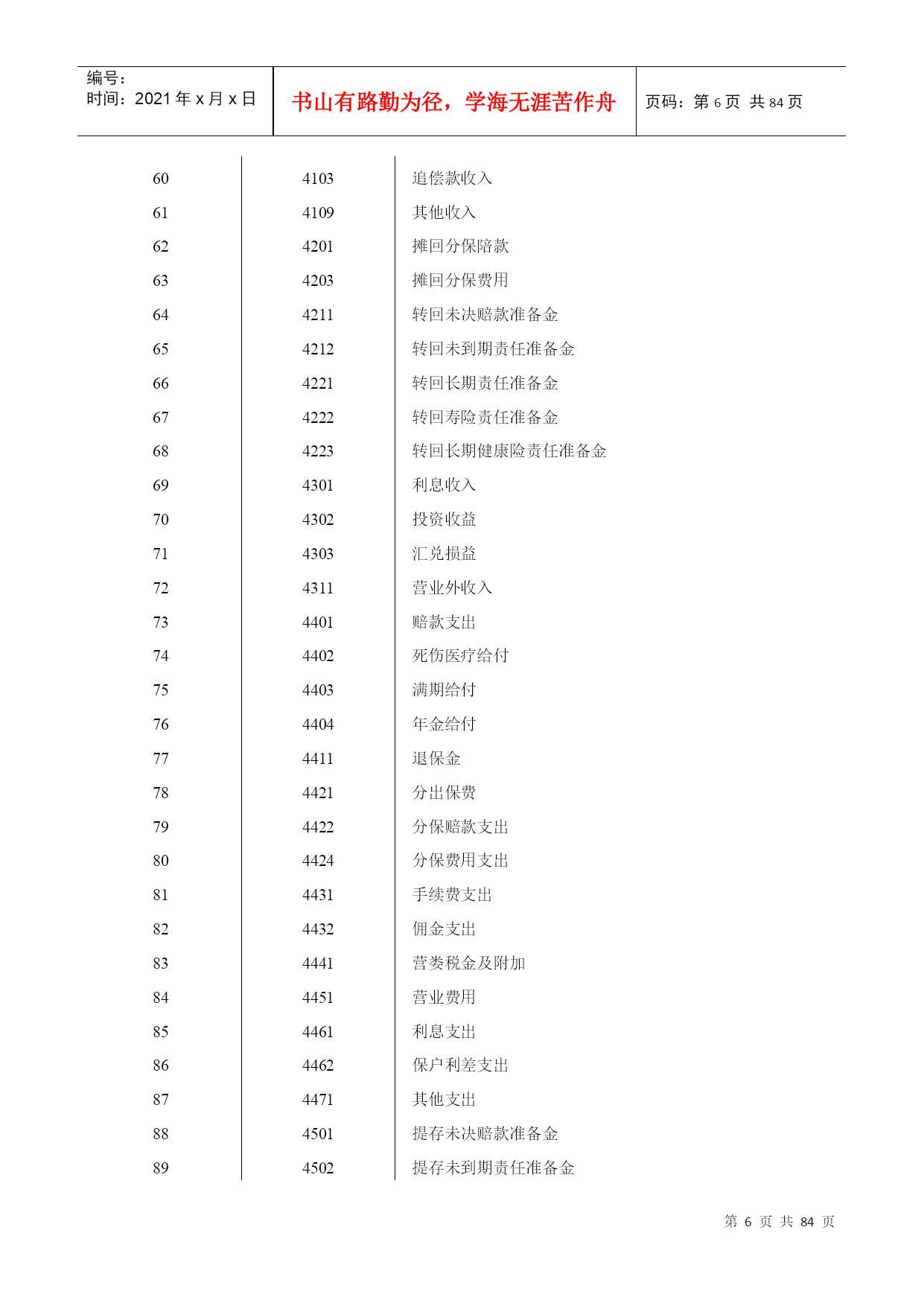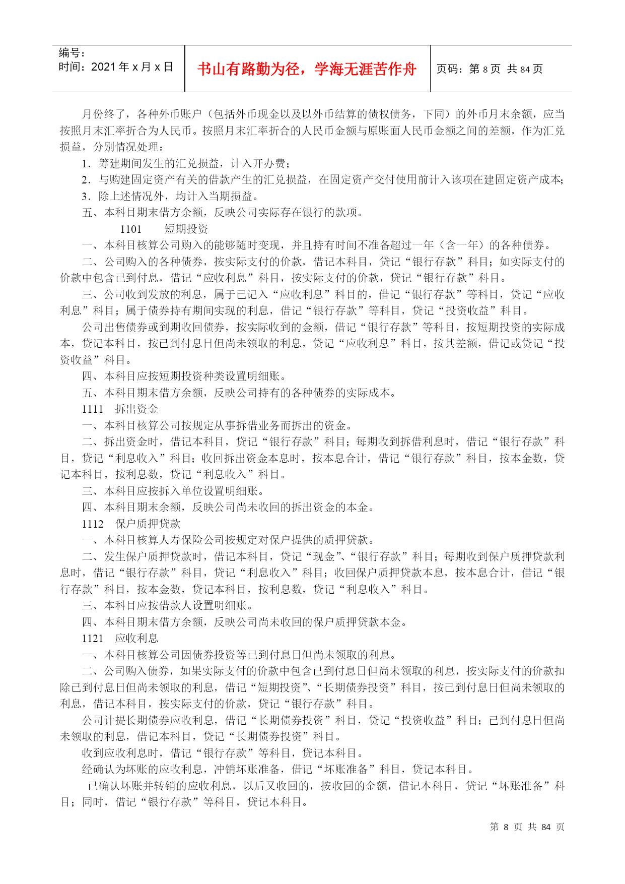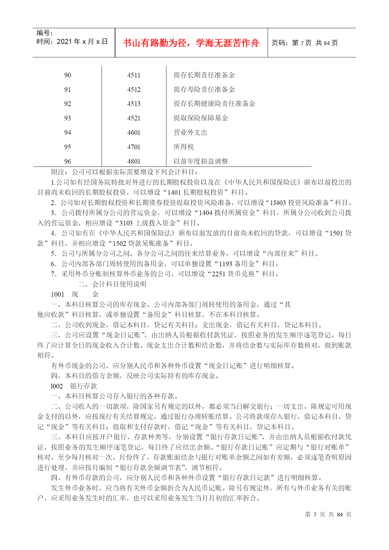 编号:时间:2021年x月x日书山有路勤为径,学海无涯苦作舟页码:第PAGE84页共NUMPAGES84页第PAGE\*MERGEFORMAT84页共NUMPAGES\*MERGEFORMAT84页保险公司会计制度1998年12月8日财政部财会字(1998)60号文发布**此文如下:各省、自治区、直辖市、计划单列市财政厅(局),中保财产保险有限公司,中保人寿保险有限公司,中保再保险有限公司,中国太平洋保险有限公司,中国平安保险有限公司,华泰财产保险有限公司,泰康人寿保险股份有限公司,新华人寿保险股份有限公司,天安保险公司,永安财产保险股份有限公司,新疆兵团保险公司:为了适应我国社会主义市场经济的发展,规范和加强保险公司的会计核算工作,满足保险监管的需要,根据《中华人民共和国会计法》、《中华人民共和国保险法》、《企业会计准则》以及国家其他有关法律、法规,我们对1993年制定的《保险企业会计制度》([93]财会字第07号)进行了系统地修订。现将修订的《保险公司会计制度》印发给你们,请布置所属保险公司自1999年1月1日起执行。保险公司原执行的会计制度同时废止。执行中有何问题,请及时函告我部。目录第一章总则第二章基本业务会计核算规定第三章会计科目及使用说明第三章会计报表及编制说明附录:主要会计事项分录举例第一章总则一、为了适应我国社会主义市场经济发展的需要,加强保险公司会计核算工作,维护投资者和债权人的合法权益,根据《中华人民共和国会计法》、《中华人民共和国保险法》、《企业会计准则》以及国家其他有关法律、法规,制定本制度。二、本制度适用于按照规定程序,经批准设立的保险公司(以下简称公司)。三、公司应当按照(企业会计准则)规定的一般原则和本制度的要求,进行会计核算。公司在不违背《企业会计准则》和本制度规定的前提下,可结合本公司的具体情况,制定本公司的会计制度。四、公司应按以下规定运用会计科目:(一)本制度统一规定会计科目的编号,以便于编制会计凭证,登记账簿,查阅账目,实行会计电算化。公司不应随意改变或打乱重编。在某些会计科目之间留有空号,供增设会计科目之用。(二)公司应按本制度的规定,设置和使用会计科目。在不影响会计核算要求和会计报表指标汇总,以及对外提供统一会计报表的前提下,可以根据实际情况自行增设、减少或合并某些会计科目。明细科目的设置,除本制度已有规定者外,在不违反统一会计核算要求的前提下,公司可以根据需要,自行规定。(三)公司在填制会计凭证、登记账簿时,应填制会计科目的名称,或者同时填制会计科目的名称和编号,不应只填科目编号,不填科目名称。五、公司应按以下规定编制和提供财务报告:(一)公司应当按照《企业会计准则》和本制度的规定,编制和提供合法、真实和公允的财务报告(二)公司的财务报告由会计报表和财务情况说明书组成。公司对外提供的财务报告的内容、会计报表种类和格式等,由本制度规定;公司内部管理需要的会计报表由公司自行规定。(三)公司向外提供的会计报表包括:1.资产负债表;2.利润表;3.现金流量表;4.利润分配表。(四)公司的财务报告应当报送当地财政部门、税务部门、保险监管部门和其他财务报告法定使用者。公司季度财务报告应于季度终了后15天内报出;年度财务报告应于年度终了3个月内报出。(五)公司汇总编报的会计报表,以人民币“元”为金额单位,“元”以下填至“分”。(六)公司向外提供的会计报表应依次编定页数,加具封面,装订成册,加盖公章。封面上应注明:公司名称、地址、开业年份、报表所属年度、送出日期等,并由公司法定代表人、总会计师(或代行总会计师职权的人员)和会计机构负责人签名或盖章六、本制度规定的会计核算办法与有关税收规定相抵触的,应当按照本规定进行会计核算,按照有关税收规定计算纳税。七、公司会计机构设置、会计人员配备、会计核算、会计监督、内部会计管理制度的要求,按照《会计基础工作规范》的规定执行。八、本制度由中华人民共和国财政部负责解释。本制度需要变更时,由财政部负责修订。九、本制度自1999年1月1日起施行,原《保险企业会计制度》同时废止。第二章基本业务会计核算规定一、保险业务核算分类及损益结算办法1.公司应对保险业务按险种进行分类核算。(1)财产保险公司的业务分为:财产损失保险、责任保险等。(2)人寿保险公司的业务分为:普通人寿保险、年金保险、意外伤害保险和健康保险等。(3)再保险公司的业务分为:分入保险业务和分出保险业务。公司可以根据具体情况和有关部门的要求,对保险业务实行进一步分类核算。2.保险业务实行按会计年度结算损益和按业务年度结算损益两种办法。除长期工程险、再保险等业务按业务年度结算损益的外,其他各类