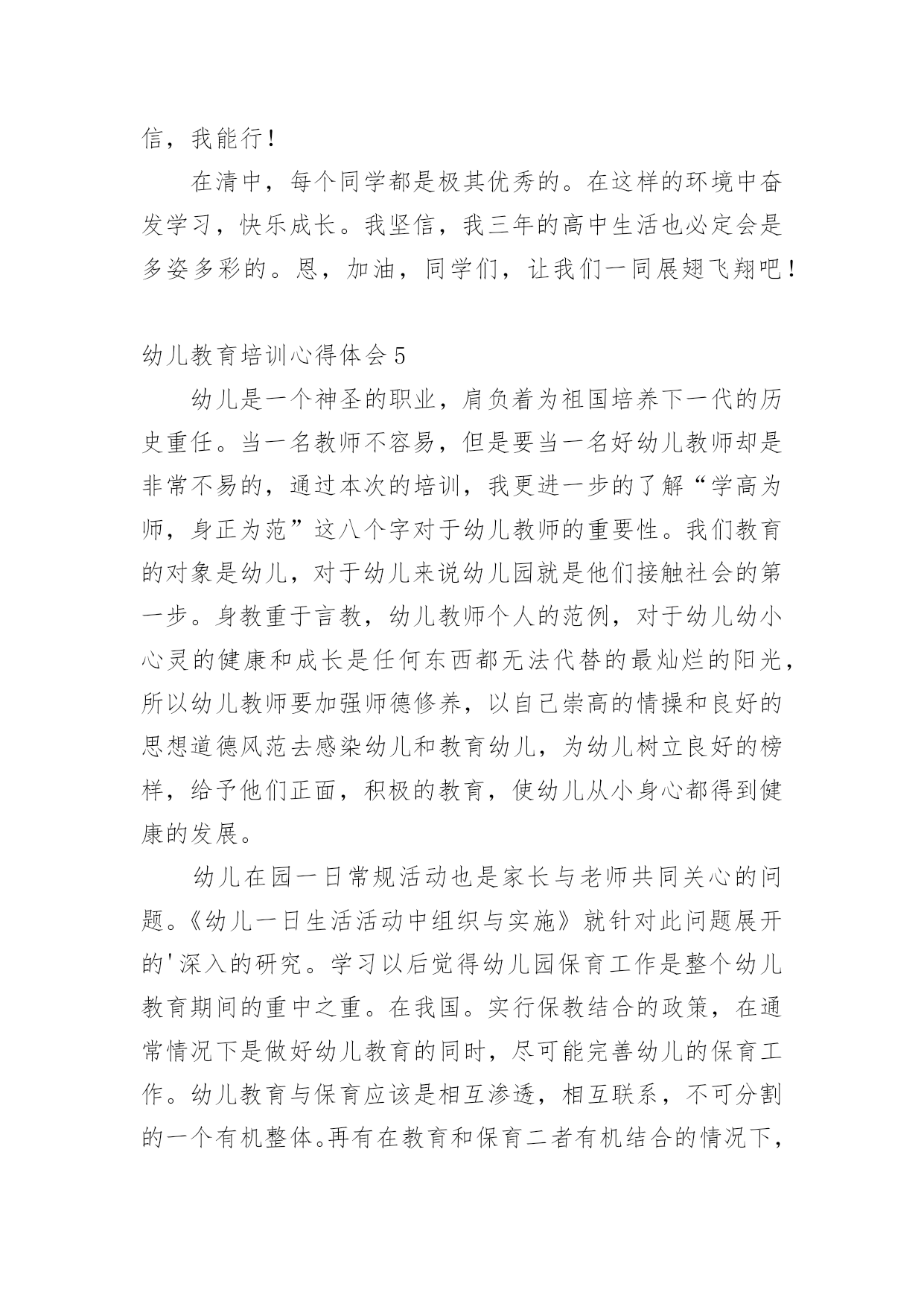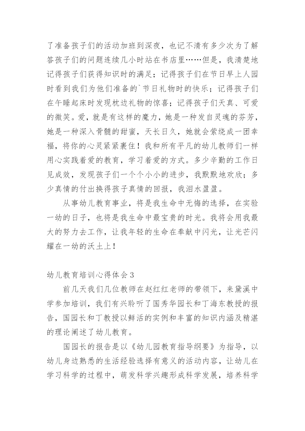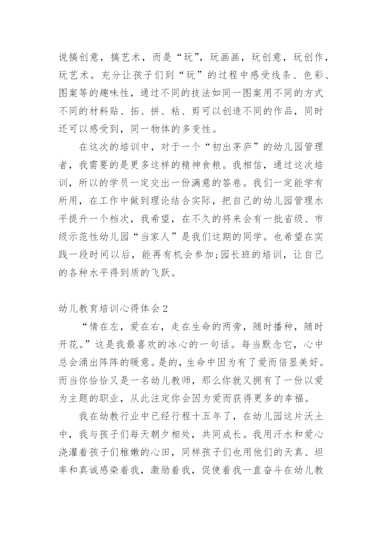 幼儿教育培训心得体会当我们对人生或者事物有了新的思考时,就很有必要写一篇心得体会,这样可以帮助我们分析出现问题的原因,从而找出解决问题的办法。怎样写好心得体会呢?以下是小编为大家收集的幼儿教育培训心得体会,欢迎大家借鉴与参考,希望对大家有所帮助。幼儿教育培训心得体会1虽然仅只有20天的园长培训,但我对幼儿园园长这一职位有了新的认识:园长不仅肩负为人才培养奠基的艰巨任务,还是一所幼儿园的总策划者。要办好幼儿园、提高整体教育质量,关键在于园长,从某种意见上讲,一个好的园长就意味着一所好的幼儿园。在园中,园长的思想、行为和作风能影响全局,作为园长,她所担负的管理是整个园所的教育、保育、后勤三方面的工作。首先园长要明确幼儿园的任务、性质、地位、作用、目标、职能等多方面的知识。在教育中,要求不断地更新观念、教育教学模式,组织教师们开展各类教学业务活动和幼儿一日活动,做好与家长的沟通工作;在保育上,把好安全和卫生观,严格按照保育员手册执行,做好幼儿的个人整洁卫生工作,并配合教师做好教育工作,真正地体现出保教结合的概念;在后勤上,做好园内的.服务工作。针对这一系列的工作,园长必须建立一套正确可行的管理制度,同时一名园长还必须树立起正确几重观、发展观、教育观,一切以孩子为出发点,尽可能为全园幼儿提供良好学习游戏环境和高质量的教学水平,使他们在舒适的氛围中健康快乐的成长,也为他们入小学奠定坚定的基础课堂里我有幸能听到郴州师范政治高讲黄成元老师向我们指明了教育现状和教育事业的发展方向,让我们认识到我们要一起为我国的教育事业做贡献;也很感谢我们那么多的幼教先驱们能那么心胸宽广与我们共同分享多年的幼教经验:有郴州市直机关幼儿园的彭园长,向我们讲述了撰写教学案例的典范,让我们认识到教学案例并不是一谓的重复往日的内容,为了完成一页纸而矣,而是要将它当作是一项创作,要用设计的理念去完成它,要精典又不失新异且真实;有郴州市实验幼儿园的美术教学法王老师和舞蹈教学周老师,课堂气氛生动活泼,那毫无保留的教学,很是咸悟;还有省直第二幼儿园向园长不辞劳苦百忙中赶到郴州给我们上课,让我们对安全有了新的认识,安全大于天!在所学课程里美术让我感悟特多,所学到的也多,我接触幼儿园的方方面面并不是很多,特别是美术教学这一块,虽然自己是美术设计专业毕业的但结合幼儿绘画教学的学习和思考并不多,对幼儿美术教育很是困扰,尤其是对将自己到美术中所学理论的专业的知识将其通俗化应用到幼儿园的环境布置和美术教学这一块开启了方向,懂得了如何将美术中所要学的内容找到一种合适的方式结合到幼儿教学中,要让孩子们在玩的过程中学习,吸引它们爱上美术,不说搞创意,搞艺术,而是“玩”,玩画画,玩创意,玩创作,玩艺术。充分让孩子们到“玩”的过程中感受线条、色彩、图案等的趣味性,通过不同的技法如同一图案用不同的方式不同的材料贴、拓、拼、粘、剪可以创造不同的作品,同时还可以感受到,同一物体的多变性。在这次的培训中,对于一个“初出茅庐”的幼儿园管理者,我需要的是更多这样的精神食粮。我相信,通过这次培训,所以的学员一定交出一份满意的答卷。我们一定能学有所用,在工作中做到理论结合实际,把自己的幼儿园管理水平提升一个档次,我希望,在不久的将来会有一批省级、市级示范性幼儿园“当家人”是我们这期的同学。也希望在实践一段时间以后,能再有机会参加;园长班的培训,让自己的各种水平得到质的飞跃。幼儿教育培训心得体会2“情在左,爱在右,走在生命的两旁,随时播种,随时开花。”这是我最喜欢的冰心的一句话。每当默念它,心中总会涌出阵阵的暖意。是的,生命中因为有了爱而倍显美好。而当你恰恰又是一名幼儿教师,那么你就又拥有了一份以爱为主题的职业,从此注定你会因为爱而获得更多的幸福。我在幼教行业中已经行程十五年了,在幼儿园这片沃土中,我与孩子们每天朝夕相处,共同成长。我用汗水和爱心浇灌着孩子们稚嫩的心田,同样孩子们也用他们的天真、坦率和真诚感染着我,激励着我,促使着我一直奋斗在幼儿教育的行业中,一直以孩子们为伴,以孩子们为友,我为我选择了这份在充满欢乐与温暖的乐园播撒爱的职业而骄傲、自豪、欣慰。把我毕生的精力全都奉献给幼儿教育事业,我无怨无悔,因为,我爱孩子,我爱幼儿教育事业。而我作为一名幼儿教育工作者,我的职责就在于能够真正地把爱心奉献给所有的孩子,用真爱小心地呵护每一个孩子的心灵,真正用心对待每个活动,精心设计每一个教学环节,珍惜每一次与孩子的沟涌,让孩子每一天都在期待和惊喜中度过。所以,在工作中,我总是和孩子们、家长们交朋友,把他们的每件事、每一句话都放在心上,然后比做自己的事情更加小心、更加用心地去完成、去解决。世界上没有完全相同的两片树叶,—也没有完全相同的两个孩子,要教育幼儿,首先要了解幼儿。为了了解儿童,我学会了在活动中观察,在观察