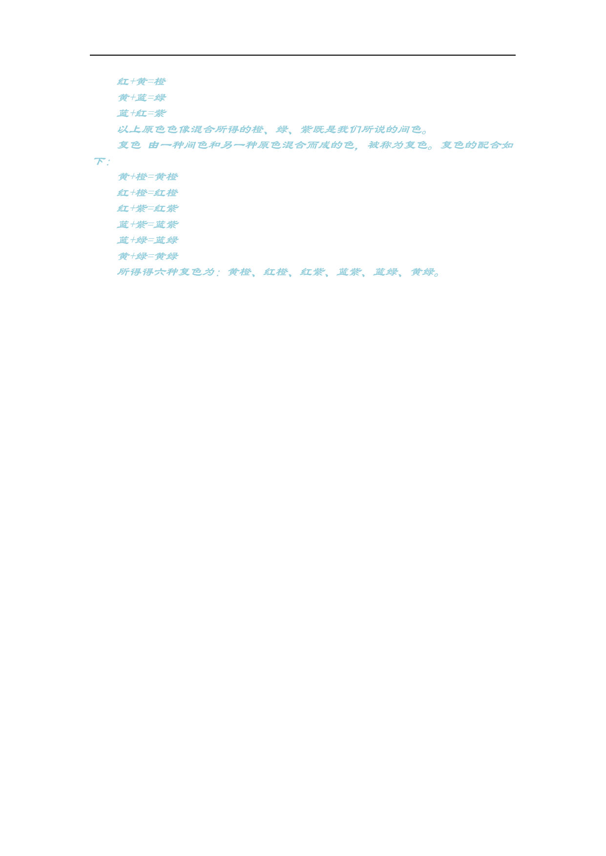 柠檬黄-柠檬黄-淡黄-中黄-土黄-桔黄-桔红-赭石-熟褐白-肉色-朱红玫瑰红-大红--深红-紫罗兰-青莲白-粉绿-淡绿-浅绿-草绿-翠绿-橄榄绿-墨绿灰-天蓝-钴蓝-群青-蓝莲-湖蓝-普蓝-黑按调色盒相近的颜色排列(可以减轻颜色相混时对色纯度的影响)2白、柠檬黄(冷调黄)淡黄(暖调黄)、中黄(暖调黄)、土黄(暗调黄)桔黄(或桔红)、朱红(暖调红)、曙红(冷调红)深红(用来压暗红系的重色)、褚石(很常用的哦)、熟褐(脏脏的重色,不敢多用,但很好用)玫瑰红(美丽透明的颜色,爆炸力强,干后反色,少用效果极好)、紫罗兰(美丽的冷调色)、群青(偏暖的蓝)钴蓝(挺正的蓝)、湖蓝(冷艳的蓝)、普蓝(除黑之外最重的色,用来加重画面的重色)淡绿(偏暖的绿)、中绿(用得较多的绿,比较正)、深绿(或橄榄绿,用来压暗绿色系)粉绿(偏冷,画苹果的时候挺好用的)、草绿(不用说了,画草的时候得劲)、黑(很少用到,但需要备着点)3蓝色+黄色=白色(其实是带有点肉色的颜色,因为调色调的很淡,所以说是白色)其实纯白色是调不出来的蓝色+黄色=绿看是什么黄如果是柠檬黄那就是草绿土黄是深绿淡黄或中黄是浅绿看自己加蓝多还是黄多美术有3原色:红蓝紫红+黄=橙红+蓝=紫蓝+黄=绿朱红+谱蓝=黑色不想要黑色太黑,可以多加点蓝或红。当然在画大面积的空间时比如大快布,背景等可以添加其他颜色,使黑色变的亮些,透出其色彩丰富红色+绿色=黄色绿色+蓝色=青色红色+蓝色=品红4原色原色是指不能用其他色混合而成的颜色。而原色则可以混合出许许多多其他的色彩。在依顿色相环中红、黄、蓝为三原色,他把这三种原色的标准定为:红:不带蓝也不带黄味的红色。黄:不带绿也不带红味的黄色。蓝:不带绿也不带红味的蓝色。间色由任意两个原色混合后的色被称为间色。那么,三原色就可以调出三个间色来。它们的配合如下:红+黄=橙黄+蓝=绿蓝+红=紫以上原色色像混合所得的橙、绿、紫既是我们所说的间色。复色由一种间色和另一种原色混合而成的色,被称为复色。复色的配合如下:黄+橙=黄橙红+橙=红橙红+紫=红紫蓝+紫=蓝紫蓝+绿=蓝绿黄+绿=黄绿所得得六种复色为:黄橙、红橙、红紫、蓝紫、蓝绿、黄绿。