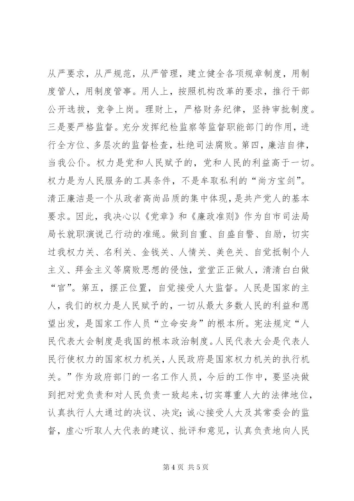 第PAGE\*Arabic\*MERGEFORMAT5页共NUMPAGES\*MERGEFORMAT5页市司法局局长就职演说人大常委会如能通过对我的任命,任期内我的工作目标是“五个致力于”:一是致力于充分发挥司法行政职能,全力维护社会稳定,为改革和发展创造良我的法治环境。紧密配合“严打”整治斗争,大力开展法制宣传教育活动,努力从根本上预防和减少违法犯罪。要始终坚持“惩罚与改造相结合,以改造人为宗旨”和“教育、感化、挽救”的工作方针,加强对监所依法、严格、文明、科学管理,积极推进现代化监所创建活动,努力建立确保监所安全稳定的高效机制。抓我落实刑释解教人员的安置帮教工作,配合“严打”整治,减少社会乱源,并深入开展“无刑释解教人员重新犯罪”活动。积极组织律师开展“严打”刑事辩护,维护司法公正。二是致力于全面开展“四五”普法和依法治理工作,不断推进依法治进程。根据党中央、全国人大常委会、国务院和委、人大常委会、政府及委、人大常委会政府的统一部署,认真总结“三五”普法和依法治理工作的基础上,大力开展多形式、全方位的法制宣传教育活动,不断增强广大公民社会主义民主法制意识,努力做到学法、知法、守法、用法、护法。实现由提高全民法律意识向提高全民法律素质的转变,实现由注重依靠行政手段管理向注重运用法律手段管理的转变,全面提高社会法治化管理水平。三是致力于抓我基层基础工作,大力开展“民安工程”活动,不断强化基层司法行政职能。要按照中共中央《关于进一步加强综合治理工作的意见》的要求和“强基层,打基幢的工作方针,建设我基层司法机构和“司法调解中心”,配齐、配强司法专干,完善办公办案条件,充分发挥人民调解工作维护社会稳定中的基础性作用。做我矛盾排查纠纷调解工作,努力把问题解决基层,确保基层社会政治稳定。四是致力于抓我法律服务工作,为全的改革和发展提供有力的法制保障。充分发挥律师、公证、基层法律服务的职能作用,紧密围绕我“十五”经济发展目标和我国加入“wto”的需要,以“三个代表”重要思想为指导,以“送法下进厂”、“服务上门到户”为主要内容,充分发挥“148”法律服务专线和法律援助中心的作用,积极组织广大法律工作者和司法行政队伍深入基层开展法律服务工作,为推进我工业化进程提供优质高效的法律服务。五是致力于提高司法行政队伍整体素质,不断加强队伍建设。要以“三个代表”重要思想为指导,认真贯彻落实党的十五届六中全会精神,把司法行政队伍建设成一支政治合格、纪律严明、作风过硬、业务精通、执法如山、党和人民放心、人民群众满意的可靠队伍。为实现上述目标,我的主要措施是:第一,加强学习,努力提高思想政治理论素质。随着时代的进步和岗位角色的变换,面对新的形势、新的任务、新的情况,迫切需要自己抓我政治理论和专业知识的学习,努力提高驾驭全局、开拓进娶做我本职工作的能力。因此,我必须把学习放重中之重。一要认真学习马列主义、毛泽东思想、邓小平理论和江泽民同志“三个代表”的重要思想;二要认真学习法律和司法行政方面的知识,防止“以其昏昏,使人昭昭”;三要向同行们学习,并社会实践中得到锻炼和提高。通过学习不断提高思想政治理论水平,自觉地与江泽民同志为核心的党中央思想上、政治上、行动上保持高度一致,带头成为学法、懂法、依法办事的表率。第二,当我“班长”,努力带我班子。“班长”作为领导的“主角”,自己必须做到,首先,要按照“集体领导、民主集中的原则,发挥总揽全局、协调各方的作用。其次,正确处理个人与组织的关系,摆正自己党内生活中的位置,识大体、顾大局、讲原则,处处以党的利益为重,严格按照党的纪律办事。再次,要正确处理我与班子其他成员之间的关系。做到相互尊重、相互信任、相互支持、相互谅解,大事讲原则,小事讲风格,切实维护我班子的团结,努力增强班子的凝聚力和战斗力。第三,从严治警,努力建设一支高素质的司法干警队伍。队伍不强,责任难当。建设高素质的司法队伍,关键要从严治警。为此,我将主要抓我三个方面:一是要严格教育。要按照江总书记“严格执法,热情服务”的题词精神为指针,进行“爱岗敬业,诚实守信、办事公道、服务群众、奉献社会”的职业道德教育,不断提高广大司法行政队伍的民主法制意识,努力做我以优质的法律服务凝聚人,以敬业爱岗的模范行为影响人,以公正严明的执法取信人,以崭新的职业精神风貌团结人。二是要严格管理。对干警要坚持从严要求,从严规范,从严管理,建立健全各项规章制度,用制度管人,用制度管事。用人上,按照机构改革的要求,推行干部公开选拔,竞争上岗。理财上,严格财务纪律,坚持审批制度。三是要严格监督。充分发挥纪检监察等监督职能部门的作用,进行全方位、多层次的监督检查,杜绝司法腐败。第四,廉洁自律,当我公仆。权力是党和人民赋予的,党和人民的利益高于一切。权力是为人民服务的工具