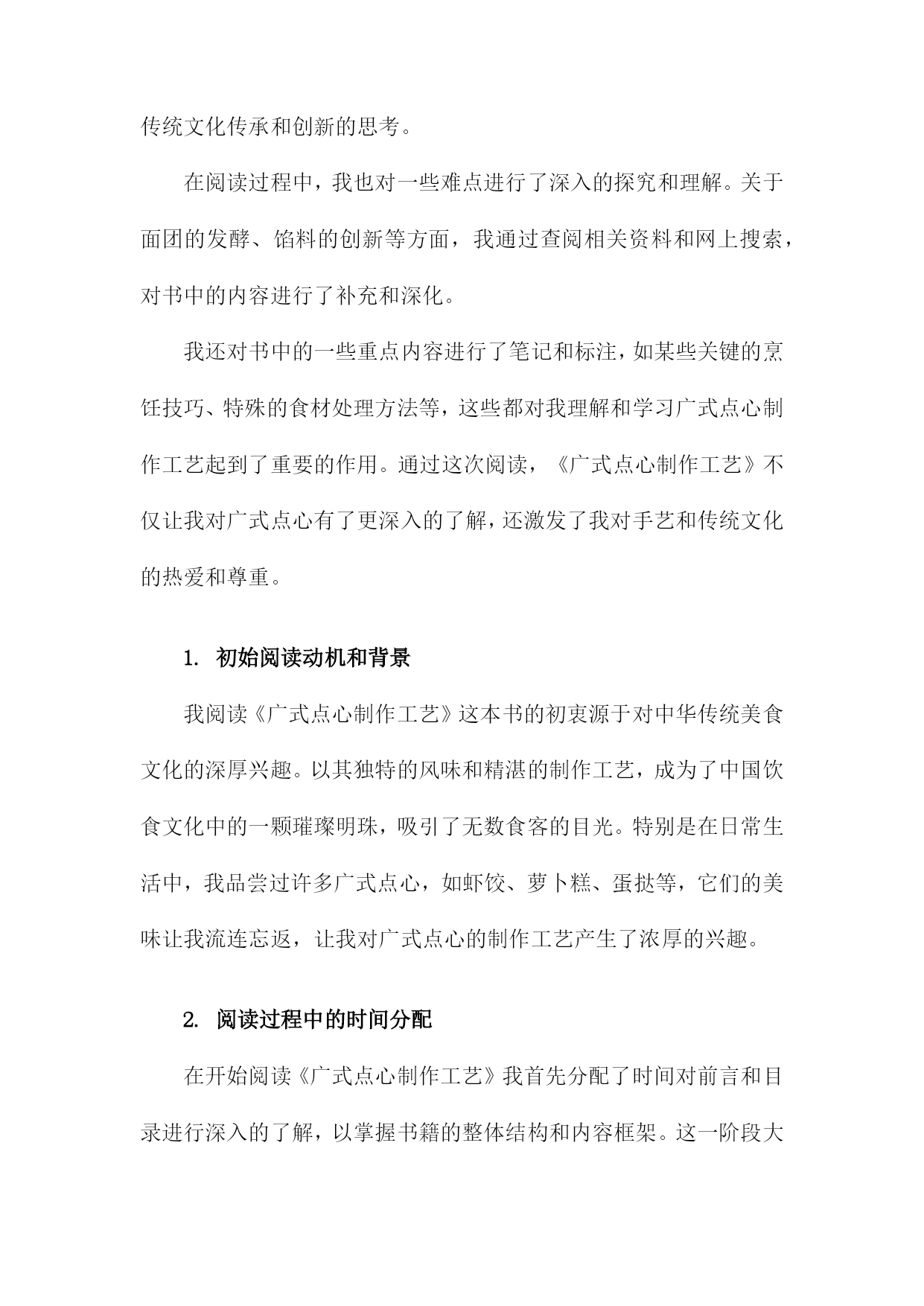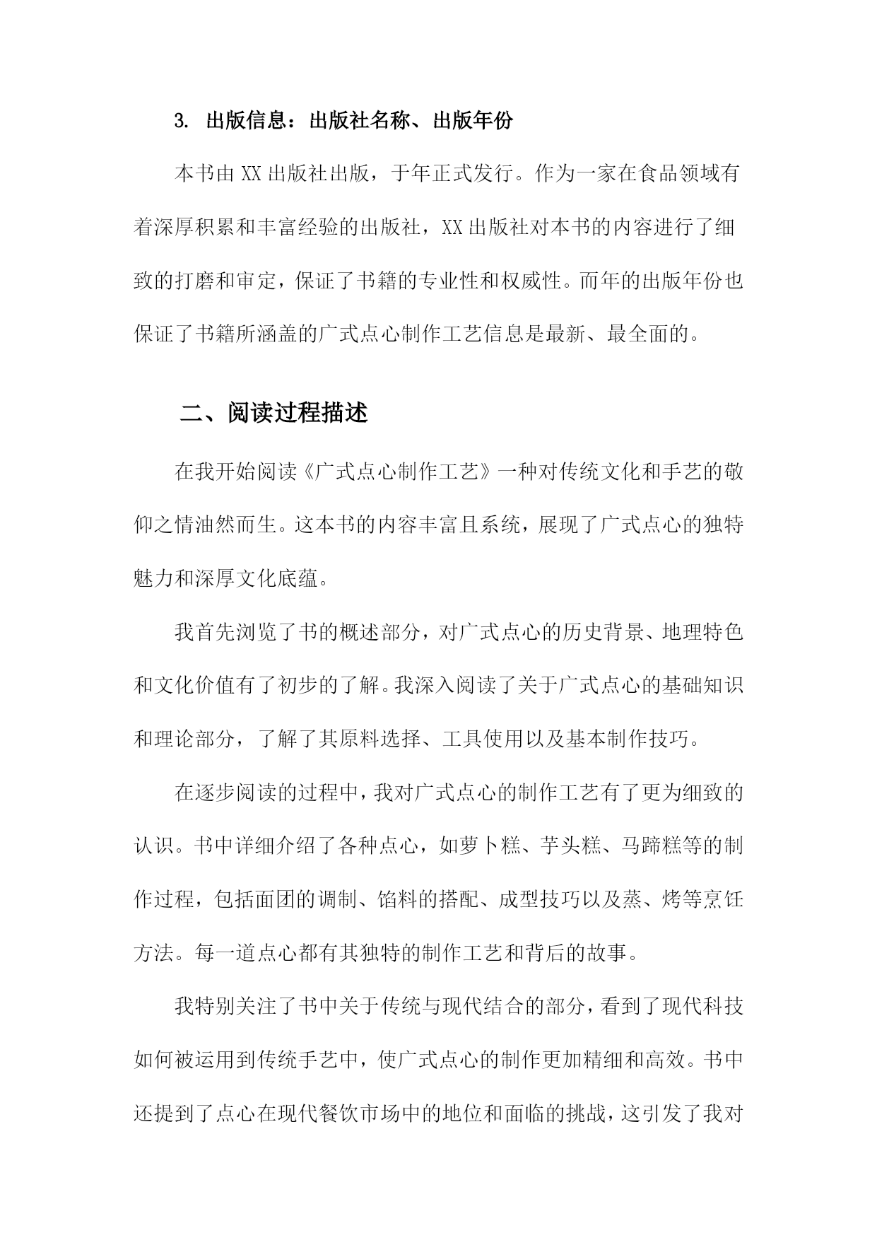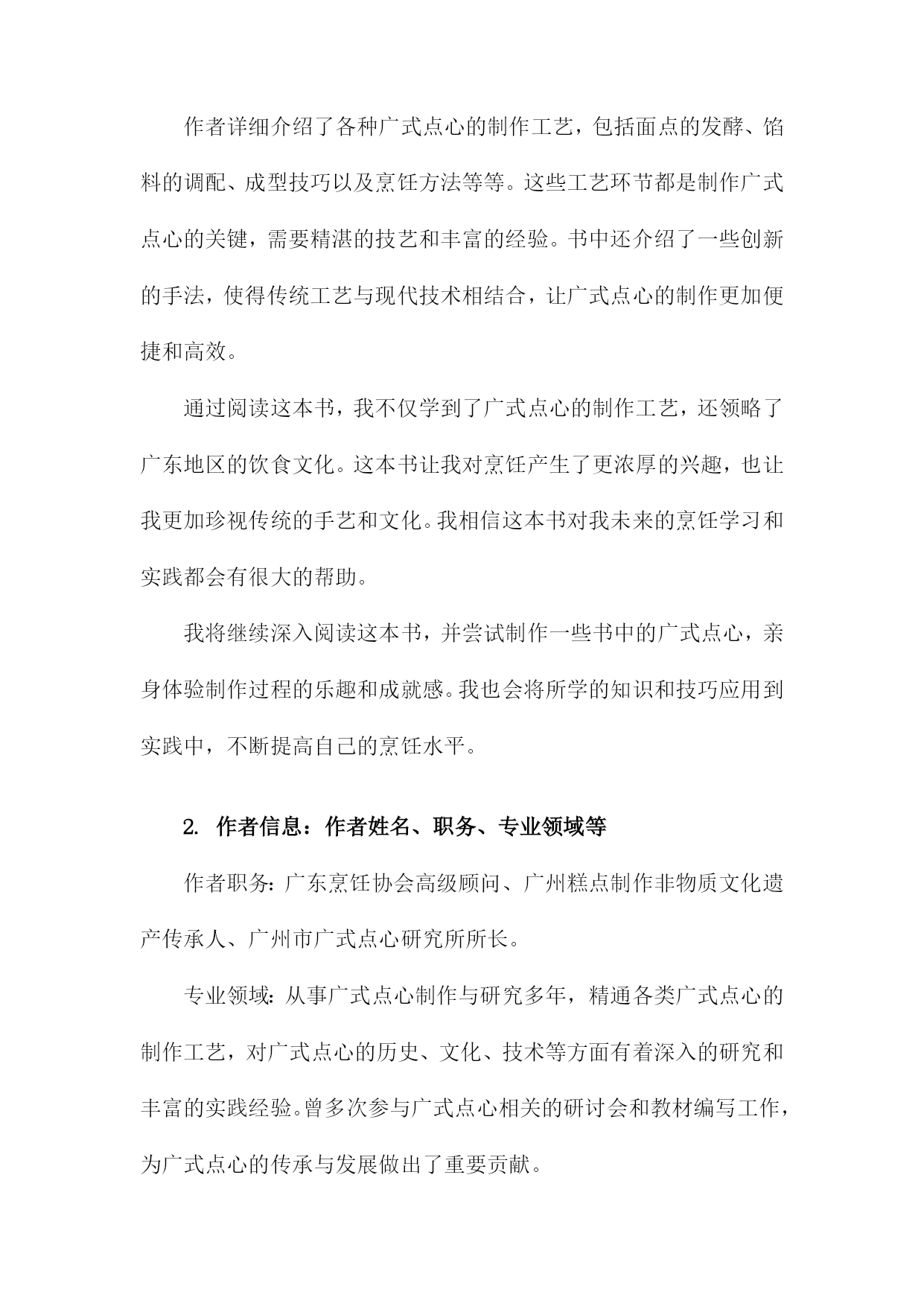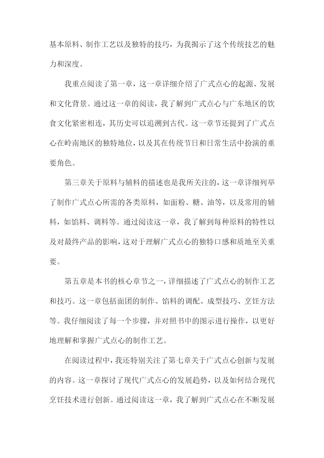 《广式点心制作工艺》读书记录一、书籍基本信息我所阅读的书籍是《广式点心制作工艺》。本书是由著名的烹饪专家团队编写,涵盖了广式点心的制作工艺、历史背景、原材料选用等多方面的详尽内容。此书为中文版本,是我深入学习广式点心制作不可或缺的资源。该书的出版日期为年XX月,出版社是国内知名的烹饪出版社。书籍的封面设计精美,以暖色调为主,体现了广式点心的独特风味和温馨氛围。全书结构清晰,深入浅出地介绍了广式点心的制作工艺,适合烹饪爱好者、专业厨师以及研究人员阅读参考。书籍还附有丰富的实例图片,使读者可以更直观地了解广式点心的制作过程。1.书籍名称:《广式点心制作工艺》当前我正在阅读的书籍是《广式点心制作工艺》。这本书详细阐述了广式点心的制作工艺和技巧,让我对这门独特的技艺有了更深入的了解。本书介绍了广式点心的历史背景、种类特点以及制作流程。我了解到广式点心以其精致的外形、丰富的口感以及独特的调味赢得了广大食客的喜爱。制作过程蕴含着丰富的技艺和深厚的文化底蕴。作者详细介绍了各种广式点心的制作工艺,包括面点的发酵、馅料的调配、成型技巧以及烹饪方法等等。这些工艺环节都是制作广式点心的关键,需要精湛的技艺和丰富的经验。书中还介绍了一些创新的手法,使得传统工艺与现代技术相结合,让广式点心的制作更加便捷和高效。通过阅读这本书,我不仅学到了广式点心的制作工艺,还领略了广东地区的饮食文化。这本书让我对烹饪产生了更浓厚的兴趣,也让我更加珍视传统的手艺和文化。我相信这本书对我未来的烹饪学习和实践都会有很大的帮助。我将继续深入阅读这本书,并尝试制作一些书中的广式点心,亲身体验制作过程的乐趣和成就感。我也会将所学的知识和技巧应用到实践中,不断提高自己的烹饪水平。2.作者信息:作者姓名、职务、专业领域等作者职务:广东烹饪协会高级顾问、广州糕点制作非物质文化遗产传承人、广州市广式点心研究所所长。专业领域:从事广式点心制作与研究多年,精通各类广式点心的制作工艺,对广式点心的历史、文化、技术等方面有着深入的研究和丰富的实践经验。曾多次参与广式点心相关的研讨会和教材编写工作,为广式点心的传承与发展做出了重要贡献。3.出版信息:出版社名称、出版年份本书由XX出版社出版,于年正式发行。作为一家在食品领域有着深厚积累和丰富经验的出版社,XX出版社对本书的内容进行了细致的打磨和审定,保证了书籍的专业性和权威性。而年的出版年份也保证了书籍所涵盖的广式点心制作工艺信息是最新、最全面的。二、阅读过程描述在我开始阅读《广式点心制作工艺》一种对传统文化和手艺的敬仰之情油然而生。这本书的内容丰富且系统,展现了广式点心的独特魅力和深厚文化底蕴。我首先浏览了书的概述部分,对广式点心的历史背景、地理特色和文化价值有了初步的了解。我深入阅读了关于广式点心的基础知识和理论部分,了解了其原料选择、工具使用以及基本制作技巧。在逐步阅读的过程中,我对广式点心的制作工艺有了更为细致的认识。书中详细介绍了各种点心,如萝卜糕、芋头糕、马蹄糕等的制作过程,包括面团的调制、馅料的搭配、成型技巧以及蒸、烤等烹饪方法。每一道点心都有其独特的制作工艺和背后的故事。我特别关注了书中关于传统与现代结合的部分,看到了现代科技如何被运用到传统手艺中,使广式点心的制作更加精细和高效。书中还提到了点心在现代餐饮市场中的地位和面临的挑战,这引发了我对传统文化传承和创新的思考。在阅读过程中,我也对一些难点进行了深入的探究和理解。关于面团的发酵、馅料的创新等方面,我通过查阅相关资料和网上搜索,对书中的内容进行了补充和深化。我还对书中的一些重点内容进行了笔记和标注,如某些关键的烹饪技巧、特殊的食材处理方法等,这些都对我理解和学习广式点心制作工艺起到了重要的作用。通过这次阅读,《广式点心制作工艺》不仅让我对广式点心有了更深入的了解,还激发了我对手艺和传统文化的热爱和尊重。1.初始阅读动机和背景我阅读《广式点心制作工艺》这本书的初衷源于对中华传统美食文化的深厚兴趣。以其独特的风味和精湛的制作工艺,成为了中国饮食文化中的一颗璀璨明珠,吸引了无数食客的目光。特别是在日常生活中,我品尝过许多广式点心,如虾饺、萝卜糕、蛋挞等,它们的美味让我流连忘返,让我对广式点心的制作工艺产生了浓厚的兴趣。2.阅读过程中的时间分配在开始阅读《广式点心制作工艺》我首先分配了时间对前言和目录进行深入的了解,以掌握书籍的整体结构和内容框架。这一阶段大约花费了我一周的时间,使我能够对广式点心的制作工艺有一个初步的认识,并了解到这本书籍涵盖了哪些方面的知识点。我重点阅读了关于广式点心历史和背景的部分,这部分内容大约占据了我一个月的时间。我深入了解了广式点心的起源、发展以及其在点心文化中的地位和影响。这部分内容让我对广式点心有了更深的
