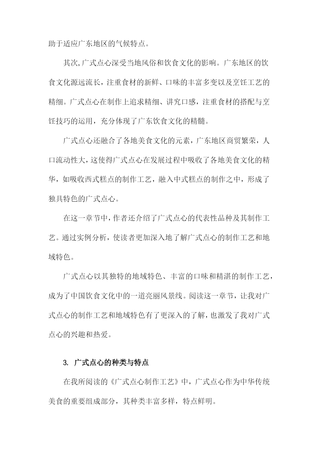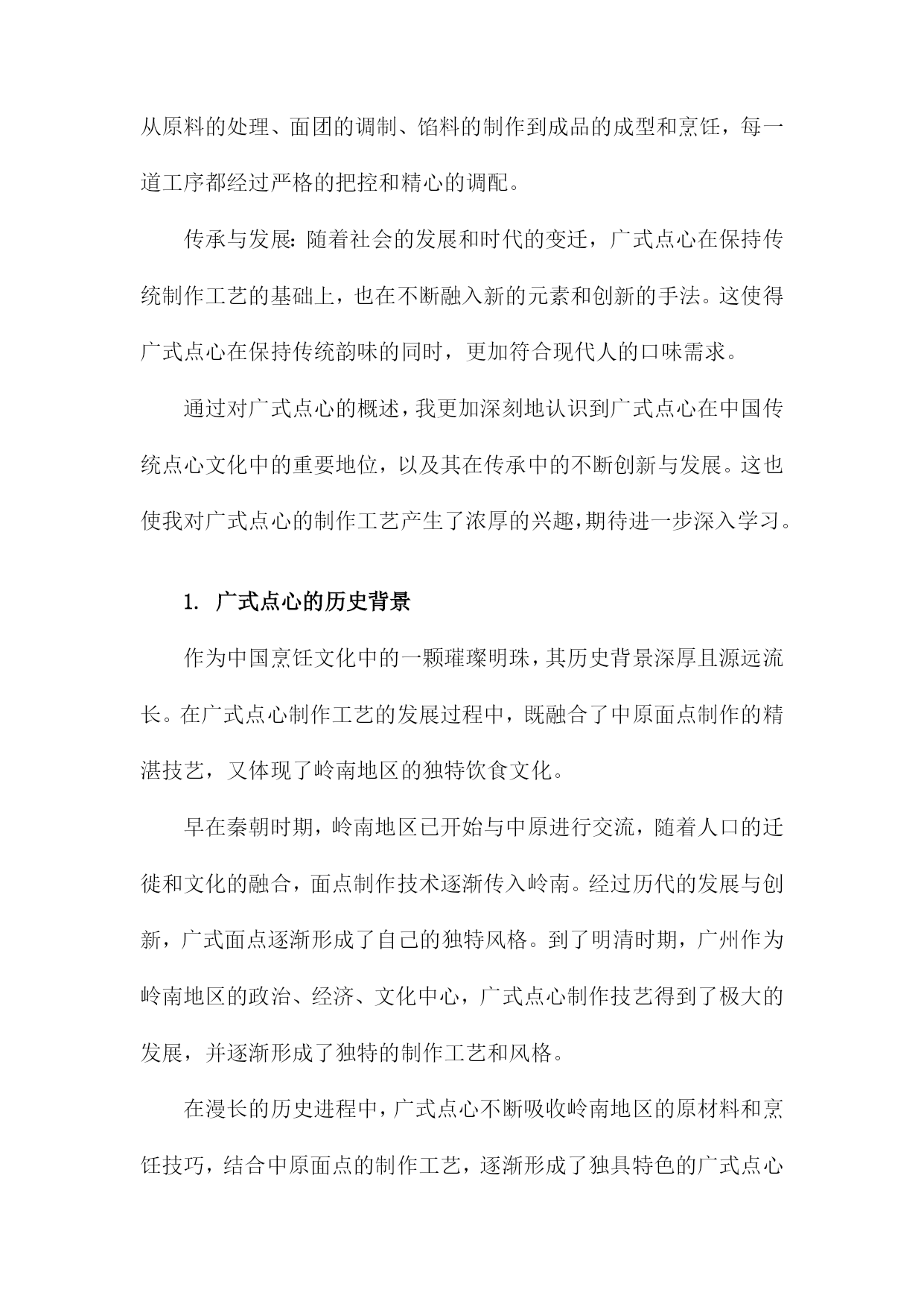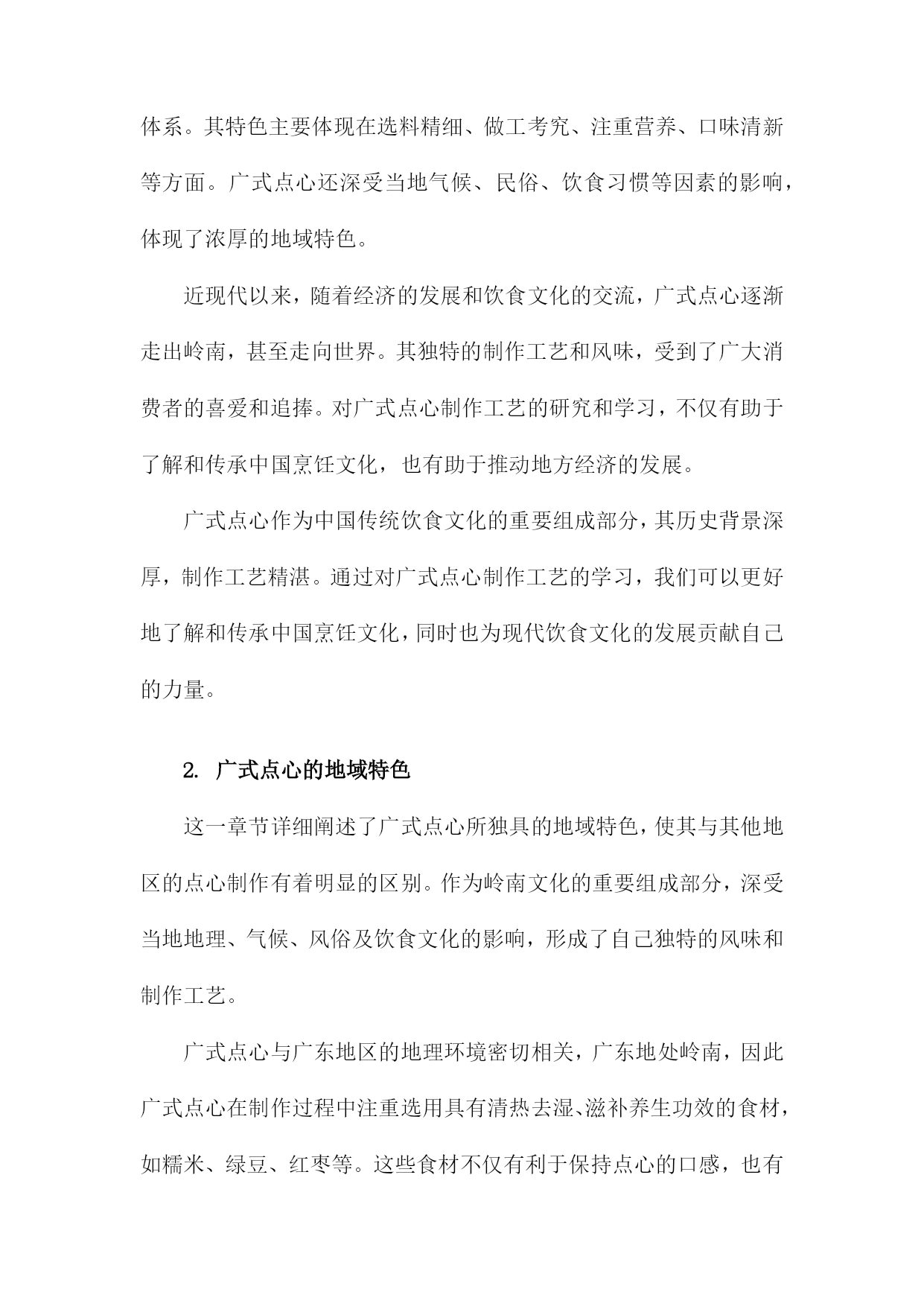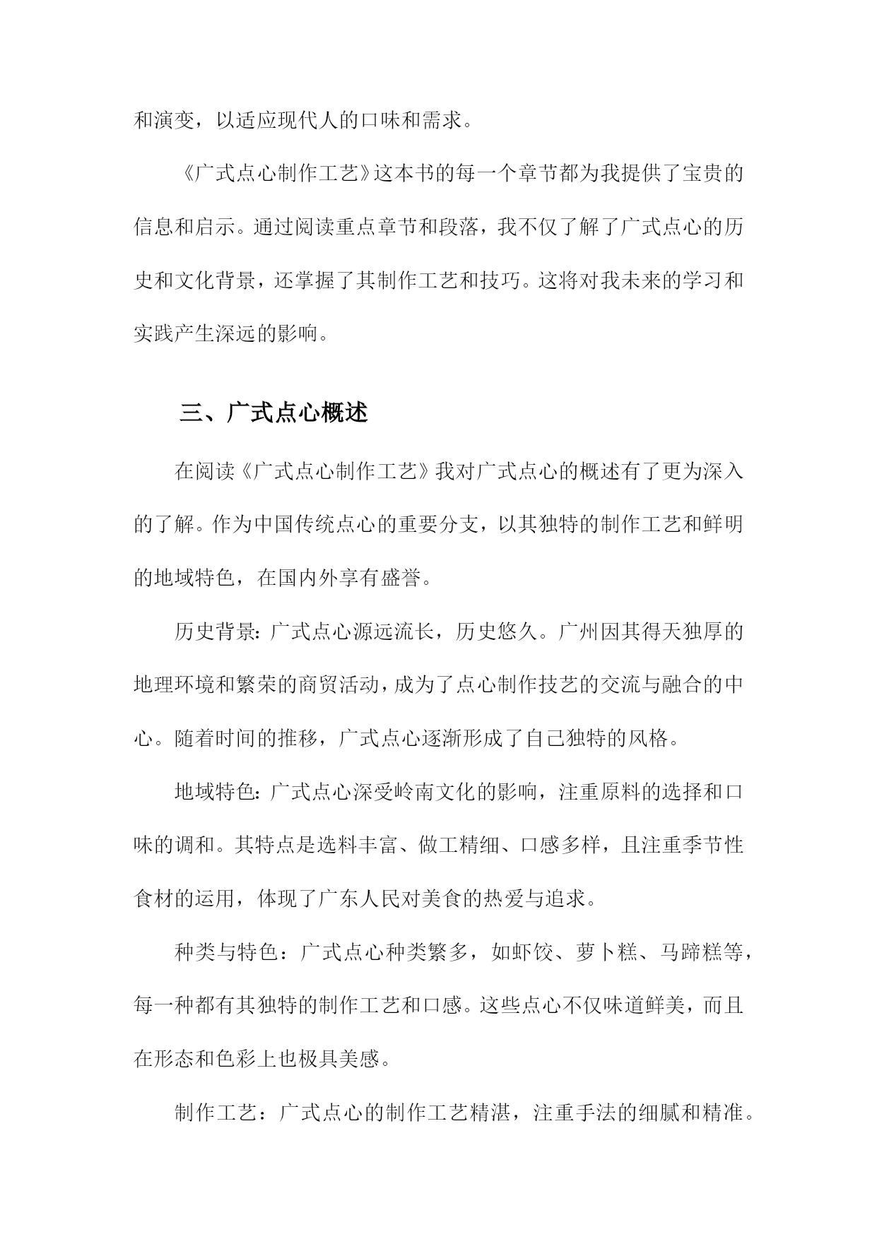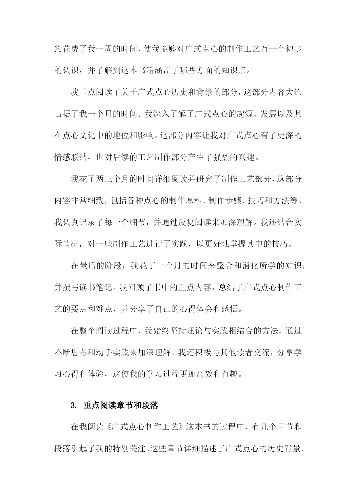 《广式点心制作工艺》读书记录一、书籍基本信息我所阅读的书籍是《广式点心制作工艺》。本书是由著名的烹饪专家团队编写,涵盖了广式点心的制作工艺、历史背景、原材料选用等多方面的详尽内容。此书为中文版本,是我深入学习广式点心制作不可或缺的资源。该书的出版日期为年XX月,出版社是国内知名的烹饪出版社。书籍的封面设计精美,以暖色调为主,体现了广式点心的独特风味和温馨氛围。全书结构清晰,深入浅出地介绍了广式点心的制作工艺,适合烹饪爱好者、专业厨师以及研究人员阅读参考。书籍还附有丰富的实例图片,使读者可以更直观地了解广式点心的制作过程。1.书籍名称:《广式点心制作工艺》当前我正在阅读的书籍是《广式点心制作工艺》。这本书详细阐述了广式点心的制作工艺和技巧,让我对这门独特的技艺有了更深入的了解。本书介绍了广式点心的历史背景、种类特点以及制作流程。我了解到广式点心以其精致的外形、丰富的口感以及独特的调味赢得了广大食客的喜爱。制作过程蕴含着丰富的技艺和深厚的文化底蕴。作者详细介绍了各种广式点心的制作工艺,包括面点的发酵、馅料的调配、成型技巧以及烹饪方法等等。这些工艺环节都是制作广式点心的关键,需要精湛的技艺和丰富的经验。书中还介绍了一些创新的手法,使得传统工艺与现代技术相结合,让广式点心的制作更加便捷和高效。通过阅读这本书,我不仅学到了广式点心的制作工艺,还领略了广东地区的饮食文化。这本书让我对烹饪产生了更浓厚的兴趣,也让我更加珍视传统的手艺和文化。我相信这本书对我未来的烹饪学习和实践都会有很大的帮助。我将继续深入阅读这本书,并尝试制作一些书中的广式点心,亲身体验制作过程的乐趣和成就感。我也会将所学的知识和技巧应用到实践中,不断提高自己的烹饪水平。2.作者信息:作者姓名、职务、专业领域等作者职务:广东烹饪协会高级顾问、广州糕点制作非物质文化遗产传承人、广州市广式点心研究所所长。专业领域:从事广式点心制作与研究多年,精通各类广式点心的制作工艺,对广式点心的历史、文化、技术等方面有着深入的研究和丰富的实践经验。曾多次参与广式点心相关的研讨会和教材编写工作,为广式点心的传承与发展做出了重要贡献。3.出版信息:出版社名称、出版年份本书由XX出版社出版,于年正式发行。作为一家在食品领域有着深厚积累和丰富经验的出版社,XX出版社对本书的内容进行了细致的打磨和审定,保证了书籍的专业性和权威性。而年的出版年份也保证了书籍所涵盖的广式点心制作工艺信息是最新、最全面的。二、阅读过程描述在我开始阅读《广式点心制作工艺》一种对传统文化和手艺的敬仰之情油然而生。这本书的内容丰富且系统,展现了广式点心的独特魅力和深厚文化底蕴。我首先浏览了书的概述部分,对广式点心的历史背景、地理特色和文化价值有了初步的了解。我深入阅读了关于广式点心的基础知识和理论部分,了解了其原料选择、工具使用以及基本制作技巧。在逐步阅读的过程中,我对广式点心的制作工艺有了更为细致的认识。书中详细介绍了各种点心,如萝卜糕、芋头糕、马蹄糕等的制作过程,包括面团的调制、馅料的搭配、成型技巧以及蒸、烤等烹饪方法。每一道点心都有其独特的制作工艺和背后的故事。我特别关注了书中关于传统与现代结合的部分,看到了现代科技如何被运用到传统手艺中,使广式点心的制作更加精细和高效。书中还提到了点心在现代餐饮市场中的地位和面临的挑战,这引发了我对传统文化传承和创新的思考。在阅读过程中,我也对一些难点进行了深入的探究和理解。关于面团的发酵、馅料的创新等方面,我通过查阅相关资料和网上搜索,对书中的内容进行了补充和深化。我还对书中的一些重点内容进行了笔记和标注,如某些关键的烹饪技巧、特殊的食材处理方法等,这些都对我理解和学习广式点心制作工艺起到了重要的作用。通过这次阅读,《广式点心制作工艺》不仅让我对广式点心有了更深入的了解,还激发了我对手艺和传统文化的热爱和尊重。1.初始阅读动机和背景我阅读《广式点心制作工艺》这本书的初衷源于对中华传统美食文化的深厚兴趣。以其独特的风味和精湛的制作工艺,成为了中国饮食文化中的一颗璀璨明珠,吸引了无数食客的目光。特别是在日常生活中,我品尝过许多广式点心,如虾饺、萝卜糕、蛋挞等,它们的美味让我流连忘返,让我对广式点心的制作工艺产生了浓厚的兴趣。2.阅读过程中的时间分配在开始阅读《广式点心制作工艺》我首先分配了时间对前言和目录进行深入的了解,以掌握书籍的整体结构和内容框架。这一阶段大约花费了我一周的时间,使我能够对广式点心的制作工艺有一个初步的认识,并了解到这本书籍涵盖了哪些方面的知识点。我重点阅读了关于广式点心历史和背景的部分,这部分内容大约占据了我一个月的时间。我深入了解了广式点心的起源、发展以及其在点心文化中的地位和影响。这部分内容让我对广式点心有了更深的