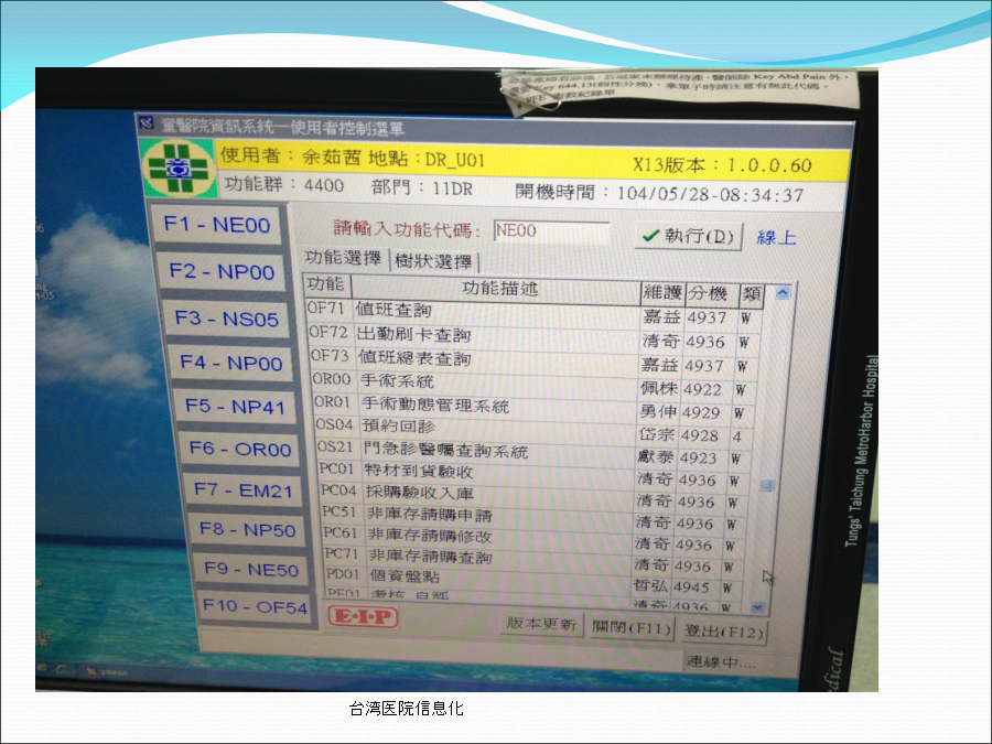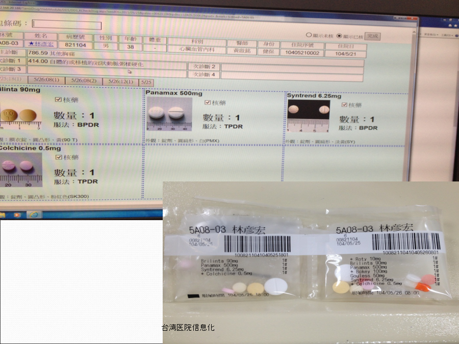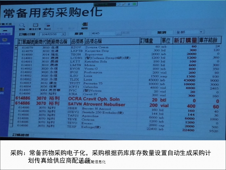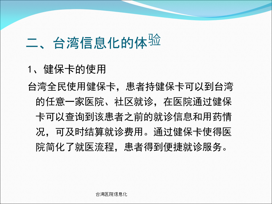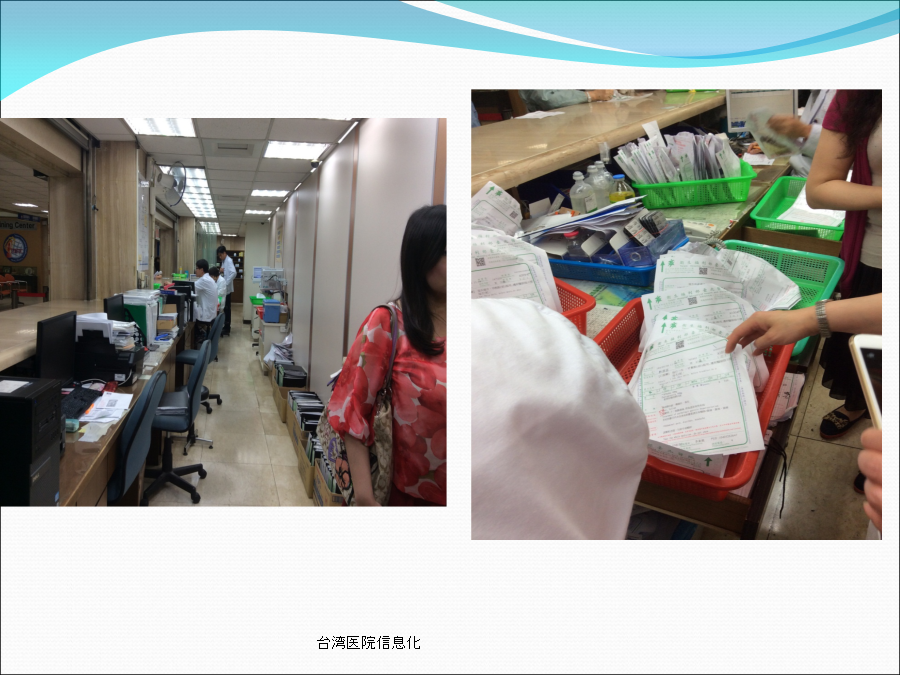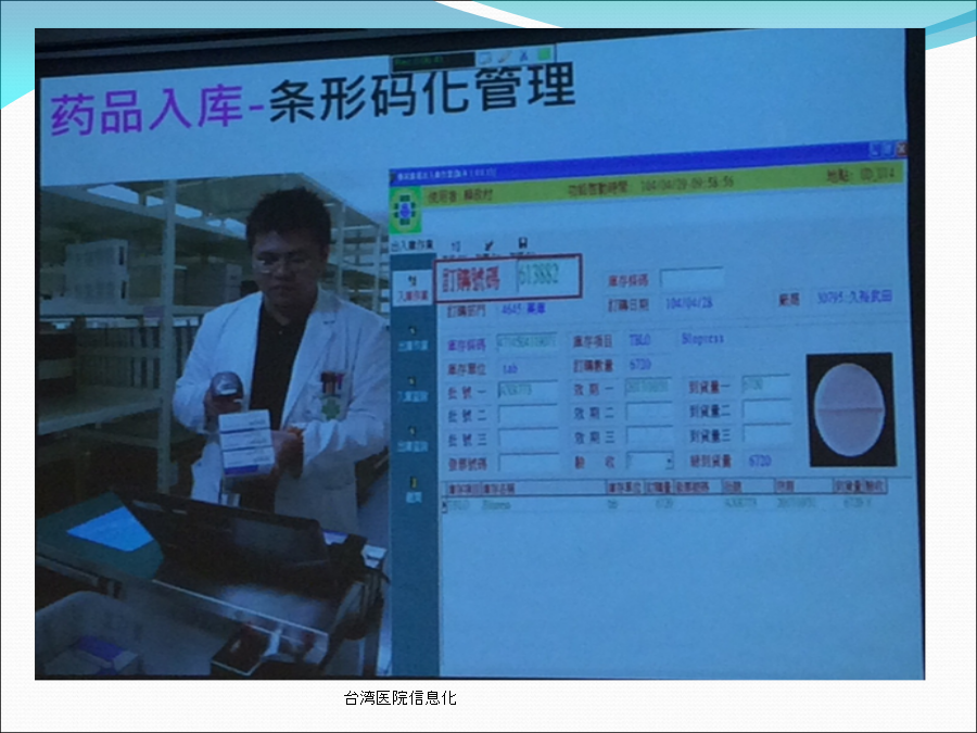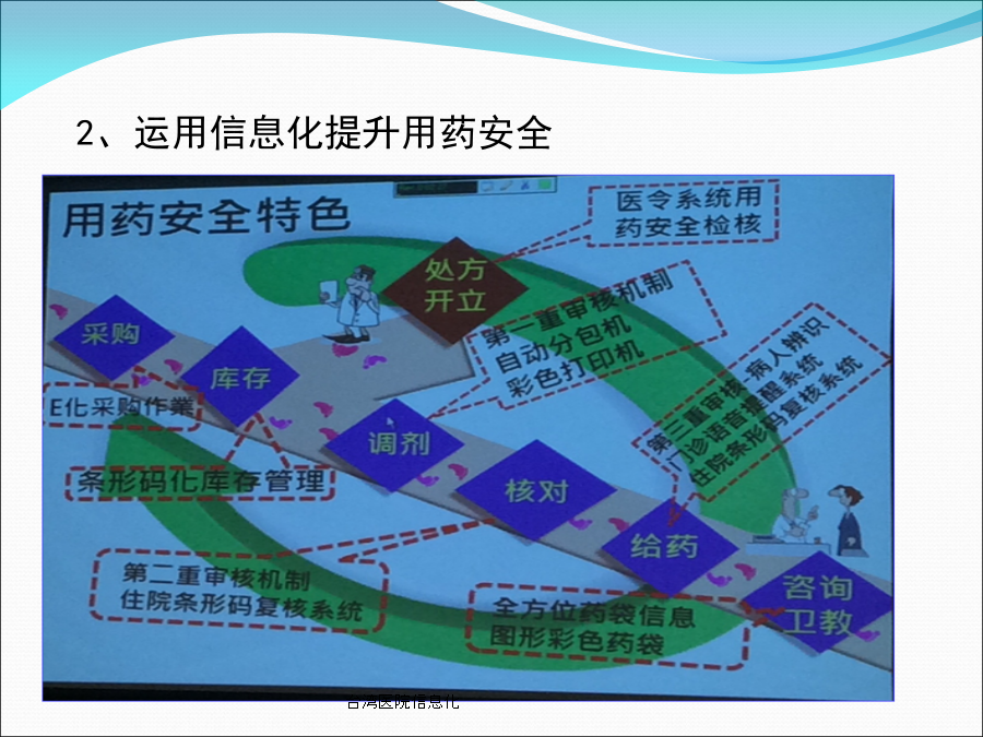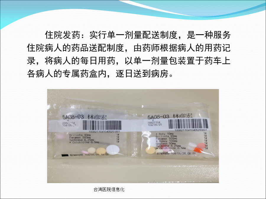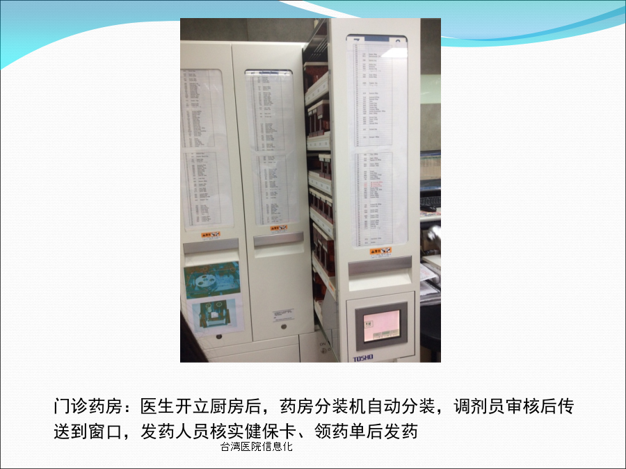 台湾医院信息化二、台湾信息化的体验2、运用信息化提升用药安全采购:常备药物采购电子化,采购根据药库库存数量设置自动生成采购计划传真给供应商配送货。门诊药房:医生开立厨房后,药房分装机自动分装,调剂员审核后传送到窗口,发药人员核实健保卡、领药单后发药台湾医院信息化台湾医院信息化住院发药:实行单一剂量配送制度,是一种服务住院病人的药品送配制度,由药师根据病人的用药记录,将病人的每日用药,以单一剂量包装置于药车上各病人的专属药盒内,逐日送到病房。优点:1、减少用药错误率。2、减少医疗资源的浪费。3、促进、药师、护理、医师之间的沟通。加强的病人的服务质量。4、减少护士站的常备药。5、强化药品管理。台湾医院信息化作业流程:医师下达医嘱后,药房的自动包装机按照单一剂量进行包装,调剂师按照用药记录单核对药品,放在病人专属药盒,确认后上锁,由传送人员送到护士站。护理人员交换药车与电脑再次进行核对确认。3、运用信息化改善就医流程台湾医院信息化4、运用信息化建设实现JCI优质医疗管理台湾医院信息化台湾医院信息化台湾医院信息化台湾医院信息化台湾医院信息化台湾医院信息化台湾医院信息化台湾医院信息化台湾医院信息化台湾医院信息化