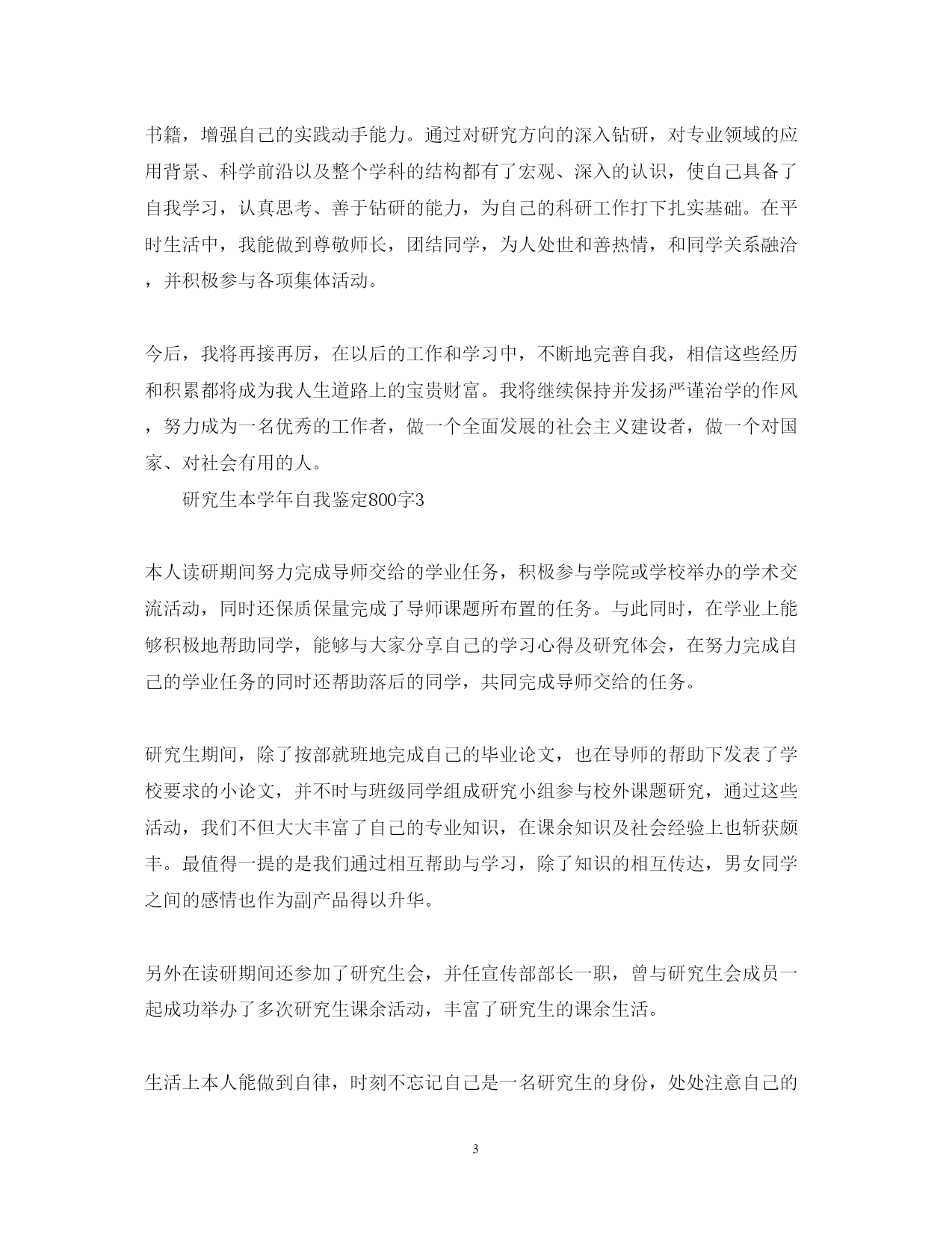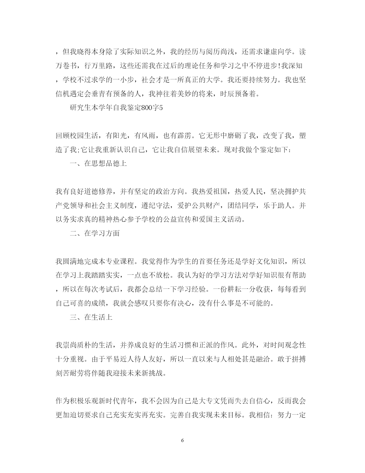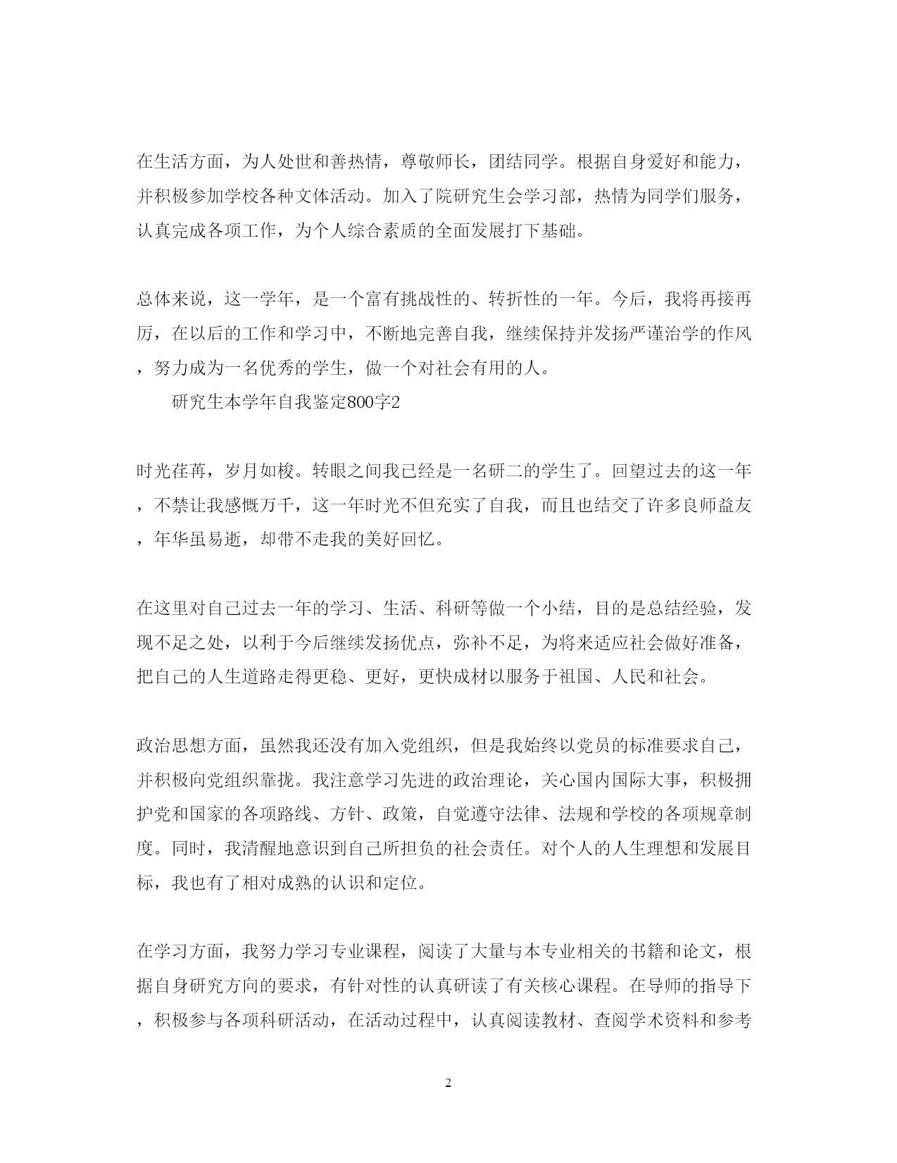 此资料由网络收集而来,如有侵权请告知上传者立即删除。资料共分享,我们负责传递知识。PAGEPAGE7研究生本学年自我鉴定800字思想上要求上进,认真学习,努力钻研专业知识,毕业之际,回顾两年来的学习、工作以及生活做个自我鉴定。接下来,小编在这给大家带来研究生本学年自我鉴定800字,欢迎大家借鉴参考!研究生本学年自我鉴定800字1在过去的这一年里,我认真学习专业理论知识,积极参加各项活动,严格要求自己,在思想、学习、科研等方面都得到了充分的培养和锻炼。思想方面,努力学习政治理论知识,不断提高自己的思想政治觉悟,具有良好的道德品质和思想修养。认真学习xx重要思想。积极拥护党和国家的各项路线、方针、政策,自觉遵守法律、法规和学校的各项规章制度。在学习方面,认真学习并完成各项专业课程。学习目的明确,态度端正、学风良好,勤奋学习,刻苦钻研。根据自身研究方向的要求,有针对性的认真研读了有关核心课程,认真阅读教材、查阅学术资料和参考书籍,在课堂上吸收各个知识点。积极参加学校组织的学术讲座。课外之余,参与了导师相关课题的研究,使自己的理论知识与实践水平得到了进一步的增强和提高。在英语学习方面,我顺利通过了大学英语六级考试,具备了较强的英语听、说、读、写能力。在科研工作上,根据导师的指导,阅读了大量与本专业相关的书籍和论文,逐步明确了研究方向。认真开展实验研究,不断提高自己的实验技能,以及解决问题,分析问题的能力。通过自身不断的努力,以及与师长同学间的探讨交流,取得了一些比较满意的成果。在这期间,查阅资料,综合分析等基本素质不断提高,书面表达的能力也得到了提高,为自己的科研工作打下扎实基础。在生活方面,为人处世和善热情,尊敬师长,团结同学。根据自身爱好和能力,并积极参加学校各种文体活动。加入了院研究生会学习部,热情为同学们服务,认真完成各项工作,为个人综合素质的全面发展打下基础。总体来说,这一学年,是一个富有挑战性的、转折性的一年。今后,我将再接再厉,在以后的工作和学习中,不断地完善自我,继续保持并发扬严谨治学的作风,努力成为一名优秀的学生,做一个对社会有用的人。研究生本学年自我鉴定800字2时光荏苒,岁月如梭。转眼之间我已经是一名研二的学生了。回望过去的这一年,不禁让我感慨万千,这一年时光不但充实了自我,而且也结交了许多良师益友,年华虽易逝,却带不走我的美好回忆。在这里对自己过去一年的学习、生活、科研等做一个小结,目的是总结经验,发现不足之处,以利于今后继续发扬优点,弥补不足,为将来适应社会做好准备,把自己的人生道路走得更稳、更好,更快成材以服务于祖国、人民和社会。政治思想方面,虽然我还没有加入党组织,但是我始终以党员的标准要求自己,并积极向党组织靠拢。我注意学习先进的政治理论,关心国内国际大事,积极拥护党和国家的各项路线、方针、政策,自觉遵守法律、法规和学校的各项规章制度。同时,我清醒地意识到自己所担负的社会责任。对个人的人生理想和发展目标,我也有了相对成熟的认识和定位。在学习方面,我努力学习专业课程,阅读了大量与本专业相关的书籍和论文,根据自身研究方向的要求,有针对性的认真研读了有关核心课程。在导师的指导下,积极参与各项科研活动,在活动过程中,认真阅读教材、查阅学术资料和参考书籍,增强自己的实践动手能力。通过对研究方向的深入钻研,对专业领域的应用背景、科学前沿以及整个学科的结构都有了宏观、深入的认识,使自己具备了自我学习,认真思考、善于钻研的能力,为自己的科研工作打下扎实基础。在平时生活中,我能做到尊敬师长,团结同学,为人处世和善热情,和同学关系融洽,并积极参与各项集体活动。今后,我将再接再厉,在以后的工作和学习中,不断地完善自我,相信这些经历和积累都将成为我人生道路上的宝贵财富。我将继续保持并发扬严谨治学的作风,努力成为一名优秀的工作者,做一个全面发展的社会主义建设者,做一个对国家、对社会有用的人。研究生本学年自我鉴定800字3本人读研期间努力完成导师交给的学业任务,积极参与学院或学校举办的学术交流活动,同时还保质保量完成了导师课题所布置的任务。与此同时,在学业上能够积极地帮助同学,能够与大家分享自己的学习心得及研究体会,在努力完成自己的学业任务的同时还帮助落后的同学,共同完成导师交给的任务。研究生期间,除了按部就班地完成自己的毕业论文,也在导师的帮助下发表了学校要求的小论文,并不时与班级同学组成研究小组参与校外课题研究,通过这些活动,我们不但大大丰富了自己的专业知识,在课余知识及社会经验上也斩获颇丰。最值得一提的是我们通过相互帮助与学习,除了知识的相互传达,男女同学之间的感情也作为副产品得以升华。另外在读研期间还参加了研究生会,并任宣传部部长一职,曾与研究生会成员一起成功举办了