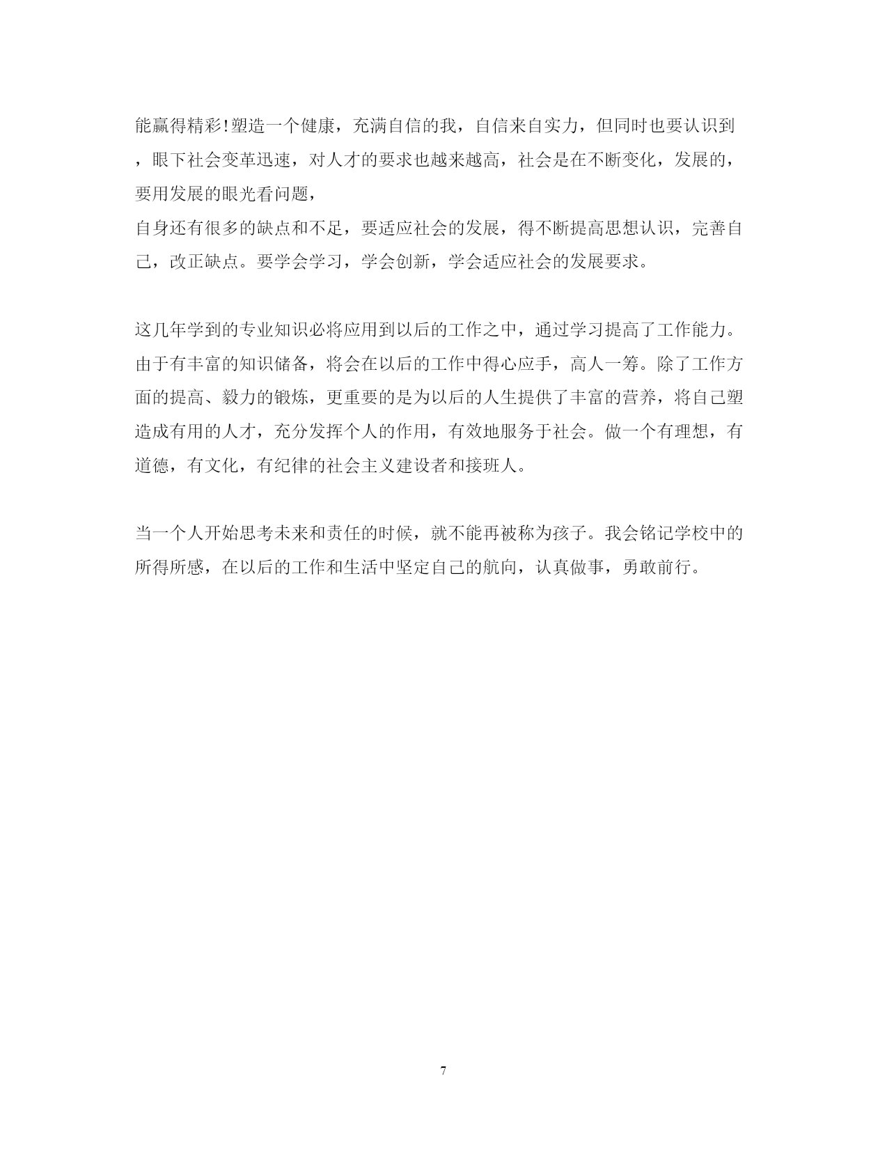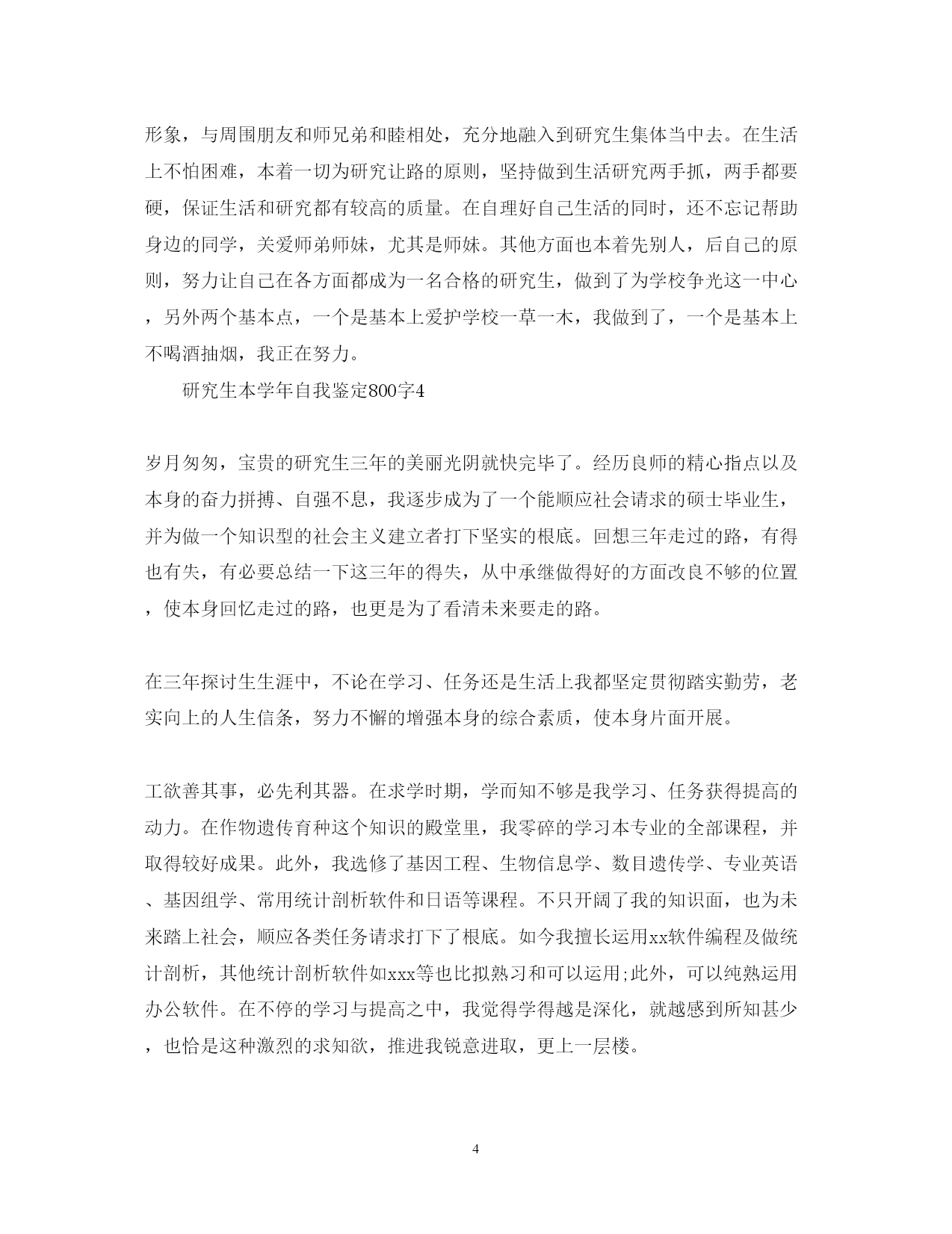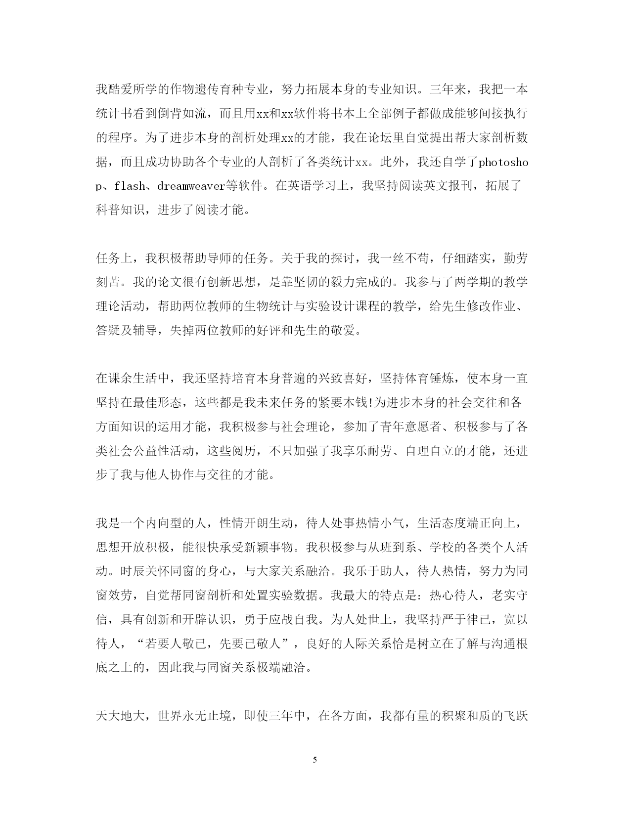 此资料由网络收集而来,如有侵权请告知上传者立即删除。资料共分享,我们负责传递知识。PAGEPAGE7研究生本学年自我鉴定800字思想上要求上进,认真学习,努力钻研专业知识,毕业之际,回顾两年来的学习、工作以及生活做个自我鉴定。接下来,小编在这给大家带来研究生本学年自我鉴定800字,欢迎大家借鉴参考!研究生本学年自我鉴定800字1在过去的这一年里,我认真学习专业理论知识,积极参加各项活动,严格要求自己,在思想、学习、科研等方面都得到了充分的培养和锻炼。思想方面,努力学习政治理论知识,不断提高自己的思想政治觉悟,具有良好的道德品质和思想修养。认真学习xx重要思想。积极拥护党和国家的各项路线、方针、政策,自觉遵守法律、法规和学校的各项规章制度。在学习方面,认真学习并完成各项专业课程。学习目的明确,态度端正、学风良好,勤奋学习,刻苦钻研。根据自身研究方向的要求,有针对性的认真研读了有关核心课程,认真阅读教材、查阅学术资料和参考书籍,在课堂上吸收各个知识点。积极参加学校组织的学术讲座。课外之余,参与了导师相关课题的研究,使自己的理论知识与实践水平得到了进一步的增强和提高。在英语学习方面,我顺利通过了大学英语六级考试,具备了较强的英语听、说、读、写能力。在科研工作上,根据导师的指导,阅读了大量与本专业相关的书籍和论文,逐步明确了研究方向。认真开展实验研究,不断提高自己的实验技能,以及解决问题,分析问题的能力。通过自身不断的努力,以及与师长同学间的探讨交流,取得了一些比较满意的成果。在这期间,查阅资料,综合分析等基本素质不断提高,书面表达的能力也得到了提高,为自己的科研工作打下扎实基础。在生活方面,为人处世和善热情,尊敬师长,团结同学。根据自身爱好和能力,并积极参加学校各种文体活动。加入了院研究生会学习部,热情为同学们服务,认真完成各项工作,为个人综合素质的全面发展打下基础。总体来说,这一学年,是一个富有挑战性的、转折性的一年。今后,我将再接再厉,在以后的工作和学习中,不断地完善自我,继续保持并发扬严谨治学的作风,努力成为一名优秀的学生,做一个对社会有用的人。研究生本学年自我鉴定800字2时光荏苒,岁月如梭。转眼之间我已经是一名研二的学生了。回望过去的这一年,不禁让我感慨万千,这一年时光不但充实了自我,而且也结交了许多良师益友,年华虽易逝,却带不走我的美好回忆。在这里对自己过去一年的学习、生活、科研等做一个小结,目的是总结经验,发现不足之处,以利于今后继续发扬优点,弥补不足,为将来适应社会做好准备,把自己的人生道路走得更稳、更好,更快成材以服务于祖国、人民和社会。政治思想方面,虽然我还没有加入党组织,但是我始终以党员的标准要求自己,并积极向党组织靠拢。我注意学习先进的政治理论,关心国内国际大事,积极拥护党和国家的各项路线、方针、政策,自觉遵守法律、法规和学校的各项规章制度。同时,我清醒地意识到自己所担负的社会责任。对个人的人生理想和发展目标,我也有了相对成熟的认识和定位。在学习方面,我努力学习专业课程,阅读了大量与本专业相关的书籍和论文,根据自身研究方向的要求,有针对性的认真研读了有关核心课程。在导师的指导下,积极参与各项科研活动,在活动过程中,认真阅读教材、查阅学术资料和参考书籍,增强自己的实践动手能力。通过对研究方向的深入钻研,对专业领域的应用背景、科学前沿以及整个学科的结构都有了宏观、深入的认识,使自己具备了自我学习,认真思考、善于钻研的能力,为自己的科研工作打下扎实基础。在平时生活中,我能做到尊敬师长,团结同学,为人处世和善热情,和同学关系融洽,并积极参与各项集体活动。今后,我将再接再厉,在以后的工作和学习中,不断地完善自我,相信这些经历和积累都将成为我人生道路上的宝贵财富。我将继续保持并发扬严谨治学的作风,努力成为一名优秀的工作者,做一个全面发展的社会主义建设者,做一个对国家、对社会有用的人。研究生本学年自我鉴定800字3本人读研期间努力完成导师交给的学业任务,积极参与学院或学校举办的学术交流活动,同时还保质保量完成了导师课题所布置的任务。与此同时,在学业上能够积极地帮助同学,能够与大家分享自己的学习心得及研究体会,在努力完成自己的学业任务的同时还帮助落后的同学,共同完成导师交给的任务。研究生期间,除了按部就班地完成自己的毕业论文,也在导师的帮助下发表了学校要求的小论文,并不时与班级同学组成研究小组参与校外课题研究,通过这些活动,我们不但大大丰富了自己的专业知识,在课余知识及社会经验上也斩获颇丰。最值得一提的是我们通过相互帮助与学习,除了知识的相互传达,男女同学之间的感情也作为副产品得以升华。另外在读研期间还参加了研究生会,并任宣传部部长一职,曾与研究生会成员一起成功举办了