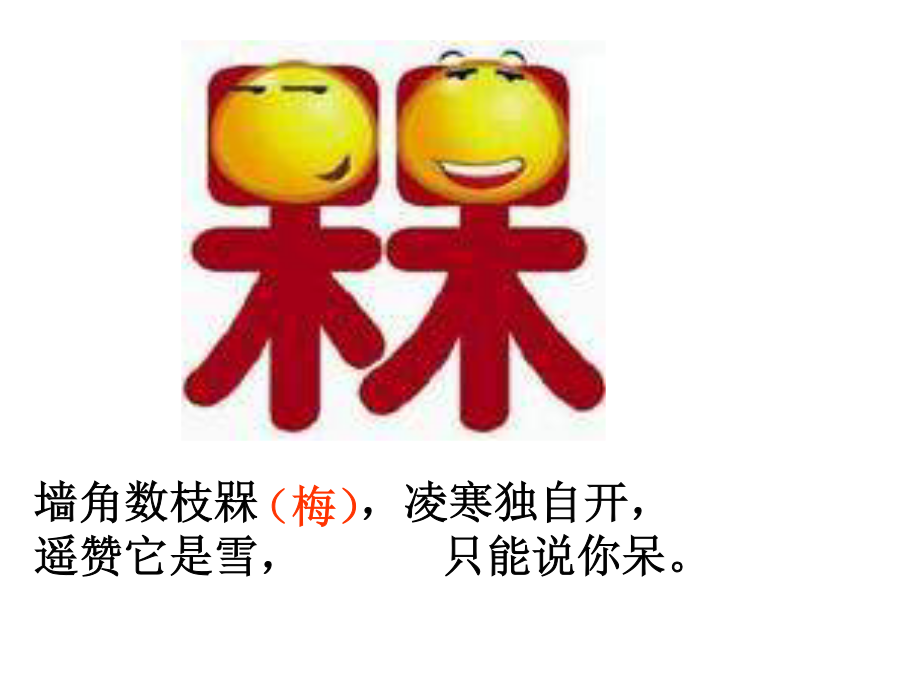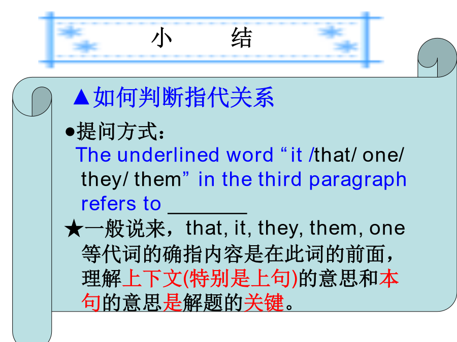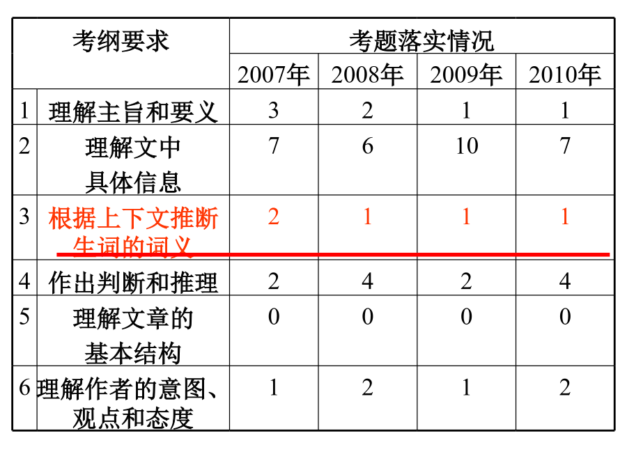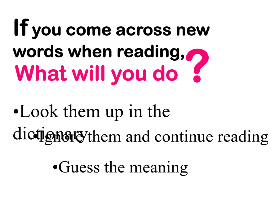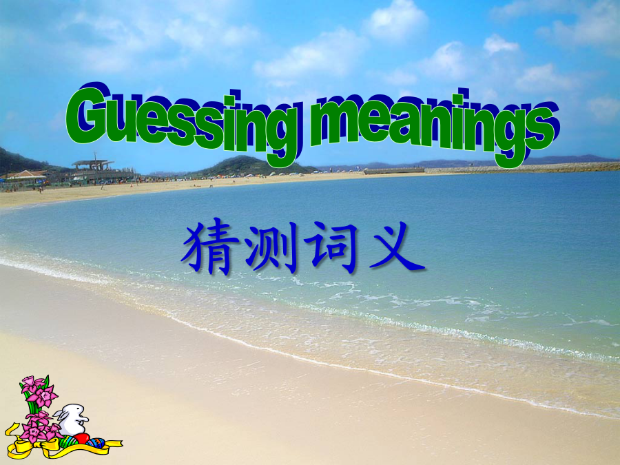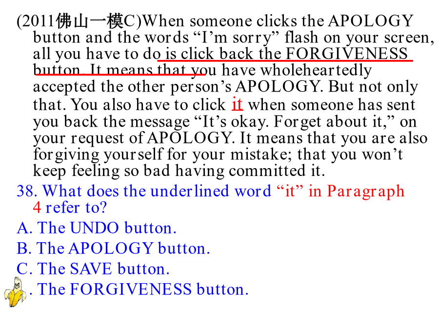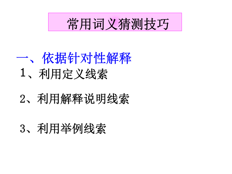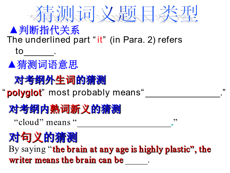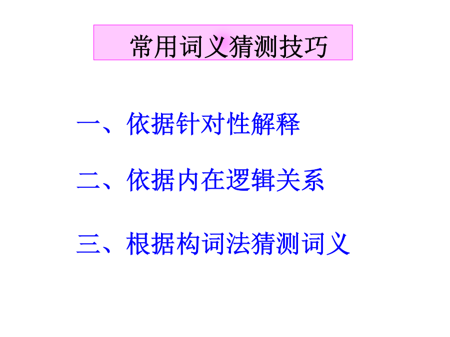 高考阅读技巧—猜测词义考纲要求墙角数枝槑,凌寒独自开,遥赞它是雪,只能说你呆。Ifyoucomeacrossnewwordswhenreading,猜测词义猜测词义题目类型(2011佛山一模C)WhensomeoneclickstheAPOLOGYbuttonandthewords“I’msorry”flashonyourscreen,allyouhavetodoisclickbacktheFORGIVENESSbutton.Itmeansthatyouhavewholeheartedlyacceptedtheotherperson’sAPOLOGY.Butnotonlythat.Youalsohavetoclickitwhensomeonehassentyoubackthemessage“It’sokay.Forgetaboutit,”onyourrequestofAPOLOGY.Itmeansthatyouarealsoforgivingyourselfforyourmistake;thatyouwon’tkeepfeelingsobadhavingcommittedit.38.Whatdoestheunderlinedword“it”inParagraph4referto?A.TheUNDObutton.B.TheAPOLOGYbutton.C.TheSAVEbutton.D.TheFORGIVENESSbutton.常用词义猜测技巧常用词义猜测技巧一、依据针对性解释例1[,ænθrə’pɔlədʒi]Anthropologyisthescientificstudyofman.Anthropologymeans_________.一、依据针对性解释例1Insomecountrieswherethereisverylittlerain,thefarmershavetoirrigate,orwatertheirfields.Toirrigatemeans______.注:or=mean表示一词语对另一词语的解释关系或为其同义词语例3[si’mæntiks]Semantics,thestudyofthemeaningofwords,isnecessaryifyouaretospeakandreadintelligently.Semanticsmeans_______.例1[,piəri’ɔdikəl]Youcantakeanyoftheperiodicals:TheWorldofEnglish,ForeignLanguageTeachinginSchools,orEnglishLearning.Periodicalsmeans____________.常用词义猜测技巧常用词义猜测技巧例1AndrewisoneofthemostsuperciliousmenIknow.Hisbrother,incontrast,isquitehumble(谦虚的)andmodest.superciliousmeans____________________.常用词义猜测技巧例1Tomisconsideredanautocraticadministrator(管理人员)becausehemakesdecisionswithoutseekingtheopinionsofothers.autocraticmeans____________.常用词义猜测技巧例1Doctorsbelievethatsmokingcigarettesisdetrimentaltoyourhealth.Theyalsoregarddrinkingasharmful.detrimentalmeans_________________.常用词义猜测技巧例1MyparentswentoutandgotanewTV.Thatafternoonanantennawasputontheroof.antennameans______________.常用词义猜测技巧常用词义猜测技巧前缀:1.in-,im-,il-,ir-,non-,un-,dis-,mis-常表示否定,如:incorrect,impossible,illegal,irregular,nonstop,unfair,disappear,mislead后缀:1.adj.-ness,如:happiness,illness,selfishness2.V.-ment,如:equipment,entertainment,movement3.V.-tion,如:education,communication,operation4.形容词词性的词缀:-able,-cal,-ish,-fu