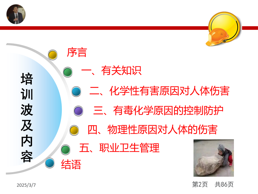 职业卫生基本知识培训内容波及安全诸多的理念来自国外无论是冰山理论还是海因里希法则多米诺骨牌首先要理解原义才能有的放失!什么是安全?什么是职业卫生?安全和职业卫生工作要排除的,不仅包括外在威胁,还包括内在“疾患”。如肌体生病、组织紊乱等。内在“疾患”虽然不是外在威胁,对人来说却是危险的。外在威胁和内在疾患,都可归为危险。两个方面所有排除,就是一种没有危险,没有伤害的状态。我们称它为安全状态。安全之道知易行难学以致用用于实践能力内容波及一、职业病危害来源(一)生产工艺过程产生或存在的有害原因(一)生产工艺过程产生或存在的有害原因(一)生产工艺过程产生或存在的有害原因(二)劳动过程中的有害原因(三)生产环境中的有害原因二、职业病的定义法定职业病目录的历史状况职业病危害原因可分为10类职业病目录10类132种详细分布职业病的特性职业禁忌症职业病危害工作有关疾病常见工作疾病有毒化学物质毒物的毒性与分级毒物的毒性和分级高毒物品目录有关法律法规、规范和技术原则《工作场所防止职业中毒卫生工程防护措施规范》GBZ/T194-;《职业健康监护技术规范》GBZ188-;《工作场所有毒气体检测报警装置设置规范》GBZ/T223-;《职业性接触毒物危害程度分级》GBZ230-《工作场所职业病危害作业分级第2部分:化学物》GBZ/T229.2-;《工作场所有害原因职业接触限值第1部分:化学有害原因》GBZ2.1-;有毒化学物质内容波及生产性毒物与职业中毒急性中毒:毒物一次短时间内大量进入体内导致的中毒(急性苯中毒、氯气中毒);慢性中毒:毒物少许长期进入人体而引起的中毒(慢性铅中毒、锰中毒)亚急性中毒:介于急性和慢性中毒之间的临床类型,如亚急性汞中毒。迟发性中毒:脱离接触毒物一定期间后才展现中毒的临床病变(锰中毒)。毒物吸取:毒物或其代谢产物在体内超过正常范围,但无该毒物所致的临床体现,呈亚临床状态。如铅吸取、汞吸取生产性毒物的存在形态生产性毒物的存在形态(续)生产性毒物侵入人体的途径急性职业中毒的毒物类别内容波及生产性毒物危害的控制原则防毒技术措施工程防护新技术的筛选4647高毒物品的应急救援口罩:可以盖住鼻子和嘴,由可以清除污染的过滤材料制成;半面罩呼吸保护器:覆盖鼻子和嘴部的面罩,用橡皮或塑料制成,带有一种或更多的可拆卸的过滤盒;全面罩呼吸保护器:覆盖眼、鼻子及嘴部,有可拆卸的过滤罐;动力空气净化呼吸保护器:用泵将空气送进过滤器,在呼吸保护器内形成微正压,防止了污染物从缝隙中进入呼吸保护器;动力头盔呼吸保护器:包括了过滤器及装在头盔上的风扇。净化的空气吹进到头盔之内供呼吸使用。皮肤吸取的防护防护服防尘工作服:分为工业防尘服和无尘服。工业防尘服重要在粉尘污染的劳动场所中穿用,防止各类尘接触危害体肤:无尘服重要在无尘工工作艺作业中穿用,以保证产品质量。防毒工作服:用于酸、碱、矿植物油类、化学物质等作业人员的防护,分密闭型和透气型两类。前者用搞浸透性材料制作,一般在污染危害较严重的场所中穿用;后者用透气性材料制作,一般在轻、中度污染场所中穿用。防油工作服:采用耐油材料以阻隔油浸蚀人体。防静电工作服:用于易燃易爆作业场所。防护手套护肤膏消化道吸取的防护防止误服:有毒物品有标示,醒目位置注明危害,严格管理;进食前需洗手;不在工作场所进餐;眼睛的防护安全眼镜:用于防止低能量的飞溅物,如金属碎渣等。安全护目镜:用于防止高能量的飞溅物和灰尘,在通过深入处理后,也能抵御化学品及金属液滴。面罩:提供对整个面部的高能量飞溅的的保护,同步加上多种过滤片后,可以处理多种类型的辐射几种有毒物质的防护内容波及物理原因所致职业病(7种)重要工种存在的重要职业病危害原因职业病危害关键控制点职业病危害关键控制点职业病危害关键控制点职业病危害关键控制点职业病危害警示标识及中文警示阐明内容波及职业卫生管理职业卫生管理(续)2制定防治计划和实行方案制定切合实际的职业病防治计划和详细实行方案。如职业病危害控制计划,包括职业病危害平常监测、检测、评价计划,职业病危害防护设备和个人防护用品配置、维修、维护计划;体检和健康监护计划。计划应当有目的、指标、进度安排、保障措施、考核评价措施等,并计划规定,制定详细实行方案,保证计划的贯彻。3、建立、健全职业卫生管理制度和操作规程(一)职业病危害防治责任制度;(二)职业病危害警示与告知制度;(三)职业病危害项目申报制度;(四)职业病防治宣传教育培训制度;(五)职业病防护设施维护检修制度;(六)职业病防护用品管理制度;(七)职业病危害监测及评价管理制度;(八)建设项目职业卫生“三同步”管理制度;(九)劳动者职业健康监护及其档案管理制度;(十)职业病危害事故处置