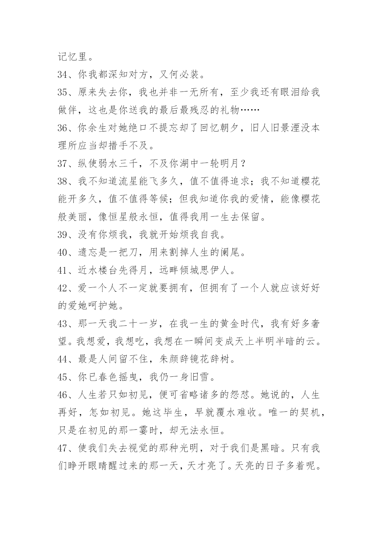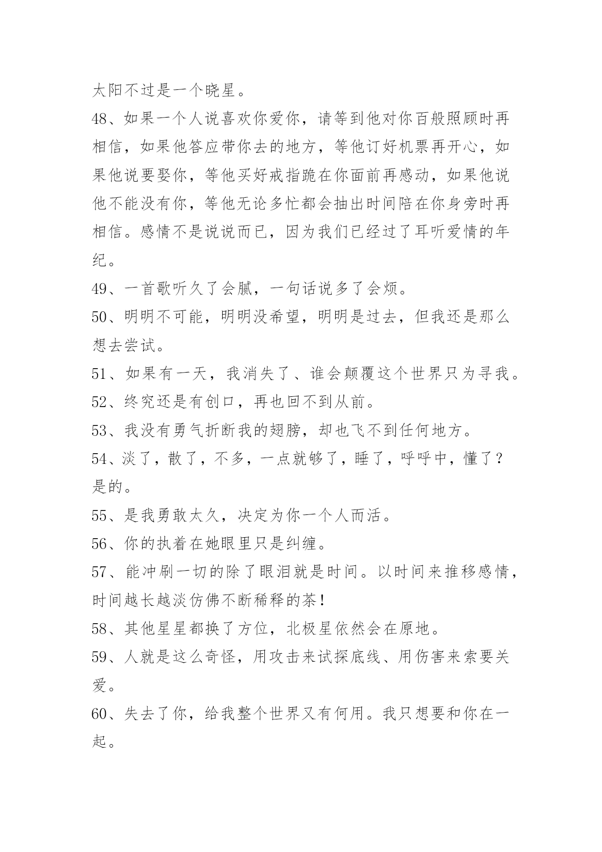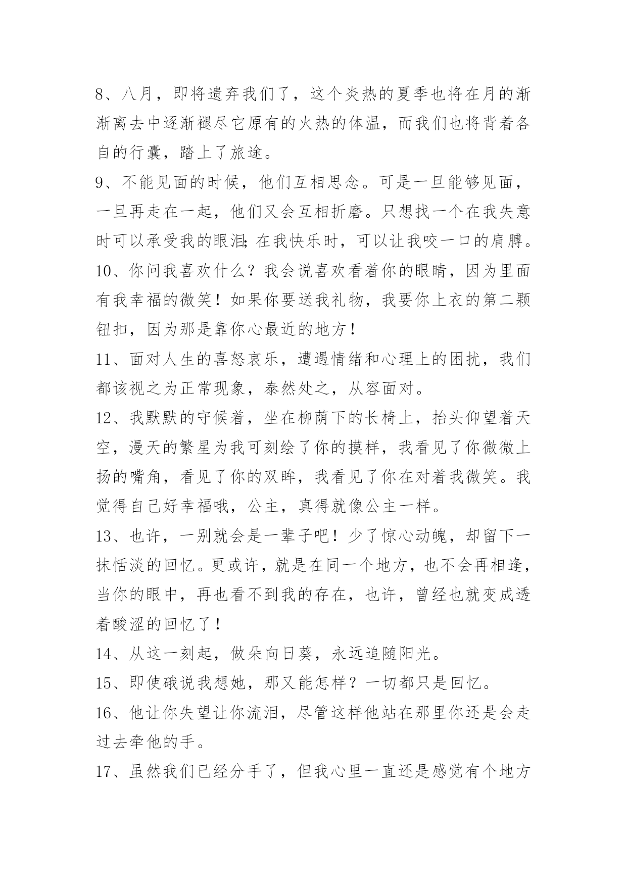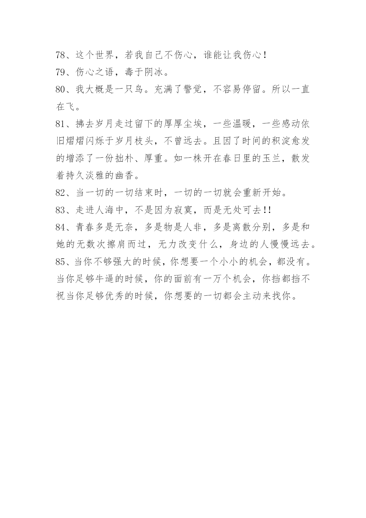 忧伤唯美句子85条有关忧伤唯美句子85条忍是一种眼光,忍是一种胸怀,忍是一种领悟,忍是一种人生的技巧,忍是一种规则的智慧。其实世界上没有那么多的如果,有时候,我们一瞬间失去的东西就是永恒。以下是小编整理的忧伤唯美句子85条,一起来欣赏吧。1、美感的记忆,是人生最可珍的产业,认识美的本能是上帝给我们进天堂的一把秘钥。2、生活告诉我们,这个世界从来不存在完美的人与事,过于完美的感情,只发生在童话与想象中,现实的常态,除了平淡,就是千疮百孔与劫后重生。3、懂得,是最美的缘。珍重当下,是最大的财富。风烟过往,事事难能如愿,唯有将心交给阳光,珍重活着的每一天,行走的路上便留下了最美的风景。4、从未想过有这么一个人,会让你毫无理由地去信任他,去欣赏他。每时每刻都沉浸在欢声笑语中,仿佛整个世界都被幸福包围着,洋溢着甜美的笑容。5、时间就像一条线一样、不断的拉扯着我们向前,纵然有那么美的曾经、但却无法回到当初的那个交点。6、不要太片面的看人与事,如果自己是完美的就不会这样评价别人。7、青春原本是美的,但是你长时间不打理它,再红艳的花也会变得苍白。8、八月,即将遗弃我们了,这个炎热的夏季也将在月的渐渐离去中逐渐褪尽它原有的火热的体温,而我们也将背着各自的行囊,踏上了旅途。9、不能见面的时候,他们互相思念。可是一旦能够见面,一旦再走在一起,他们又会互相折磨。只想找一个在我失意时可以承受我的眼泪;在我快乐时,可以让我咬一口的肩膊。10、你问我喜欢什么?我会说喜欢看着你的眼睛,因为里面有我幸福的微笑!如果你要送我礼物,我要你上衣的第二颗钮扣,因为那是靠你心最近的地方!11、面对人生的喜怒哀乐,遭遇情绪和心理上的困扰,我们都该视之为正常现象,泰然处之,从容面对。12、我默默的守候着,坐在柳荫下的长椅上,抬头仰望着天空,漫天的繁星为我可刻绘了你的摸样,我看见了你微微上扬的嘴角,看见了你的双眸,我看见了你在对着我微笑。我觉得自己好幸福哦,公主,真得就像公主一样。13、也许,一别就会是一辈子吧!少了惊心动魄,却留下一抹恬淡的回忆。更或许,就是在同一个地方,也不会再相逢,当你的眼中,再也看不到我的存在,也许,曾经也就变成透着酸涩的回忆了!14、从这一刻起,做朵向日葵,永远追随阳光。15、即使硪说我想她,那又能怎样?一切都只是回忆。16、他让你失望让你流泪,尽管这样他站在那里你还是会走过去牵他的手。17、虽然我们已经分手了,但我心里一直还是感觉有个地方空空的。18、这是认识你的第二个冬天。19、生命如铜钱,每个人高兴怎么用就怎么用,但一个铜板只能用一次。生命如自助餐厅,要吃什么菜自己选择。生命像玩牌,拿到好牌不一定会赢,要看别人怎么玩。人生如戏,生命是舞台,每个人就扮演着自己的角色,且让每个人都好好走过有意义的一趟。20、当美丽变得稀有,当信念永远坚定,当心态趋于纯粹…倾心,只在最真的一刻。21、爱你爱到无可救药,想你想到备受煎熬。22、人生若只如初见,我们默默遇见,相顾无言,微笑致意,擦肩而过,你是我生命中的路人甲,没有交集,便无所谓刻骨铭心、沧海桑田。23、人的悲伤,总是无法诉说,只有自己知道最真实的自己,最真实的感情埋藏于心底,不愿让被人窥觑,更不愿让他人嘲笑吧。或许,漆黑夜空是我们最好的朋友,与我们最亲密,陪伴在我们身边,守护着我们,看望着我们。偶尔还有星星作伴,告诉那颗闪烁的星星,你最近好吗?我或许不好。24、跟你在一起久了,你让我明白了很多,让我明白了什么叫做不可能在一起。25、我站在苍穹的天幕下,回忆的面纱被揭开,我们在一起的一幕幕画面,那洋溢着甜蜜的幸福画面,当我从那如同梦境般冗长的回忆中逃出来时,我无语,只能站在苍蓝的天空下独自流泪,倏忽间,我仿佛又看到了你吻我的样子,浑身散发着帅气,我清晰的感受到你眸子里的情,那么真切,那么另我不舍……26、我们所炫耀的往往就是我们最所缺失的,我们缄口不言的,往往才是心中最美的!27、青春那么短暂,我却在花季正盛时,遇见了所爱的人;生命那么有限,我却在最美丽的年华,被所爱的.人深深爱过。我们曾在山巅海角相爱过;纵使结局是于山巅海角分别,我也不后悔。我唯一后悔的是,当时没有多爱他一点。28、谁为我一生挚爱男子?放在心尖。含在口中。我愿倾尽毕生之力。宠爱之至。独扛江山戎马许他一世繁华。29、如果我们能早些相识相知相爱,一切或许都会改变,但是爱情和缘分都不能回头。30、每个人,包括我自己,都有愚蠢到底的时候,正因为如此,每个人都应该有一次被原谅的权利。——郭敬明31、在我的一生当中,不是遇到很多男人,但是很幸运我的男人都给了我一种很温暖、很多爱的感觉。所以我觉得,如果我喜欢一件衣服,就像喜欢我最心爱的男人一样,我不会舍得不要这件衣服。我还希望跟衣服,长相厮守,永永远远穿着它。32、有时候,上天没有给你想要的,不