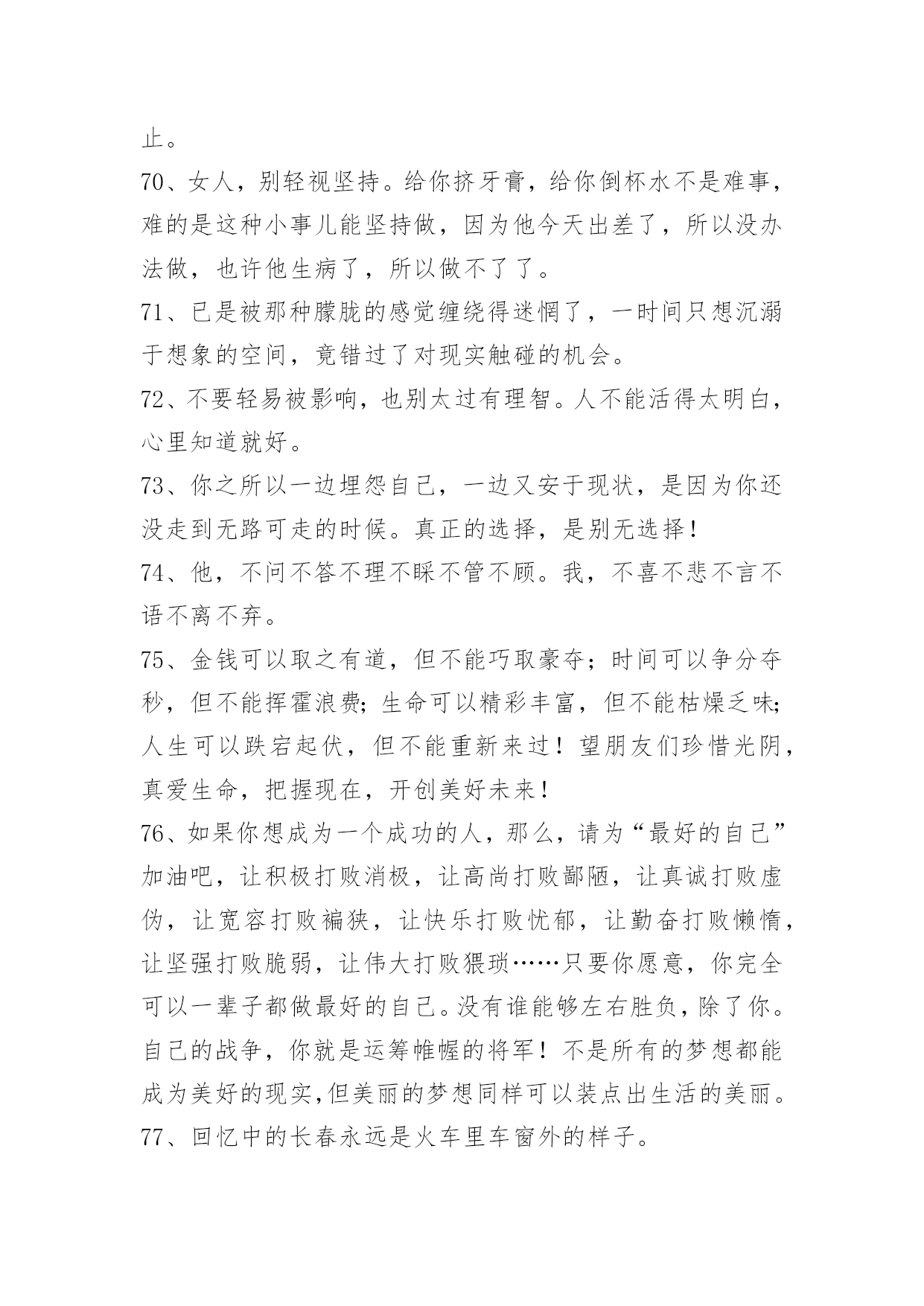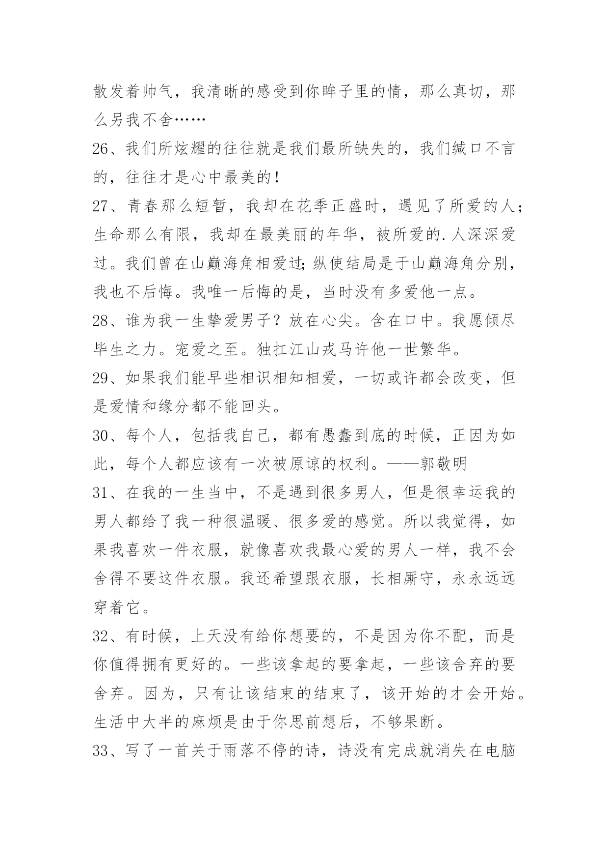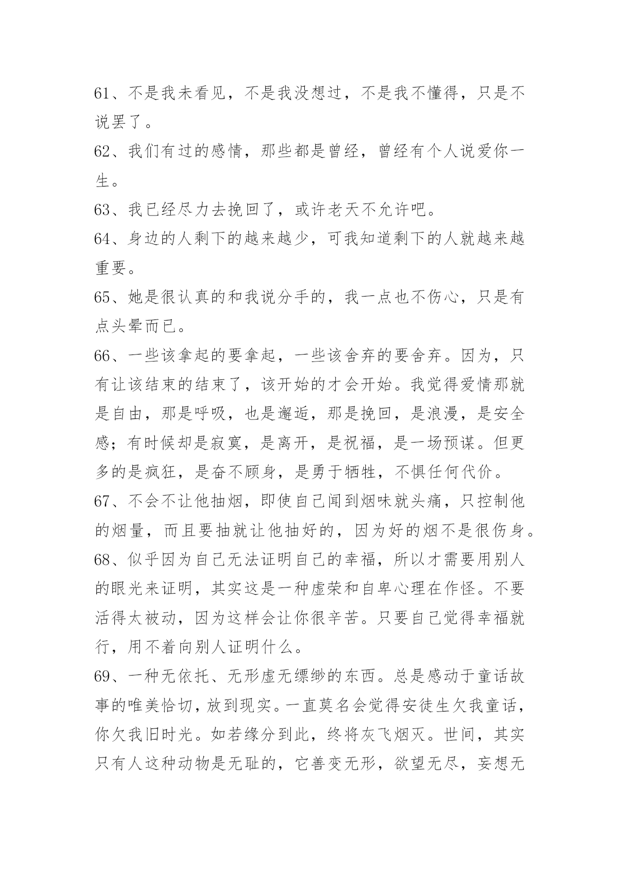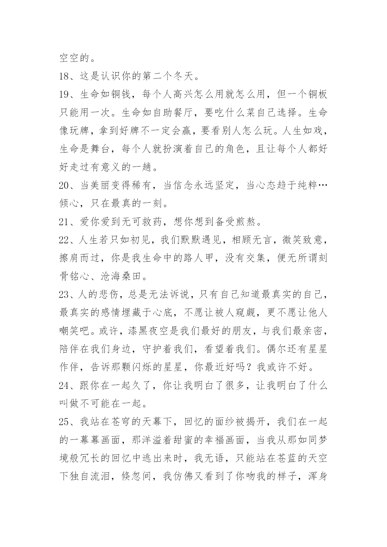 忧伤唯美句子85条有关忧伤唯美句子85条忍是一种眼光,忍是一种胸怀,忍是一种领悟,忍是一种人生的技巧,忍是一种规则的智慧。其实世界上没有那么多的如果,有时候,我们一瞬间失去的东西就是永恒。以下是小编整理的忧伤唯美句子85条,一起来欣赏吧。1、美感的记忆,是人生最可珍的产业,认识美的本能是上帝给我们进天堂的一把秘钥。2、生活告诉我们,这个世界从来不存在完美的人与事,过于完美的感情,只发生在童话与想象中,现实的常态,除了平淡,就是千疮百孔与劫后重生。3、懂得,是最美的缘。珍重当下,是最大的财富。风烟过往,事事难能如愿,唯有将心交给阳光,珍重活着的每一天,行走的路上便留下了最美的风景。4、从未想过有这么一个人,会让你毫无理由地去信任他,去欣赏他。每时每刻都沉浸在欢声笑语中,仿佛整个世界都被幸福包围着,洋溢着甜美的笑容。5、时间就像一条线一样、不断的拉扯着我们向前,纵然有那么美的曾经、但却无法回到当初的那个交点。6、不要太片面的看人与事,如果自己是完美的就不会这样评价别人。7、青春原本是美的,但是你长时间不打理它,再红艳的花也会变得苍白。8、八月,即将遗弃我们了,这个炎热的夏季也将在月的渐渐离去中逐渐褪尽它原有的火热的体温,而我们也将背着各自的行囊,踏上了旅途。9、不能见面的时候,他们互相思念。可是一旦能够见面,一旦再走在一起,他们又会互相折磨。只想找一个在我失意时可以承受我的眼泪;在我快乐时,可以让我咬一口的肩膊。10、你问我喜欢什么?我会说喜欢看着你的眼睛,因为里面有我幸福的微笑!如果你要送我礼物,我要你上衣的第二颗钮扣,因为那是靠你心最近的地方!11、面对人生的喜怒哀乐,遭遇情绪和心理上的困扰,我们都该视之为正常现象,泰然处之,从容面对。12、我默默的守候着,坐在柳荫下的长椅上,抬头仰望着天空,漫天的繁星为我可刻绘了你的摸样,我看见了你微微上扬的嘴角,看见了你的双眸,我看见了你在对着我微笑。我觉得自己好幸福哦,公主,真得就像公主一样。13、也许,一别就会是一辈子吧!少了惊心动魄,却留下一抹恬淡的回忆。更或许,就是在同一个地方,也不会再相逢,当你的眼中,再也看不到我的存在,也许,曾经也就变成透着酸涩的回忆了!14、从这一刻起,做朵向日葵,永远追随阳光。15、即使硪说我想她,那又能怎样?一切都只是回忆。16、他让你失望让你流泪,尽管这样他站在那里你还是会走过去牵他的手。17、虽然我们已经分手了,但我心里一直还是感觉有个地方空空的。18、这是认识你的第二个冬天。19、生命如铜钱,每个人高兴怎么用就怎么用,但一个铜板只能用一次。生命如自助餐厅,要吃什么菜自己选择。生命像玩牌,拿到好牌不一定会赢,要看别人怎么玩。人生如戏,生命是舞台,每个人就扮演着自己的角色,且让每个人都好好走过有意义的一趟。20、当美丽变得稀有,当信念永远坚定,当心态趋于纯粹…倾心,只在最真的一刻。21、爱你爱到无可救药,想你想到备受煎熬。22、人生若只如初见,我们默默遇见,相顾无言,微笑致意,擦肩而过,你是我生命中的路人甲,没有交集,便无所谓刻骨铭心、沧海桑田。23、人的悲伤,总是无法诉说,只有自己知道最真实的自己,最真实的感情埋藏于心底,不愿让被人窥觑,更不愿让他人嘲笑吧。或许,漆黑夜空是我们最好的朋友,与我们最亲密,陪伴在我们身边,守护着我们,看望着我们。偶尔还有星星作伴,告诉那颗闪烁的星星,你最近好吗?我或许不好。24、跟你在一起久了,你让我明白了很多,让我明白了什么叫做不可能在一起。25、我站在苍穹的天幕下,回忆的面纱被揭开,我们在一起的一幕幕画面,那洋溢着甜蜜的幸福画面,当我从那如同梦境般冗长的回忆中逃出来时,我无语,只能站在苍蓝的天空下独自流泪,倏忽间,我仿佛又看到了你吻我的样子,浑身散发着帅气,我清晰的感受到你眸子里的情,那么真切,那么另我不舍……26、我们所炫耀的往往就是我们最所缺失的,我们缄口不言的,往往才是心中最美的!27、青春那么短暂,我却在花季正盛时,遇见了所爱的人;生命那么有限,我却在最美丽的年华,被所爱的.人深深爱过。我们曾在山巅海角相爱过;纵使结局是于山巅海角分别,我也不后悔。我唯一后悔的是,当时没有多爱他一点。28、谁为我一生挚爱男子?放在心尖。含在口中。我愿倾尽毕生之力。宠爱之至。独扛江山戎马许他一世繁华。29、如果我们能早些相识相知相爱,一切或许都会改变,但是爱情和缘分都不能回头。30、每个人,包括我自己,都有愚蠢到底的时候,正因为如此,每个人都应该有一次被原谅的权利。——郭敬明31、在我的一生当中,不是遇到很多男人,但是很幸运我的男人都给了我一种很温暖、很多爱的感觉。所以我觉得,如果我喜欢一件衣服,就像喜欢我最心爱的男人一样,我不会舍得不要这件衣服。我还希望跟衣服,长相厮守,永永远远穿着它。32、有时候,上天没有给你想要的,不