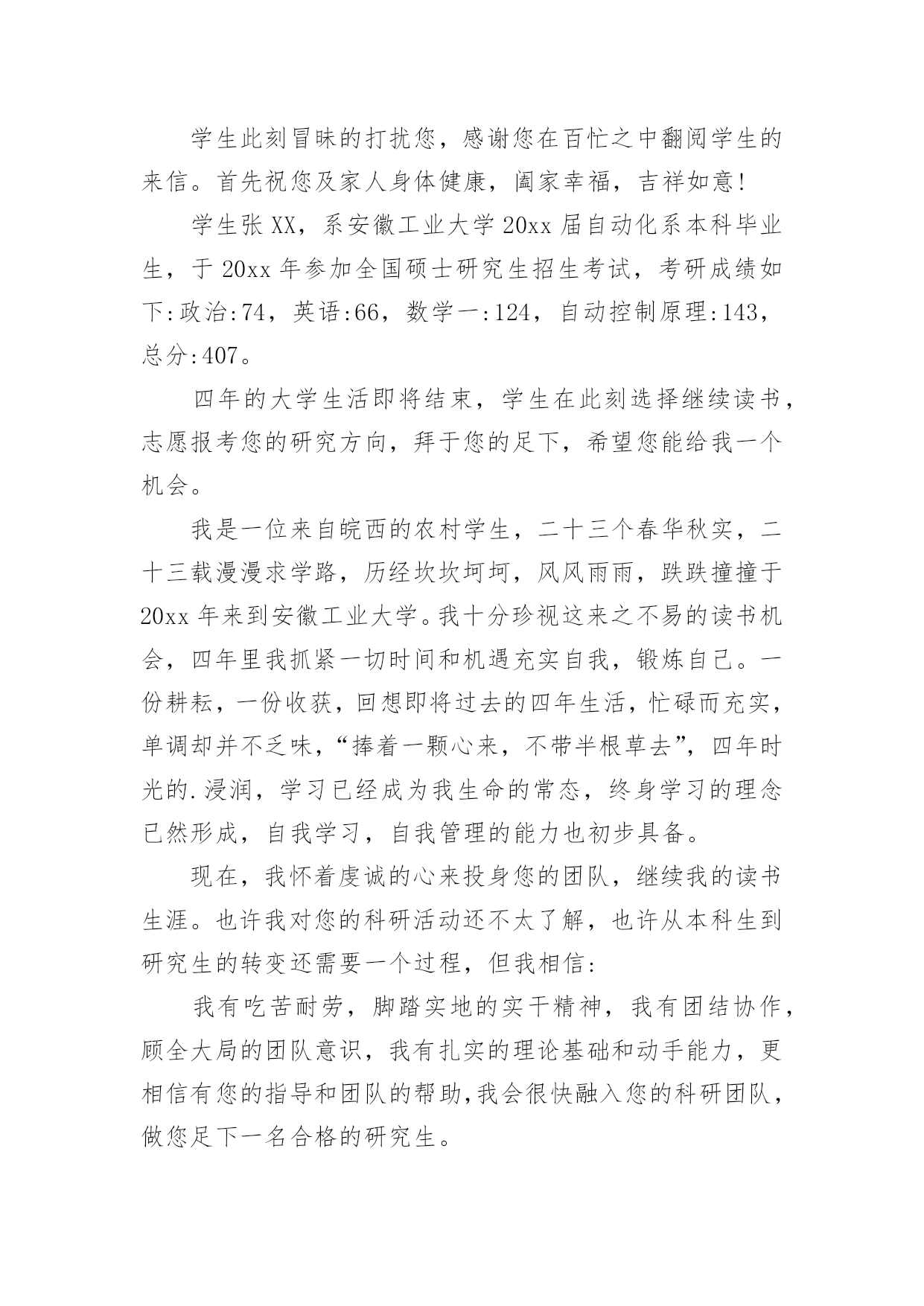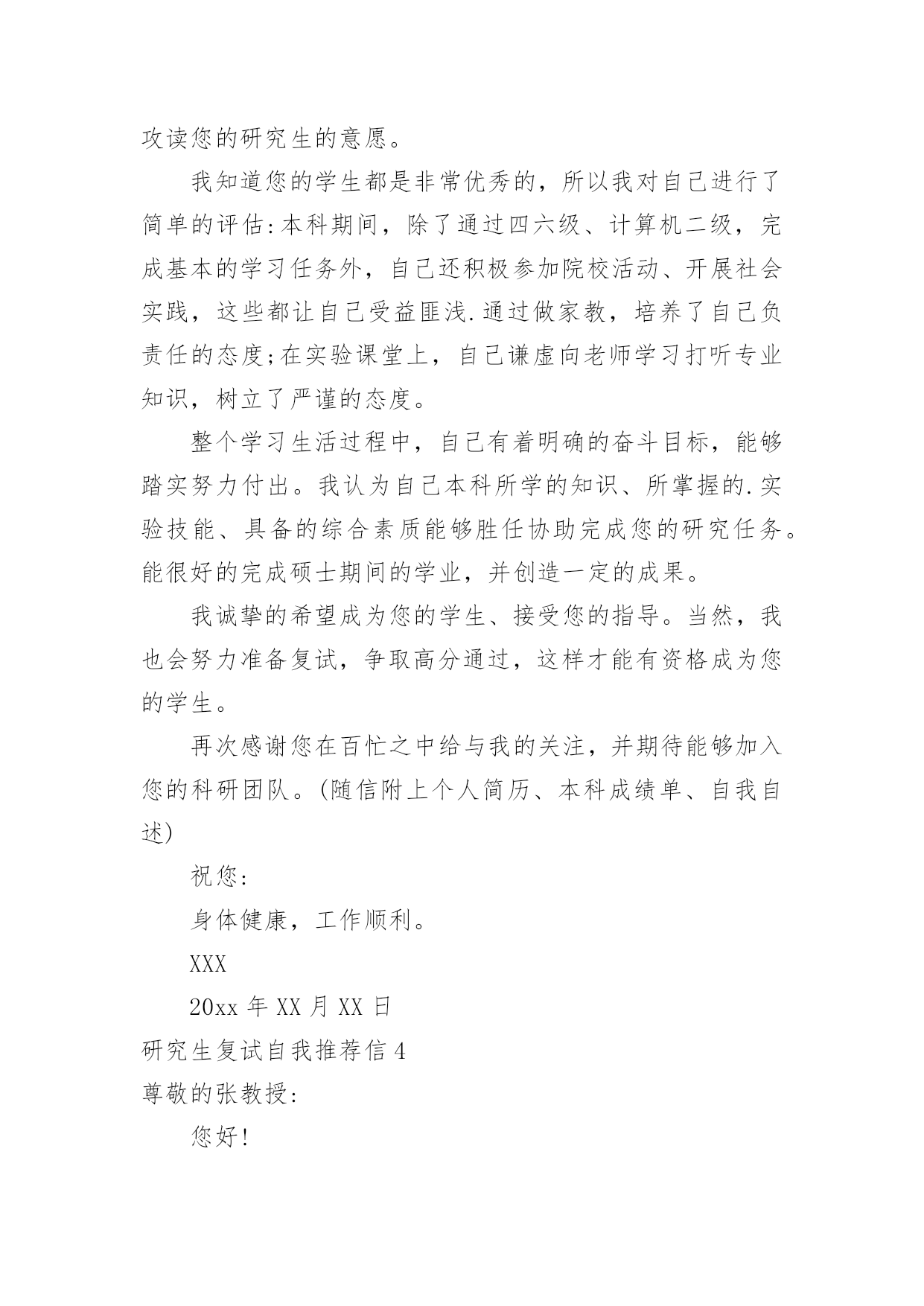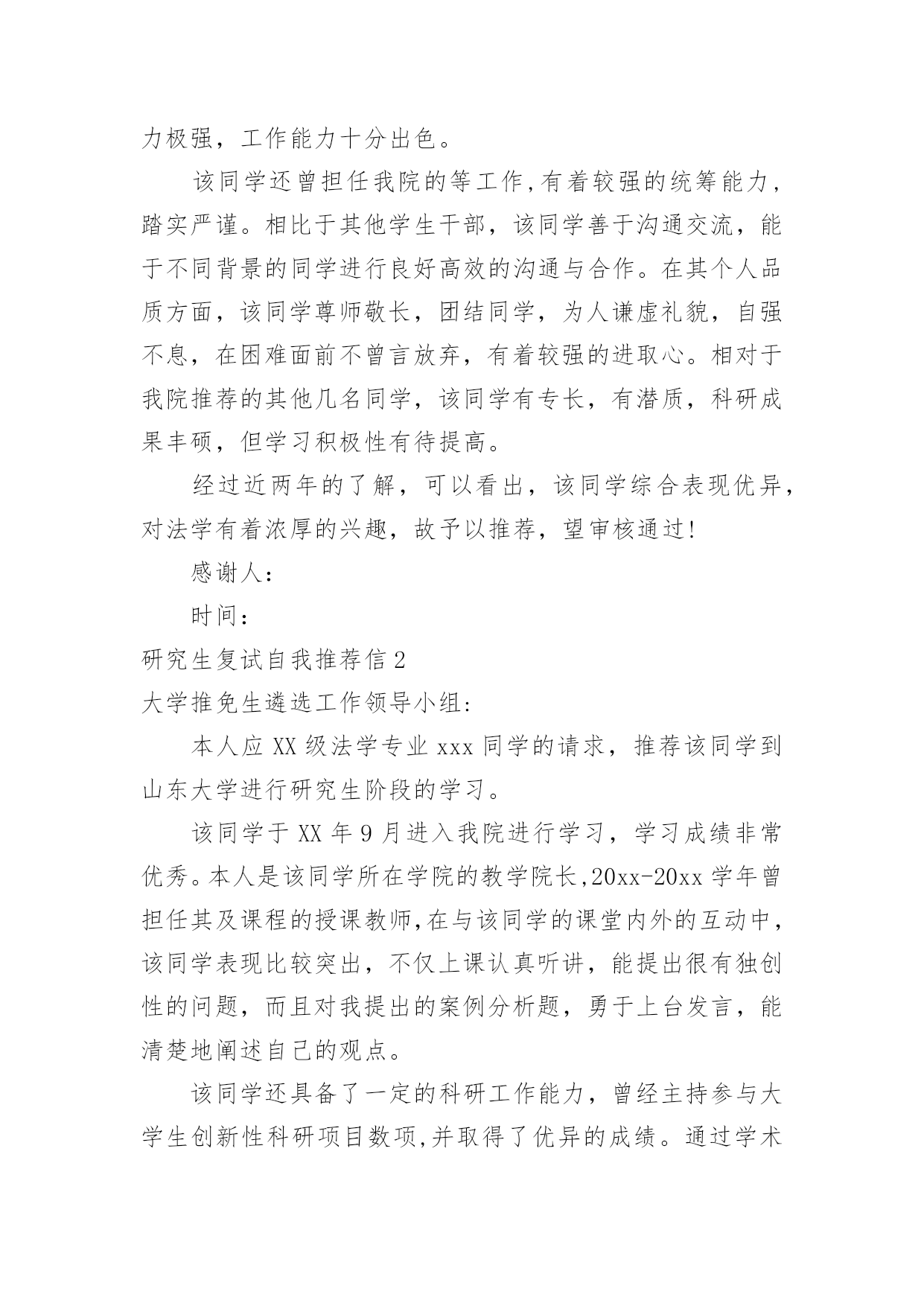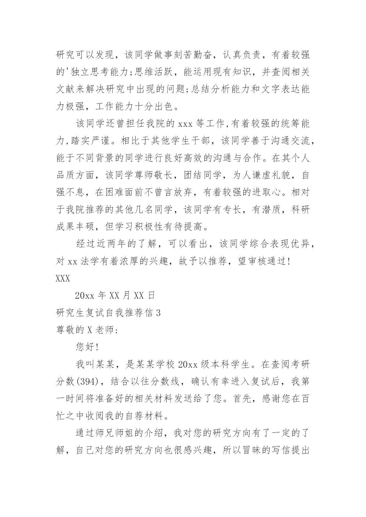 研究生复试自我推荐信研究生复试自我推荐信在生活中,推荐信不再是罕见的东西,推荐信是一个人推荐另一个人而写的信件。还是对推荐信一筹莫展吗?下面是小编帮大家整理的研究生复试自我推荐信,希望对大家有所帮助。研究生复试自我推荐信1大学推免生遴选工作领导小组:本人应XX级法学专业x同学的请求,推荐该同学到山东大学进行研究生阶段的学习。该同学于XX年9月进入我院进行学习,学习成绩非常优秀。本人是该同学所在学院的教学院长,20xx-20xx学年曾担任其及课程的授课教师,在与该同学的`课堂内外的互动中,该同学表现比较突出,不仅上课认真听讲,能提出很有独创性的问题,而且对我提出的案例分析题,勇于上台发言,能清楚地阐述自己的观点。该同学还具备了一定的科研工作能力,曾经主持参与大学生创新性科研项目数项,并取得了优异的成绩。通过学术研究可以发现,该同学做事刻苦勤奋,认真负责,有着较强的独立思考能力;思维活跃,能运用现有知识,并查阅相关文献来解决研究中出现的问题;总结分析能力和文字表达能力极强,工作能力十分出色。该同学还曾担任我院的等工作,有着较强的统筹能力,踏实严谨。相比于其他学生干部,该同学善于沟通交流,能于不同背景的同学进行良好高效的沟通与合作。在其个人品质方面,该同学尊师敬长,团结同学,为人谦虚礼貌,自强不息,在困难面前不曾言放弃,有着较强的进取心。相对于我院推荐的其他几名同学,该同学有专长,有潜质,科研成果丰硕,但学习积极性有待提高。经过近两年的了解,可以看出,该同学综合表现优异,对法学有着浓厚的兴趣,故予以推荐,望审核通过!感谢人:时间:研究生复试自我推荐信2大学推免生遴选工作领导小组:本人应XX级法学专业xxx同学的请求,推荐该同学到山东大学进行研究生阶段的学习。该同学于XX年9月进入我院进行学习,学习成绩非常优秀。本人是该同学所在学院的教学院长,20xx-20xx学年曾担任其及课程的授课教师,在与该同学的课堂内外的互动中,该同学表现比较突出,不仅上课认真听讲,能提出很有独创性的问题,而且对我提出的案例分析题,勇于上台发言,能清楚地阐述自己的观点。该同学还具备了一定的科研工作能力,曾经主持参与大学生创新性科研项目数项,并取得了优异的成绩。通过学术研究可以发现,该同学做事刻苦勤奋,认真负责,有着较强的'独立思考能力;思维活跃,能运用现有知识,并查阅相关文献来解决研究中出现的问题;总结分析能力和文字表达能力极强,工作能力十分出色。该同学还曾担任我院的xxx等工作,有着较强的统筹能力,踏实严谨。相比于其他学生干部,该同学善于沟通交流,能于不同背景的同学进行良好高效的沟通与合作。在其个人品质方面,该同学尊师敬长,团结同学,为人谦虚礼貌,自强不息,在困难面前不曾言放弃,有着较强的进取心。相对于我院推荐的其他几名同学,该同学有专长,有潜质,科研成果丰硕,但学习积极性有待提高。经过近两年的了解,可以看出,该同学综合表现优异,对xx法学有着浓厚的兴趣,故予以推荐,望审核通过!XXX20xx年XX月XX日研究生复试自我推荐信3尊敬的X老师:您好!我叫某某,是某某学校20xx级本科学生。在查阅考研分数(394),结合以往分数线,确认有幸进入复试后,我第一时间将准备好的相关材料发送给了您。首先,感谢您在百忙之中收阅我的自荐材料。通过师兄师姐的介绍,我对您的研究方向有了一定的了解,自己对您的研究方向也很感兴趣,所以冒昧的写信提出攻读您的研究生的意愿。我知道您的学生都是非常优秀的,所以我对自己进行了简单的评估:本科期间,除了通过四六级、计算机二级,完成基本的学习任务外,自己还积极参加院校活动、开展社会实践,这些都让自己受益匪浅.通过做家教,培养了自己负责任的态度;在实验课堂上,自己谦虚向老师学习打听专业知识,树立了严谨的态度。整个学习生活过程中,自己有着明确的奋斗目标,能够踏实努力付出。我认为自己本科所学的知识、所掌握的.实验技能、具备的综合素质能够胜任协助完成您的研究任务。能很好的完成硕士期间的学业,并创造一定的成果。我诚挚的希望成为您的学生、接受您的指导。当然,我也会努力准备复试,争取高分通过,这样才能有资格成为您的学生。再次感谢您在百忙之中给与我的关注,并期待能够加入您的科研团队。(随信附上个人简历、本科成绩单、自我自述)祝您:身体健康,工作顺利。XXX20xx年XX月XX日研究生复试自我推荐信4尊敬的张教授:您好!学生此刻冒昧的打扰您,感谢您在百忙之中翻阅学生的来信。首先祝您及家人身体健康,阖家幸福,吉祥如意!学生张XX,系安徽工业大学20xx届自动化系本科毕业生,于20xx年参加全国硕士研究生招生考试,考研成绩如下:政治:74,英语:66,数学一:124,自动控制原理:143,总分:407。四年的大学生活即将结束,学生在此刻选择继续读书,志愿报考您的