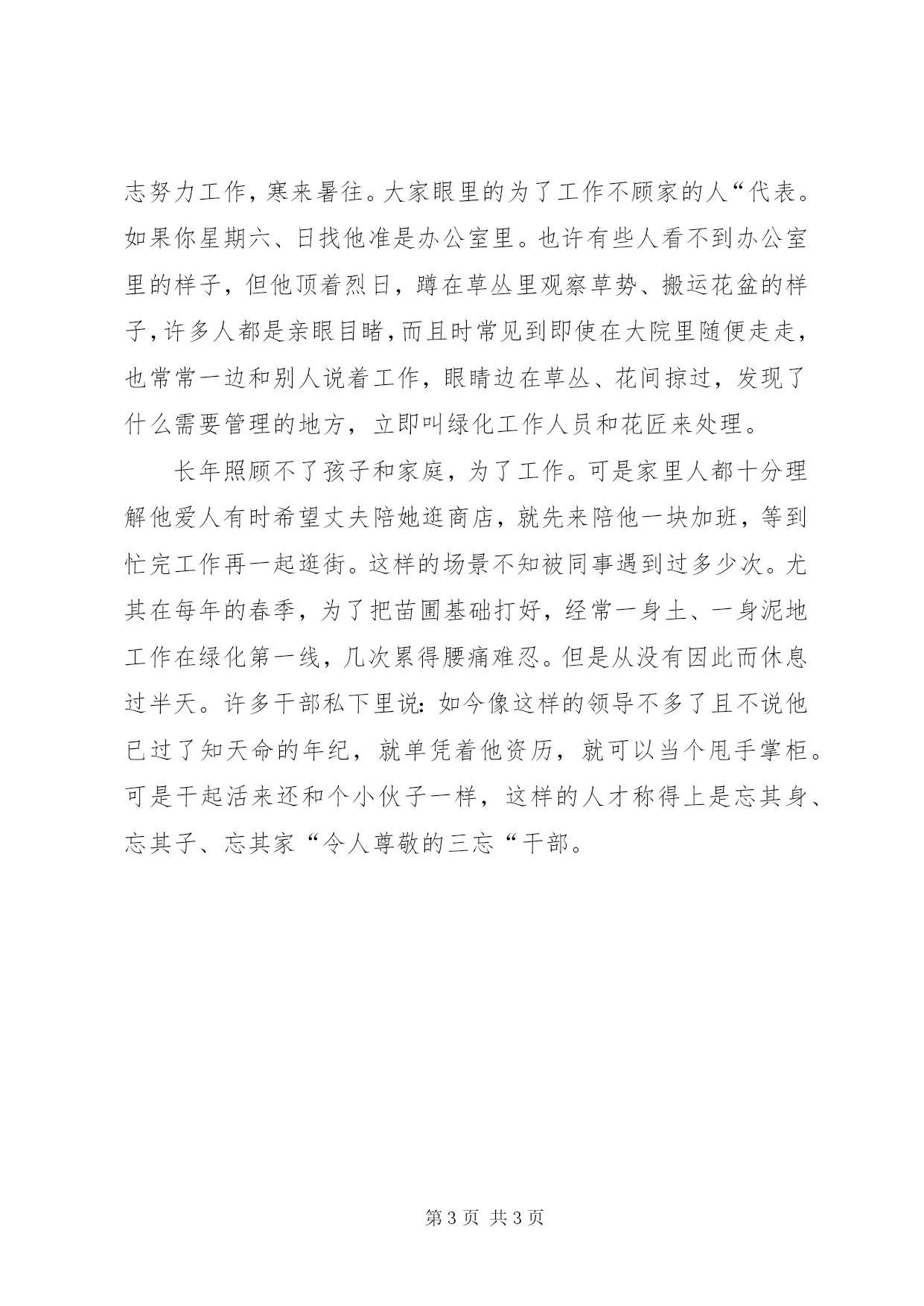第PAGE\*Arabic\*MERGEFORMAT3页共NUMPAGES\*MERGEFORMAT3页环保工作者优秀事迹各位领导、各位同事:万物生光辉“迎着明媚的春光,阳春布德泽。今天,这里举办先进事迹演讲会。非常荣幸能代表我物业部门给大家演讲。讲述的一个默默耕耘在环保绿化战线上的老兵的先进事迹,演讲的题目是改天换地播绿人》。提起干部职工都会竖起大拇指。那是一个心里只有工作,这个部门。责任心重、事业心强的好干部“这种敬业的态度与精神,不断从他所从事的环保绿化工作中折射出来。环保绿化工作是部门工作中的重头戏,应当说。也是一项累人、繁琐的工作。自年接手这项工作以来,始终站在管理者的角度,以岗为家,把从事的环保绿化事业视为生命,环保绿化战线上孜孜不倦地忘我工作着。工作中他严谨认真,尽职尽责,严格按《花园式单位标准》要求,带领部门绿化工作人员,认真落实“花园式单位“量化指标。几年来,和环保绿化部的同志们一道,以顽强的毅力和拼搏的精神,科学有效地组织、指导院区绿化、美化和植树造林工作,开辟了一片“春季有花、夏季有荫、秋季有果、冬季有绿“温馨、优美的生活环境,单位大院绿化面貌焕然一新,绿化养护管理水平得到大幅度的提高。被干部和职工亲切地称为“园林设计师“。专门聘请了有专业知识的园林工程师协助做好规划、设计等工作。哪些地方栽花,有绿还要美才是大家真正的家。为使大院内的环境更加“绿化、美化、净化“亲自带着绿化工作人员到园林处。哪些地方种树,哪些地方植草,全部因地制宜,统一规划,合理安排。经过多方选择,循势造型,提出了沿墙种树,树下种花,楼间种草,点缀特色花果“园林格局设计思路。落实园林设想的日子里,不辞辛苦,勇挑重担,不顾病体,毅然决然地投入到施工第一线,每天与施工队伍加班加点、摸爬滚打奋战在一起,严把施工质量关,对每个细小环节都做到精中求精,细中求细。为了选择适合绿化的苗木,顶酷暑,冒严寒,足迹遍及全市所有花市,随机旁收杂学一些相关知识,渐渐地他就成了部门花圃类知识最丰富的人。春季,亲自带领工作人员调运苗木,开展造林绿化;秋季,及时改选盆花,保证了不同季节,不同色彩,不同香味的花草分布合理,一年四季都有绿色,以上乘的质量,达到最佳的景观效果。从自己的职责范围上入手,建立健全卫生制度,制订了管理措施,为了让初具规模的园林环境保持下去。并亲自监督落实。多年来,为净化、美化大院,春、秋两季,部门均会组织开展大规模的卫生清扫活动,身先士卒,与干部职工一起,清扫院内各种垃圾。干部职工在如此整洁干净的环境里工作,首先想到就是默默奉献的。几度春秋。以润物细无声的模范言行感召和带动着周围的同志努力工作,寒来暑往。大家眼里的为了工作不顾家的人“代表。如果你星期六、日找他准是办公室里。也许有些人看不到办公室里的样子,但他顶着烈日,蹲在草丛里观察草势、搬运花盆的样子,许多人都是亲眼目睹,而且时常见到即使在大院里随便走走,也常常一边和别人说着工作,眼睛边在草丛、花间掠过,发现了什么需要管理的地方,立即叫绿化工作人员和花匠来处理。长年照顾不了孩子和家庭,为了工作。可是家里人都十分理解他爱人有时希望丈夫陪她逛商店,就先来陪他一块加班,等到忙完工作再一起逛街。这样的场景不知被同事遇到过多少次。尤其在每年的春季,为了把苗圃基础打好,经常一身土、一身泥地工作在绿化第一线,几次累得腰痛难忍。但是从没有因此而休息过半天。许多干部私下里说:如今像这样的领导不多了且不说他已过了知天命的年纪,就单凭着他资历,就可以当个甩手掌柜。可是干起活来还和个小伙子一样,这样的人才称得上是忘其身、忘其子、忘其家“令人尊敬的三忘“干部。