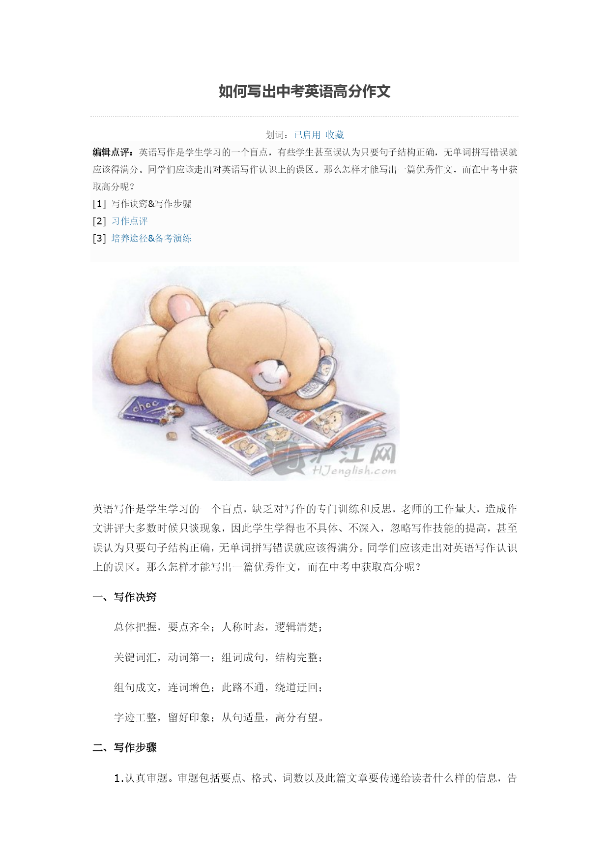 如何写出中考英语高分作文划词:HYPERLINK"javascript:;"已启用HYPERLINK"javascript:void(0)"收藏编辑点评:英语写作是学生学习的一个盲点,有些学生甚至误认为只要句子结构正确,无单词拼写错误就应该得满分。同学们应该走出对英语写作认识上的误区。那么怎样才能写出一篇优秀作文,而在中考中获取高分呢?[1]写作诀窍&写作步骤[2]HYPERLINK"http://www.hjenglish.com/zhongkao/p162490_2/"习作点评[3]HYPERLINK"http://www.hjenglish.com/zhongkao/p162490_3/"培养途径&备考演练英语写作是学生学习的一个盲点,缺乏对写作的专门训练和反思,老师的工作量大,造成作文讲评大多数时候只谈现象,因此学生学得也不具体、不深入,忽略写作技能的提高,甚至误认为只要句子结构正确,无单词拼写错误就应该得满分。同学们应该走出对英语写作认识上的误区。那么怎样才能写出一篇优秀作文,而在中考中获取高分呢?一、写作决窍总体把握,要点齐全;人称时态,逻辑清楚;关键词汇,动词第一;组词成句,结构完整;组句成文,连词增色;此路不通,绕道迂回;字迹工整,留好印象;从句适量,高分有望。二、写作步骤1.认真审题。审题包括要点、格式、词数以及此篇文章要传递给读者什么样的信息,告诫读者什么(即写作目的)。2.确定文体和时态。确定文体后,根据不同文体的特点和要求进行组织材料;同时确定出该篇文章的总时态与时态的变化。3.写完要点,但不随意发挥。4.先草稿,后抄写。