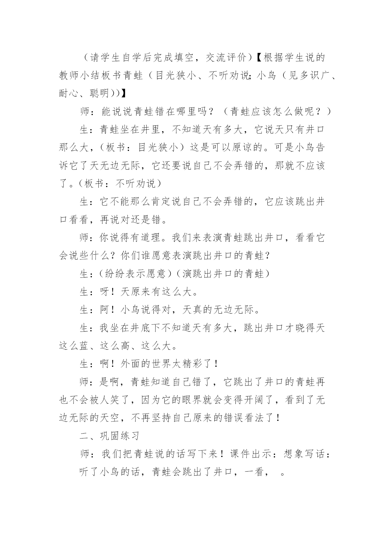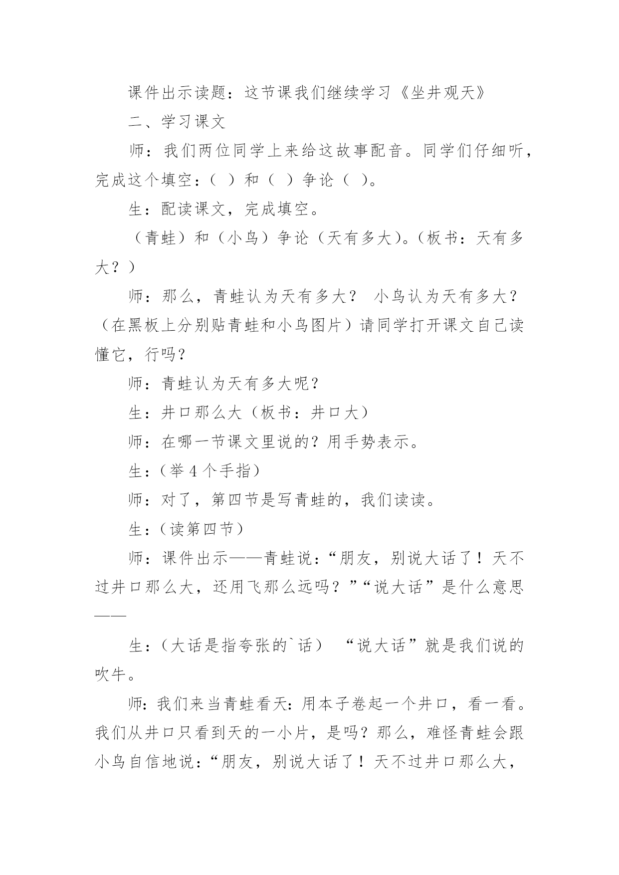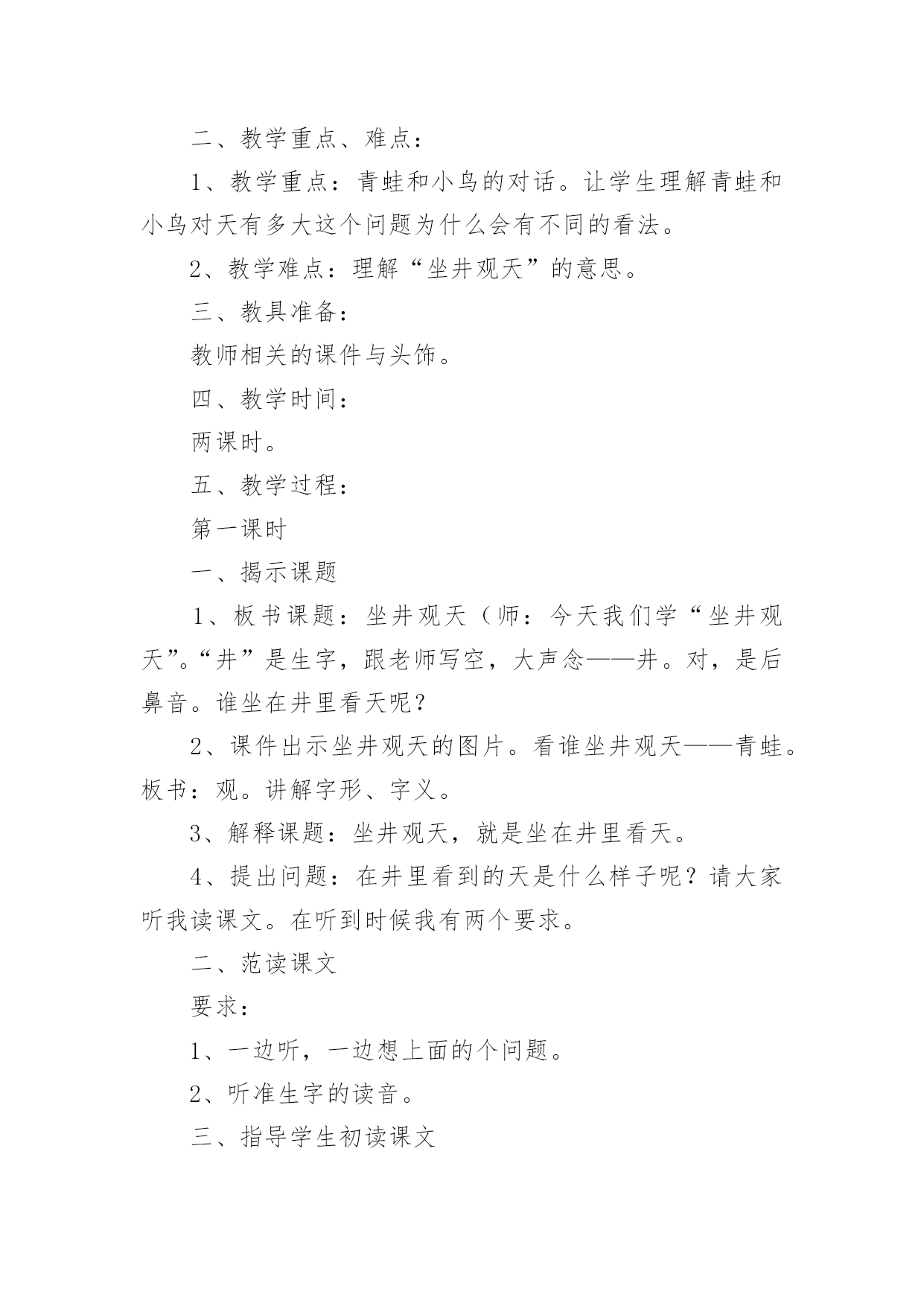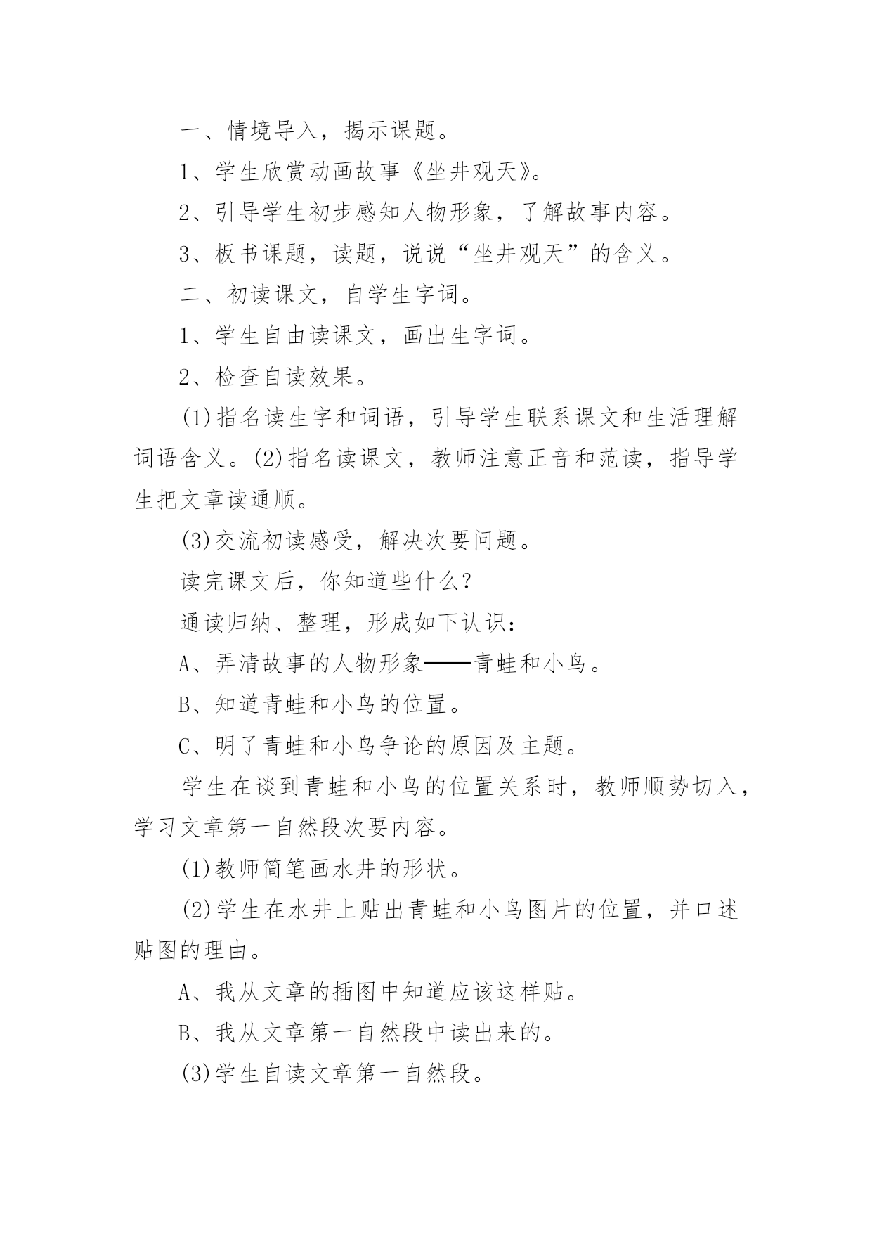 坐井观天教学设计坐井观天教学设计精品作为一名教职工,常常要写一份优秀的教学设计,教学设计是教育技术的组成部分,它的功能在于运用系统方法设计教学过程,使之成为一种具有操作性的程序。你知道什么样的教学设计才能切实有效地帮助到我们吗?以下是小编为大家收集的坐井观天教学设计精品,仅供参考,大家一起来看看吧。坐井观天教学设计精品1教学目标:1、通过拼读音节会读4个生字,会写3个生字。2、通过正确、流利、有感情地朗读课文,初步了解寓言两则的内容3、通过理解课文内容,体会寓言所蕴含的道理,联系自己的学习生活实际,谈一谈感想。教学重难点:1、认读生字,会写生字。2、引导学生有感情地朗读课文,体会寓言所蕴含的道理。教学过程:第一课时一、情境导入,揭示课题。1、学生欣赏动画故事《坐井观天》。2、引导学生初步感知人物形象,了解故事内容。3、板书课题,读题,说说“坐井观天”的含义。二、初读课文,自学生字词。1、学生自由读课文,画出生字词。2、检查自读效果。(1)指名读生字和词语,引导学生联系课文和生活理解词语含义。(2)指名读课文,教师注意正音和范读,指导学生把文章读通顺。(3)交流初读感受,解决次要问题。读完课文后,你知道些什么?通读归纳、整理,形成如下认识:A、弄清故事的人物形象──青蛙和小鸟。B、知道青蛙和小鸟的位置。C、明了青蛙和小鸟争论的原因及主题。学生在谈到青蛙和小鸟的位置关系时,教师顺势切入,学习文章第一自然段次要内容。(1)教师简笔画水井的形状。(2)学生在水井上贴出青蛙和小鸟图片的位置,并口述贴图的理由。A、我从文章的插图中知道应该这样贴。B、我从文章第一自然段中读出来的。(3)学生自读文章第一自然段。(4)指导朗读。三、再读课文,读中感悟。(一)学习青蛙和小鸟的第一次对话1、学生采取自己喜欢的方式读青蛙和小鸟的第一次对话。2、点名读,师生评读,体会青蛙打招呼的文明礼貌行为和小鸟飞了一百多里口渴的情形。3、分角色练习朗读,再现对话情形。4、教师引读,男女生分组加上动作表演读。师:一只小鸟飞呀,飞。飞过山川,飞过河流,飞过田野。它口渴了,落在井沿上,井底的青蛙看见了问:____________?男生:“朋友,你从哪儿来呀?”女生:“我从天上来,飞了一百多里,口渴了,下来找水喝。”(二)尝试朗读第二次对话。1、学生分角色练习朗读第二次对话。2、理解“大话”的。具体含义。深入探究:青蛙为什么认为天空只有井口那么大?引导学生联系生活经验或做实验了解青蛙认为天空只有井口那么大的`原因。3、理解“无边无际”的含义,联系生活实际引导学生练习说话,(无边无际的大海、沙漠、田野等)。4、学生练读对话,想象它们争论的情形,体会语气,要求读出自己的感受来。5、指导朗读。(三)学习青蛙小鸟的第三次对话1、教师引读,小鸟说天空无边无际,青蛙却认为天空只有井口那么大,青蛙相信了吗?青蛙笑了说:“__________”小鸟也笑了说:“____________________”。2、指导朗读。3、分角色表演读故事。4、小组探究。青蛙和小鸟谁说得对?引导学生理解故事的寓意。四、总结全文,感悟寓意。1、学习了故事你知道了些什么?五、课外扩展。青蛙听了小鸟的话,真的跳出了井口,它看见了什么?六、作业。青蛙跳出井口后,它看到了什么?会说些什么?展开你想的像翅膀,把你想到的写下来。坐井观天教学设计精品2一、教学目标:1、通过本课教学,使学生懂得“坐井观天”这个成语的意思。2、掌握本课的生字、词。3、有感情地朗读课文。二、教学重点、难点:1、教学重点:青蛙和小鸟的对话。让学生理解青蛙和小鸟对天有多大这个问题为什么会有不同的看法。2、教学难点:理解“坐井观天”的意思。三、教具准备:教师相关的课件与头饰。四、教学时间:两课时。五、教学过程:第一课时一、揭示课题1、板书课题:坐井观天(师:今天我们学“坐井观天”。“井”是生字,跟老师写空,大声念——井。对,是后鼻音。谁坐在井里看天呢?2、课件出示坐井观天的图片。看谁坐井观天——青蛙。板书:观。讲解字形、字义。3、解释课题:坐井观天,就是坐在井里看天。4、提出问题:在井里看到的天是什么样子呢?请大家听我读课文。在听到时候我有两个要求。二、范读课文要求:1、一边听,一边想上面的个问题。2、听准生字的读音。三、指导学生初读课文1、学生自读课文:现在,请同学们自己读一遍课文。读的时候,要注意读准生字的字音,用序号把这一课的几个自然段标出来。2、指名让学生分段朗读课文。读好“井沿”理解意思;注意读正确“哪儿”(读第三声)“大得恨哪”的读音和语气(“哪”作语气词,读轻声,不读第三声)四、教学生字、词1、出示注音卡片:观沿答百别弄际抬信2、要求读准字音,认清字形。3、用生字练习组词。4、比一比,再组成词语:井()观()沿()百()开()现()