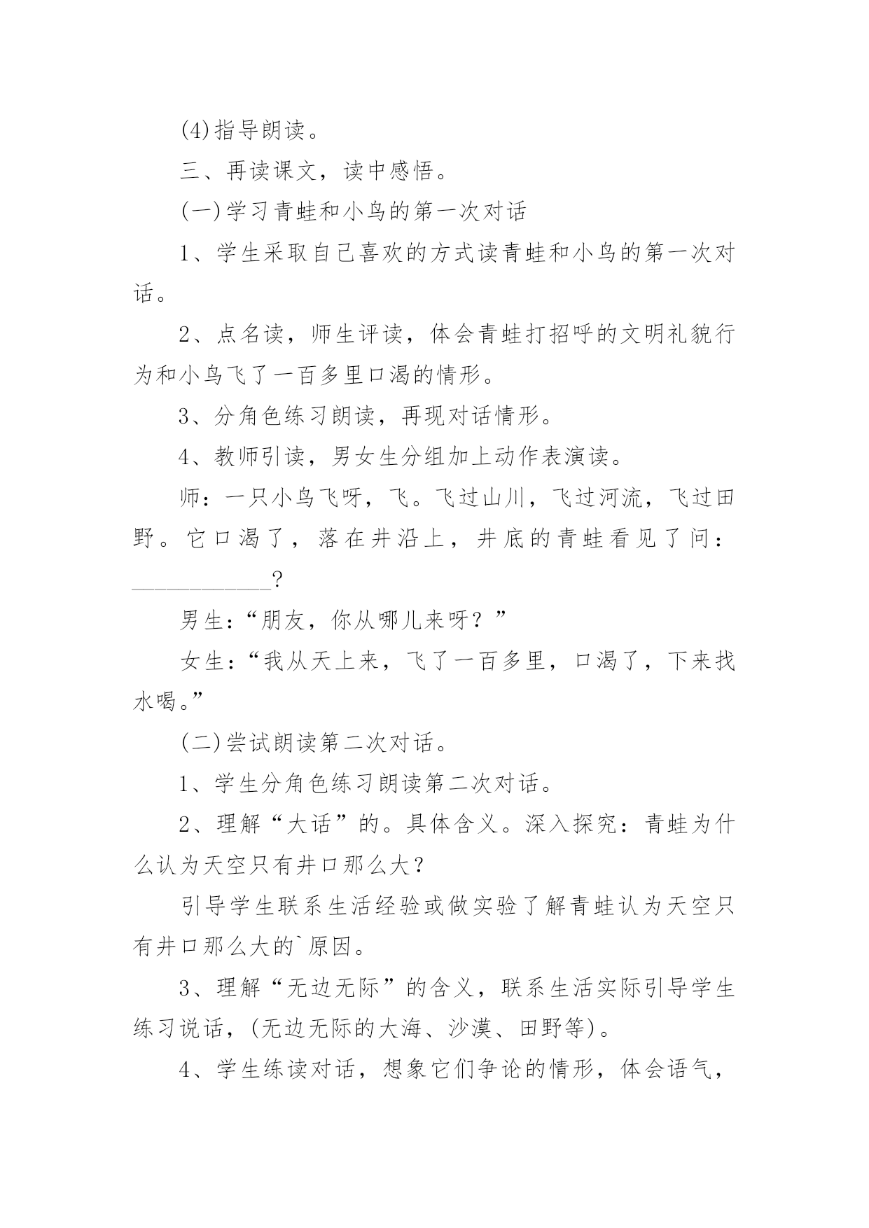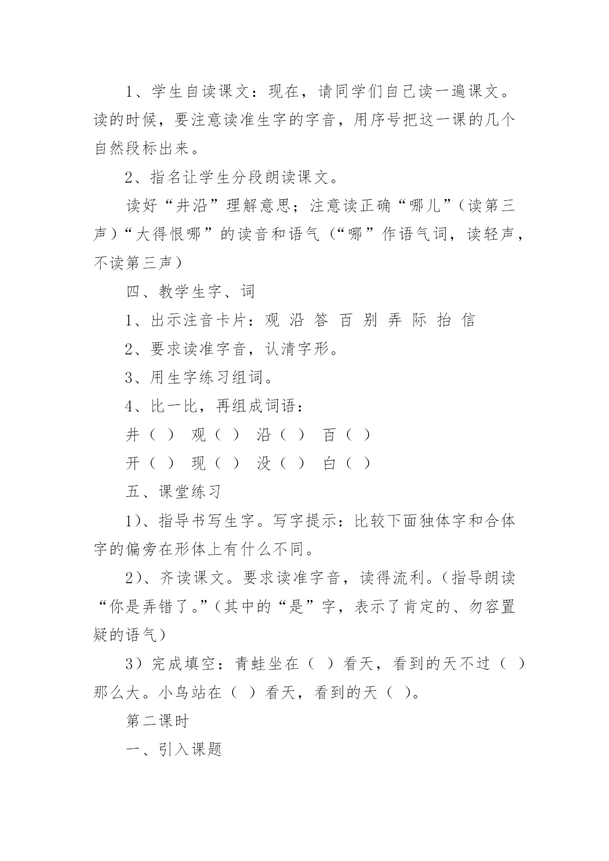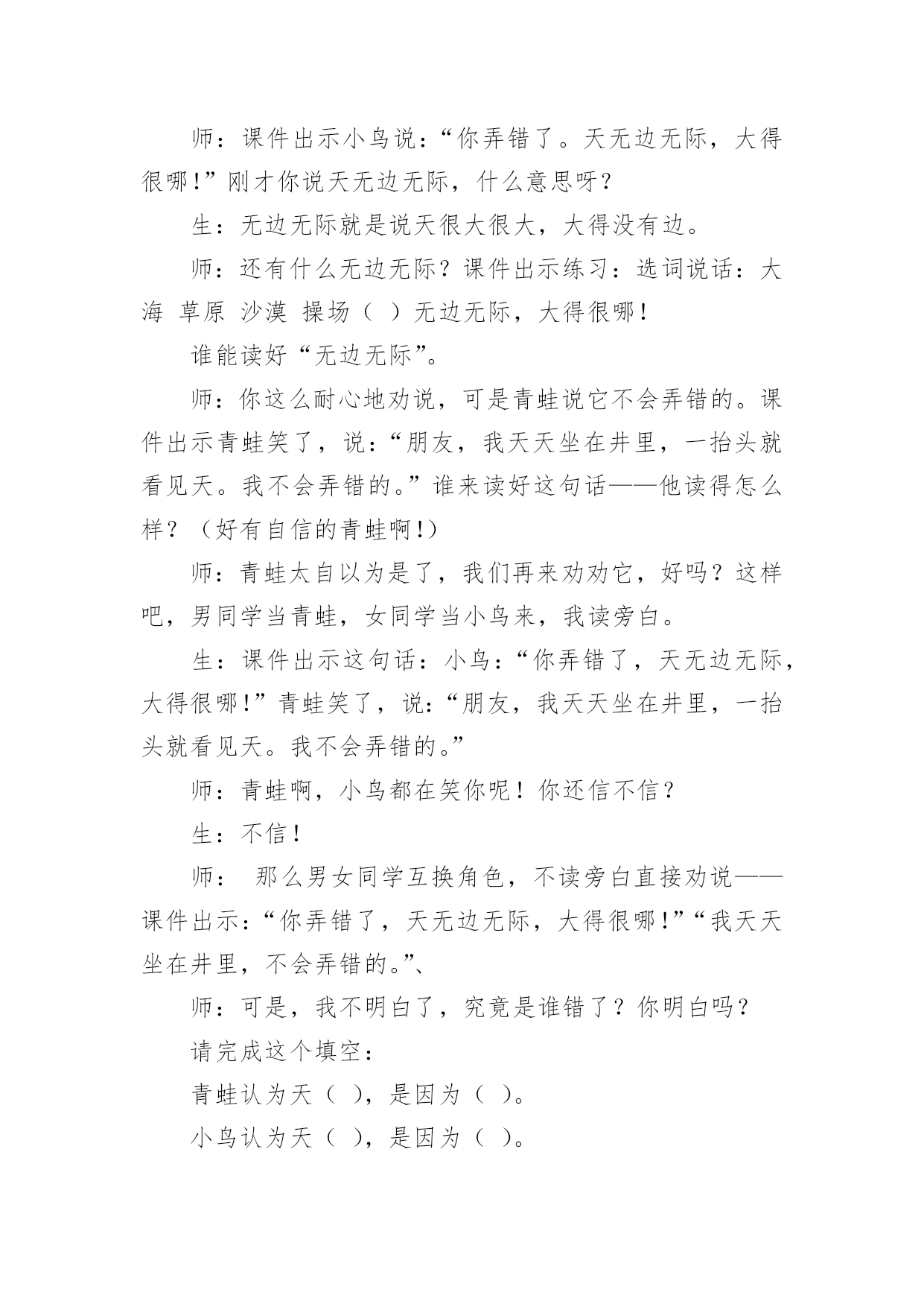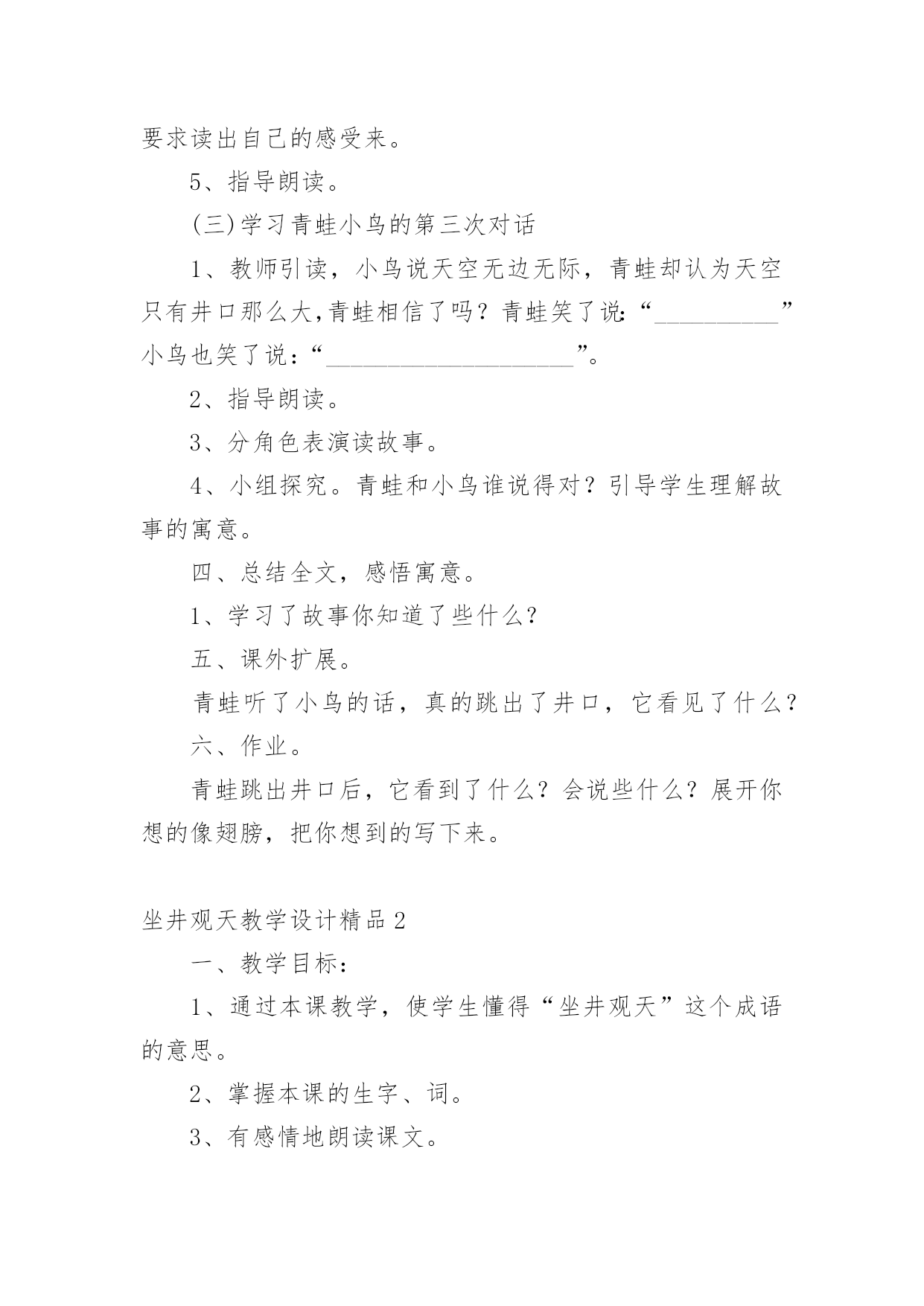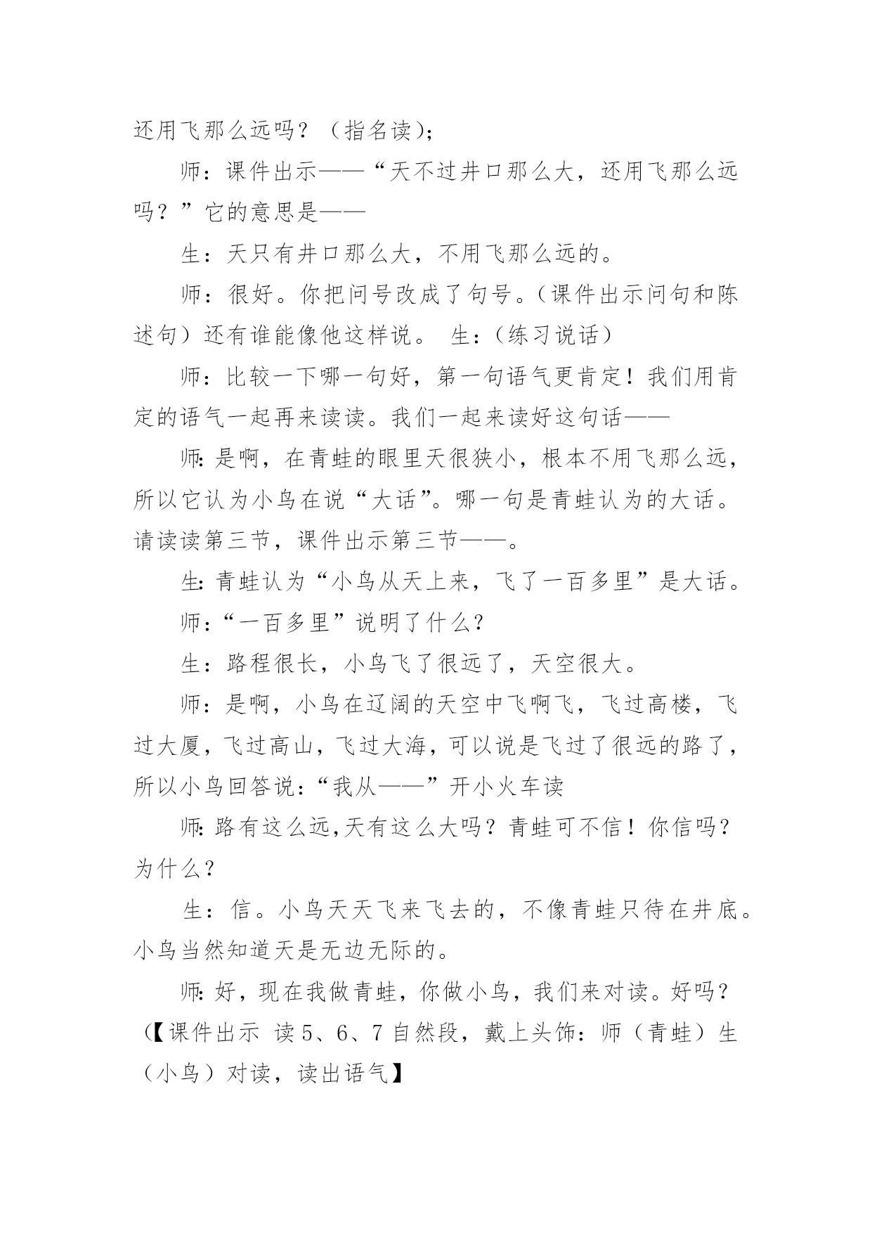 坐井观天教学设计坐井观天教学设计精品作为一名教职工,常常要写一份优秀的教学设计,教学设计是教育技术的组成部分,它的功能在于运用系统方法设计教学过程,使之成为一种具有操作性的程序。你知道什么样的教学设计才能切实有效地帮助到我们吗?以下是小编为大家收集的坐井观天教学设计精品,仅供参考,大家一起来看看吧。坐井观天教学设计精品1教学目标:1、通过拼读音节会读4个生字,会写3个生字。2、通过正确、流利、有感情地朗读课文,初步了解寓言两则的内容3、通过理解课文内容,体会寓言所蕴含的道理,联系自己的学习生活实际,谈一谈感想。教学重难点:1、认读生字,会写生字。2、引导学生有感情地朗读课文,体会寓言所蕴含的道理。教学过程:第一课时一、情境导入,揭示课题。1、学生欣赏动画故事《坐井观天》。2、引导学生初步感知人物形象,了解故事内容。3、板书课题,读题,说说“坐井观天”的含义。二、初读课文,自学生字词。1、学生自由读课文,画出生字词。2、检查自读效果。(1)指名读生字和词语,引导学生联系课文和生活理解词语含义。(2)指名读课文,教师注意正音和范读,指导学生把文章读通顺。(3)交流初读感受,解决次要问题。读完课文后,你知道些什么?通读归纳、整理,形成如下认识:A、弄清故事的人物形象──青蛙和小鸟。B、知道青蛙和小鸟的位置。C、明了青蛙和小鸟争论的原因及主题。学生在谈到青蛙和小鸟的位置关系时,教师顺势切入,学习文章第一自然段次要内容。(1)教师简笔画水井的形状。(2)学生在水井上贴出青蛙和小鸟图片的位置,并口述贴图的理由。A、我从文章的插图中知道应该这样贴。B、我从文章第一自然段中读出来的。(3)学生自读文章第一自然段。(4)指导朗读。三、再读课文,读中感悟。(一)学习青蛙和小鸟的第一次对话1、学生采取自己喜欢的方式读青蛙和小鸟的第一次对话。2、点名读,师生评读,体会青蛙打招呼的文明礼貌行为和小鸟飞了一百多里口渴的情形。3、分角色练习朗读,再现对话情形。4、教师引读,男女生分组加上动作表演读。师:一只小鸟飞呀,飞。飞过山川,飞过河流,飞过田野。它口渴了,落在井沿上,井底的青蛙看见了问:____________?男生:“朋友,你从哪儿来呀?”女生:“我从天上来,飞了一百多里,口渴了,下来找水喝。”(二)尝试朗读第二次对话。1、学生分角色练习朗读第二次对话。2、理解“大话”的。具体含义。深入探究:青蛙为什么认为天空只有井口那么大?引导学生联系生活经验或做实验了解青蛙认为天空只有井口那么大的`原因。3、理解“无边无际”的含义,联系生活实际引导学生练习说话,(无边无际的大海、沙漠、田野等)。4、学生练读对话,想象它们争论的情形,体会语气,要求读出自己的感受来。5、指导朗读。(三)学习青蛙小鸟的第三次对话1、教师引读,小鸟说天空无边无际,青蛙却认为天空只有井口那么大,青蛙相信了吗?青蛙笑了说:“__________”小鸟也笑了说:“____________________”。2、指导朗读。3、分角色表演读故事。4、小组探究。青蛙和小鸟谁说得对?引导学生理解故事的寓意。四、总结全文,感悟寓意。1、学习了故事你知道了些什么?五、课外扩展。青蛙听了小鸟的话,真的跳出了井口,它看见了什么?六、作业。青蛙跳出井口后,它看到了什么?会说些什么?展开你想的像翅膀,把你想到的写下来。坐井观天教学设计精品2一、教学目标:1、通过本课教学,使学生懂得“坐井观天”这个成语的意思。2、掌握本课的生字、词。3、有感情地朗读课文。二、教学重点、难点:1、教学重点:青蛙和小鸟的对话。让学生理解青蛙和小鸟对天有多大这个问题为什么会有不同的看法。2、教学难点:理解“坐井观天”的意思。三、教具准备:教师相关的课件与头饰。四、教学时间:两课时。五、教学过程:第一课时一、揭示课题1、板书课题:坐井观天(师:今天我们学“坐井观天”。“井”是生字,跟老师写空,大声念——井。对,是后鼻音。谁坐在井里看天呢?2、课件出示坐井观天的图片。看谁坐井观天——青蛙。板书:观。讲解字形、字义。3、解释课题:坐井观天,就是坐在井里看天。4、提出问题:在井里看到的天是什么样子呢?请大家听我读课文。在听到时候我有两个要求。二、范读课文要求:1、一边听,一边想上面的个问题。2、听准生字的读音。三、指导学生初读课文1、学生自读课文:现在,请同学们自己读一遍课文。读的时候,要注意读准生字的字音,用序号把这一课的几个自然段标出来。2、指名让学生分段朗读课文。读好“井沿”理解意思;注意读正确“哪儿”(读第三声)“大得恨哪”的读音和语气(“哪”作语气词,读轻声,不读第三声)四、教学生字、词1、出示注音卡片:观沿答百别弄际抬信2、要求读准字音,认清字形。3、用生字练习组词。4、比一比,再组成词语:井()观()沿()百()开()现()