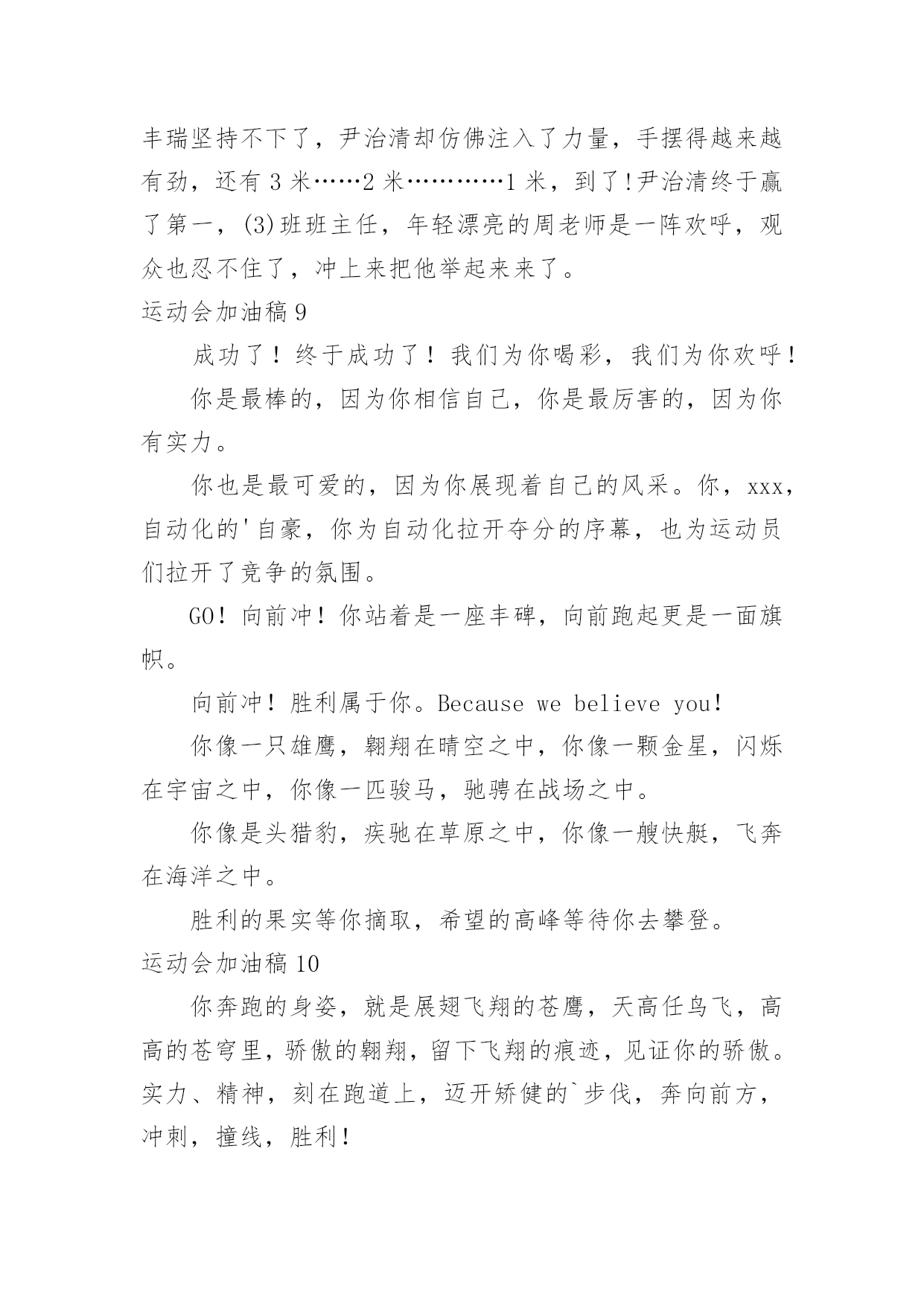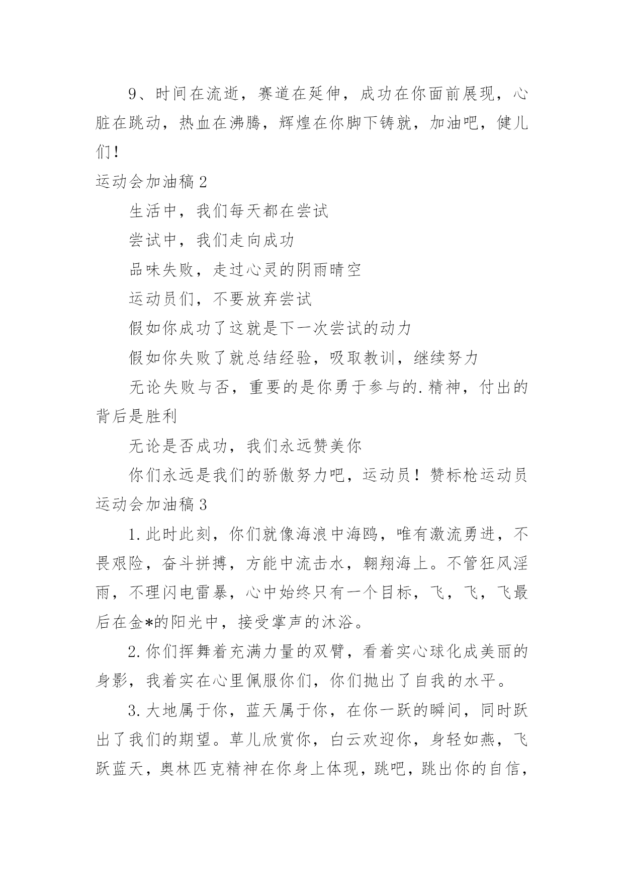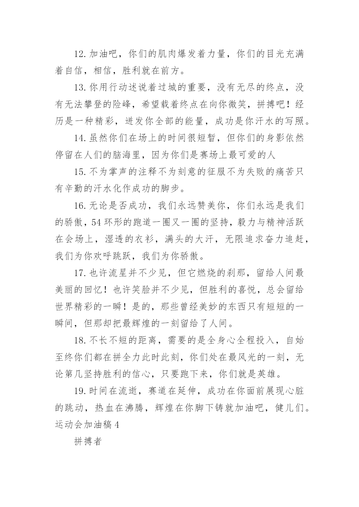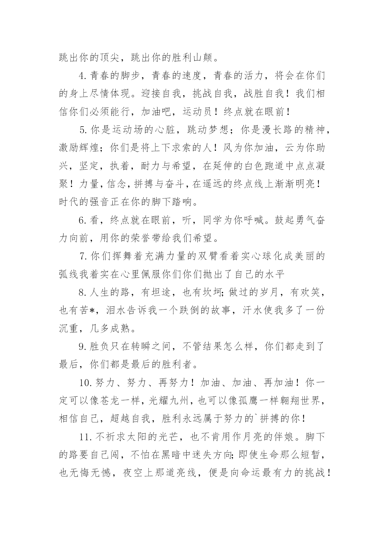 运动会加油稿运动会加油稿在现在的社会生活中,各种加油稿频频出现,加油稿可以给予对方克服困难的勇气和信心。大家知道加油稿怎么写才正确吗?下面是小编帮大家整理的运动会加油稿,希望能够帮助到大家。运动会加油稿11、挑战自我,超越梦想,团结互助,共创佳绩。2、我运动,我健康,此时我欢乐。3、运动起来,勇敢第一。4、夸夫迫日惊华夏,此时平步青云塔黄沙。5、不为鲜花的围绕,不为刹那的荣耀,仅有执着的信念,化作不停的奔跑,心中燃烧着梦想,脚下不停的步伐6、深深的呼吸,等待你的是艰难的100米。7、场上英姿显自豪,脚下步伐在飞奔。你们是骄傲,你们是自豪,跑道因你幻彩,应对红色跑道,你们挥洒自如,不惧一切冲向终点!8、一根小小的木棒,连接的`是团结和友爱一根小小的木棒,传递的是勇气和力量,一根小小的木棒,演绎的是奋斗和拼搏,加油吧!让这激动人心的时刻,一直回荡在我们心中9、时间在流逝,赛道在延伸,成功在你面前展现,心脏在跳动,热血在沸腾,辉煌在你脚下铸就,加油吧,健儿们!运动会加油稿2生活中,我们每天都在尝试尝试中,我们走向成功品味失败,走过心灵的阴雨晴空运动员们,不要放弃尝试假如你成功了这就是下一次尝试的动力假如你失败了就总结经验,吸取教训,继续努力无论失败与否,重要的是你勇于参与的.精神,付出的背后是胜利无论是否成功,我们永远赞美你你们永远是我们的骄傲努力吧,运动员!赞标枪运动员运动会加油稿31.此时此刻,你们就像海浪中海鸥,唯有激流勇进,不畏艰险,奋斗拼搏,方能中流击水,翱翔海上。不管狂风淫雨,不理闪电雷暴,心中始终只有一个目标,飞,飞,飞最后在金*的阳光中,接受掌声的沐浴。2.你们挥舞着充满力量的双臂,看着实心球化成美丽的身影,我着实在心里佩服你们,你们抛出了自我的水平。3.大地属于你,蓝天属于你,在你一跃的瞬间,同时跃出了我们的期望。草儿欣赏你,白云欢迎你,身轻如燕,飞跃蓝天,奥林匹克精神在你身上体现,跳吧,跳出你的自信,跳出你的顶尖,跳出你的胜利山颠。4.青春的脚步,青春的速度,青春的活力,将会在你们的身上尽情体现。迎接自我,挑战自我,战胜自我!我们相信你们必须能行,加油吧,运动员!终点就在眼前!5.你是运动场的心脏,跳动梦想;你是漫长路的精神,激励辉煌;你们是将上下求索的人!风为你加油,云为你助兴,坚定,执着,耐力与希望,在延伸的白色跑道中点点凝聚!力量,信念,拼搏与奋斗,在遥远的终点线上渐渐明亮!时代的强音正在你的脚下踏响。6.看,终点就在眼前,听,同学为你呼喊。鼓起勇气奋力向前,用你的荣誉带给我们希望。7.你们挥舞着充满力量的双臂看着实心球化成美丽的弧线我着实在心里佩服你们你们抛出了自己的水平8.人生的路,有坦途,也有坎坷;做过的岁月,有欢笑,也有苦*,泪水告诉我一个跌倒的故事,汗水使我多了一份沉重,几多成熟。9.胜负只在转瞬之间,不管结果怎么样,你们都走到了最后,你们都是最后的胜利者。10.努力、努力、再努力!加油、加油、再加油!你一定可以像苍龙一样,光耀九州,也可以像孤鹰一样翱翔世界,相信自己,超越自我,胜利永远属于努力的`拼搏的你!11.不祈求太阳的光芒,也不肯用作月亮的伴娘。脚下的路要自己闯,不怕在黑暗中迷失方向;即使生命那么短暂,也无悔无憾,夜空上那道亮线,便是向命运最有力的挑战!12.加油吧,你们的肌肉爆发着力量,你们的目光充满着自信,相信,胜利就在前方。13.你用行动述说着过城的重要,没有无尽的终点,没有无法攀登的险峰,希望载着终点在向你微笑,拼搏吧!经历是一种精彩,迸发你全部的能量,成功是你汗水的写照。14.虽然你们在场上的时间很短暂,但你们的身影依然停留在人们的脑海里,因为你们是赛场上最可爱的人15.不为掌声的注释不为刻意的征服不为失败的痛苦只有辛勤的汗水化作成功的脚步。16.无论是否成功,我们永远赞美你,你们永远是我们的骄傲,54环形的跑道一圈又一圈的坚持,毅力与精神活跃在会场上,湿透的衣衫,满头的大汗,无限追求奋力追赶,我们为你欢呼跳跃,我们为你骄傲。17.也许流星并不少见,但它燃烧的刹那,留给人间最美丽的回忆!也许笑脸并不少见,但胜利的喜悦,总会留给世界精彩的一瞬!是的,那些曾经美妙的东西只有短短的一瞬间,但那却把最辉煌的一刻留给了人间。18.不长不短的距离,需要的是全身心全程投入,自始至终你们都在拼全力此时此刻,你们处在最风光的一刻,无论第几坚持胜利的信心,只要跑下来,你们就是英雄。19.时间在流逝,赛道在延伸,成功在你面前展现心脏的跳动,热血在沸腾,辉煌在你脚下铸就加油吧,健儿们。运动会加油稿4拼搏者拼搏者,你是赛场上最亮的点。在你的眼中,不在乎胜利的欢乐和失败的眼泪,完全只是为了展示生命跳跃的节拍。拼搏者,你是生命乐章中最响的音符。在你的心中,只有不停拼搏的信念,用自己坚实的步伐去迈开人生新的