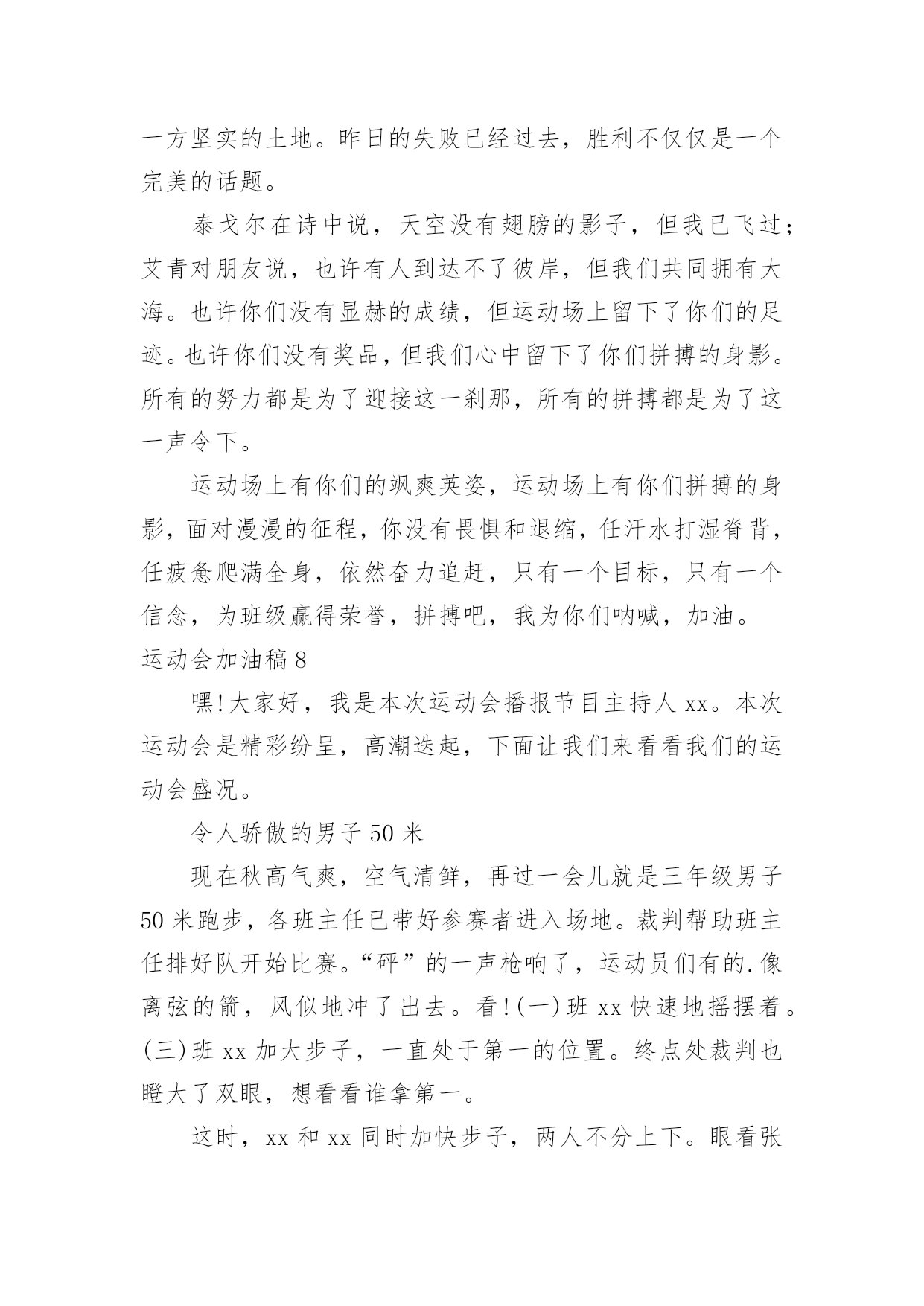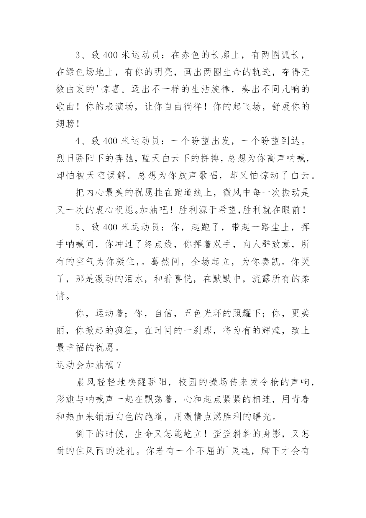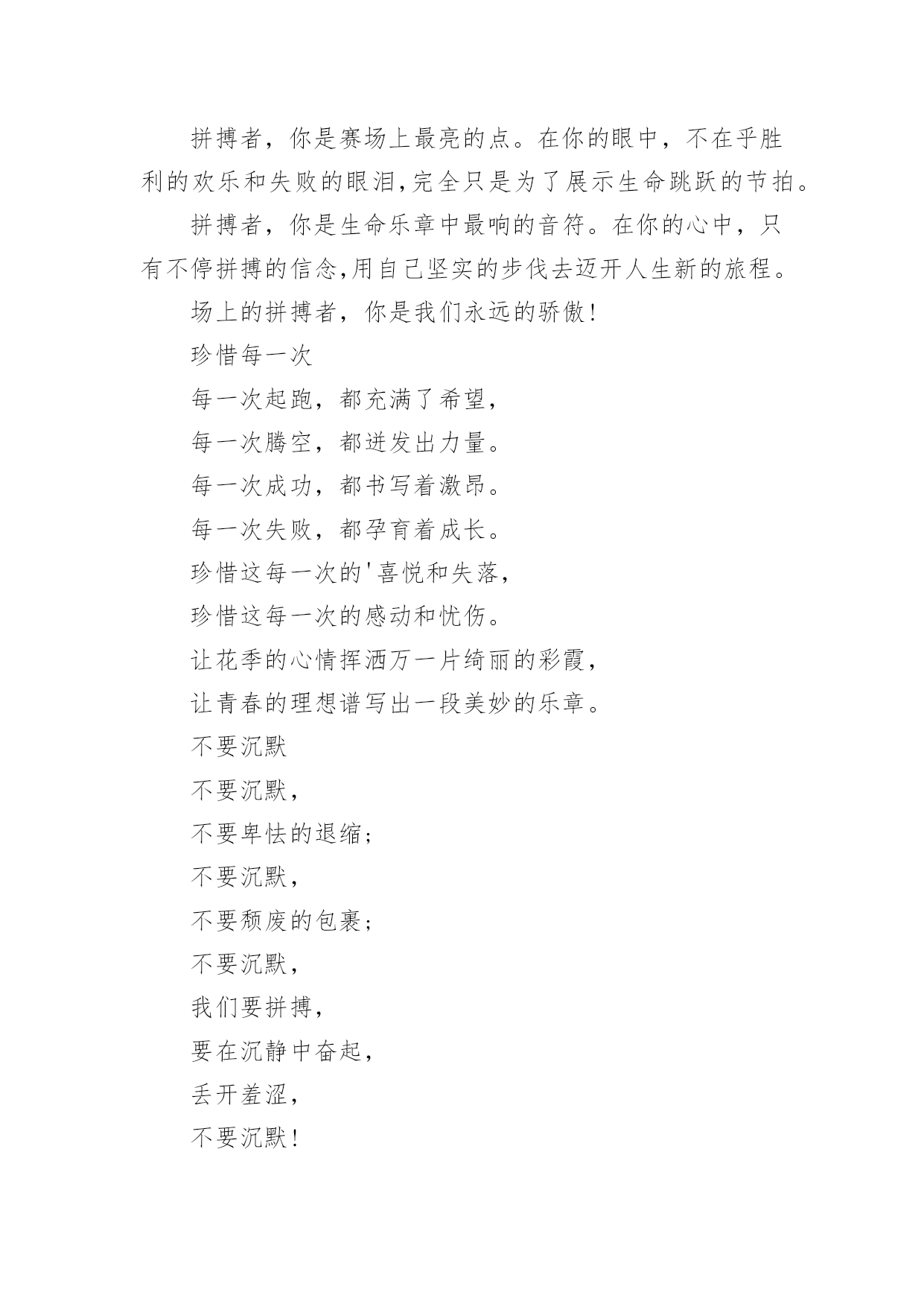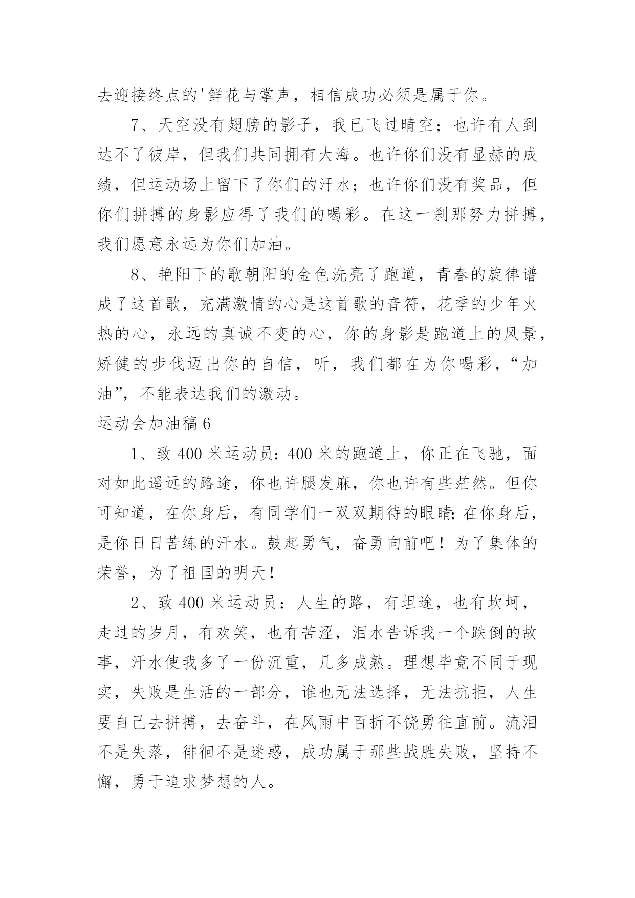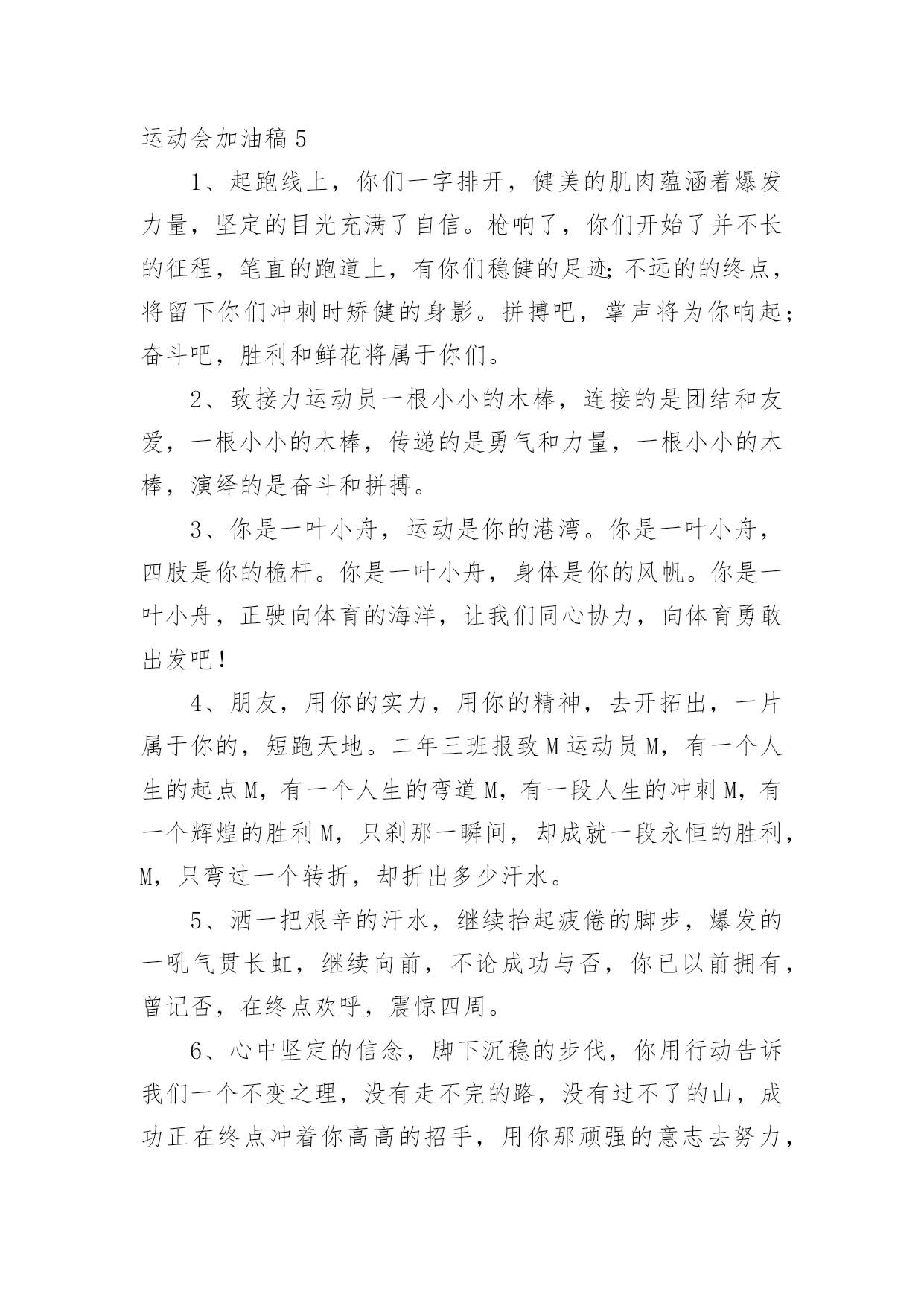 运动会加油稿运动会加油稿在现在的社会生活中,各种加油稿频频出现,加油稿可以给予对方克服困难的勇气和信心。大家知道加油稿怎么写才正确吗?下面是小编帮大家整理的运动会加油稿,希望能够帮助到大家。运动会加油稿11、挑战自我,超越梦想,团结互助,共创佳绩。2、我运动,我健康,此时我欢乐。3、运动起来,勇敢第一。4、夸夫迫日惊华夏,此时平步青云塔黄沙。5、不为鲜花的围绕,不为刹那的荣耀,仅有执着的信念,化作不停的奔跑,心中燃烧着梦想,脚下不停的步伐6、深深的呼吸,等待你的是艰难的100米。7、场上英姿显自豪,脚下步伐在飞奔。你们是骄傲,你们是自豪,跑道因你幻彩,应对红色跑道,你们挥洒自如,不惧一切冲向终点!8、一根小小的木棒,连接的`是团结和友爱一根小小的木棒,传递的是勇气和力量,一根小小的木棒,演绎的是奋斗和拼搏,加油吧!让这激动人心的时刻,一直回荡在我们心中9、时间在流逝,赛道在延伸,成功在你面前展现,心脏在跳动,热血在沸腾,辉煌在你脚下铸就,加油吧,健儿们!运动会加油稿2生活中,我们每天都在尝试尝试中,我们走向成功品味失败,走过心灵的阴雨晴空运动员们,不要放弃尝试假如你成功了这就是下一次尝试的动力假如你失败了就总结经验,吸取教训,继续努力无论失败与否,重要的是你勇于参与的.精神,付出的背后是胜利无论是否成功,我们永远赞美你你们永远是我们的骄傲努力吧,运动员!赞标枪运动员运动会加油稿31.此时此刻,你们就像海浪中海鸥,唯有激流勇进,不畏艰险,奋斗拼搏,方能中流击水,翱翔海上。不管狂风淫雨,不理闪电雷暴,心中始终只有一个目标,飞,飞,飞最后在金*的阳光中,接受掌声的沐浴。2.你们挥舞着充满力量的双臂,看着实心球化成美丽的身影,我着实在心里佩服你们,你们抛出了自我的水平。3.大地属于你,蓝天属于你,在你一跃的瞬间,同时跃出了我们的期望。草儿欣赏你,白云欢迎你,身轻如燕,飞跃蓝天,奥林匹克精神在你身上体现,跳吧,跳出你的自信,跳出你的顶尖,跳出你的胜利山颠。4.青春的脚步,青春的速度,青春的活力,将会在你们的身上尽情体现。迎接自我,挑战自我,战胜自我!我们相信你们必须能行,加油吧,运动员!终点就在眼前!5.你是运动场的心脏,跳动梦想;你是漫长路的精神,激励辉煌;你们是将上下求索的人!风为你加油,云为你助兴,坚定,执着,耐力与希望,在延伸的白色跑道中点点凝聚!力量,信念,拼搏与奋斗,在遥远的终点线上渐渐明亮!时代的强音正在你的脚下踏响。6.看,终点就在眼前,听,同学为你呼喊。鼓起勇气奋力向前,用你的荣誉带给我们希望。7.你们挥舞着充满力量的双臂看着实心球化成美丽的弧线我着实在心里佩服你们你们抛出了自己的水平8.人生的路,有坦途,也有坎坷;做过的岁月,有欢笑,也有苦*,泪水告诉我一个跌倒的故事,汗水使我多了一份沉重,几多成熟。9.胜负只在转瞬之间,不管结果怎么样,你们都走到了最后,你们都是最后的胜利者。10.努力、努力、再努力!加油、加油、再加油!你一定可以像苍龙一样,光耀九州,也可以像孤鹰一样翱翔世界,相信自己,超越自我,胜利永远属于努力的`拼搏的你!11.不祈求太阳的光芒,也不肯用作月亮的伴娘。脚下的路要自己闯,不怕在黑暗中迷失方向;即使生命那么短暂,也无悔无憾,夜空上那道亮线,便是向命运最有力的挑战!12.加油吧,你们的肌肉爆发着力量,你们的目光充满着自信,相信,胜利就在前方。13.你用行动述说着过城的重要,没有无尽的终点,没有无法攀登的险峰,希望载着终点在向你微笑,拼搏吧!经历是一种精彩,迸发你全部的能量,成功是你汗水的写照。14.虽然你们在场上的时间很短暂,但你们的身影依然停留在人们的脑海里,因为你们是赛场上最可爱的人15.不为掌声的注释不为刻意的征服不为失败的痛苦只有辛勤的汗水化作成功的脚步。16.无论是否成功,我们永远赞美你,你们永远是我们的骄傲,54环形的跑道一圈又一圈的坚持,毅力与精神活跃在会场上,湿透的衣衫,满头的大汗,无限追求奋力追赶,我们为你欢呼跳跃,我们为你骄傲。17.也许流星并不少见,但它燃烧的刹那,留给人间最美丽的回忆!也许笑脸并不少见,但胜利的喜悦,总会留给世界精彩的一瞬!是的,那些曾经美妙的东西只有短短的一瞬间,但那却把最辉煌的一刻留给了人间。18.不长不短的距离,需要的是全身心全程投入,自始至终你们都在拼全力此时此刻,你们处在最风光的一刻,无论第几坚持胜利的信心,只要跑下来,你们就是英雄。19.时间在流逝,赛道在延伸,成功在你面前展现心脏的跳动,热血在沸腾,辉煌在你脚下铸就加油吧,健儿们。运动会加油稿4拼搏者拼搏者,你是赛场上最亮的点。在你的眼中,不在乎胜利的欢乐和失败的眼泪,完全只是为了展示生命跳跃的节拍。拼搏者,你是生命乐章中最响的音符。在你的心中,只有不停拼搏的信念,用自己坚实的步伐去迈开人生新的