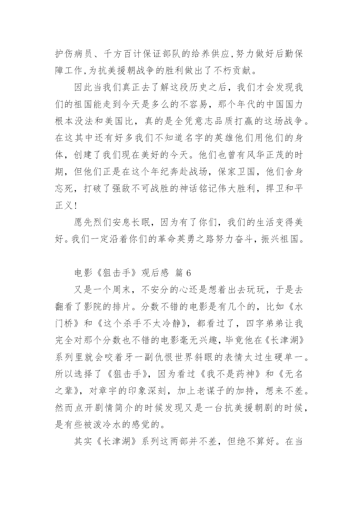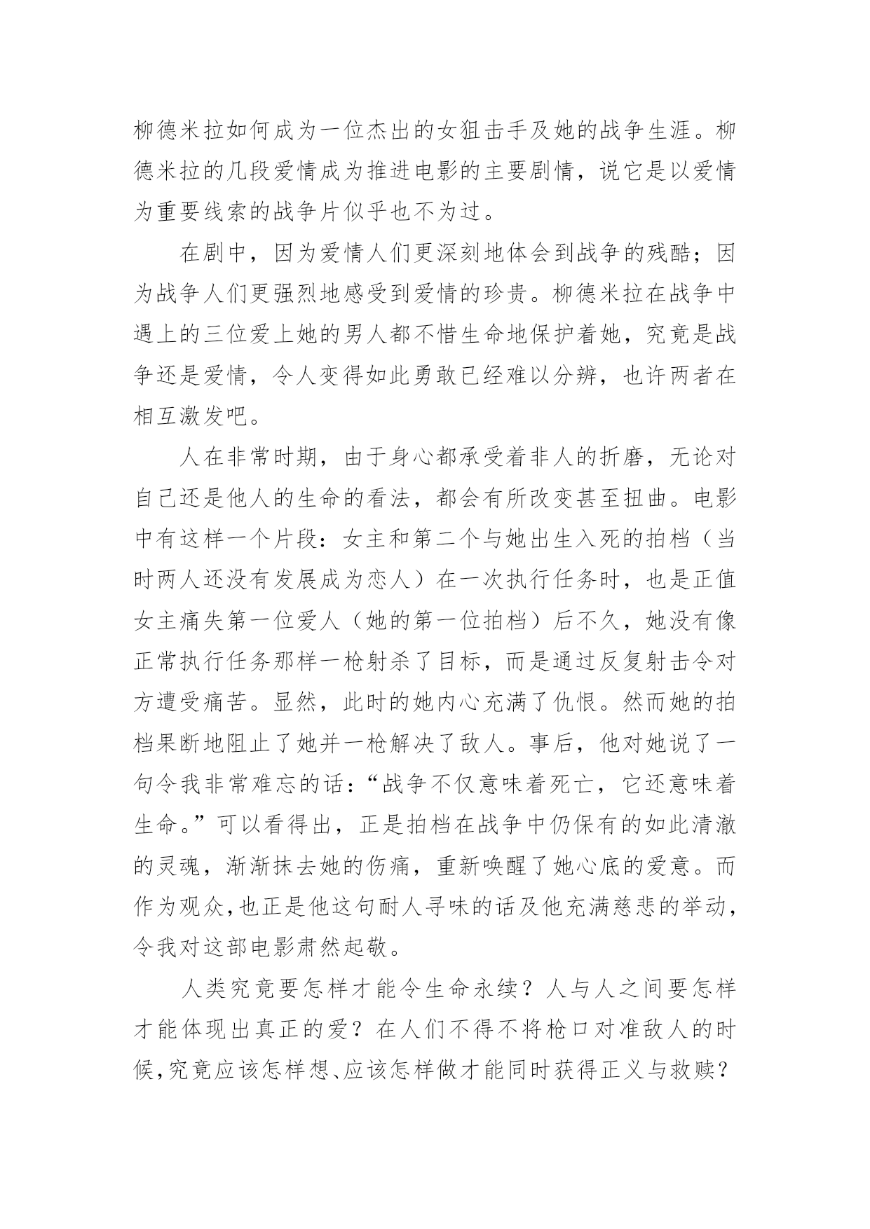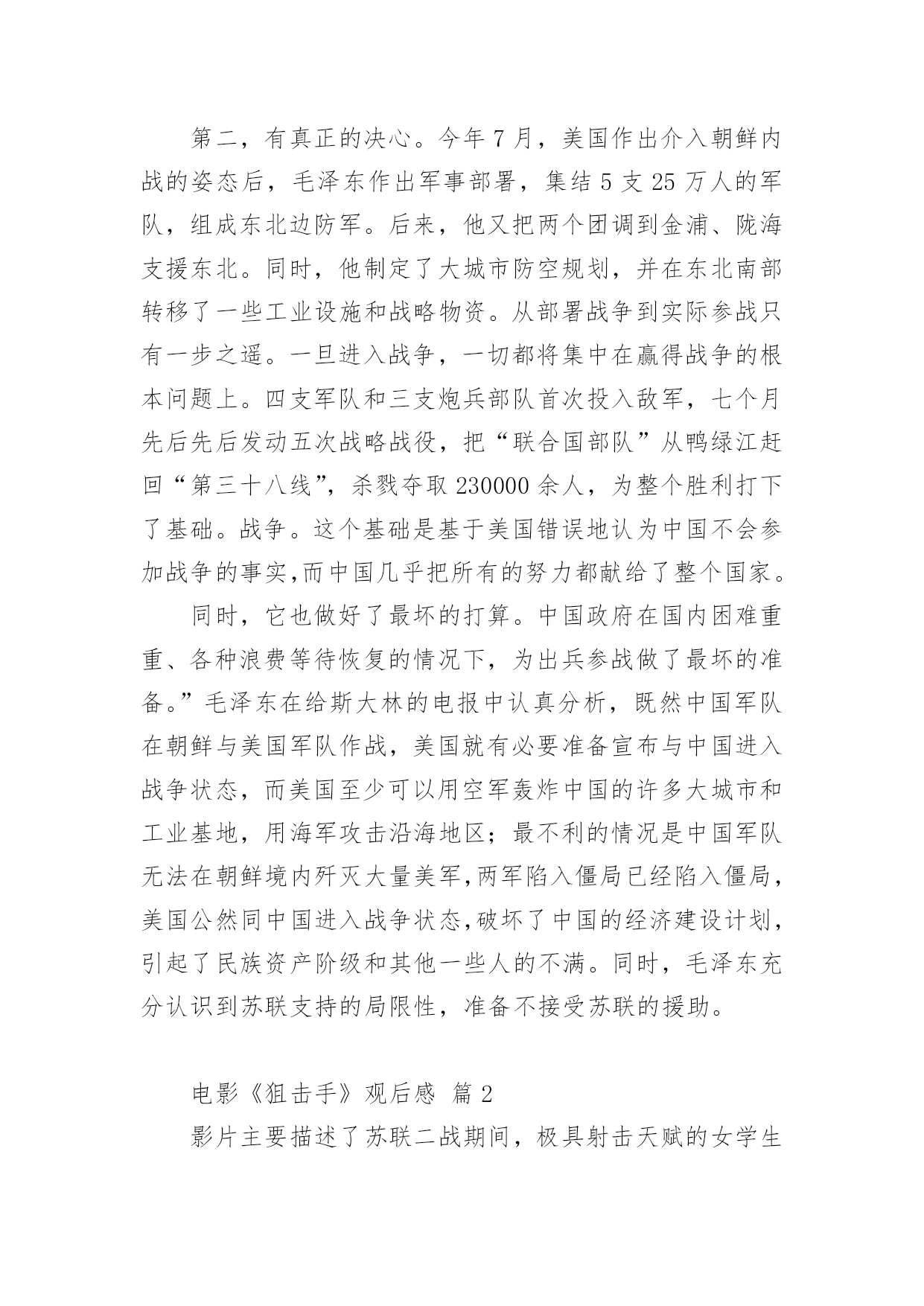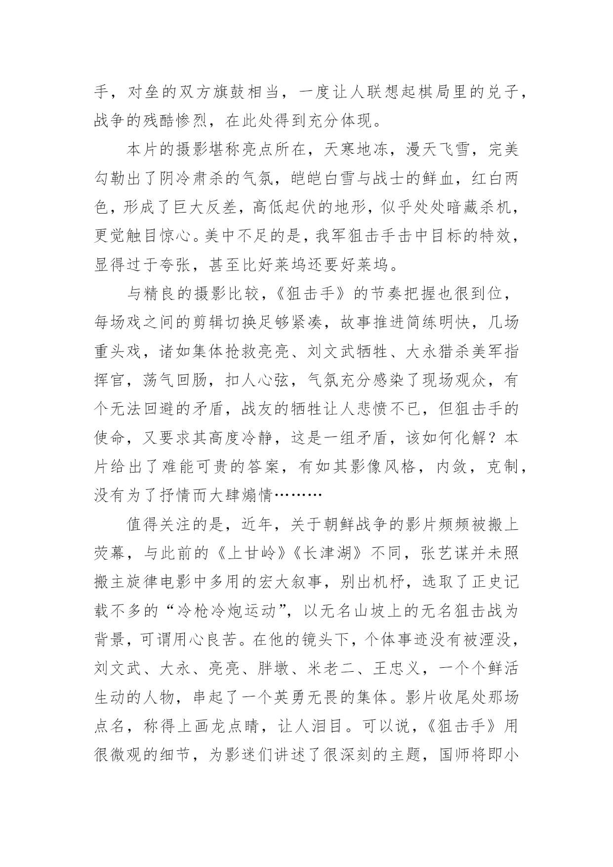 电影《狙击手》观后感2022电影《狙击手》观后感(精选20篇)当品味完一部作品后,相信大家的收获肯定不少吧,是时候抽出时间写写观后感了。观后感你想好怎么写了吗?以下是小编为大家收集的2022电影《狙击手》观后感,供大家参考借鉴,希望可以帮助到有需要的朋友。电影《狙击手》观后感篇1战场不仅是物质的较量,更是意志的较量。战争的血腥杀戮和严重破坏极大地影响了人们的战争意志,使人们产生了怀疑和幻想。即使是战争史上许多著名的将领也不可避免地会衰落。然而,抗美援朝战争并非如此。中国政府一旦作出参战的战略决策,就会表现出钢铁般的战争意志。铁的意志是要有战斗的信心。面对美国的战争威胁,毛泽东客观地分析了美国在军事上的优势和劣势,即“一长三短”:一是强项铁丰度;二是三大弱点:一是前线太长;二是运输路线太远;三是战斗意志不强。针对核讹诈,毛泽东指出:“你打你,我打我,你打原子弹,我打手榴弹,抓住你的弱点,跟着你,最后打败你”,“美国的原子弹不能消灭中国人民。美国的原子弹无论威力有多大,如果扔到中国,都会刺穿地球,炸毁地球。对太阳系来说,这是一个大事件,但对整个宇宙来说,它算不了什么。”正是这种无所畏惧的精神支撑着战争的大局。第二,有真正的决心。今年7月,美国作出介入朝鲜内战的姿态后,毛泽东作出军事部署,集结5支25万人的军队,组成东北边防军。后来,他又把两个团调到金浦、陇海支援东北。同时,他制定了大城市防空规划,并在东北南部转移了一些工业设施和战略物资。从部署战争到实际参战只有一步之遥。一旦进入战争,一切都将集中在赢得战争的根本问题上。四支军队和三支炮兵部队首次投入敌军,七个月先后先后发动五次战略战役,把“联合国部队”从鸭绿江赶回“第三十八线”,杀戮夺取230000余人,为整个胜利打下了基础。战争。这个基础是基于美国错误地认为中国不会参加战争的事实,而中国几乎把所有的努力都献给了整个国家。同时,它也做好了最坏的打算。中国政府在国内困难重重、各种浪费等待恢复的情况下,为出兵参战做了最坏的准备。”毛泽东在给斯大林的电报中认真分析,既然中国军队在朝鲜与美国军队作战,美国就有必要准备宣布与中国进入战争状态,而美国至少可以用空军轰炸中国的许多大城市和工业基地,用海军攻击沿海地区;最不利的情况是中国军队无法在朝鲜境内歼灭大量美军,两军陷入僵局已经陷入僵局,美国公然同中国进入战争状态,破坏了中国的经济建设计划,引起了民族资产阶级和其他一些人的不满。同时,毛泽东充分认识到苏联支持的局限性,准备不接受苏联的援助。电影《狙击手》观后感篇2影片主要描述了苏联二战期间,极具射击天赋的女学生柳德米拉如何成为一位杰出的女狙击手及她的战争生涯。柳德米拉的几段爱情成为推进电影的主要剧情,说它是以爱情为重要线索的战争片似乎也不为过。在剧中,因为爱情人们更深刻地体会到战争的残酷;因为战争人们更强烈地感受到爱情的珍贵。柳德米拉在战争中遇上的三位爱上她的男人都不惜生命地保护着她,究竟是战争还是爱情,令人变得如此勇敢已经难以分辨,也许两者在相互激发吧。人在非常时期,由于身心都承受着非人的折磨,无论对自己还是他人的生命的看法,都会有所改变甚至扭曲。电影中有这样一个片段:女主和第二个与她出生入死的拍档(当时两人还没有发展成为恋人)在一次执行任务时,也是正值女主痛失第一位爱人(她的第一位拍档)后不久,她没有像正常执行任务那样一枪射杀了目标,而是通过反复射击令对方遭受痛苦。显然,此时的她内心充满了仇恨。然而她的拍档果断地阻止了她并一枪解决了敌人。事后,他对她说了一句令我非常难忘的话:“战争不仅意味着死亡,它还意味着生命。”可以看得出,正是拍档在战争中仍保有的如此清澈的灵魂,渐渐抹去她的伤痛,重新唤醒了她心底的爱意。而作为观众,也正是他这句耐人寻味的话及他充满慈悲的举动,令我对这部电影肃然起敬。人类究竟要怎样才能令生命永续?人与人之间要怎样才能体现出真正的爱?在人们不得不将枪口对准敌人的时候,究竟应该怎样想、应该怎样做才能同时获得正义与救赎?影片中这位军人似乎为人们提供了一个很好的思考角度。剧中的他,因为担心自己在战争中也可能像她的第一个拍档那样随时失去生命,而迟迟未向女主表白。他内心对爱情、对爱人的敬重与呵护之情令人动容。柳德米拉是位勇敢、独立、智慧而善良的姑娘,她年纪轻轻便清楚自己的选择,懂得尊重自己、尊重他人。同时也因为战争,选择了适当的放弃、奉献与隐忍。但战争的残忍与狰狞,还是改变了本色的她,令她在他人眼里只是冷血的执行任务的杀手。她的灵魂似乎在战争中被弄丢了,似乎也被那些无情的子弹射杀了,成了一具只会为自己的祖国、为这场战争的胜利摆出英雄姿态的冰冷道具。这无疑是电影对政治的黑暗与战争的无情所作出的相得益彰的揭露。然而,电影以美国总统遗孀请她去白宫做客,并在给予了她充分的同情后而令她渐