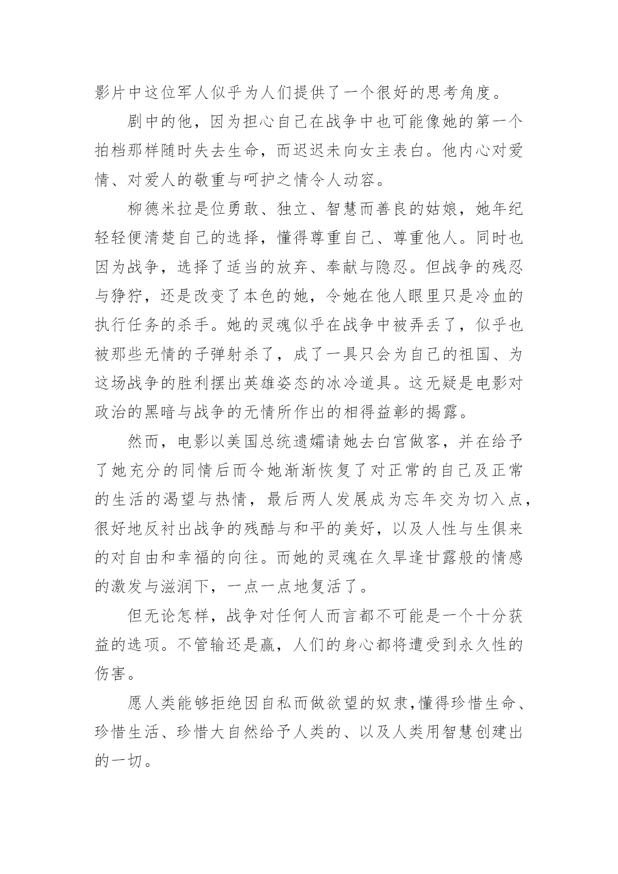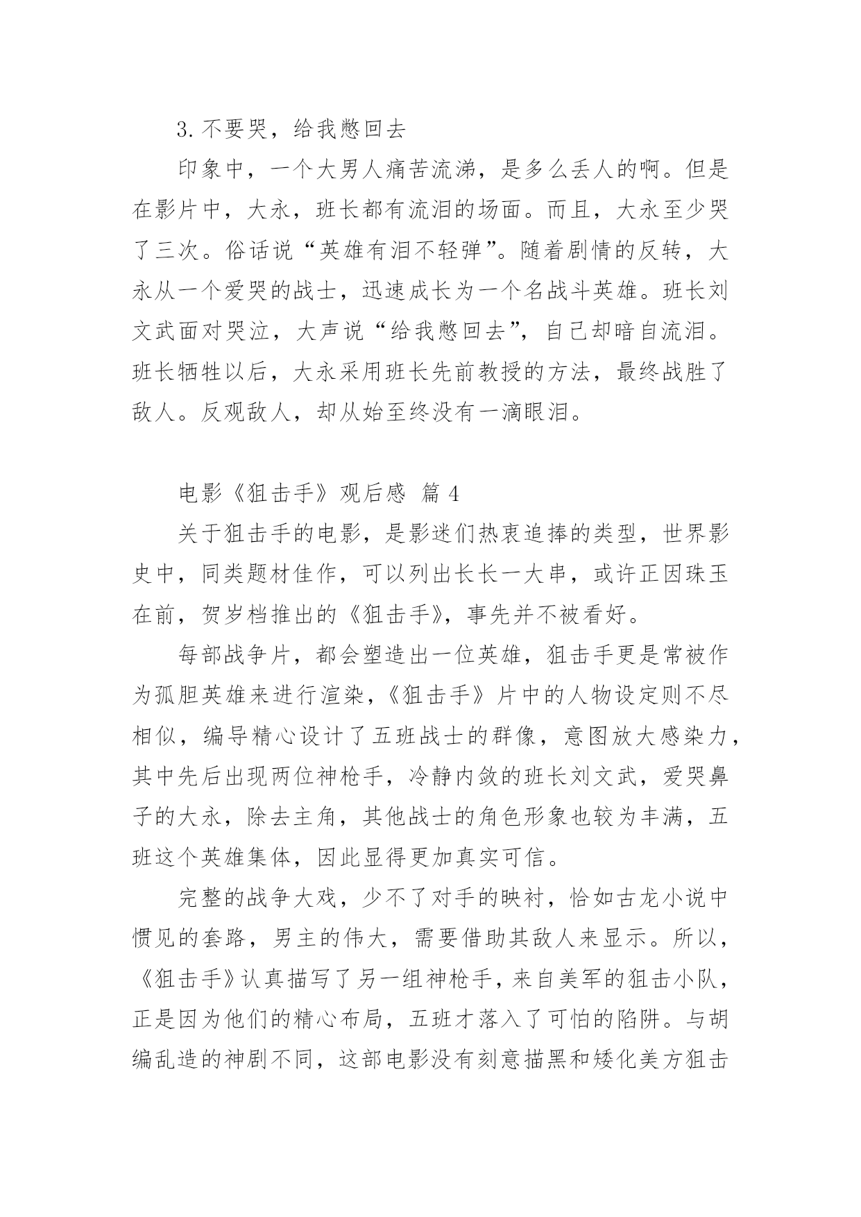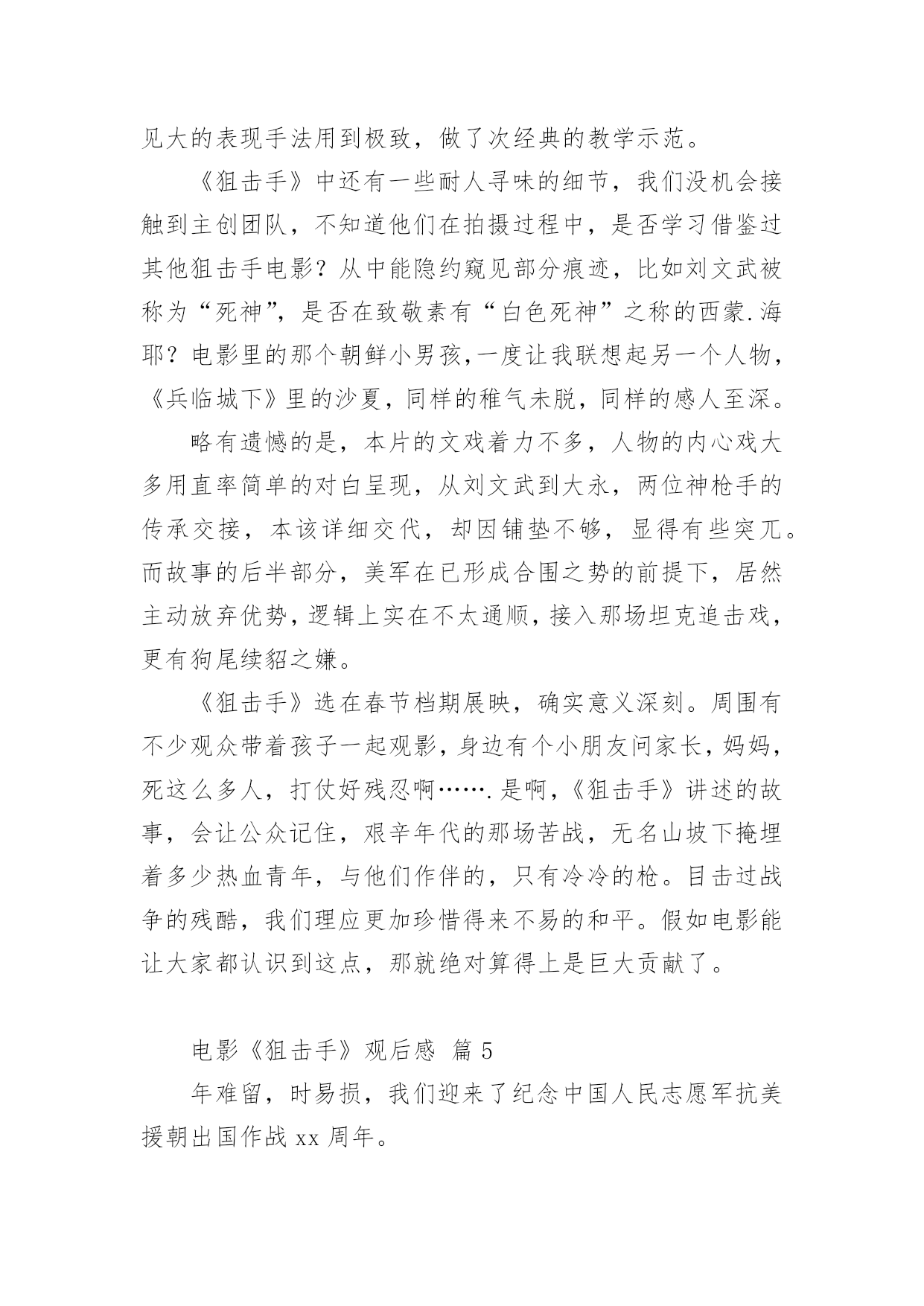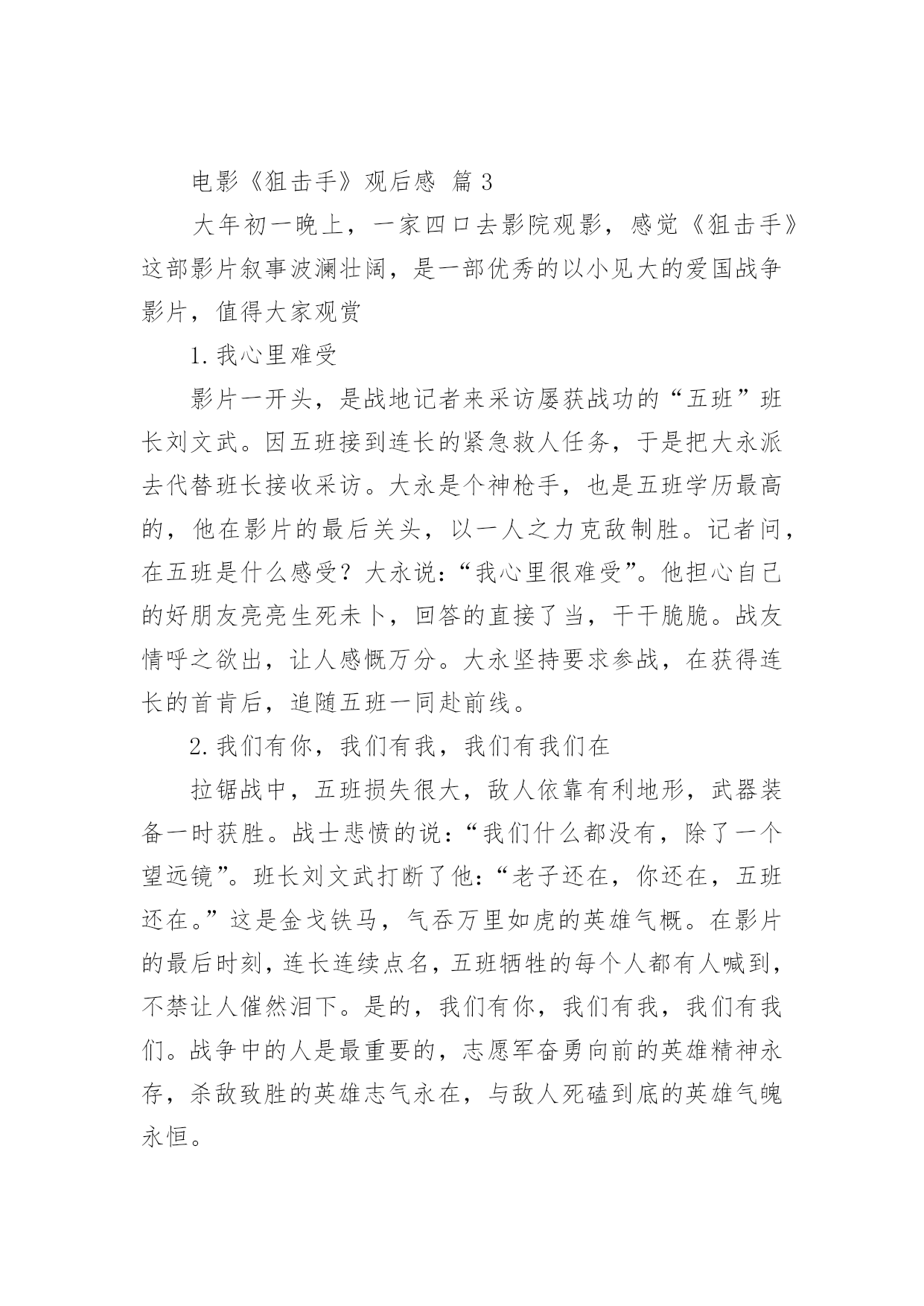 电影《狙击手》观后感2022电影《狙击手》观后感(精选20篇)当品味完一部作品后,相信大家的收获肯定不少吧,是时候抽出时间写写观后感了。观后感你想好怎么写了吗?以下是小编为大家收集的2022电影《狙击手》观后感,供大家参考借鉴,希望可以帮助到有需要的朋友。电影《狙击手》观后感篇1战场不仅是物质的较量,更是意志的较量。战争的血腥杀戮和严重破坏极大地影响了人们的战争意志,使人们产生了怀疑和幻想。即使是战争史上许多著名的将领也不可避免地会衰落。然而,抗美援朝战争并非如此。中国政府一旦作出参战的战略决策,就会表现出钢铁般的战争意志。铁的意志是要有战斗的信心。面对美国的战争威胁,毛泽东客观地分析了美国在军事上的优势和劣势,即“一长三短”:一是强项铁丰度;二是三大弱点:一是前线太长;二是运输路线太远;三是战斗意志不强。针对核讹诈,毛泽东指出:“你打你,我打我,你打原子弹,我打手榴弹,抓住你的弱点,跟着你,最后打败你”,“美国的原子弹不能消灭中国人民。美国的原子弹无论威力有多大,如果扔到中国,都会刺穿地球,炸毁地球。对太阳系来说,这是一个大事件,但对整个宇宙来说,它算不了什么。”正是这种无所畏惧的精神支撑着战争的大局。第二,有真正的决心。今年7月,美国作出介入朝鲜内战的姿态后,毛泽东作出军事部署,集结5支25万人的军队,组成东北边防军。后来,他又把两个团调到金浦、陇海支援东北。同时,他制定了大城市防空规划,并在东北南部转移了一些工业设施和战略物资。从部署战争到实际参战只有一步之遥。一旦进入战争,一切都将集中在赢得战争的根本问题上。四支军队和三支炮兵部队首次投入敌军,七个月先后先后发动五次战略战役,把“联合国部队”从鸭绿江赶回“第三十八线”,杀戮夺取230000余人,为整个胜利打下了基础。战争。这个基础是基于美国错误地认为中国不会参加战争的事实,而中国几乎把所有的努力都献给了整个国家。同时,它也做好了最坏的打算。中国政府在国内困难重重、各种浪费等待恢复的情况下,为出兵参战做了最坏的准备。”毛泽东在给斯大林的电报中认真分析,既然中国军队在朝鲜与美国军队作战,美国就有必要准备宣布与中国进入战争状态,而美国至少可以用空军轰炸中国的许多大城市和工业基地,用海军攻击沿海地区;最不利的情况是中国军队无法在朝鲜境内歼灭大量美军,两军陷入僵局已经陷入僵局,美国公然同中国进入战争状态,破坏了中国的经济建设计划,引起了民族资产阶级和其他一些人的不满。同时,毛泽东充分认识到苏联支持的局限性,准备不接受苏联的援助。电影《狙击手》观后感篇2影片主要描述了苏联二战期间,极具射击天赋的女学生柳德米拉如何成为一位杰出的女狙击手及她的战争生涯。柳德米拉的几段爱情成为推进电影的主要剧情,说它是以爱情为重要线索的战争片似乎也不为过。在剧中,因为爱情人们更深刻地体会到战争的残酷;因为战争人们更强烈地感受到爱情的珍贵。柳德米拉在战争中遇上的三位爱上她的男人都不惜生命地保护着她,究竟是战争还是爱情,令人变得如此勇敢已经难以分辨,也许两者在相互激发吧。人在非常时期,由于身心都承受着非人的折磨,无论对自己还是他人的生命的看法,都会有所改变甚至扭曲。电影中有这样一个片段:女主和第二个与她出生入死的拍档(当时两人还没有发展成为恋人)在一次执行任务时,也是正值女主痛失第一位爱人(她的第一位拍档)后不久,她没有像正常执行任务那样一枪射杀了目标,而是通过反复射击令对方遭受痛苦。显然,此时的她内心充满了仇恨。然而她的拍档果断地阻止了她并一枪解决了敌人。事后,他对她说了一句令我非常难忘的话:“战争不仅意味着死亡,它还意味着生命。”可以看得出,正是拍档在战争中仍保有的如此清澈的灵魂,渐渐抹去她的伤痛,重新唤醒了她心底的爱意。而作为观众,也正是他这句耐人寻味的话及他充满慈悲的举动,令我对这部电影肃然起敬。人类究竟要怎样才能令生命永续?人与人之间要怎样才能体现出真正的爱?在人们不得不将枪口对准敌人的时候,究竟应该怎样想、应该怎样做才能同时获得正义与救赎?影片中这位军人似乎为人们提供了一个很好的思考角度。剧中的他,因为担心自己在战争中也可能像她的第一个拍档那样随时失去生命,而迟迟未向女主表白。他内心对爱情、对爱人的敬重与呵护之情令人动容。柳德米拉是位勇敢、独立、智慧而善良的姑娘,她年纪轻轻便清楚自己的选择,懂得尊重自己、尊重他人。同时也因为战争,选择了适当的放弃、奉献与隐忍。但战争的残忍与狰狞,还是改变了本色的她,令她在他人眼里只是冷血的执行任务的杀手。她的灵魂似乎在战争中被弄丢了,似乎也被那些无情的子弹射杀了,成了一具只会为自己的祖国、为这场战争的胜利摆出英雄姿态的冰冷道具。这无疑是电影对政治的黑暗与战争的无情所作出的相得益彰的揭露。然而,电影以美国总统遗孀请她去白宫做客,并在给予了她充分的同情后而令她渐