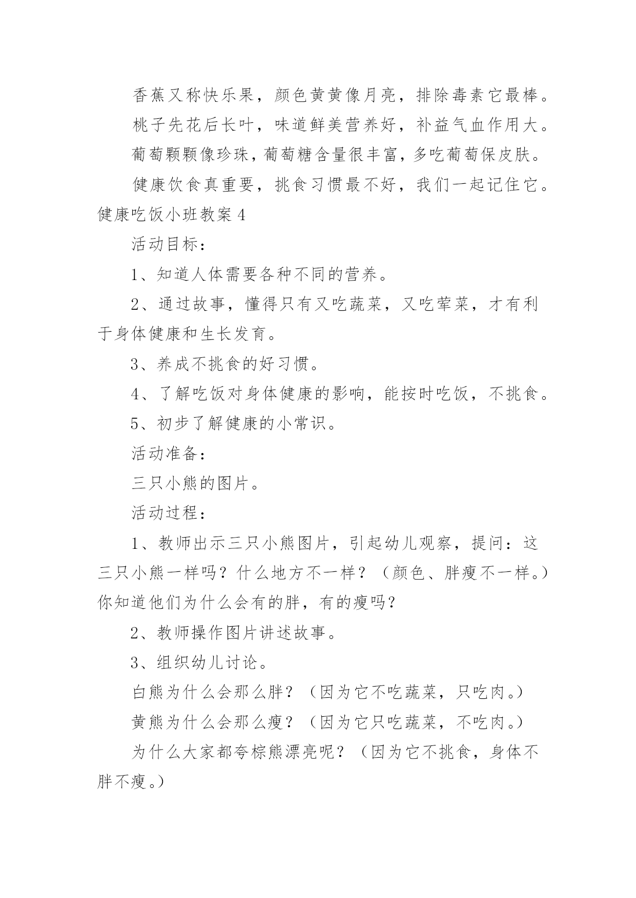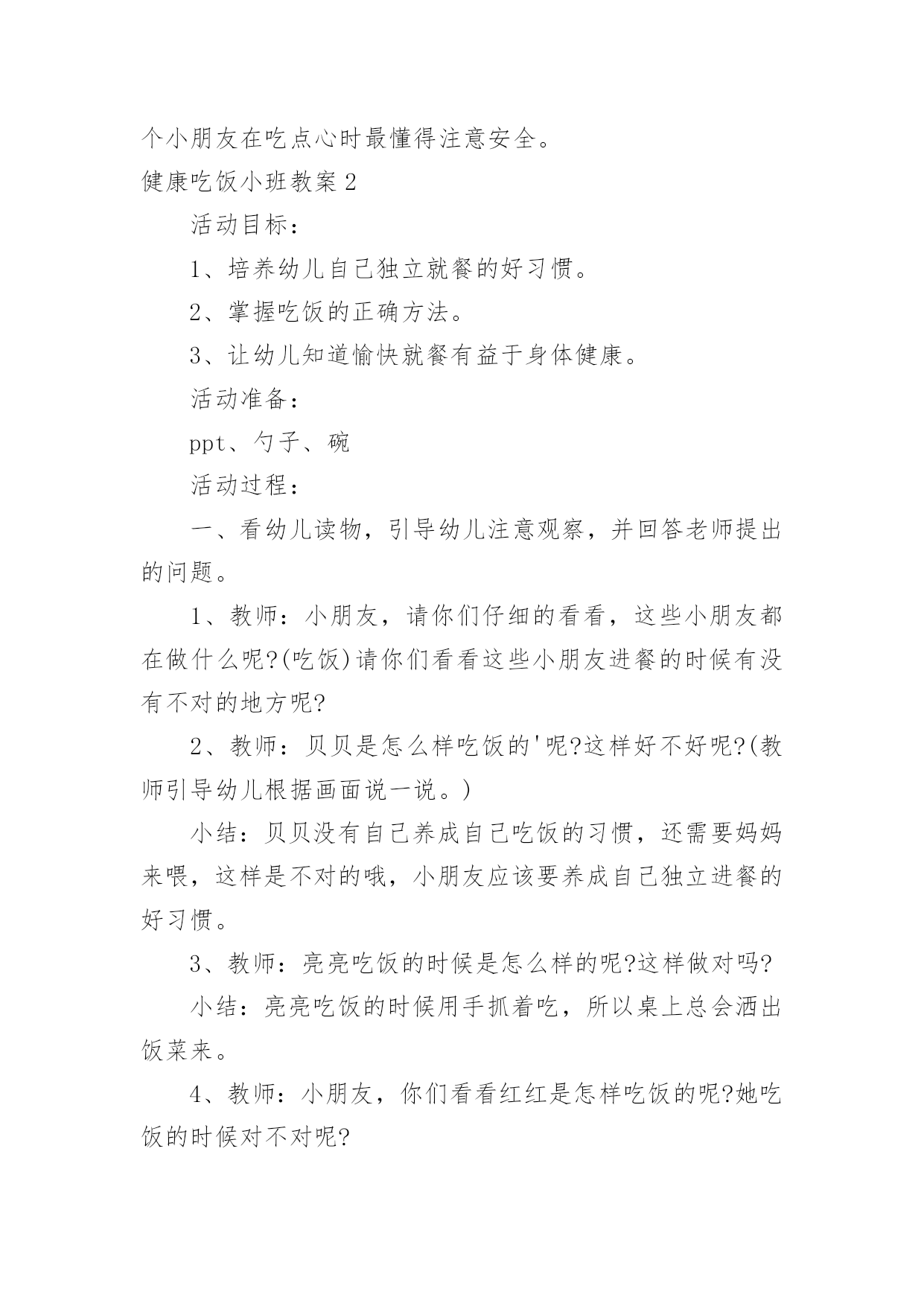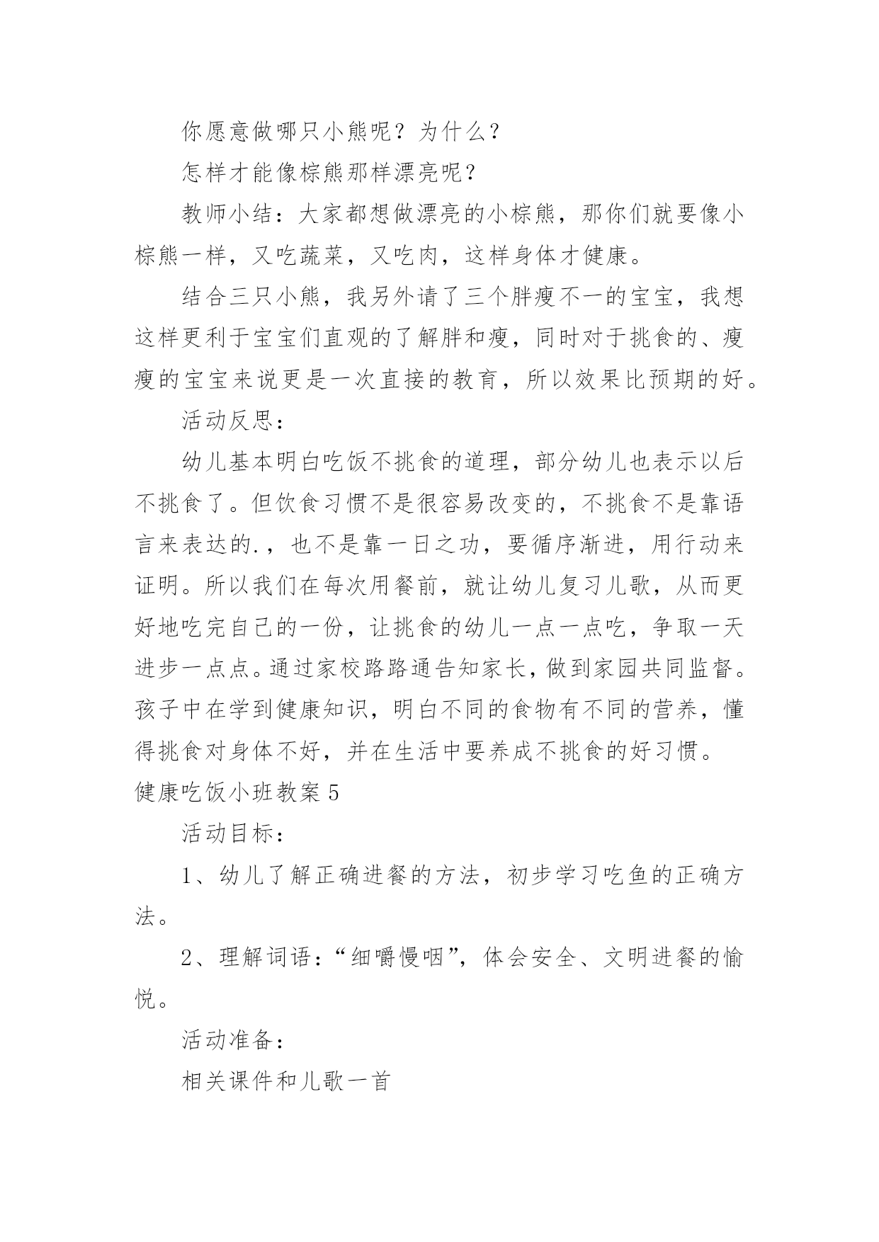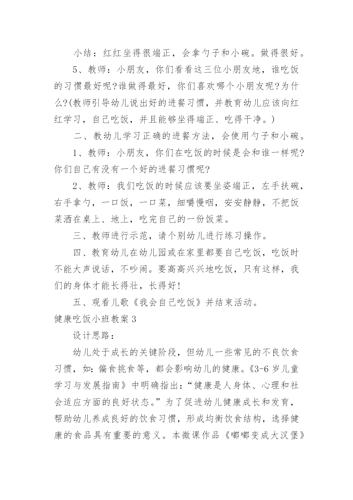 健康吃饭小班教案健康吃饭小班教案在教学工作者实际的教学活动中,就不得不需要编写教案,编写教案有利于我们科学、合理地支配课堂时间。那么教案应该怎么写才合适呢?以下是小编精心整理的健康吃饭小班教案,欢迎大家分享。健康吃饭小班教案1活动目标:1.通过谈话及观看情境,了解进餐过程中的安全注意事项。2.能在日常生活中,针对部分食品知道正确的饮用方法及注意事项。3.在学会安全进餐的同时,有自我保护的安全意识。活动准备:物品准备:课件PPT,汤锅,进餐物品经验准备:有食用果冻、糖豆豆、棒棒糖、口香糖、花生等的经验活动过程:1.谈话导入活动。教师:(1)小朋友们喜欢在幼儿园里吃饭吗?在幼儿园吃饭和在家里吃饭有什么不一样呢?(2)在幼儿园里吃饭要注意些什么呢?(幼儿自由讲述自己知道的注意事项)教师总结:在幼儿园进餐中,注意远离餐桶,注意不烫伤自己。进餐时,不碰别人不东张西望。细嚼慢咽,防止食物吸入气管。2.幼儿观看常见零食,了解吃部分特殊零食过程中的安全注意事项。(1)教育引导幼儿了解食用棒棒糖时,应注意哪些注意事项;(2)教师引导幼儿了解食用口香糖时,应注意的安全事项;(3)教师引导幼儿了解食用口香糖时,应注意的`安全事项;3.观看幼儿进餐的挂图,请幼儿对图中的行为进行判断,进一步巩固进餐的安全知识。教师:(1)这里有一些小朋友,他们在吃饭。我们来看看,谁做得对,谁做得不对,为什么?(2)你知道吃饭的时候还要注意些什么吗?什么事会发生危险,是不能做的?4.组织幼儿吃点心,鼓励幼儿应用所获得的安全知识。教师:老师给小朋友准备了好吃的点心,比一比看哪一个小朋友在吃点心时最懂得注意安全。健康吃饭小班教案2活动目标:1、培养幼儿自己独立就餐的好习惯。2、掌握吃饭的正确方法。3、让幼儿知道愉快就餐有益于身体健康。活动准备:ppt、勺子、碗活动过程:一、看幼儿读物,引导幼儿注意观察,并回答老师提出的问题。1、教师:小朋友,请你们仔细的看看,这些小朋友都在做什么呢?(吃饭)请你们看看这些小朋友进餐的时候有没有不对的地方呢?2、教师:贝贝是怎么样吃饭的'呢?这样好不好呢?(教师引导幼儿根据画面说一说。)小结:贝贝没有自己养成自己吃饭的习惯,还需要妈妈来喂,这样是不对的哦,小朋友应该要养成自己独立进餐的好习惯。3、教师:亮亮吃饭的时候是怎么样的呢?这样做对吗?小结:亮亮吃饭的时候用手抓着吃,所以桌上总会洒出饭菜来。4、教师:小朋友,你们看看红红是怎样吃饭的呢?她吃饭的时候对不对呢?小结:红红坐得很端正,会拿勺子和小碗。做得很好。5、教师:小朋友,你们看看这三位小朋友地,谁吃饭的习惯最好呢?谁做得最好,你们喜欢哪个小朋友呢?为什么?(教师引导幼儿说出好的进餐习惯,并教育幼儿应该向红红学习,自己吃饭,并且能够坐得端正、吃得干净。)二、教幼儿学习正确的进餐方法,会使用勺子和小碗。1、教师:小朋友,你们在吃饭的时候是会和谁一样呢?你们自己有没有一个好的进餐习惯呢?2、教师:我们吃饭的时候应该要坐姿端正,左手扶碗,右手拿勺,一口饭,一口菜,细嚼慢咽,安安静静,不把饭菜洒在桌上、地上,吃完自己的一份饭菜。三、教师进行示范,请个别幼儿进行练习操作。四、教育幼儿在幼儿园或在家里都要自己吃饭,吃饭时不能大声说话,不吵闹。要高高兴兴地吃饭,只有这样,我们的身体才能长得壮,长得好!五、观看儿歌《我会自己吃饭》并结束活动。健康吃饭小班教案3设计思路:幼儿处于成长的关键阶段,但幼儿一些常见的不良饮食习惯,如:偏食挑食等,都会影响幼儿的健康。《3-6岁儿童学习与发展指南》中明确指出:“健康是人身体、心理和社会适应方面的良好状态。”为了促进幼儿健康成长和发育,帮助幼儿养成良好的饮食习惯,形成均衡饮食结构,选择健康的食品具有重要的意义。本微课作品《嘟嘟变成大汉堡》旨在通过主人公嘟嘟体型变化的故事让幼儿认识到健康饮食的重要性,通过让幼儿参与“帮嘟嘟点餐”的游戏活动,准确区分健康食品和垃圾食品,并能够联系生活实际,在日后的饮食中做到选择健康食品,养成不挑食不偏食的健康饮食习惯。活动目标:1、认知目标:明白健康的食物会对身体有益,垃圾食品会对身体有伤害。2、技能目标:能够区分健康食品和垃圾食品。3、情感目标:增强食品安全意识,有初步的食品安全自我保护能力,养成良好的饮食卫生习惯。4、知道人体需要各种不同的营养。5、初步了解健康的小常识。活动准备与重难点活动准备:健康食品与垃圾食品图片,“嘟嘟变成大汉堡”故事PPT,纸盘,食品教具活动重点:明白健康的食物会对身体有益,垃圾食品会对身体有伤害。活动难点:让幼儿不再选择吃垃圾食物。活动过程:(一)导入:图片导入1.出示图片,引发幼儿对区分食品类别的兴趣健康食品——蔬菜、水果。垃圾食品——油炸食品,加工的肉类食品。2.教师提问:“小朋友们都喜欢吃这里的