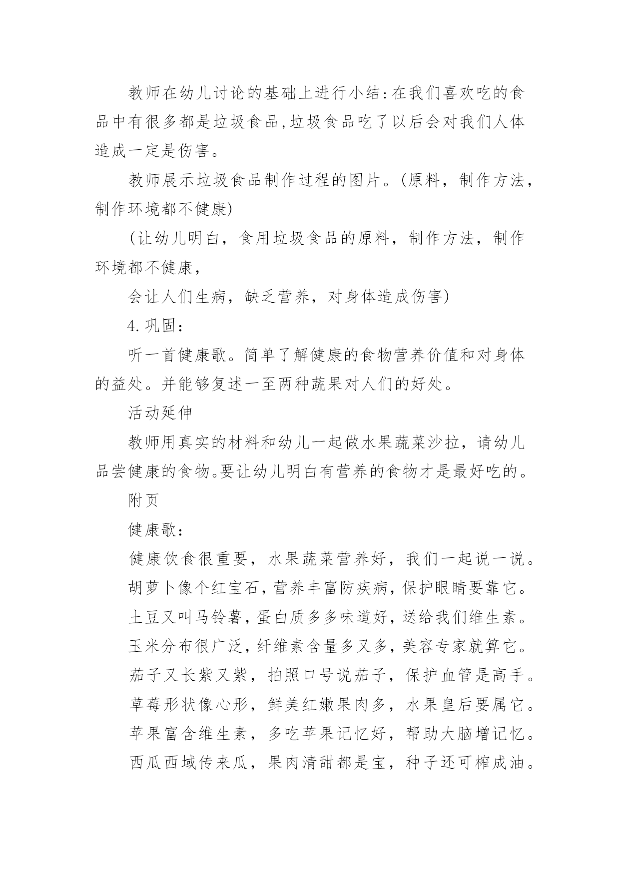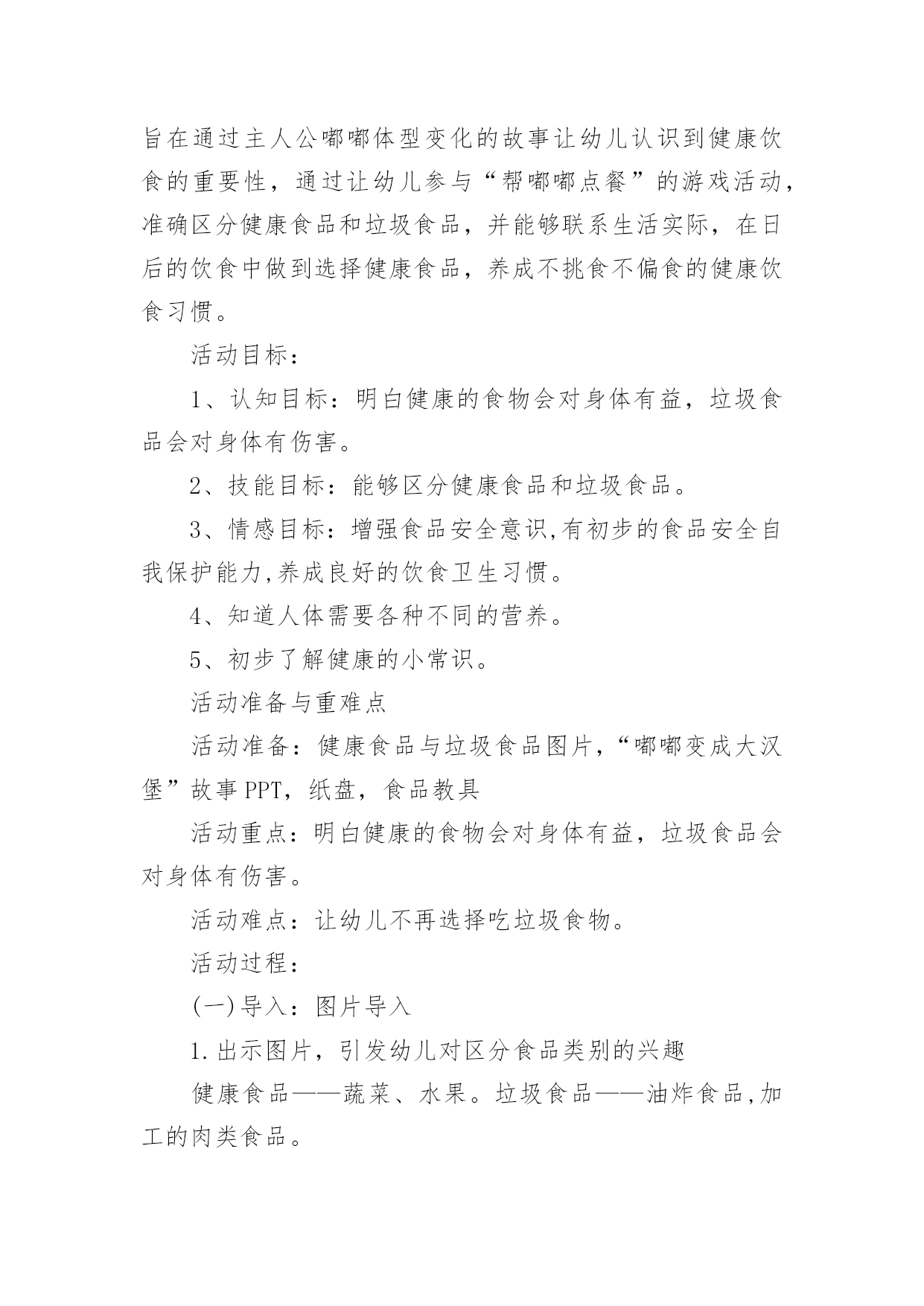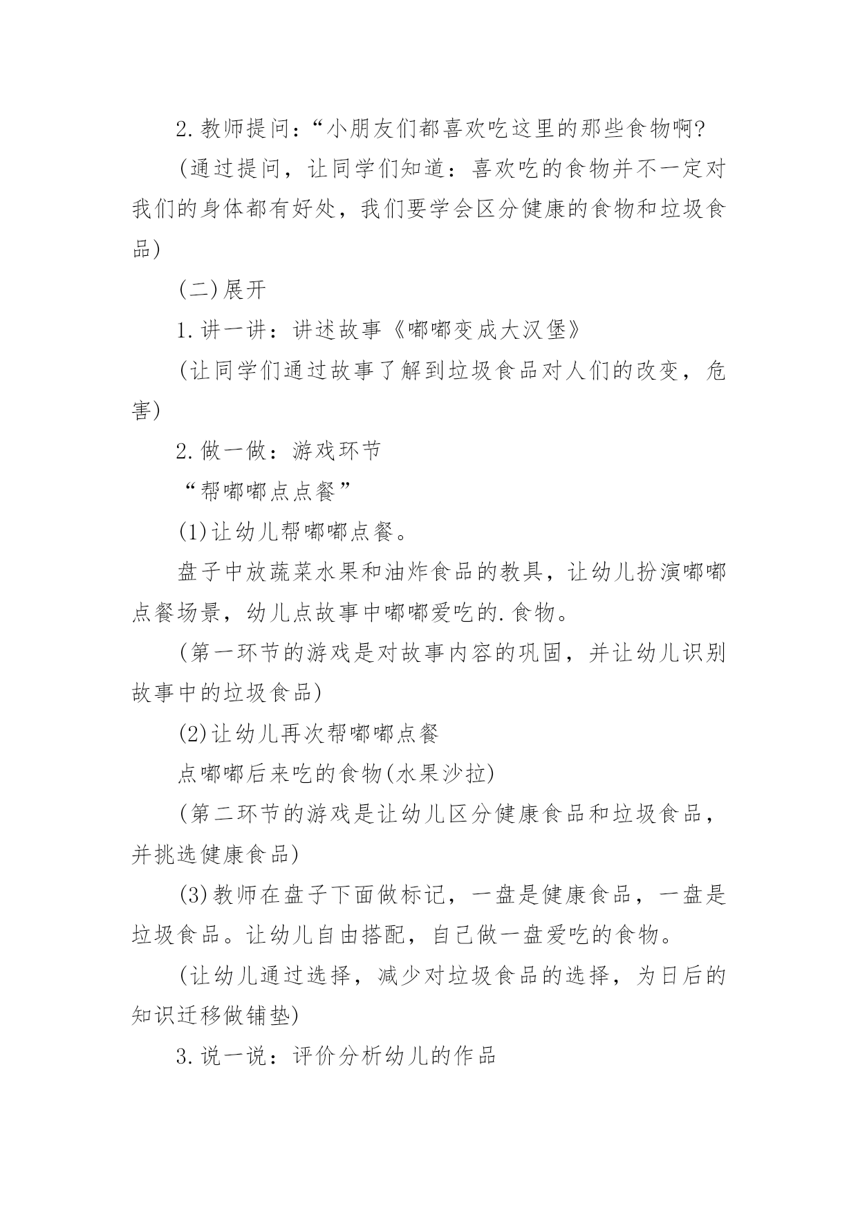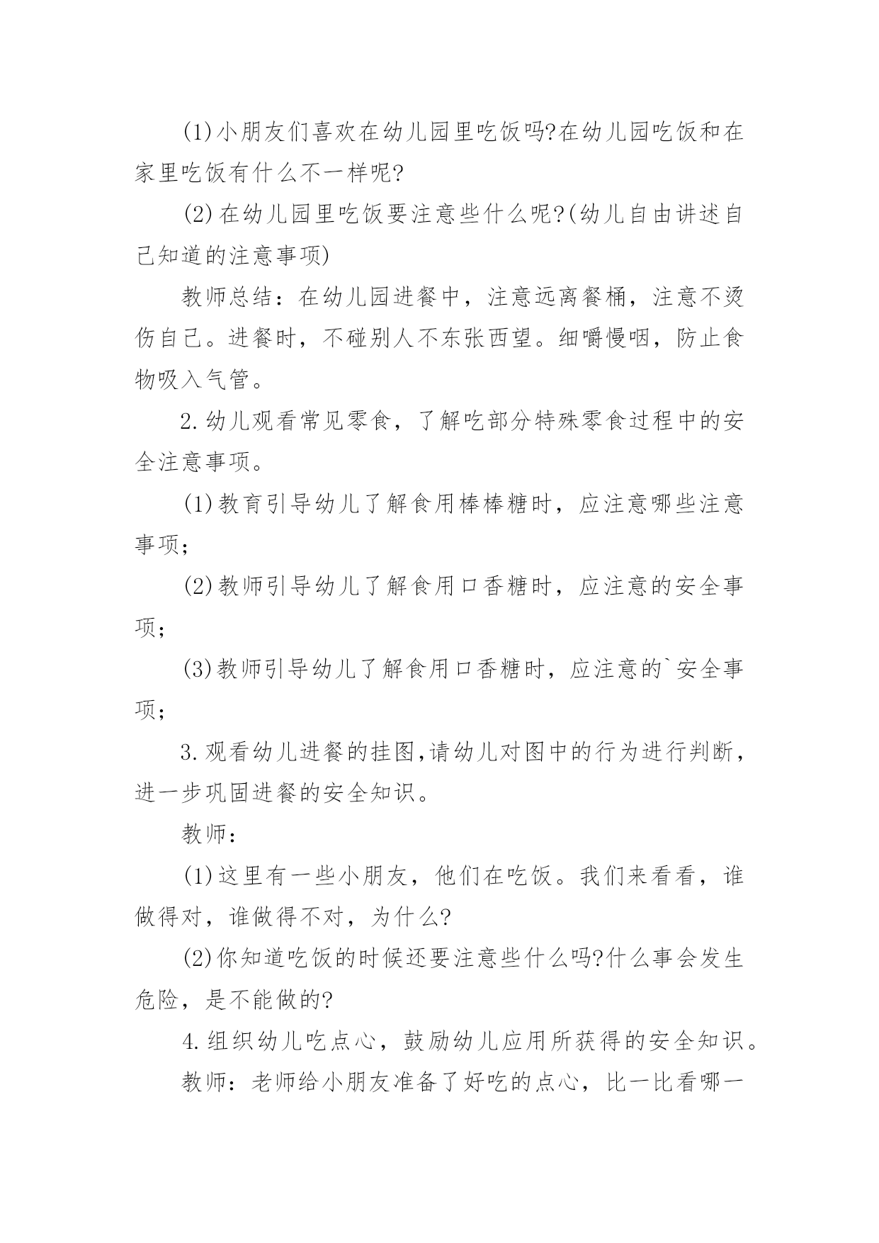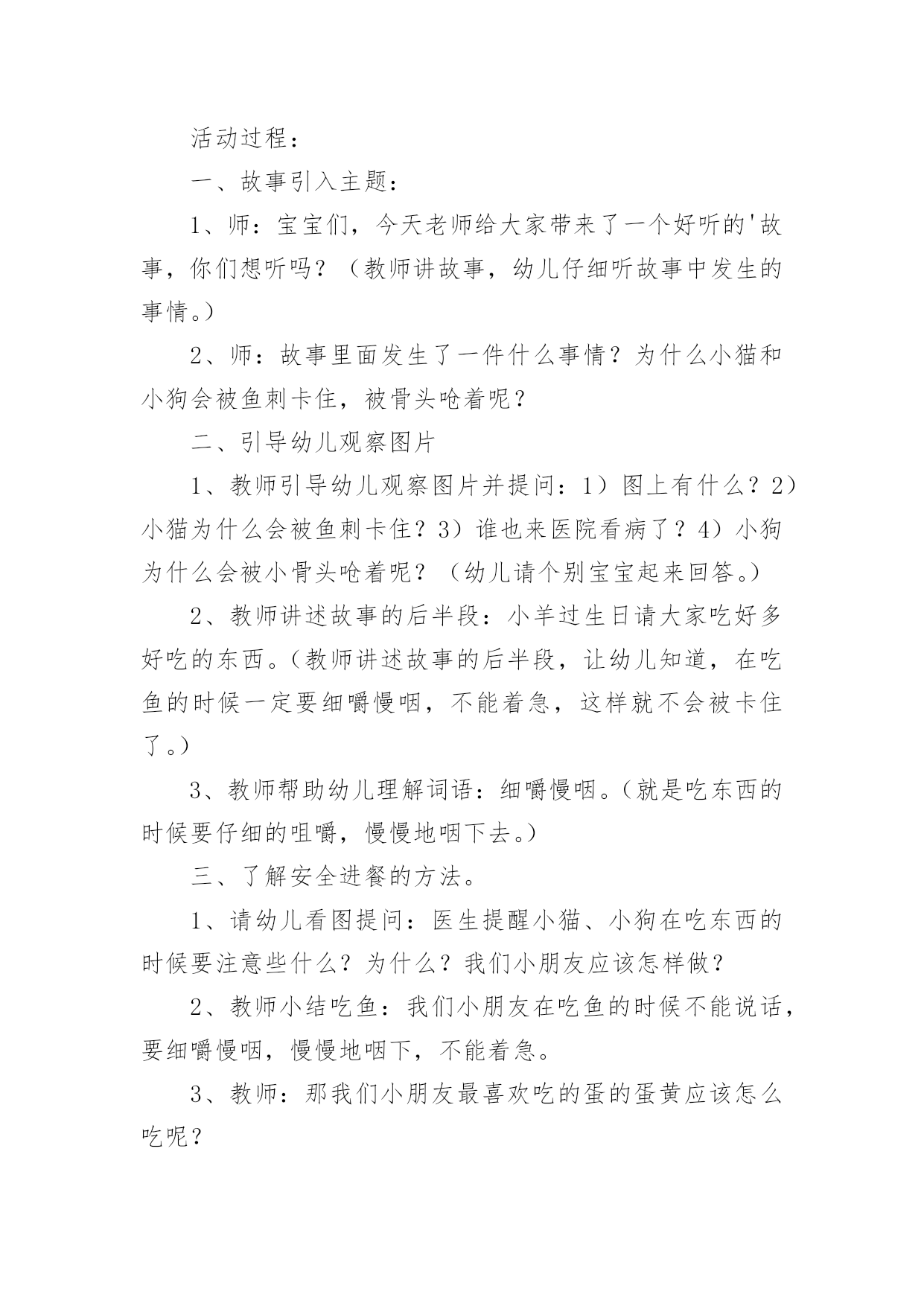 健康吃饭小班教案健康吃饭小班教案在教学工作者实际的教学活动中,就不得不需要编写教案,编写教案有利于我们科学、合理地支配课堂时间。那么教案应该怎么写才合适呢?以下是小编精心整理的健康吃饭小班教案,欢迎大家分享。健康吃饭小班教案1活动目标:1.通过谈话及观看情境,了解进餐过程中的安全注意事项。2.能在日常生活中,针对部分食品知道正确的饮用方法及注意事项。3.在学会安全进餐的同时,有自我保护的安全意识。活动准备:物品准备:课件PPT,汤锅,进餐物品经验准备:有食用果冻、糖豆豆、棒棒糖、口香糖、花生等的经验活动过程:1.谈话导入活动。教师:(1)小朋友们喜欢在幼儿园里吃饭吗?在幼儿园吃饭和在家里吃饭有什么不一样呢?(2)在幼儿园里吃饭要注意些什么呢?(幼儿自由讲述自己知道的注意事项)教师总结:在幼儿园进餐中,注意远离餐桶,注意不烫伤自己。进餐时,不碰别人不东张西望。细嚼慢咽,防止食物吸入气管。2.幼儿观看常见零食,了解吃部分特殊零食过程中的安全注意事项。(1)教育引导幼儿了解食用棒棒糖时,应注意哪些注意事项;(2)教师引导幼儿了解食用口香糖时,应注意的安全事项;(3)教师引导幼儿了解食用口香糖时,应注意的`安全事项;3.观看幼儿进餐的挂图,请幼儿对图中的行为进行判断,进一步巩固进餐的安全知识。教师:(1)这里有一些小朋友,他们在吃饭。我们来看看,谁做得对,谁做得不对,为什么?(2)你知道吃饭的时候还要注意些什么吗?什么事会发生危险,是不能做的?4.组织幼儿吃点心,鼓励幼儿应用所获得的安全知识。教师:老师给小朋友准备了好吃的点心,比一比看哪一个小朋友在吃点心时最懂得注意安全。健康吃饭小班教案2活动目标:1、培养幼儿自己独立就餐的好习惯。2、掌握吃饭的正确方法。3、让幼儿知道愉快就餐有益于身体健康。活动准备:ppt、勺子、碗活动过程:一、看幼儿读物,引导幼儿注意观察,并回答老师提出的问题。1、教师:小朋友,请你们仔细的看看,这些小朋友都在做什么呢?(吃饭)请你们看看这些小朋友进餐的时候有没有不对的地方呢?2、教师:贝贝是怎么样吃饭的'呢?这样好不好呢?(教师引导幼儿根据画面说一说。)小结:贝贝没有自己养成自己吃饭的习惯,还需要妈妈来喂,这样是不对的哦,小朋友应该要养成自己独立进餐的好习惯。3、教师:亮亮吃饭的时候是怎么样的呢?这样做对吗?小结:亮亮吃饭的时候用手抓着吃,所以桌上总会洒出饭菜来。4、教师:小朋友,你们看看红红是怎样吃饭的呢?她吃饭的时候对不对呢?小结:红红坐得很端正,会拿勺子和小碗。做得很好。5、教师:小朋友,你们看看这三位小朋友地,谁吃饭的习惯最好呢?谁做得最好,你们喜欢哪个小朋友呢?为什么?(教师引导幼儿说出好的进餐习惯,并教育幼儿应该向红红学习,自己吃饭,并且能够坐得端正、吃得干净。)二、教幼儿学习正确的进餐方法,会使用勺子和小碗。1、教师:小朋友,你们在吃饭的时候是会和谁一样呢?你们自己有没有一个好的进餐习惯呢?2、教师:我们吃饭的时候应该要坐姿端正,左手扶碗,右手拿勺,一口饭,一口菜,细嚼慢咽,安安静静,不把饭菜洒在桌上、地上,吃完自己的一份饭菜。三、教师进行示范,请个别幼儿进行练习操作。四、教育幼儿在幼儿园或在家里都要自己吃饭,吃饭时不能大声说话,不吵闹。要高高兴兴地吃饭,只有这样,我们的身体才能长得壮,长得好!五、观看儿歌《我会自己吃饭》并结束活动。健康吃饭小班教案3设计思路:幼儿处于成长的关键阶段,但幼儿一些常见的不良饮食习惯,如:偏食挑食等,都会影响幼儿的健康。《3-6岁儿童学习与发展指南》中明确指出:“健康是人身体、心理和社会适应方面的良好状态。”为了促进幼儿健康成长和发育,帮助幼儿养成良好的饮食习惯,形成均衡饮食结构,选择健康的食品具有重要的意义。本微课作品《嘟嘟变成大汉堡》旨在通过主人公嘟嘟体型变化的故事让幼儿认识到健康饮食的重要性,通过让幼儿参与“帮嘟嘟点餐”的游戏活动,准确区分健康食品和垃圾食品,并能够联系生活实际,在日后的饮食中做到选择健康食品,养成不挑食不偏食的健康饮食习惯。活动目标:1、认知目标:明白健康的食物会对身体有益,垃圾食品会对身体有伤害。2、技能目标:能够区分健康食品和垃圾食品。3、情感目标:增强食品安全意识,有初步的食品安全自我保护能力,养成良好的饮食卫生习惯。4、知道人体需要各种不同的营养。5、初步了解健康的小常识。活动准备与重难点活动准备:健康食品与垃圾食品图片,“嘟嘟变成大汉堡”故事PPT,纸盘,食品教具活动重点:明白健康的食物会对身体有益,垃圾食品会对身体有伤害。活动难点:让幼儿不再选择吃垃圾食物。活动过程:(一)导入:图片导入1.出示图片,引发幼儿对区分食品类别的兴趣健康食品——蔬菜、水果。垃圾食品——油炸食品,加工的肉类食品。2.教师提问:“小朋友们都喜欢吃这里的