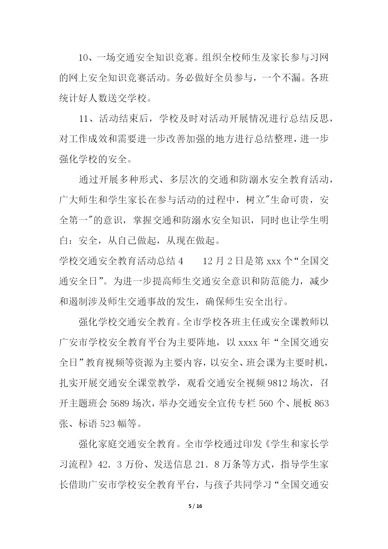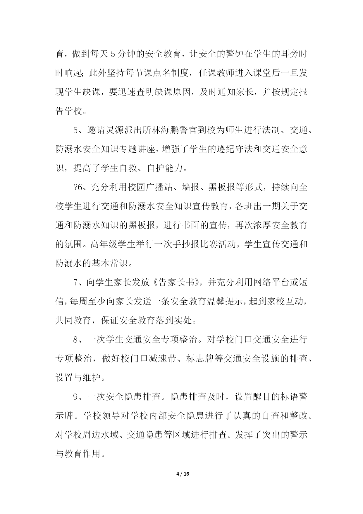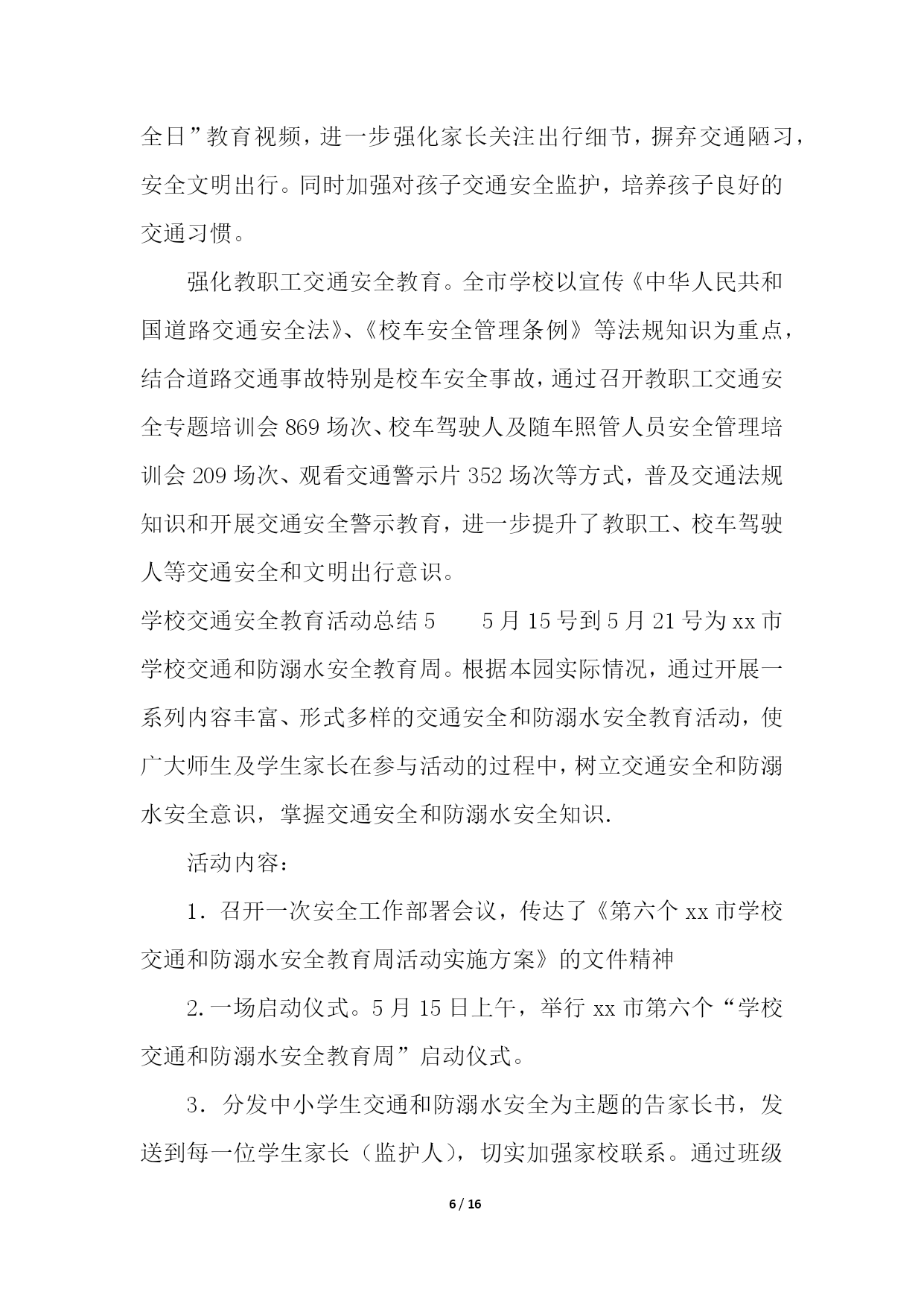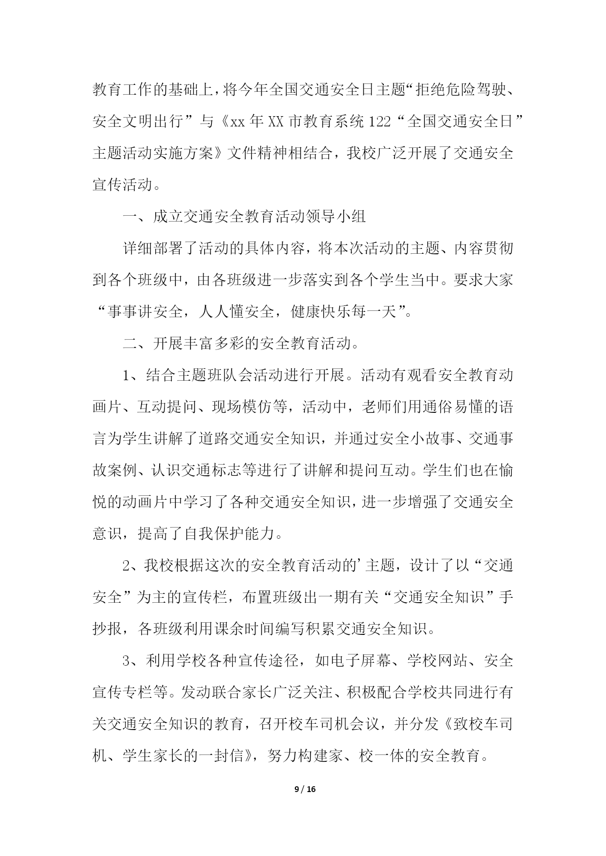 PAGE16/NUMPAGES16学校交通安全教育活动总结学校交通安全教育活动总结1为了培养幼儿的交通安全意识,增强幼儿的自我保护能力,在12。2来临之际,11月28日上午,我园以“全国交通安全日”为教育契机,开展了以“交通法规须记牢,珍爱生命最重要”为主题的教育活动。我园请来了x市交警大队的同志为全园师生开展了别来生面的交通安全日活动,x市交警大队的叔叔向我们详细讲解了一些交通安全常识,并现场示范了交通手势,还教小朋友们学习了“停止”和“通行”两个基本手势。相信孩子们通过听一听、看一看、做一做,学会的不仅仅是动作,更是一份责任。随后,我班教师根据幼儿的年龄特点,让幼儿了解12月2日是全国交通安全日,122是交通事故报警电话。活动中幼儿通过看、听、说、玩等方式,充分认识了遵守交通规则的重要性,增强了孩子们的交通安全意识。x市交警叔叔还为家长和小朋友宣传了安全出行的注意事项,孩子们在爸爸妈妈的带领下或驻足观看,或耐心细致的听叔叔们讲解。相信这一幅幅鲜活的画面,一个个真实的事例,一定会给大家带来警醒,为大家的“安全文明出行”打下坚实的基础。通过此次活动,家长和孩子们进一步了解了交通安全常识,树立了遵守交通规则的意识,培养了文明出行的良好习惯。幼儿认识了常见的交通标志,了解了交通标志的作用和特征,认识到交通知识的重要性,加强了幼儿的安全意识,提高了幼儿自我保护的能力,让幼儿从小树立“文明出行、珍惜生命”的意识,让安全伴随每一位幼儿健康茁壮成长!学校交通安全教育活动总结2交通安全教育是生命教育,它无声无息地渗透在人们各种活动领域中。根据横教办发[xx]148号文件精神,学校开展了“文明交通·安全出行”百日集中整治行动工作,我校组织全体师生积极参加了各项相关活动,目的是通过对师生进行安全教育,使师生懂得安全的重要性,做到安全第一,珍惜生命。具体工作开展如下:1、利用星期一早上的升旗仪式,加强对师生进行交通安全教育,培养师生的安全意识。利用广播站向广大师生交通安全知识,教育大家遵守交通规则。2、利用家长会对学生、家长进行安全教育,要求家长在接送区接送孩子,不拥堵校门口。3、开展“交通安全记心中”征文,学生通过日常所见所闻,写出真实感受,举行交通知识答卷。4、利用班会,开设一次交通安全专题教育课,组织学生学习《小生交通安全教育读本》,主讲校门口出行注意事项。5、组织师生观看“血泪悲歌”交通宣传片,教育教师喝酒不开车,开车不喝酒。教育学生不乘坐醉酒车,劝家长不酒后驾车。6、在日常的教学中以课堂教学为主阵地,在思想品德课和其它课程有机渗透交通安全教育。7、结合学校少先队,严禁12周岁以下的学生骑自行车到学校,学生步行上学放学要求配戴小黄帽,坚持放学路队制,规范了学生们的交通行为。8、学校的执勤老师每天严格维护好学校门口的交通秩序。9、开展交通安全主题班会。以形式多样的班会使学生懂得交通安全的重要性,要求全体学生做到:为了珍惜生命,就要把“安全”两字牢记于心,天天注意安全,事事注意安全。学校交通安全教育活动总结3为贯彻落实《xx市第四个"学校交通和防溺水安全教育周"活动实施方案》,进一步做好学校安全教育工作,根据学校实际,开展一系列丰富多彩的交通和防溺水安全活动,现将活动总结如下:1、学校在星期一升旗仪式上,举行"学校交通和防溺水安全教育周"启动仪式,并进行一次交通和防溺水安全为主题的国旗下讲话,使全校师生都参与到安全教育活动中。2、各班组织开展以"珍爱生命,预防溺水"为主题的班会,向学生宣传防止溺水的基本常识,让学生充分体会到安全的重要性。3、组织学生观看预防溺水,安全度夏主题宣教动画片,深化安全教育的效果。4、班科任老师利用早会、放学前几分钟对学生进行安全教育,做到每天5分钟的安全教育,让安全的警钟在学生的耳旁时时响起;此外坚持每节课点名制度,任课教师进入课堂后一旦发现学生缺课,要迅速查明缺课原因,及时通知家长,并按规定报告学校。5、邀请灵源派出所林海鹏警官到校为师生进行法制、交通、防溺水安全知识专题讲座,增强了学生的遵纪守法和交通安全意识,提高了学生自救、自护能力。?6、充分利用校园广播站、墙报、黑板报等形式,持续向全校学生进行交通和防溺水安全知识宣传教育,各班出一期关于交通和防溺水知识的黑板报,进行书面的宣传,再次浓厚安全教育的氛围。高年级学生举行一次手抄报比赛活动,学生宣传交通和防溺水的基本常识。7、向学生家长发放《告家长书》,并充分利用网络平台或短信,每周至少向家长发送一条安全教育温馨提示,起到家校互动,共同教育,保证安全教育落到实处。8、一次学生交通安全专项整治。对学校门口交通安全进行专项整治,做好校门口减速带、标志牌等交通安全设施的排查、设置与维护。9、一次安全隐患排查。隐患排查及时,设置醒目的标语警示牌。学校