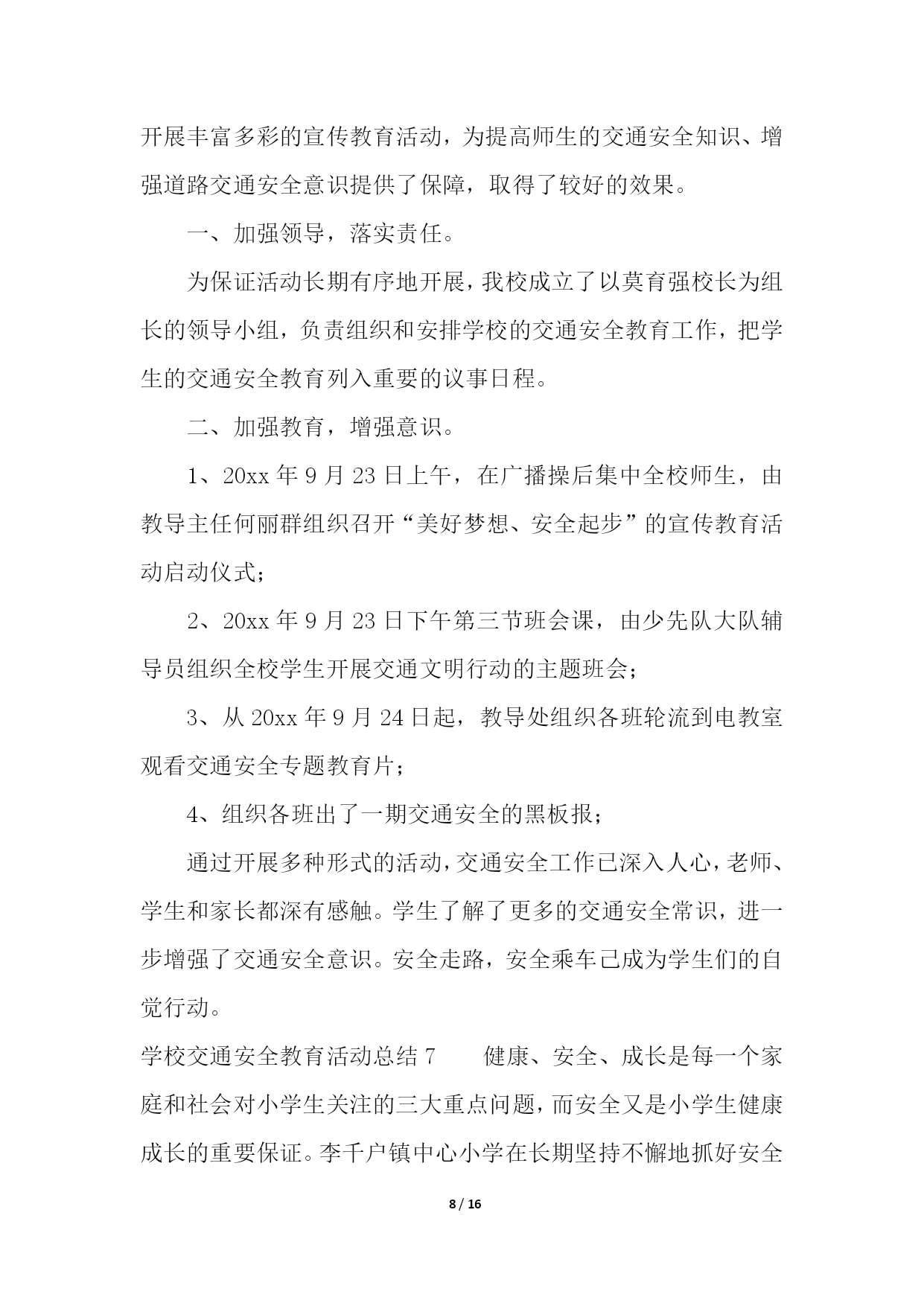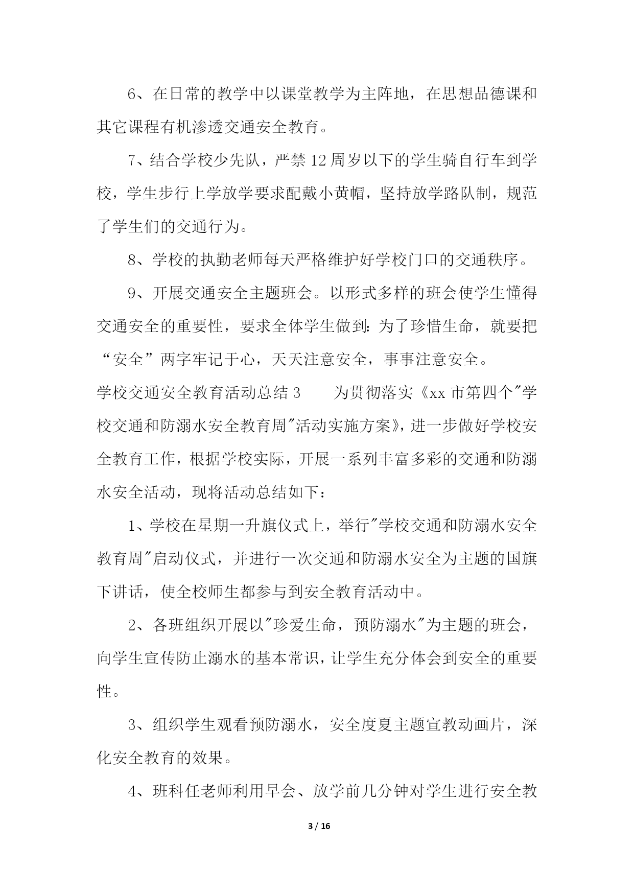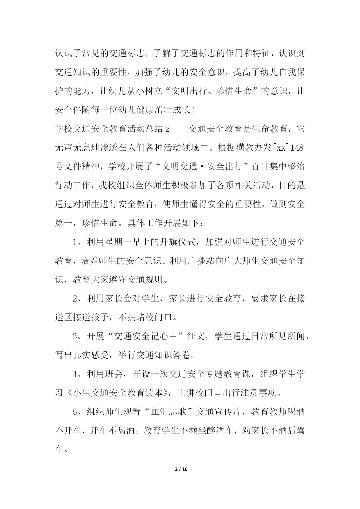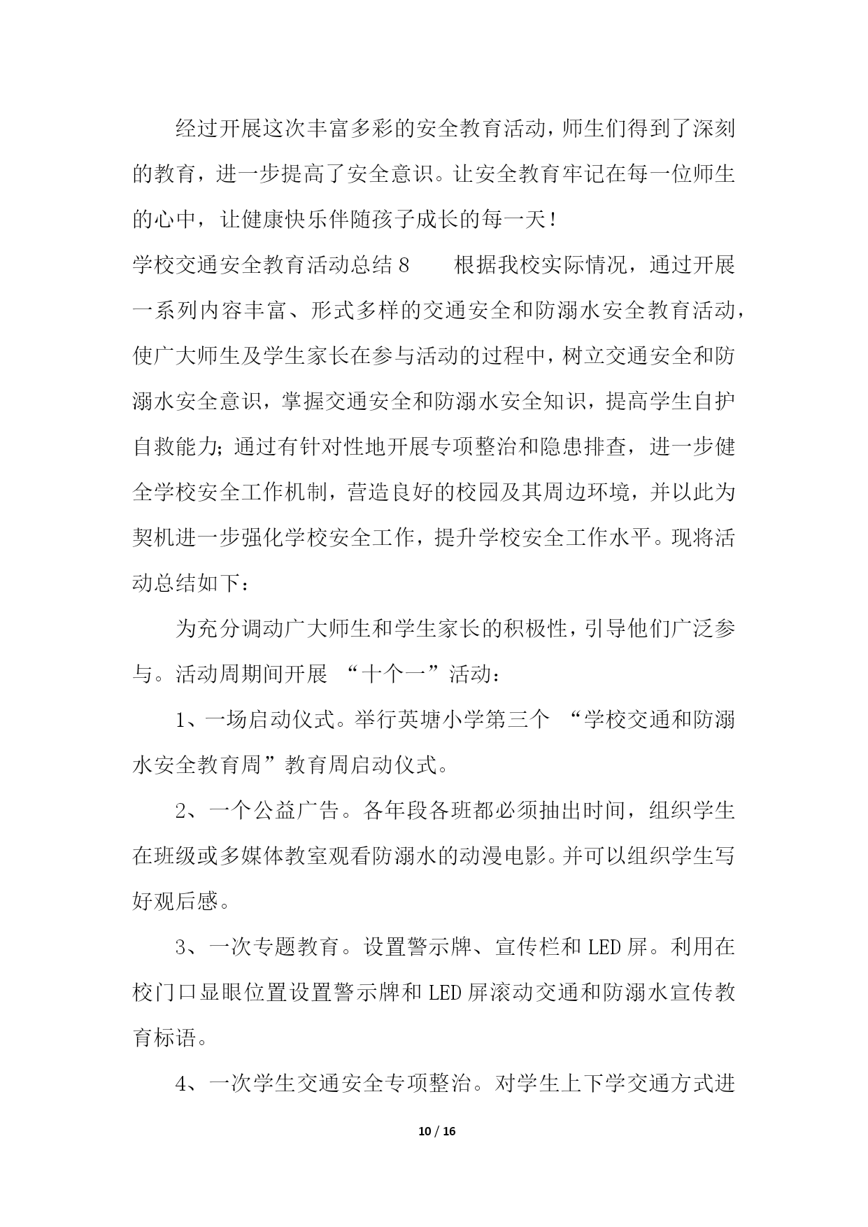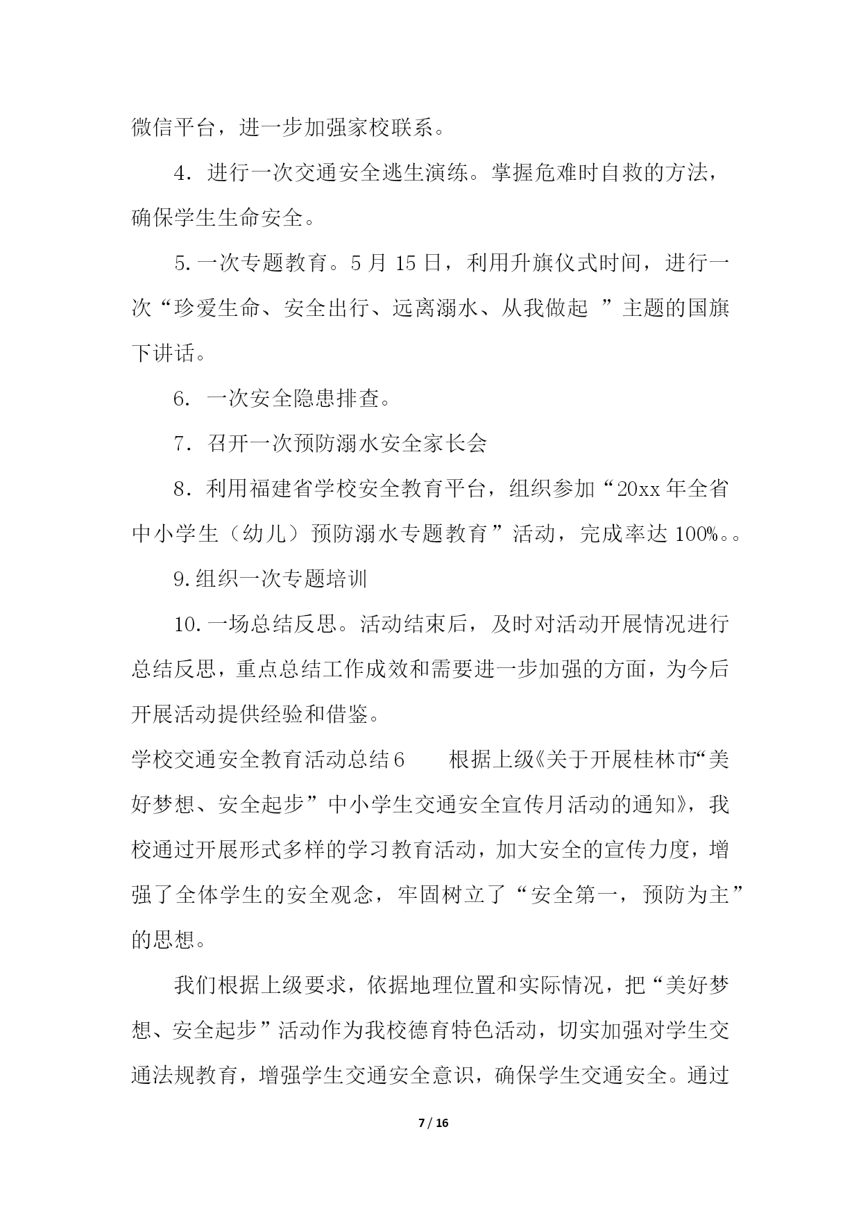 PAGE16/NUMPAGES16学校交通安全教育活动总结学校交通安全教育活动总结1为了培养幼儿的交通安全意识,增强幼儿的自我保护能力,在12。2来临之际,11月28日上午,我园以“全国交通安全日”为教育契机,开展了以“交通法规须记牢,珍爱生命最重要”为主题的教育活动。我园请来了x市交警大队的同志为全园师生开展了别来生面的交通安全日活动,x市交警大队的叔叔向我们详细讲解了一些交通安全常识,并现场示范了交通手势,还教小朋友们学习了“停止”和“通行”两个基本手势。相信孩子们通过听一听、看一看、做一做,学会的不仅仅是动作,更是一份责任。随后,我班教师根据幼儿的年龄特点,让幼儿了解12月2日是全国交通安全日,122是交通事故报警电话。活动中幼儿通过看、听、说、玩等方式,充分认识了遵守交通规则的重要性,增强了孩子们的交通安全意识。x市交警叔叔还为家长和小朋友宣传了安全出行的注意事项,孩子们在爸爸妈妈的带领下或驻足观看,或耐心细致的听叔叔们讲解。相信这一幅幅鲜活的画面,一个个真实的事例,一定会给大家带来警醒,为大家的“安全文明出行”打下坚实的基础。通过此次活动,家长和孩子们进一步了解了交通安全常识,树立了遵守交通规则的意识,培养了文明出行的良好习惯。幼儿认识了常见的交通标志,了解了交通标志的作用和特征,认识到交通知识的重要性,加强了幼儿的安全意识,提高了幼儿自我保护的能力,让幼儿从小树立“文明出行、珍惜生命”的意识,让安全伴随每一位幼儿健康茁壮成长!学校交通安全教育活动总结2交通安全教育是生命教育,它无声无息地渗透在人们各种活动领域中。根据横教办发[xx]148号文件精神,学校开展了“文明交通·安全出行”百日集中整治行动工作,我校组织全体师生积极参加了各项相关活动,目的是通过对师生进行安全教育,使师生懂得安全的重要性,做到安全第一,珍惜生命。具体工作开展如下:1、利用星期一早上的升旗仪式,加强对师生进行交通安全教育,培养师生的安全意识。利用广播站向广大师生交通安全知识,教育大家遵守交通规则。2、利用家长会对学生、家长进行安全教育,要求家长在接送区接送孩子,不拥堵校门口。3、开展“交通安全记心中”征文,学生通过日常所见所闻,写出真实感受,举行交通知识答卷。4、利用班会,开设一次交通安全专题教育课,组织学生学习《小生交通安全教育读本》,主讲校门口出行注意事项。5、组织师生观看“血泪悲歌”交通宣传片,教育教师喝酒不开车,开车不喝酒。教育学生不乘坐醉酒车,劝家长不酒后驾车。6、在日常的教学中以课堂教学为主阵地,在思想品德课和其它课程有机渗透交通安全教育。7、结合学校少先队,严禁12周岁以下的学生骑自行车到学校,学生步行上学放学要求配戴小黄帽,坚持放学路队制,规范了学生们的交通行为。8、学校的执勤老师每天严格维护好学校门口的交通秩序。9、开展交通安全主题班会。以形式多样的班会使学生懂得交通安全的重要性,要求全体学生做到:为了珍惜生命,就要把“安全”两字牢记于心,天天注意安全,事事注意安全。学校交通安全教育活动总结3为贯彻落实《xx市第四个"学校交通和防溺水安全教育周"活动实施方案》,进一步做好学校安全教育工作,根据学校实际,开展一系列丰富多彩的交通和防溺水安全活动,现将活动总结如下:1、学校在星期一升旗仪式上,举行"学校交通和防溺水安全教育周"启动仪式,并进行一次交通和防溺水安全为主题的国旗下讲话,使全校师生都参与到安全教育活动中。2、各班组织开展以"珍爱生命,预防溺水"为主题的班会,向学生宣传防止溺水的基本常识,让学生充分体会到安全的重要性。3、组织学生观看预防溺水,安全度夏主题宣教动画片,深化安全教育的效果。4、班科任老师利用早会、放学前几分钟对学生进行安全教育,做到每天5分钟的安全教育,让安全的警钟在学生的耳旁时时响起;此外坚持每节课点名制度,任课教师进入课堂后一旦发现学生缺课,要迅速查明缺课原因,及时通知家长,并按规定报告学校。5、邀请灵源派出所林海鹏警官到校为师生进行法制、交通、防溺水安全知识专题讲座,增强了学生的遵纪守法和交通安全意识,提高了学生自救、自护能力。?6、充分利用校园广播站、墙报、黑板报等形式,持续向全校学生进行交通和防溺水安全知识宣传教育,各班出一期关于交通和防溺水知识的黑板报,进行书面的宣传,再次浓厚安全教育的氛围。高年级学生举行一次手抄报比赛活动,学生宣传交通和防溺水的基本常识。7、向学生家长发放《告家长书》,并充分利用网络平台或短信,每周至少向家长发送一条安全教育温馨提示,起到家校互动,共同教育,保证安全教育落到实处。8、一次学生交通安全专项整治。对学校门口交通安全进行专项整治,做好校门口减速带、标志牌等交通安全设施的排查、设置与维护。9、一次安全隐患排查。隐患排查及时,设置醒目的标语警示牌。学校