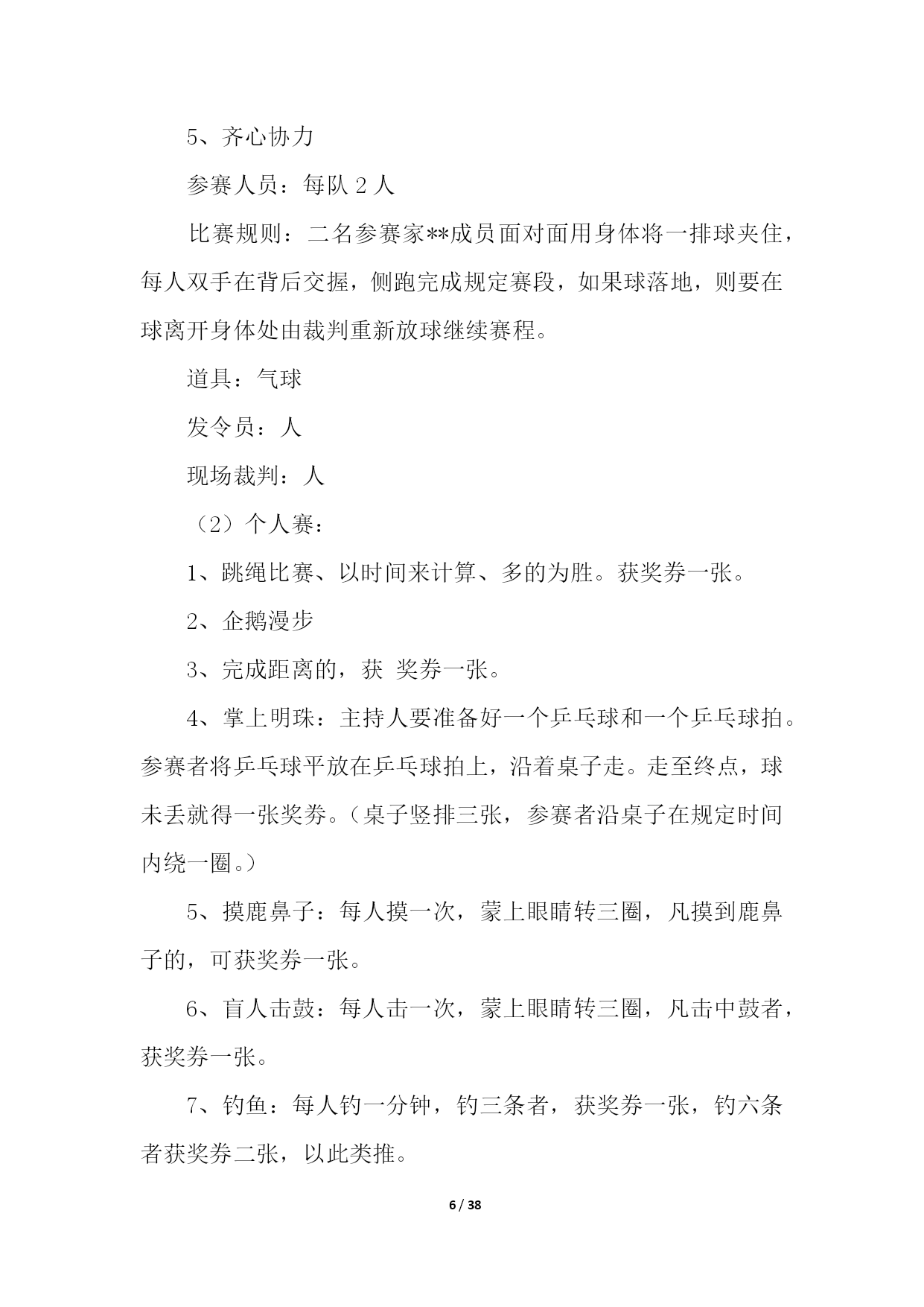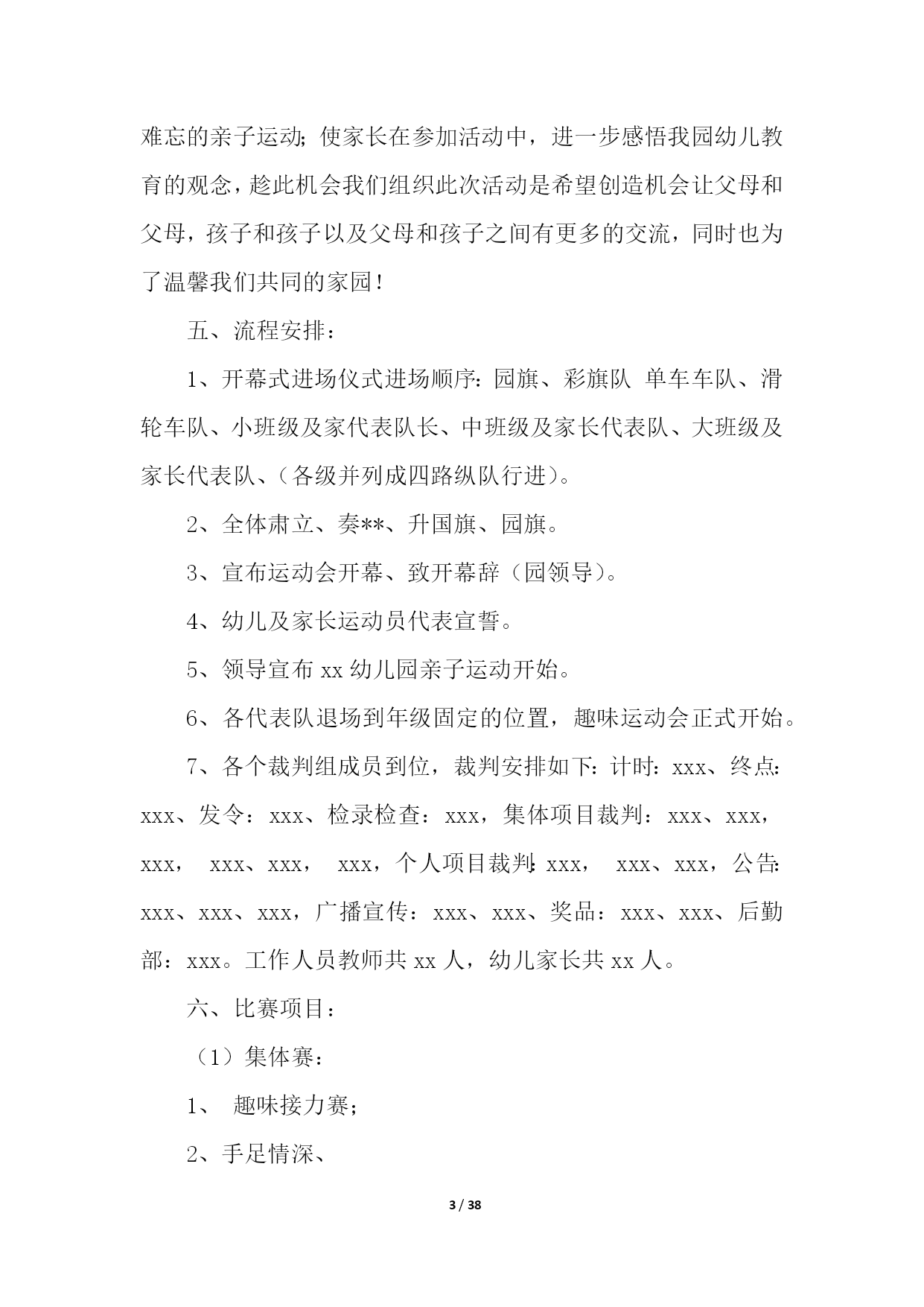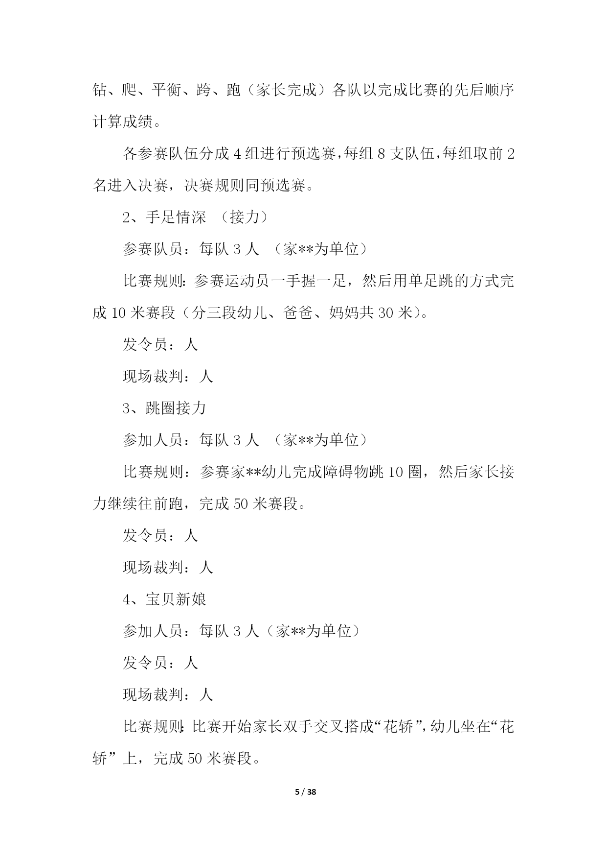 PAGE38/NUMPAGES38亲子运动会活动策划活动组织:负责人:z执行:z主持:z现场组织:z摄像:z奖品发放:z活动时间:20xx年5月17日(星期五)下午14:15准时开始活动地点:星五小学操场参加对象:一年级部分学生及家长。活动形式:团体操表演、亲子游戏活动准备:1.体育组提供亲子活动的想法,设计亲子活动;2.教导处负责制定方案,大队部做好主持稿;3.一年级班主任负责邀请家长参与此项活动,并说明此项活动对于孩子发展的重大意义。活动流程:1.家长、学生入场2.升国旗、奏国歌3.校长讲话4.运动员退场5.团体操表演6.亲子游戏7.分发奖品,活动结束(1)两人三足跑:家长和孩子用绑腿带将两人的腿分别绑在一起,站在起跑线后面,听到发令后,沿着直线的跑道跑到终点,注意在跑的过程中,家长不可以托着学生跑。最后看谁能又快又好地到达终点,时间用的最少者为胜。(2)抛接球游戏:学生和家长以小组为单位配合胯下传递球接力,传到最后人跑到最前排依次再传递,看哪队先传递完毕为胜。亲子运动会活动策划2一、时间:x年x月x日二、地点:xx园操场三、参加对象:xx园幼儿、家长、教师四、活动目标:通过开展庆祝“亲子运动会”系列活动,使幼儿及家长在活动积极的参与中体验合作与亲子交往的快乐,从而度过一个幸福、难忘的亲子运动;使家长在参加活动中,进一步感悟我园幼儿教育的观念,趁此机会我们组织此次活动是希望创造机会让父母和父母,孩子和孩子以及父母和孩子之间有更多的交流,同时也为了温馨我们共同的家园!五、流程安排:1、开幕式进场仪式进场顺序:园旗、彩旗队单车车队、滑轮车队、小班级及家代表队长、中班级及家长代表队、大班级及家长代表队、(各级并列成四路纵队行进)。2、全体肃立、奏**、升国旗、园旗。3、宣布运动会开幕、致开幕辞(园领导)。4、幼儿及家长运动员代表宣誓。5、领导宣布xx幼儿园亲子运动开始。6、各代表队退场到年级固定的位置,趣味运动会正式开始。7、各个裁判组成员到位,裁判安排如下:计时:xxx、终点:xxx、发令:xxx、检录检查:xxx,集体项目裁判:xxx、xxx,xxx,xxx、xxx,xxx,个人项目裁判:xxx,xxx、xxx,公告:xxx、xxx、xxx,广播宣传:xxx、xxx、奖品:xxx、xxx、后勤部:xxx。工作人员教师共xx人,幼儿家长共xx人。六、比赛项目:(1)集体赛:1、趣味接力赛;2、手足情深、3、跳圈接力4、宝贝新娘5、齐心协力(2)个人赛:1跳绳、2企鹅漫步、3滑轮比赛、4、掌上明珠、5、摸鹿鼻子、6、盲人击鼓、7、钓鱼、8、挟乒乓球、8、套圈、9、吹气球、10、呼拉圈比赛、11、运用爆破音吹蜡烛、12、比比谁的眼力好、13、比比谁的运气好七、比赛方法规则:(1)集体赛——趣味接力赛1、接力赛总赛程60米共分五个挑战项目,每个项目的比赛距离为10米,顺序:钻、爬、平衡、跨、跑(家长完成)各队以完成比赛的先后顺序计算成绩。各参赛队伍分成4组进行预选赛,每组8支队伍,每组取前2名进入决赛,决赛规则同预选赛。2、手足情深(接力)参赛队员:每队3人(家**为单位)比赛规则:参赛运动员一手握一足,然后用单足跳的方式完成10米赛段(分三段幼儿、爸爸、妈妈共30米)。发令员:人现场裁判:人3、跳圈接力参加人员:每队3人(家**为单位)比赛规则:参赛家**幼儿完成障碍物跳10圈,然后家长接力继续往前跑,完成50米赛段。发令员:人现场裁判:人4、宝贝新娘参加人员:每队3人(家**为单位)发令员:人现场裁判:人比赛规则:比赛开始家长双手交叉搭成“花轿”,幼儿坐在“花轿”上,完成50米赛段。5、齐心协力参赛人员:每队2人比赛规则:二名参赛家**成员面对面用身体将一排球夹住,每人双手在背后交握,侧跑完成规定赛段,如果球落地,则要在球离开身体处由裁判重新放球继续赛程。道具:气球发令员:人现场裁判:人(2)个人赛:1、跳绳比赛、以时间来计算、多的为胜。获奖券一张。2、企鹅漫步3、完成距离的,获奖券一张。4、掌上明珠:主持人要准备好一个乒乓球和一个乒乓球拍。参赛者将乒乓球平放在乒乓球拍上,沿着桌子走。走至终点,球未丢就得一张奖劵。(桌子竖排三张,参赛者沿桌子在规定时间内绕一圈。)5、摸鹿鼻子:每人摸一次,蒙上眼睛转三圈,凡摸到鹿鼻子的,可获奖券一张。6、盲人击鼓:每人击一次,蒙上眼睛转三圈,凡击中鼓者,获奖券一张。7、钓鱼:每人钓一分钟,钓三条者,获奖券一张,钓六条者获奖券二张,以此类推。8、挟乒乓球:每人挟一分钟,挟完20个乒乓球者,获奖券一张,挟完40个乒乓球者,获奖券二张。9、套圈:每人套五次,套中二个者,获奖券一张,套中四个者,获奖券二张,套中五个者,获奖券三张。10、运用爆破破音吹蜡烛:主持人准备好六支蜡烛并点燃,