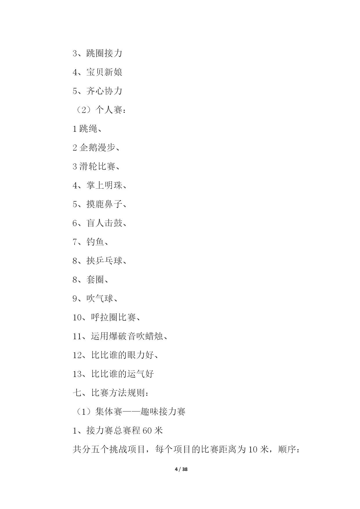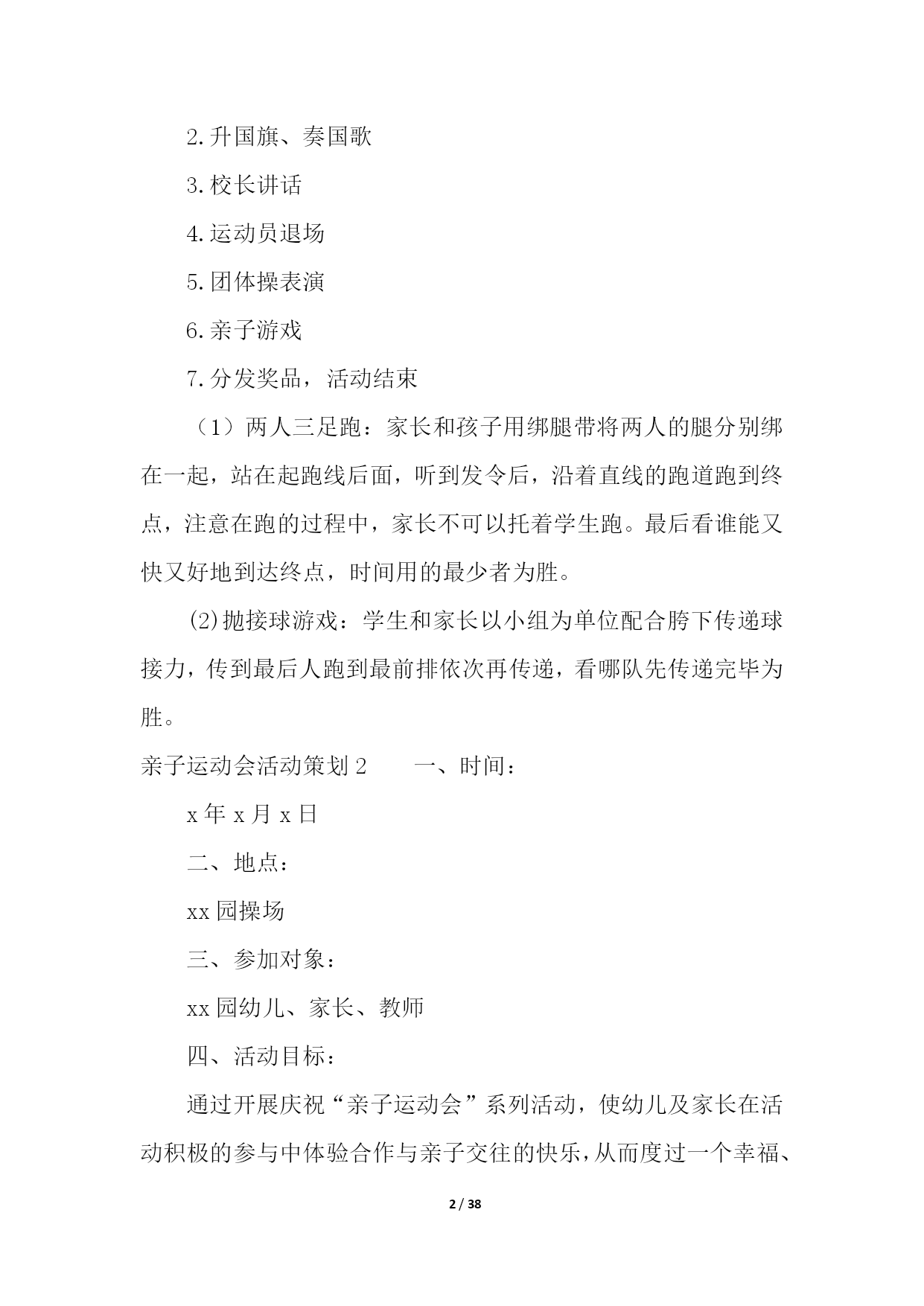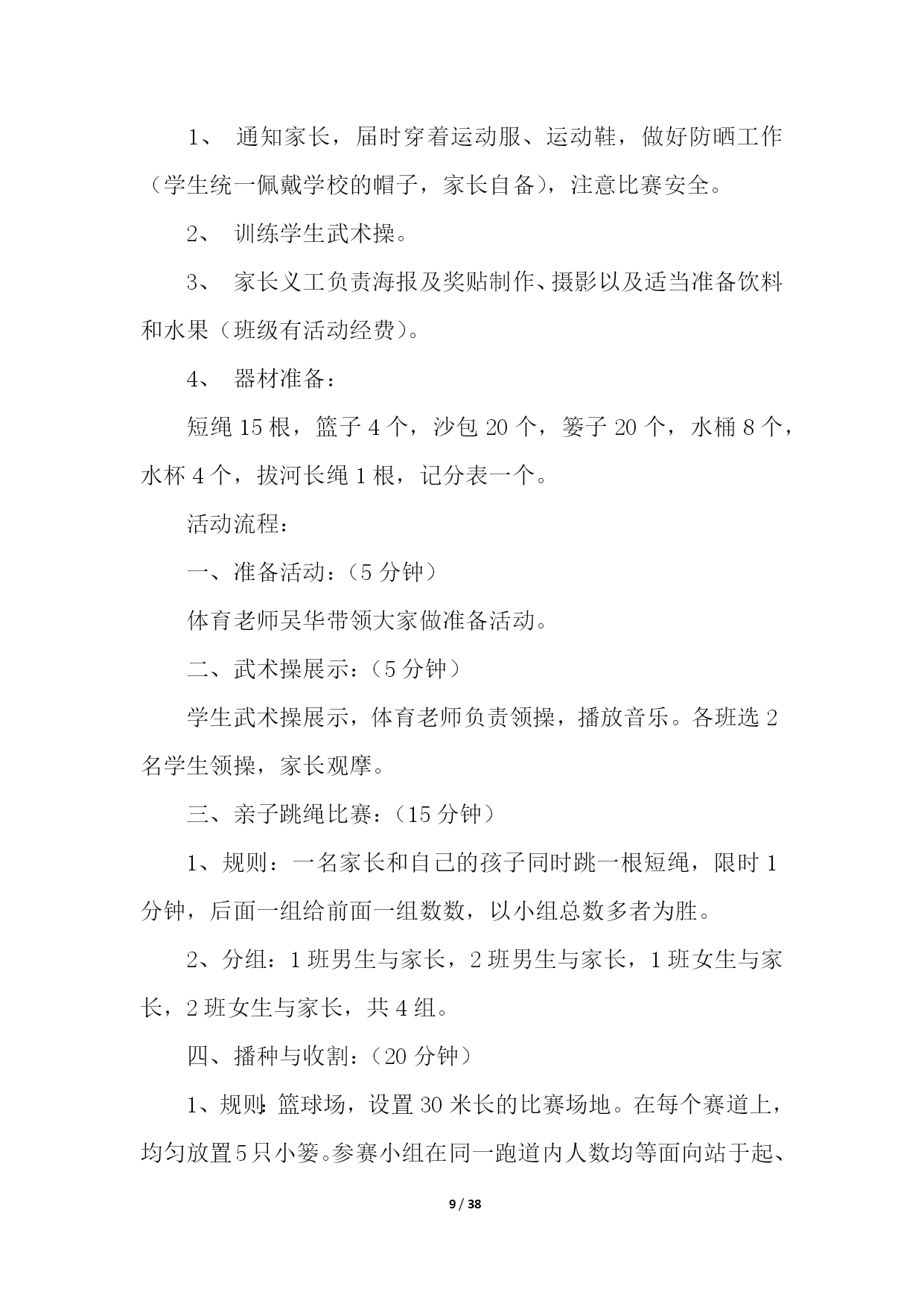 PAGE38/NUMPAGES38亲子运动会活动策划活动组织:负责人:z执行:z主持:z现场组织:z摄像:z奖品发放:z活动时间:20xx年5月17日(星期五)下午14:15准时开始活动地点:星五小学操场参加对象:一年级部分学生及家长。活动形式:团体操表演、亲子游戏活动准备:1.体育组提供亲子活动的想法,设计亲子活动;2.教导处负责制定方案,大队部做好主持稿;3.一年级班主任负责邀请家长参与此项活动,并说明此项活动对于孩子发展的重大意义。活动流程:1.家长、学生入场2.升国旗、奏国歌3.校长讲话4.运动员退场5.团体操表演6.亲子游戏7.分发奖品,活动结束(1)两人三足跑:家长和孩子用绑腿带将两人的腿分别绑在一起,站在起跑线后面,听到发令后,沿着直线的跑道跑到终点,注意在跑的过程中,家长不可以托着学生跑。最后看谁能又快又好地到达终点,时间用的最少者为胜。(2)抛接球游戏:学生和家长以小组为单位配合胯下传递球接力,传到最后人跑到最前排依次再传递,看哪队先传递完毕为胜。亲子运动会活动策划2一、时间:x年x月x日二、地点:xx园操场三、参加对象:xx园幼儿、家长、教师四、活动目标:通过开展庆祝“亲子运动会”系列活动,使幼儿及家长在活动积极的参与中体验合作与亲子交往的快乐,从而度过一个幸福、难忘的亲子运动;使家长在参加活动中,进一步感悟我园幼儿教育的观念,趁此机会我们组织此次活动是希望创造机会让父母和父母,孩子和孩子以及父母和孩子之间有更多的交流,同时也为了温馨我们共同的家园!五、流程安排:1、开幕式进场仪式进场顺序:园旗、彩旗队单车车队、滑轮车队、小班级及家代表队长、中班级及家长代表队、大班级及家长代表队、(各级并列成四路纵队行进)。2、全体肃立、奏**、升国旗、园旗。3、宣布运动会开幕、致开幕辞(园领导)。4、幼儿及家长运动员代表宣誓。5、领导宣布xx幼儿园亲子运动开始。6、各代表队退场到年级固定的位置,趣味运动会正式开始。7、各个裁判组成员到位,裁判安排如下:计时:xxx、终点:xxx、发令:xxx、检录检查:xxx,集体项目裁判:xxx、xxx,xxx,xxx、xxx,xxx,个人项目裁判:xxx,xxx、xxx,公告:xxx、xxx、xxx,广播宣传:xxx、xxx、奖品:xxx、xxx、后勤部:xxx。工作人员教师共xx人,幼儿家长共xx人。六、比赛项目:(1)集体赛:1、趣味接力赛;2、手足情深、3、跳圈接力4、宝贝新娘5、齐心协力(2)个人赛:1跳绳、2企鹅漫步、3滑轮比赛、4、掌上明珠、5、摸鹿鼻子、6、盲人击鼓、7、钓鱼、8、挟乒乓球、8、套圈、9、吹气球、10、呼拉圈比赛、11、运用爆破音吹蜡烛、12、比比谁的眼力好、13、比比谁的运气好七、比赛方法规则:(1)集体赛——趣味接力赛1、接力赛总赛程60米共分五个挑战项目,每个项目的比赛距离为10米,顺序:钻、爬、平衡、跨、跑(家长完成)各队以完成比赛的先后顺序计算成绩。各参赛队伍分成4组进行预选赛,每组8支队伍,每组取前2名进入决赛,决赛规则同预选赛。2、手足情深(接力)参赛队员:每队3人(家**为单位)比赛规则:参赛运动员一手握一足,然后用单足跳的方式完成10米赛段(分三段幼儿、爸爸、妈妈共30米)。发令员:人现场裁判:人3、跳圈接力参加人员:每队3人(家**为单位)比赛规则:参赛家**幼儿完成障碍物跳10圈,然后家长接力继续往前跑,完成50米赛段。发令员:人现场裁判:人4、宝贝新娘参加人员:每队3人(家**为单位)发令员:人现场裁判:人比赛规则:比赛开始家长双手交叉搭成“花轿”,幼儿坐在“花轿”上,完成50米赛段。5、齐心协力参赛人员:每队2人比赛规则:二名参赛家**成员面对面用身体将一排球夹住,每人双手在背后交握,侧跑完成规定赛段,如果球落地,则要在球离开身体处由裁判重新放球继续赛程。道具:气球发令员:人现场裁判:人(2)个人赛:1、跳绳比赛、以时间来计算、多的为胜。获奖券一张。2、企鹅漫步3、完成距离的,获奖券一张。4、掌上明珠:主持人要准备好一个乒乓球和一个乒乓球拍。参赛者将乒乓球平放在乒乓球拍上,沿着桌子走。走至终点,球未丢就得一张奖劵。(桌子竖排三张,参赛者沿桌子在规定时间内绕一圈。)5、摸鹿鼻子:每人摸一次,蒙上眼睛转三圈,凡摸到鹿鼻子的,可获奖券一张。6、盲人击鼓:每人击一次,蒙上眼睛转三圈,凡击中鼓者,获奖券一张。7、钓鱼:每人钓一分钟,钓三条者,获奖券一张,钓六条者获奖券二张,以此类推。8、挟乒乓球:每人挟一分钟,挟完20个乒乓球者,获奖券一张,挟完40个乒乓球者,获奖券二张。9、套圈:每人套五次,套中二个者,获奖券一张,套中四个者,获奖券二张,套中五个者,获奖券三张。10、运用爆破破音吹蜡烛:主持人准备好六支蜡烛并点燃,