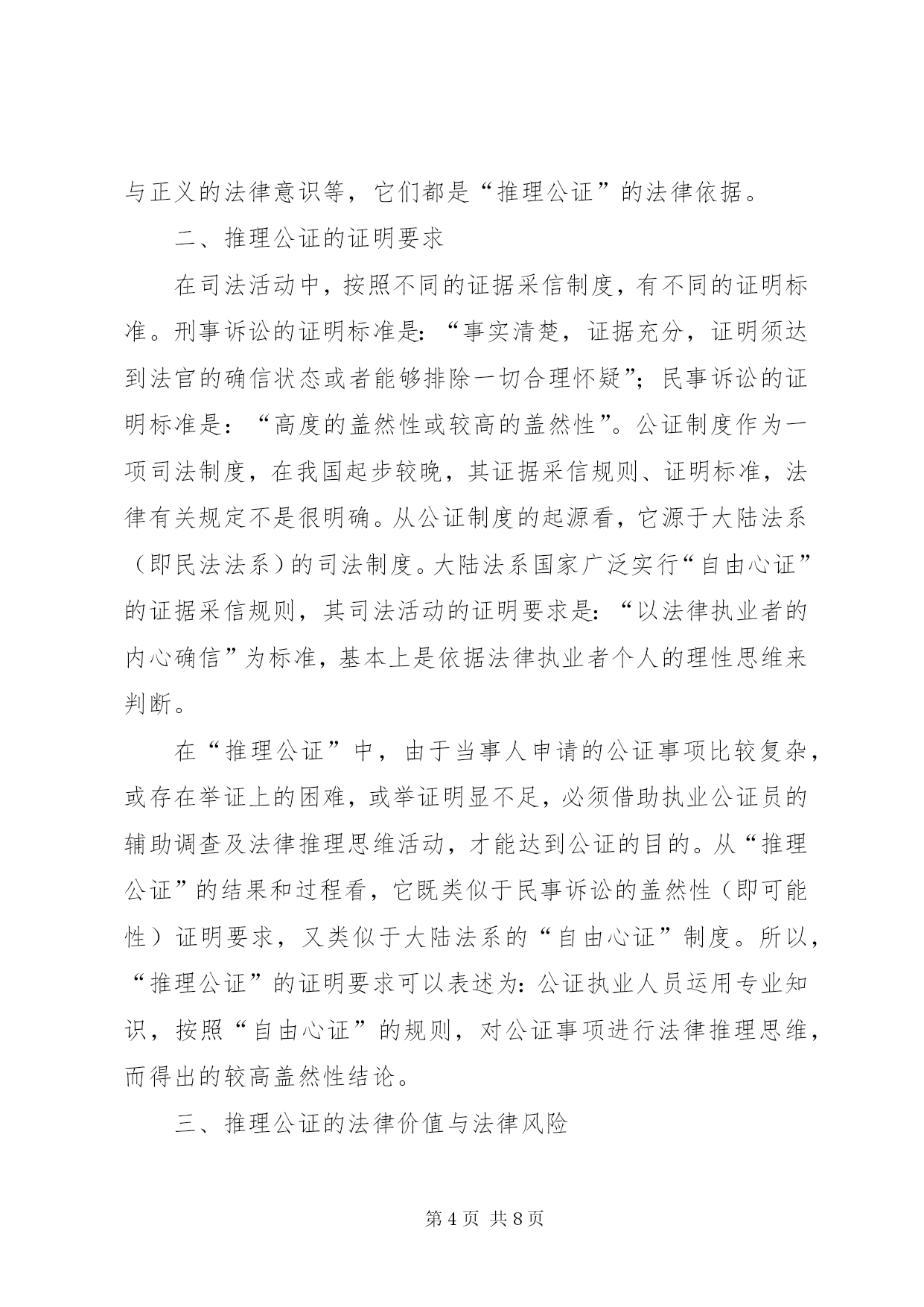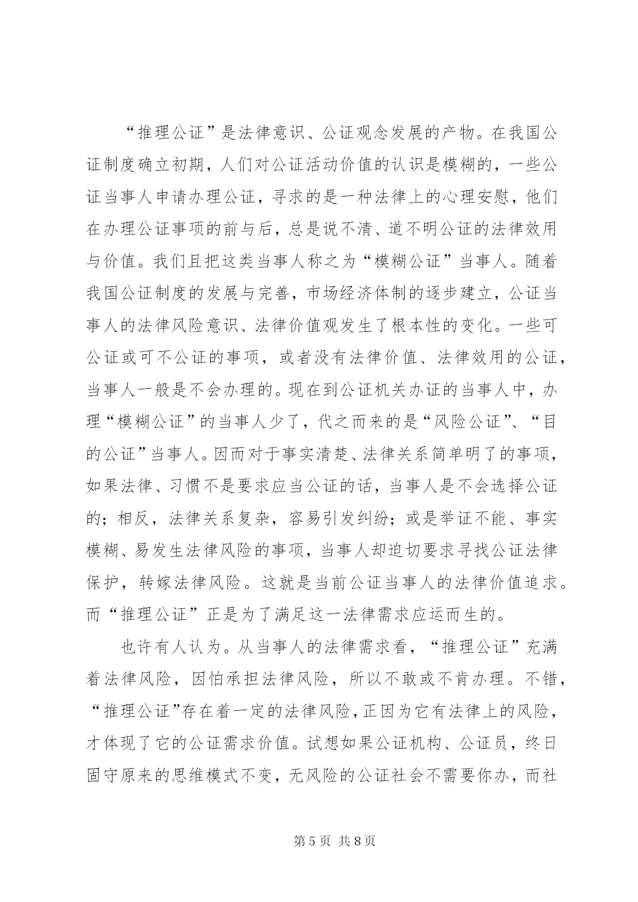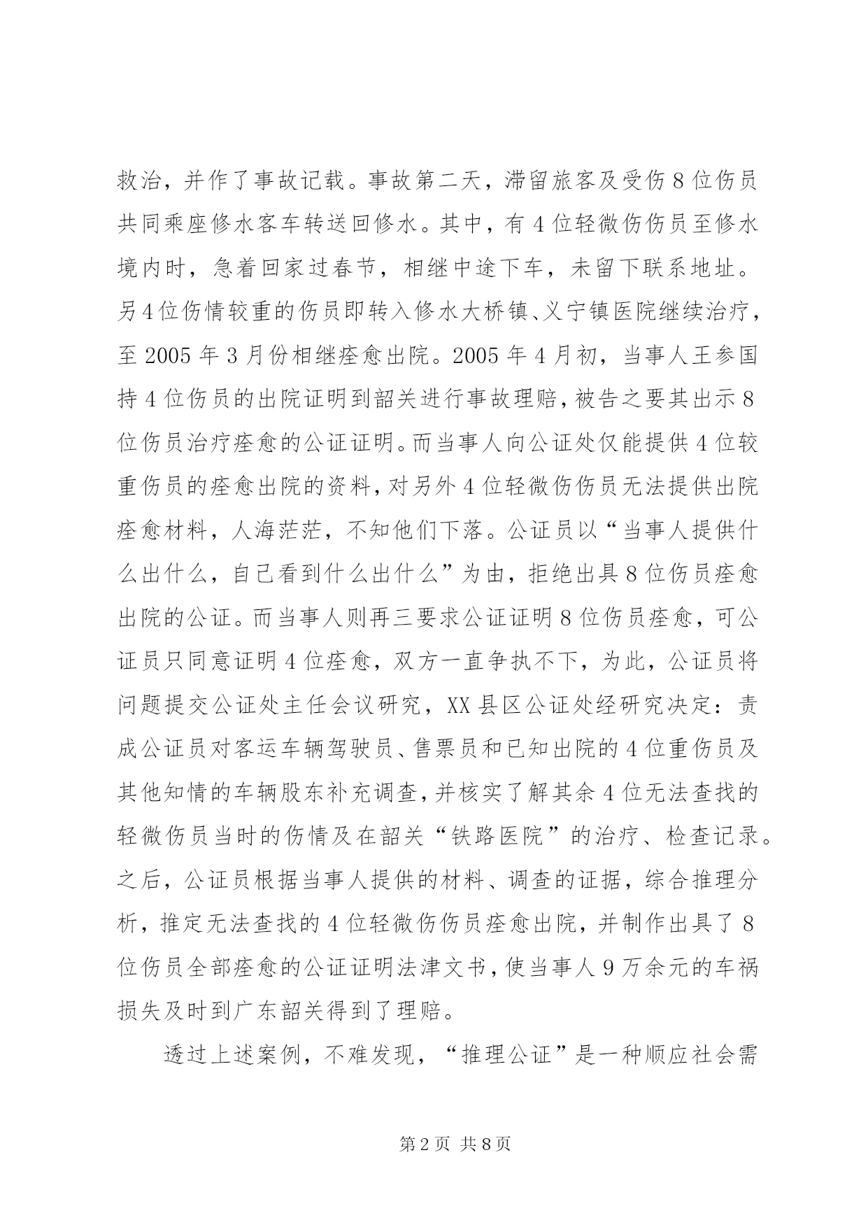 第PAGE\*Arabic\*MERGEFORMAT8页共NUMPAGES\*MERGEFORMAT8页司法局推理公证调查汇报公证的职能主要是证明职能,它是公证机构的出证行为与公证员的执业行为的有机结合。对于公证事项不论是进行形式审查,还是实质性审查,都要求公证员遵循“合法性、真实性、公正性”的审查原则。由于社会事物的纷繁多样,决定了公证事项的复杂性。公证实务中,一些公证当事人申请的事项、提供的材料,形式上看起来,似乎“合法、真实”,其实质内容往往“不合法、不真实”;相反,一些从形式上看“不合法、不真实”的事情,其实质内容却“真实、合法”。因此,对较为复杂的公证事项进行审查,我们不能停留在“形式审查”的层面,而应该进行“实质性审查”。即:公证执业人员要善于运用法律职业思维、法律推理、判断,对公证事实、证据材料进行实质性的识别,并对识别结果予以证明。这样一个过程我们称它为“推理公证”。“推理公证”是公证思维的特殊形式,它客观存在于具体的公证实务中。下面就“推理公证”现象,介绍一个实践中的典型案例:2005年1月17日,修水籍客运汽车承包人王参国等,从广东惠州发车运载旅客至修水,途经广东韶关路段时,客车不幸与其它车辆碰撞,发生车祸,造成乘车的8位旅客不同程度受伤。韶关交警处理事故过程中,将8位受伤旅客送往韶关“铁路医院”救治,并作了事故记载。事故第二天,滞留旅客及受伤8位伤员共同乘座修水客车转送回修水。其中,有4位轻微伤伤员至修水境内时,急着回家过春节,相继中途下车,未留下联系地址。另4位伤情较重的伤员即转入修水大桥镇、义宁镇医院继续治疗,至2005年3月份相继痊愈出院。2005年4月初,当事人王参国持4位伤员的出院证明到韶关进行事故理赔,被告之要其出示8位伤员治疗痊愈的公证证明。而当事人向公证处仅能提供4位较重伤员的痊愈出院的资料,对另外4位轻微伤伤员无法提供出院痊愈材料,人海茫茫,不知他们下落。公证员以“当事人提供什么出什么,自己看到什么出什么”为由,拒绝出具8位伤员痊愈出院的公证。而当事人则再三要求公证证明8位伤员痊愈,可公证员只同意证明4位痊愈,双方一直争执不下,为此,公证员将问题提交公证处主任会议研究,XX县区公证处经研究决定:责成公证员对客运车辆驾驶员、售票员和已知出院的4位重伤员及其他知情的车辆股东补充调查,并核实了解其余4位无法查找的轻微伤员当时的伤情及在韶关“铁路医院”的治疗、检查记录。之后,公证员根据当事人提供的材料、调查的证据,综合推理分析,推定无法查找的4位轻微伤伤员痊愈出院,并制作出具了8位伤员全部痊愈的公证证明法津文书,使当事人9万余元的车祸损失及时到广东韶关得到了理赔。透过上述案例,不难发现,“推理公证”是一种顺应社会需要的,体现公证法律价值的实质性公证;是一种公证员运用逻辑思维,进行推理、判断的职业风险公证。对于“推理公证”的认识,我们不妨作如下几个方面的探讨:一、推理公证的法理基础“推理公证”从理论上分析,它是一种法律上的推理思维;法律推理思维可划分为形式推理和实质推理。形式推理思维包括归纳推理、演绎推理、类比推理三种不同思维形式;实质推理思维包括辩证推理、辩证逻辑等思维形式。“推理公证”究竟属于哪一类思维形式呢。首先,“推理公证”表现为执业公证员对已知公证材料的审查,并运用法律职业思维、价值判断,去伪存真、由此及彼、由表及里的理性认识过程,因而它属于法律实质推理的范畴;其次,“推理公证”它又表现为公证员以现有的证据、材料为前提,在当事人举证不足或举证困难的情况下,辅以相应的调查核实手段,对已经发生的事情作出事实性判断和价值评价。它回答的是:过去发生的事件是否客观存在、合法、公平与正义。因此,“推理公证”的法律推理思维形式应该是:辩证推理和辩证逻辑。另外,从“推理公证”的法律根据看,法律推理思维离不开法律判断;而法律判断是以现行法律为基础的。因此,“推理公证”也是以现行法律为依托的。这里所讲的现行“法律”包括现行的法律原则、法律规范、规章、习惯、政策、道德伦理、公平与正义的法律意识等,它们都是“推理公证”的法律依据。二、推理公证的证明要求在司法活动中,按照不同的证据采信制度,有不同的证明标准。刑事诉讼的证明标准是:“事实清楚,证据充分,证明须达到法官的确信状态或者能够排除一切合理怀疑”;民事诉讼的证明标准是:“高度的盖然性或较高的盖然性”。公证制度作为一项司法制度,在我国起步较晚,其证据采信规则、证明标准,法律有关规定不是很明确。从公证制度的起源看,它源于大陆法系(即民法法系)的司法制度。大陆法系国家广泛实行“自由心证”的证据采信规则,其司法活动的证明要求是:“以法律执业者的内心确信”为标准,基本上是依据法律执业者个人的理性思维来判断。在“推理公证”中,由于当事人申请的公
