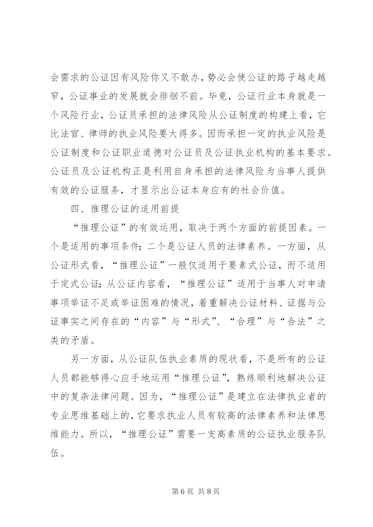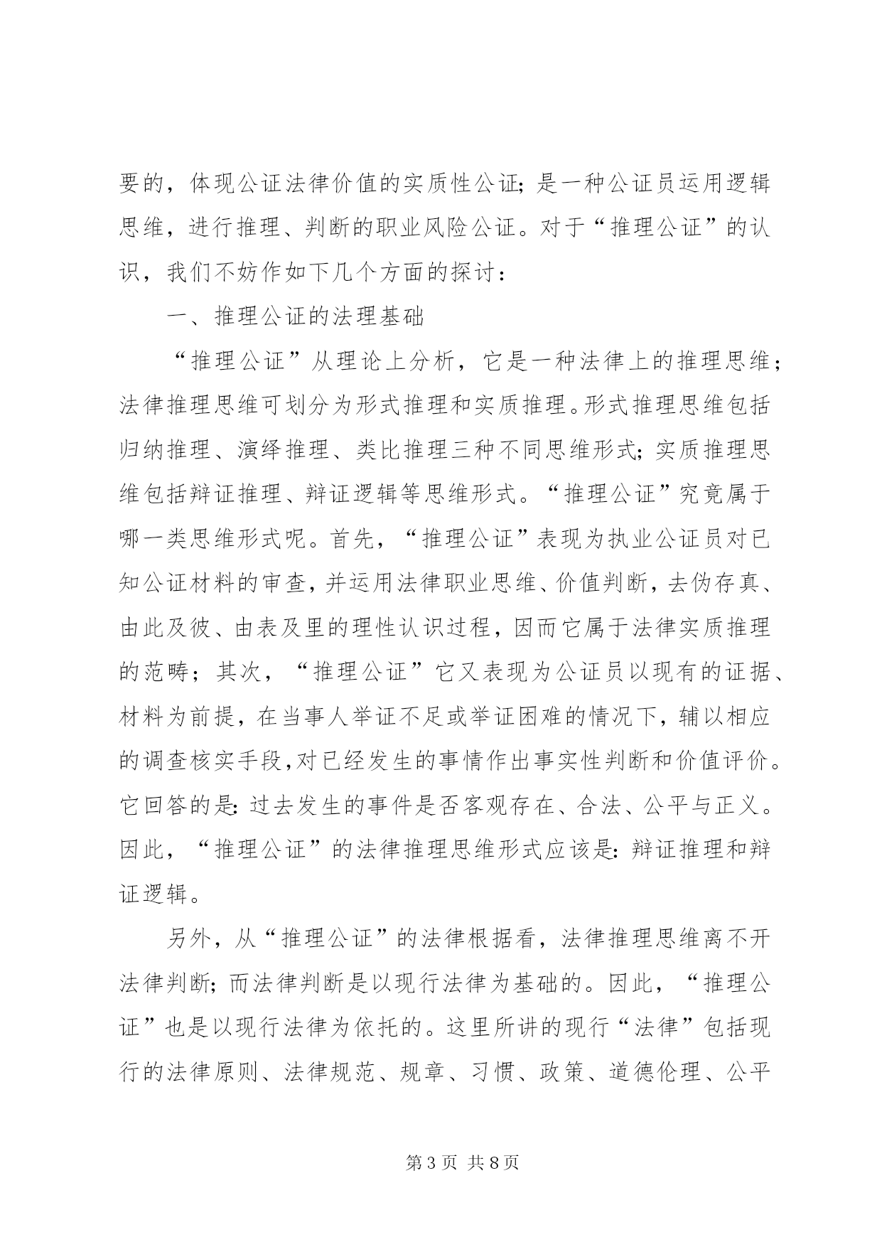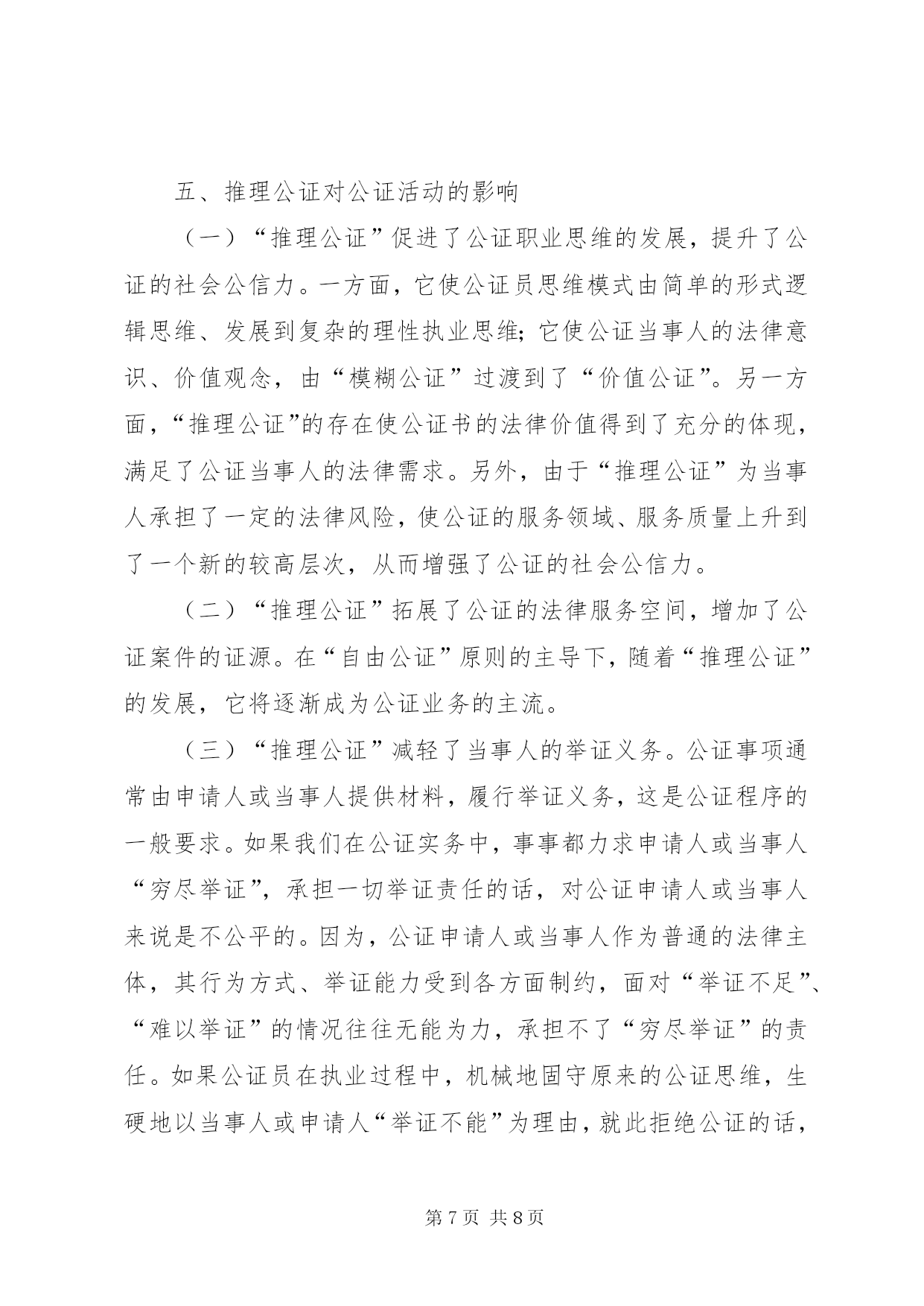 第PAGE\*Arabic\*MERGEFORMAT8页共NUMPAGES\*MERGEFORMAT8页司法局推理公证调查汇报公证的职能主要是证明职能,它是公证机构的出证行为与公证员的执业行为的有机结合。对于公证事项不论是进行形式审查,还是实质性审查,都要求公证员遵循“合法性、真实性、公正性”的审查原则。由于社会事物的纷繁多样,决定了公证事项的复杂性。公证实务中,一些公证当事人申请的事项、提供的材料,形式上看起来,似乎“合法、真实”,其实质内容往往“不合法、不真实”;相反,一些从形式上看“不合法、不真实”的事情,其实质内容却“真实、合法”。因此,对较为复杂的公证事项进行审查,我们不能停留在“形式审查”的层面,而应该进行“实质性审查”。即:公证执业人员要善于运用法律职业思维、法律推理、判断,对公证事实、证据材料进行实质性的识别,并对识别结果予以证明。这样一个过程我们称它为“推理公证”。“推理公证”是公证思维的特殊形式,它客观存在于具体的公证实务中。下面就“推理公证”现象,介绍一个实践中的典型案例:2005年1月17日,修水籍客运汽车承包人王参国等,从广东惠州发车运载旅客至修水,途经广东韶关路段时,客车不幸与其它车辆碰撞,发生车祸,造成乘车的8位旅客不同程度受伤。韶关交警处理事故过程中,将8位受伤旅客送往韶关“铁路医院”救治,并作了事故记载。事故第二天,滞留旅客及受伤8位伤员共同乘座修水客车转送回修水。其中,有4位轻微伤伤员至修水境内时,急着回家过春节,相继中途下车,未留下联系地址。另4位伤情较重的伤员即转入修水大桥镇、义宁镇医院继续治疗,至2005年3月份相继痊愈出院。2005年4月初,当事人王参国持4位伤员的出院证明到韶关进行事故理赔,被告之要其出示8位伤员治疗痊愈的公证证明。而当事人向公证处仅能提供4位较重伤员的痊愈出院的资料,对另外4位轻微伤伤员无法提供出院痊愈材料,人海茫茫,不知他们下落。公证员以“当事人提供什么出什么,自己看到什么出什么”为由,拒绝出具8位伤员痊愈出院的公证。而当事人则再三要求公证证明8位伤员痊愈,可公证员只同意证明4位痊愈,双方一直争执不下,为此,公证员将问题提交公证处主任会议研究,XX县区公证处经研究决定:责成公证员对客运车辆驾驶员、售票员和已知出院的4位重伤员及其他知情的车辆股东补充调查,并核实了解其余4位无法查找的轻微伤员当时的伤情及在韶关“铁路医院”的治疗、检查记录。之后,公证员根据当事人提供的材料、调查的证据,综合推理分析,推定无法查找的4位轻微伤伤员痊愈出院,并制作出具了8位伤员全部痊愈的公证证明法津文书,使当事人9万余元的车祸损失及时到广东韶关得到了理赔。透过上述案例,不难发现,“推理公证”是一种顺应社会需要的,体现公证法律价值的实质性公证;是一种公证员运用逻辑思维,进行推理、判断的职业风险公证。对于“推理公证”的认识,我们不妨作如下几个方面的探讨:一、推理公证的法理基础“推理公证”从理论上分析,它是一种法律上的推理思维;法律推理思维可划分为形式推理和实质推理。形式推理思维包括归纳推理、演绎推理、类比推理三种不同思维形式;实质推理思维包括辩证推理、辩证逻辑等思维形式。“推理公证”究竟属于哪一类思维形式呢。首先,“推理公证”表现为执业公证员对已知公证材料的审查,并运用法律职业思维、价值判断,去伪存真、由此及彼、由表及里的理性认识过程,因而它属于法律实质推理的范畴;其次,“推理公证”它又表现为公证员以现有的证据、材料为前提,在当事人举证不足或举证困难的情况下,辅以相应的调查核实手段,对已经发生的事情作出事实性判断和价值评价。它回答的是:过去发生的事件是否客观存在、合法、公平与正义。因此,“推理公证”的法律推理思维形式应该是:辩证推理和辩证逻辑。另外,从“推理公证”的法律根据看,法律推理思维离不开法律判断;而法律判断是以现行法律为基础的。因此,“推理公证”也是以现行法律为依托的。这里所讲的现行“法律”包括现行的法律原则、法律规范、规章、习惯、政策、道德伦理、公平与正义的法律意识等,它们都是“推理公证”的法律依据。二、推理公证的证明要求在司法活动中,按照不同的证据采信制度,有不同的证明标准。刑事诉讼的证明标准是:“事实清楚,证据充分,证明须达到法官的确信状态或者能够排除一切合理怀疑”;民事诉讼的证明标准是:“高度的盖然性或较高的盖然性”。公证制度作为一项司法制度,在我国起步较晚,其证据采信规则、证明标准,法律有关规定不是很明确。从公证制度的起源看,它源于大陆法系(即民法法系)的司法制度。大陆法系国家广泛实行“自由心证”的证据采信规则,其司法活动的证明要求是:“以法律执业者的内心确信”为标准,基本上是依据法律执业者个人的理性思维来判断。在“推理公证”中,由于当事人申请的公
