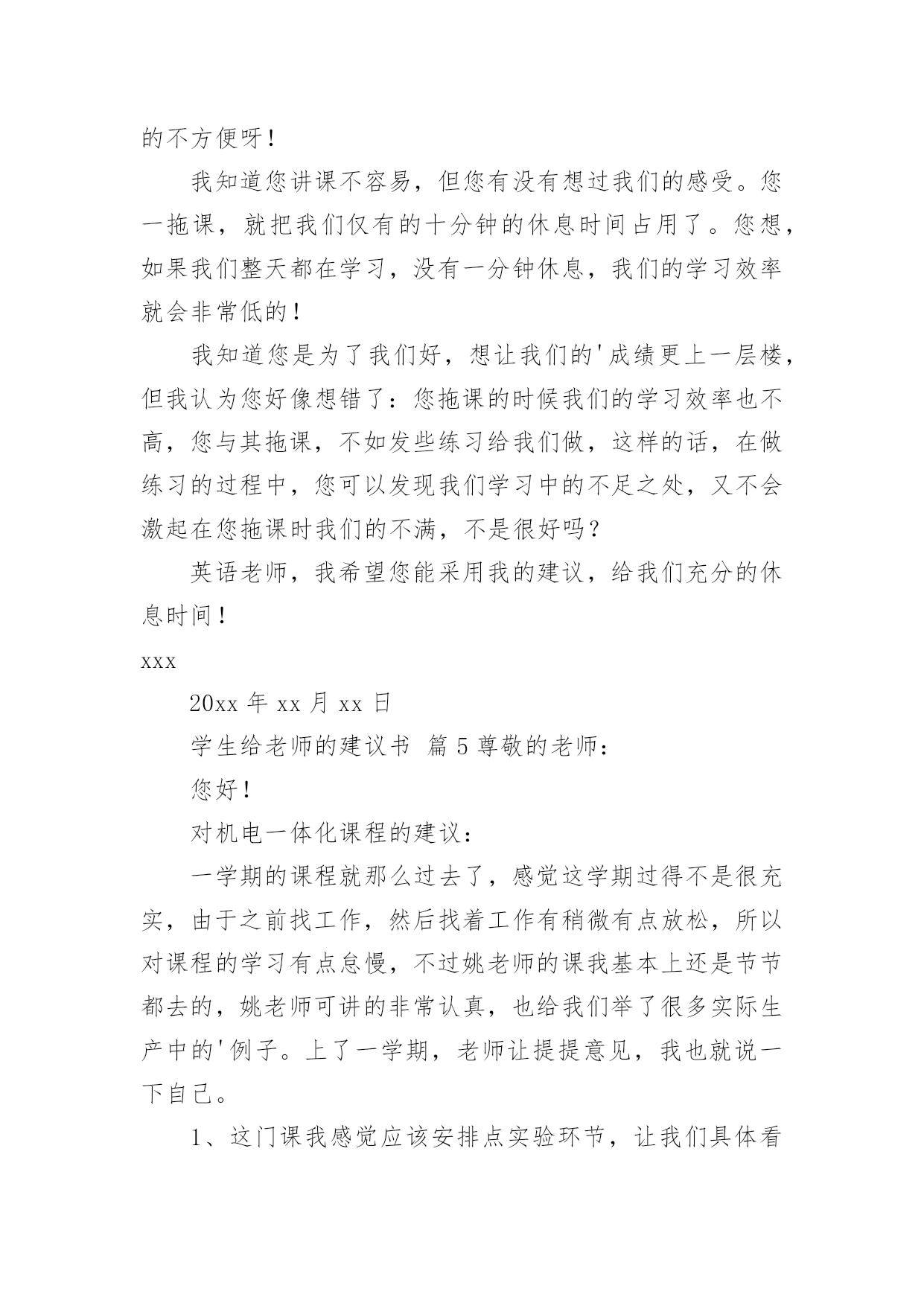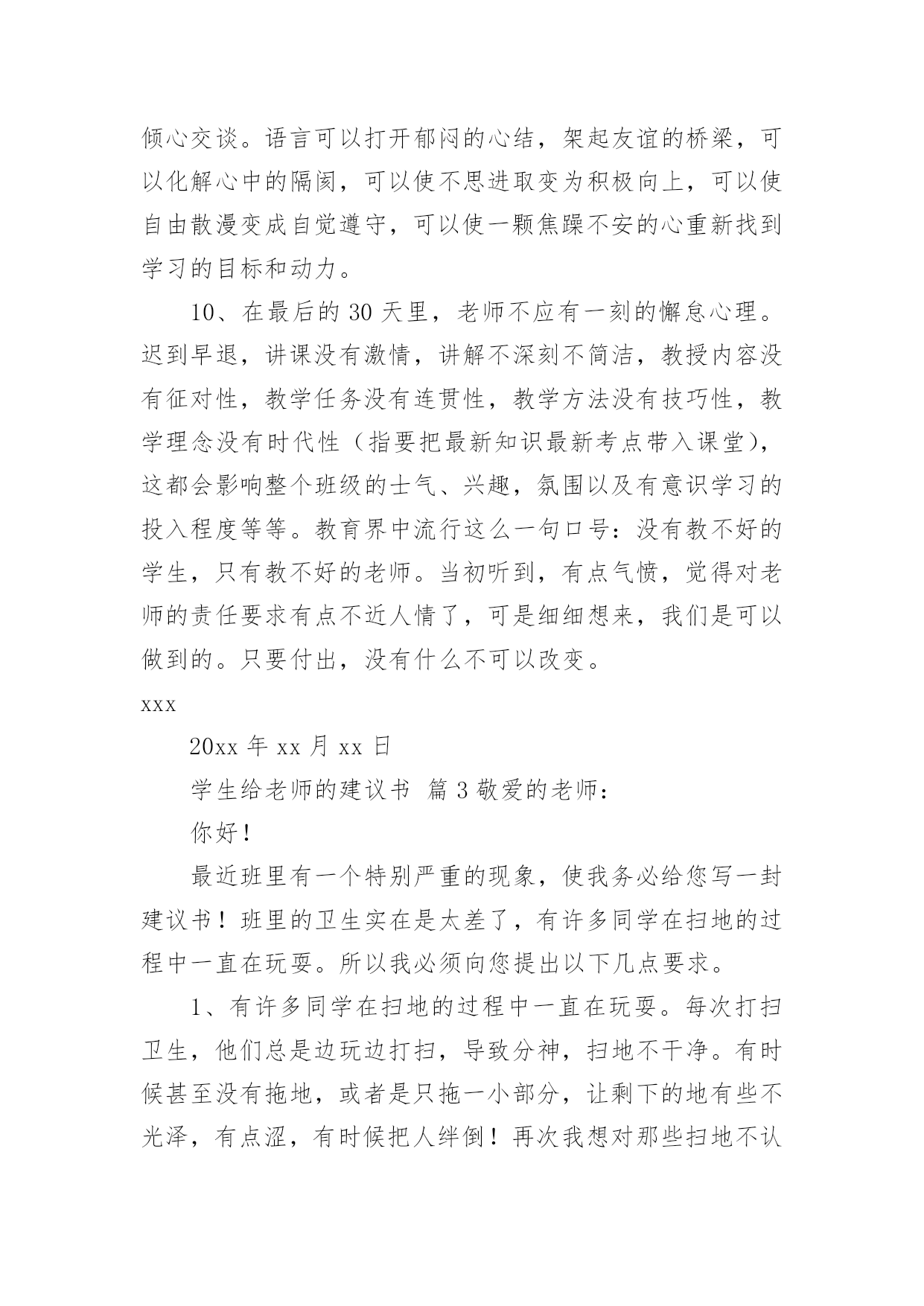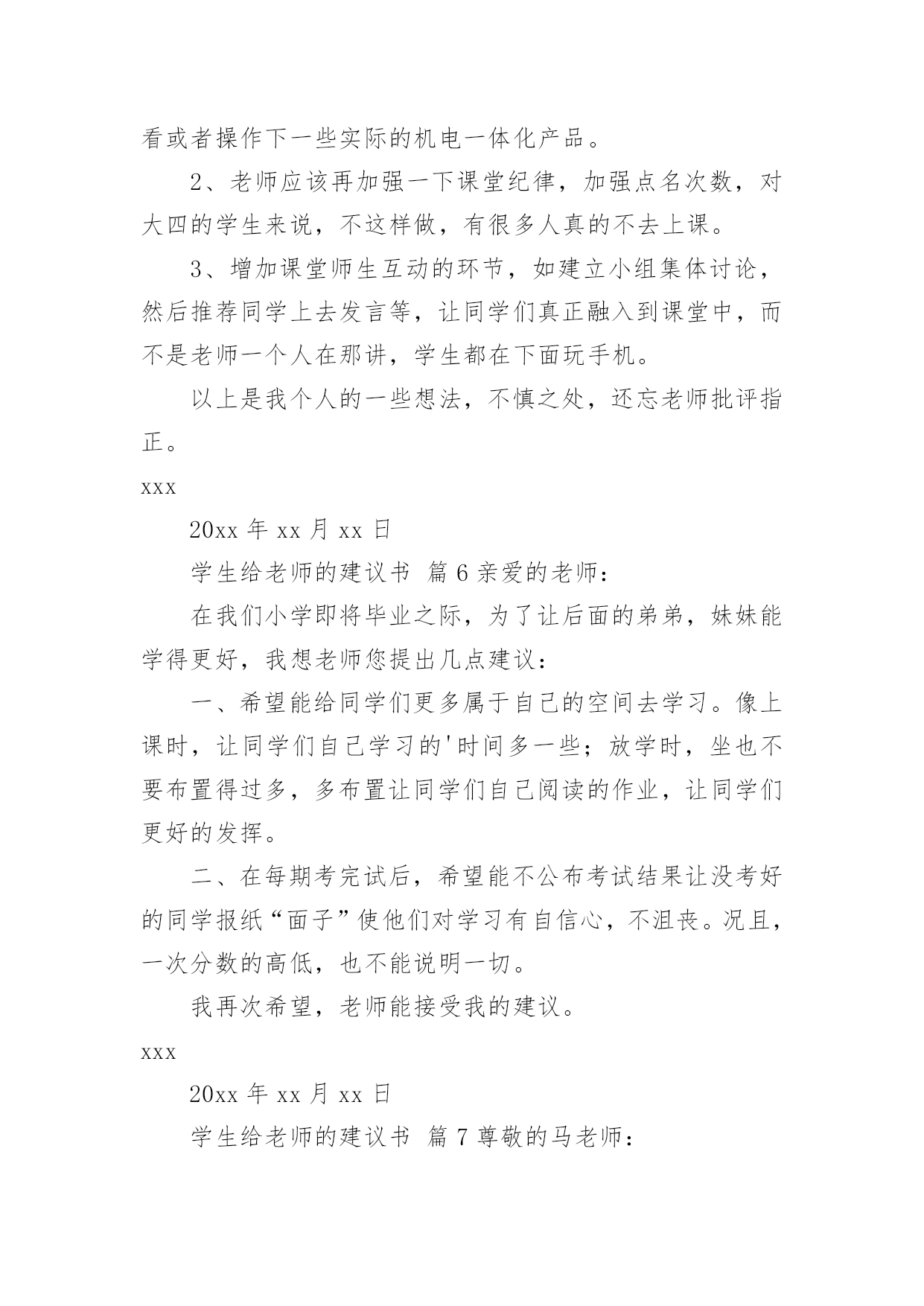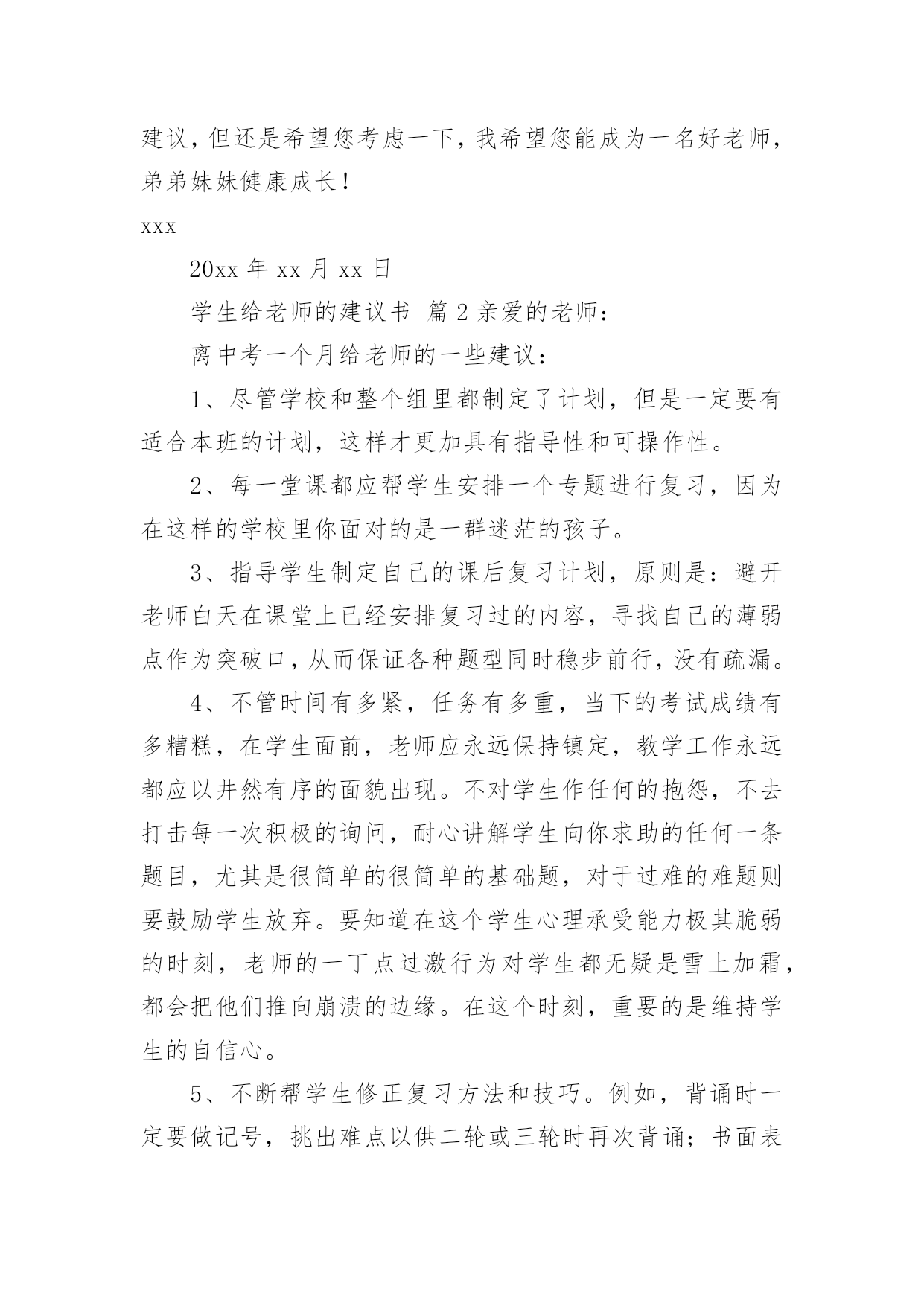 学生给老师的建议书学生给老师的建议书在生活中,用到建议书的地方越来越多,我们在写建议书时要分条列出建议的具体内容。为了让您在写建议书时更加简单方便,下面是小编精心整理的学生给老师的建议书,希望对大家有所帮助。学生给老师的建议书篇1敬爱的老师:您好!感谢您几年来对我们的照顾和教育,让我们茁壮成长。我已是六年级的学生了,在即将离开母校前,我为了以后的弟弟妹妹学得更好,在这里我向您提几点建议。为了满足学生们对书的渴望,您可以在班里举行一个“读书交流会”。每星期让一些读到好书的同学上讲台把这本书推荐给大家,让同学们有机会也找来读。还可以让同学们把自己认为好的一本书带回学校,找一个同学交换书带回家看,看完了再交换回来,再进行下一次交换。这不是可更广泛看书了吗?还有我建议老师您不要在班上公布同学们的成绩。因为这样可能导致成绩好的同学会过度骄傲,还会伤了成绩不理想的同学的'自尊心。对于成绩不理想的同学,你可以下课去找他谈谈,帮他找出原因。或者在试卷上写上一些鼓励的话语,他感觉到您对他的信任,自然就会努力学习,不会辜负您的期望。这不是一举两得吗?以上只是我的一些小小的建议,但还是希望您考虑一下,我希望您能成为一名好老师,弟弟妹妹健康成长!xxx20xx年xx月xx日学生给老师的建议书篇2亲爱的老师:离中考一个月给老师的一些建议:1、尽管学校和整个组里都制定了计划,但是一定要有适合本班的计划,这样才更加具有指导性和可操作性。2、每一堂课都应帮学生安排一个专题进行复习,因为在这样的学校里你面对的是一群迷茫的孩子。3、指导学生制定自己的课后复习计划,原则是:避开老师白天在课堂上已经安排复习过的内容,寻找自己的薄弱点作为突破口,从而保证各种题型同时稳步前行,没有疏漏。4、不管时间有多紧,任务有多重,当下的考试成绩有多糟糕,在学生面前,老师应永远保持镇定,教学工作永远都应以井然有序的面貌出现。不对学生作任何的抱怨,不去打击每一次积极的询问,耐心讲解学生向你求助的任何一条题目,尤其是很简单的很简单的基础题,对于过难的难题则要鼓励学生放弃。要知道在这个学生心理承受能力极其脆弱的时刻,老师的一丁点过激行为对学生都无疑是雪上加霜,都会把他们推向崩溃的边缘。在这个时刻,重要的是维持学生的自信心。5、不断帮学生修正复习方法和技巧。例如,背诵时一定要做记号,挑出难点以供二轮或三轮时再次背诵;书面表达中太难太深的表达建议学生适当去除或简化或替换;单项选择的'复习,则建议学生先背默知识点,然后直接做题,最后再把错题中的知识点提炼出来进行背默,如此这般,多次重复;完行和阅读则鼓励学生天天做,每天两篇阅读和一篇完形;任务型阅读适当训练,多加注意词形的变化,还有就是要收集此种题型中的热门词进行背诵;对于书面表达,更多的则是就着训练材料想想该写哪些内容,因为此时学生头脑中词汇是不欠缺的,缺的可能只是写作角度或内容。好的复习方法和技巧能够使学生在最短的时间里复习到最多的内容。6、最后一个月的练习严格执行限时训练。毫不留情地抛下不守时的学生,养成时间一到就公布答案的习惯,强迫他们养成限时训练的意识,这样,在时间上,高考试卷的完成才能做到游刃有余。7、作为老师,每天都得根据学生练习的反馈结果总结学生易错的,回忆自己教学中没有涉及的,以免造成知识点上大的疏漏。坚决杜绝因为自己的讲解不到位而使全班在某个考点上全军覆没、均分下降一两分或两三分的严重后果,这就属于是教学中的重大失误,是不可饶恕的。8、学会对学生更多地微笑,学会不失时机地跟学生开玩笑。刻意地制造轻松,缓解紧张。请记住:这个时刻,老师是学生主要的、重要的甚至是唯一的知识的依靠者,精神的支撑者,是艰难跋涉路途上的领头人。9、面对焦虑彷徨的学生,要适时给予真正语重心长的倾心交谈。语言可以打开郁闷的心结,架起友谊的桥梁,可以化解心中的隔阂,可以使不思进取变为积极向上,可以使自由散漫变成自觉遵守,可以使一颗焦躁不安的心重新找到学习的目标和动力。10、在最后的30天里,老师不应有一刻的懈怠心理。迟到早退,讲课没有激情,讲解不深刻不简洁,教授内容没有征对性,教学任务没有连贯性,教学方法没有技巧性,教学理念没有时代性(指要把最新知识最新考点带入课堂),这都会影响整个班级的士气、兴趣,氛围以及有意识学习的投入程度等等。教育界中流行这么一句口号:没有教不好的学生,只有教不好的老师。当初听到,有点气愤,觉得对老师的责任要求有点不近人情了,可是细细想来,我们是可以做到的。只要付出,没有什么不可以改变。xxx20xx年xx月xx日学生给老师的建议书篇3敬爱的老师:你好!最近班里有一个特别严重的现象,使我务必给您写一封建议书!班里的卫生实在是太差了,有许多同学在扫地的过程中一直在玩耍。所以我必须向您提出以下几点要求。1、有许多同学在扫地的过程中一直在