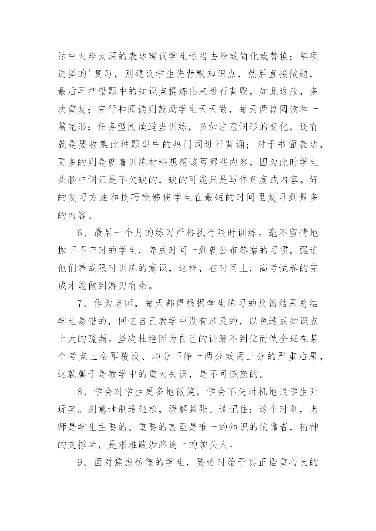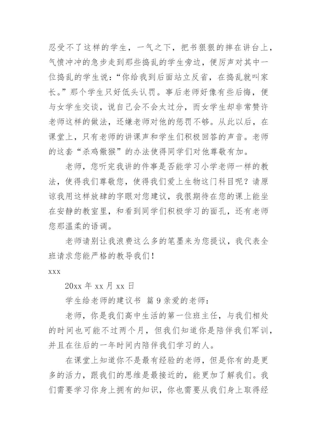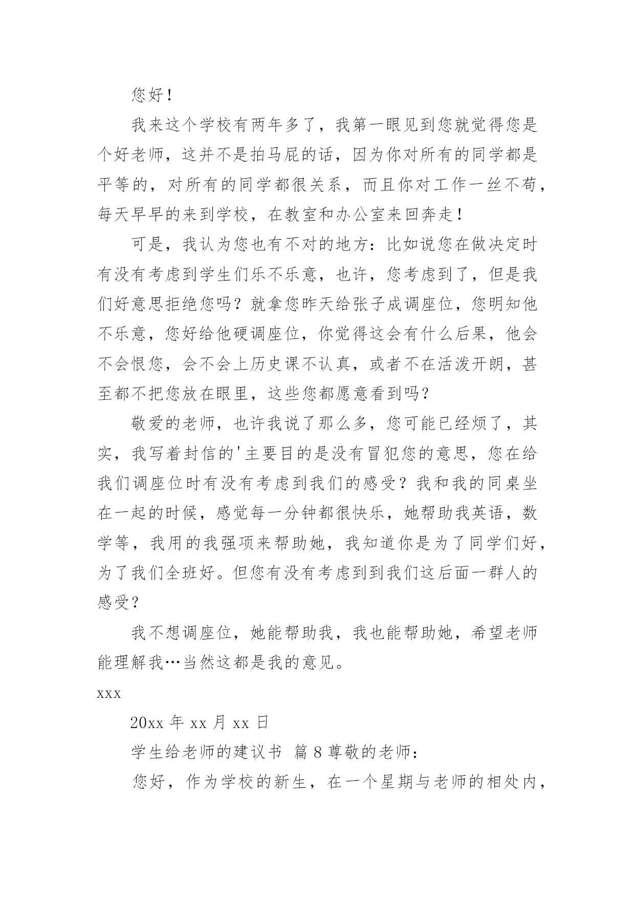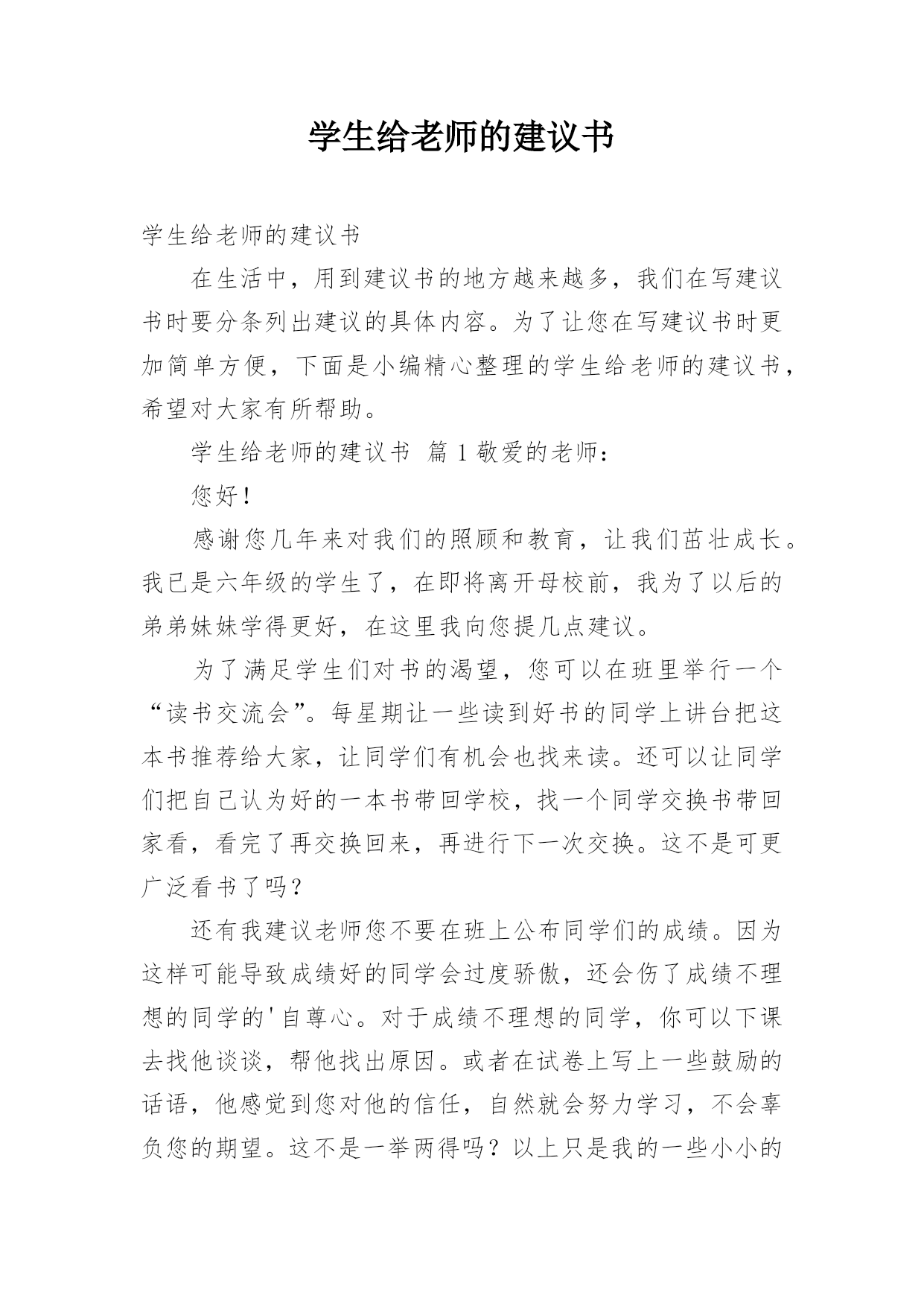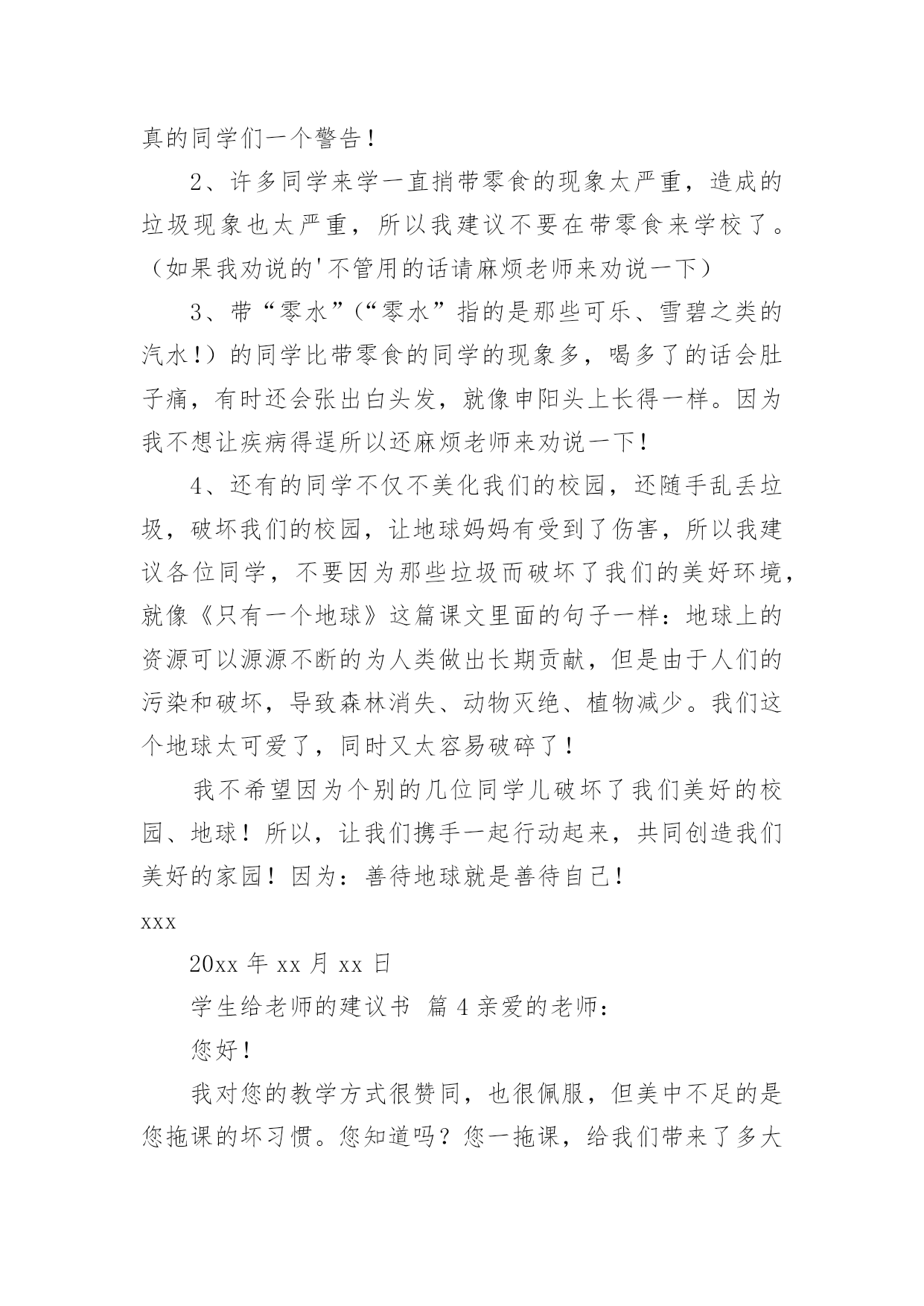 学生给老师的建议书学生给老师的建议书在生活中,用到建议书的地方越来越多,我们在写建议书时要分条列出建议的具体内容。为了让您在写建议书时更加简单方便,下面是小编精心整理的学生给老师的建议书,希望对大家有所帮助。学生给老师的建议书篇1敬爱的老师:您好!感谢您几年来对我们的照顾和教育,让我们茁壮成长。我已是六年级的学生了,在即将离开母校前,我为了以后的弟弟妹妹学得更好,在这里我向您提几点建议。为了满足学生们对书的渴望,您可以在班里举行一个“读书交流会”。每星期让一些读到好书的同学上讲台把这本书推荐给大家,让同学们有机会也找来读。还可以让同学们把自己认为好的一本书带回学校,找一个同学交换书带回家看,看完了再交换回来,再进行下一次交换。这不是可更广泛看书了吗?还有我建议老师您不要在班上公布同学们的成绩。因为这样可能导致成绩好的同学会过度骄傲,还会伤了成绩不理想的同学的'自尊心。对于成绩不理想的同学,你可以下课去找他谈谈,帮他找出原因。或者在试卷上写上一些鼓励的话语,他感觉到您对他的信任,自然就会努力学习,不会辜负您的期望。这不是一举两得吗?以上只是我的一些小小的建议,但还是希望您考虑一下,我希望您能成为一名好老师,弟弟妹妹健康成长!xxx20xx年xx月xx日学生给老师的建议书篇2亲爱的老师:离中考一个月给老师的一些建议:1、尽管学校和整个组里都制定了计划,但是一定要有适合本班的计划,这样才更加具有指导性和可操作性。2、每一堂课都应帮学生安排一个专题进行复习,因为在这样的学校里你面对的是一群迷茫的孩子。3、指导学生制定自己的课后复习计划,原则是:避开老师白天在课堂上已经安排复习过的内容,寻找自己的薄弱点作为突破口,从而保证各种题型同时稳步前行,没有疏漏。4、不管时间有多紧,任务有多重,当下的考试成绩有多糟糕,在学生面前,老师应永远保持镇定,教学工作永远都应以井然有序的面貌出现。不对学生作任何的抱怨,不去打击每一次积极的询问,耐心讲解学生向你求助的任何一条题目,尤其是很简单的很简单的基础题,对于过难的难题则要鼓励学生放弃。要知道在这个学生心理承受能力极其脆弱的时刻,老师的一丁点过激行为对学生都无疑是雪上加霜,都会把他们推向崩溃的边缘。在这个时刻,重要的是维持学生的自信心。5、不断帮学生修正复习方法和技巧。例如,背诵时一定要做记号,挑出难点以供二轮或三轮时再次背诵;书面表达中太难太深的表达建议学生适当去除或简化或替换;单项选择的'复习,则建议学生先背默知识点,然后直接做题,最后再把错题中的知识点提炼出来进行背默,如此这般,多次重复;完行和阅读则鼓励学生天天做,每天两篇阅读和一篇完形;任务型阅读适当训练,多加注意词形的变化,还有就是要收集此种题型中的热门词进行背诵;对于书面表达,更多的则是就着训练材料想想该写哪些内容,因为此时学生头脑中词汇是不欠缺的,缺的可能只是写作角度或内容。好的复习方法和技巧能够使学生在最短的时间里复习到最多的内容。6、最后一个月的练习严格执行限时训练。毫不留情地抛下不守时的学生,养成时间一到就公布答案的习惯,强迫他们养成限时训练的意识,这样,在时间上,高考试卷的完成才能做到游刃有余。7、作为老师,每天都得根据学生练习的反馈结果总结学生易错的,回忆自己教学中没有涉及的,以免造成知识点上大的疏漏。坚决杜绝因为自己的讲解不到位而使全班在某个考点上全军覆没、均分下降一两分或两三分的严重后果,这就属于是教学中的重大失误,是不可饶恕的。8、学会对学生更多地微笑,学会不失时机地跟学生开玩笑。刻意地制造轻松,缓解紧张。请记住:这个时刻,老师是学生主要的、重要的甚至是唯一的知识的依靠者,精神的支撑者,是艰难跋涉路途上的领头人。9、面对焦虑彷徨的学生,要适时给予真正语重心长的倾心交谈。语言可以打开郁闷的心结,架起友谊的桥梁,可以化解心中的隔阂,可以使不思进取变为积极向上,可以使自由散漫变成自觉遵守,可以使一颗焦躁不安的心重新找到学习的目标和动力。10、在最后的30天里,老师不应有一刻的懈怠心理。迟到早退,讲课没有激情,讲解不深刻不简洁,教授内容没有征对性,教学任务没有连贯性,教学方法没有技巧性,教学理念没有时代性(指要把最新知识最新考点带入课堂),这都会影响整个班级的士气、兴趣,氛围以及有意识学习的投入程度等等。教育界中流行这么一句口号:没有教不好的学生,只有教不好的老师。当初听到,有点气愤,觉得对老师的责任要求有点不近人情了,可是细细想来,我们是可以做到的。只要付出,没有什么不可以改变。xxx20xx年xx月xx日学生给老师的建议书篇3敬爱的老师:你好!最近班里有一个特别严重的现象,使我务必给您写一封建议书!班里的卫生实在是太差了,有许多同学在扫地的过程中一直在玩耍。所以我必须向您提出以下几点要求。1、有许多同学在扫地的过程中一直在