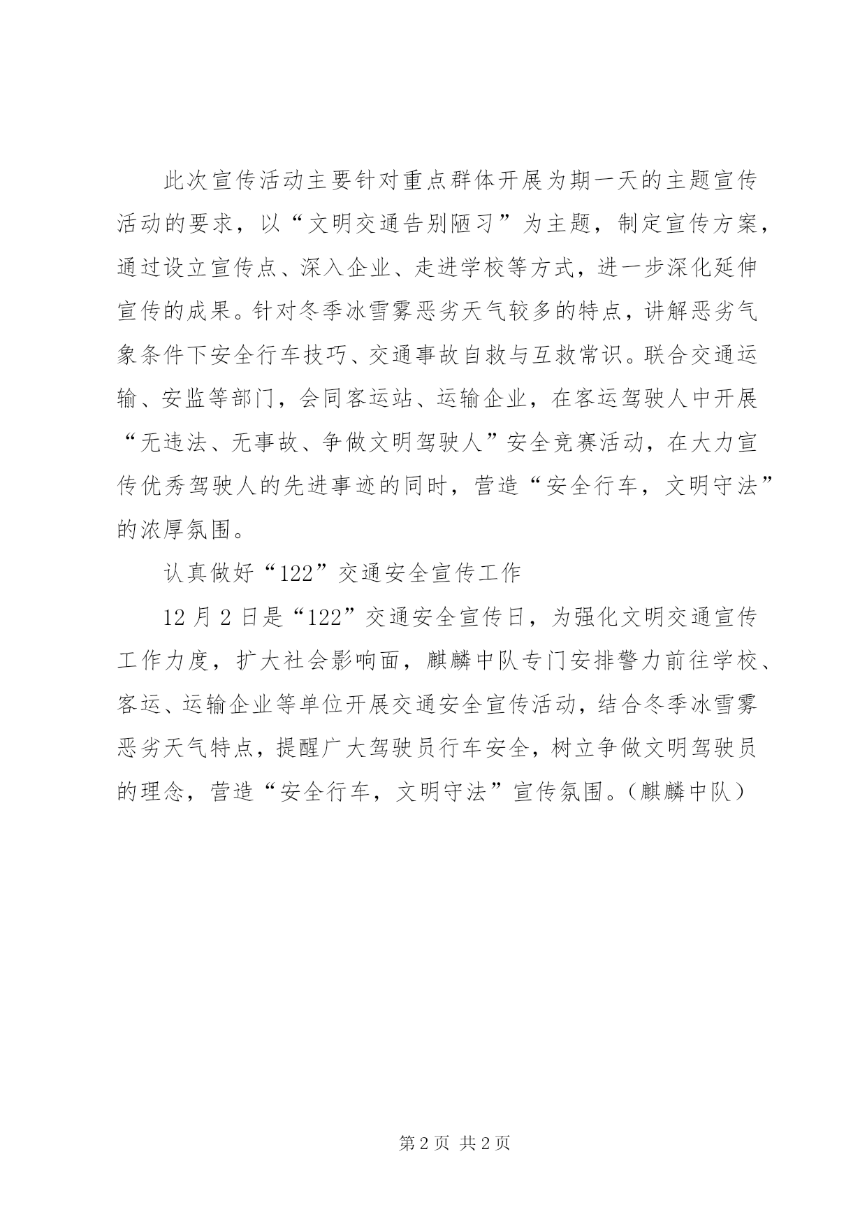 第PAGE\*Arabic\*MERGEFORMAT2页共NUMPAGES\*MERGEFORMAT2页122交通安全日教育讲稿麒麟中队认真部署“122”交通安全日宣传活动今年12月2日是全国第一个交通安全日。为搞好交通安全日宣传活动,强化文明交通宣传工作力度,扩大社会影响面,麒麟中队严密部署,确保宣传活动成效。一是提高认识,精心组织。中队领导要求民警充分认清公安部决定将每年12月2日定为交通安全日的重要性,要求民警认真学习公安部门关于开展“122”交通安全日宣传活动的有关要求,要以“文明交通告别陋习”为主题列出活动计划,备足宣传材料。通过大张旗鼓地宣传设立“122”交通安全日的目的和意义,对当天查处的“三超一疲”严重交通违法行为予以公开曝光,扩大“122”宣传日活动的影响。二是多措并举,强化效果。中队在活动当天在辖区收费站等人流车流密集场所开展交通安全日集中宣传活动。发动交通志愿者开展文明交通劝导。在此基础上,中队组织宣传小分队深入客运企业、客运场站开展交通安全咨询活动,对“122”交通安全日广泛告知。通过宣传让广大交通参与者进一步重视交通安全工作,树立人人做文明交通使者的理念。三是突出重点,集中宣传。此次宣传活动主要针对重点群体开展为期一天的主题宣传活动的要求,以“文明交通告别陋习”为主题,制定宣传方案,通过设立宣传点、深入企业、走进学校等方式,进一步深化延伸宣传的成果。针对冬季冰雪雾恶劣天气较多的特点,讲解恶劣气象条件下安全行车技巧、交通事故自救与互救常识。联合交通运输、安监等部门,会同客运站、运输企业,在客运驾驶人中开展“无违法、无事故、争做文明驾驶人”安全竞赛活动,在大力宣传优秀驾驶人的先进事迹的同时,营造“安全行车,文明守法”的浓厚氛围。认真做好“122”交通安全宣传工作12月2日是“122”交通安全宣传日,为强化文明交通宣传工作力度,扩大社会影响面,麒麟中队专门安排警力前往学校、客运、运输企业等单位开展交通安全宣传活动,结合冬季冰雪雾恶劣天气特点,提醒广大驾驶员行车安全,树立争做文明驾驶员的理念,营造“安全行车,文明守法”宣传氛围。(麒麟中队)