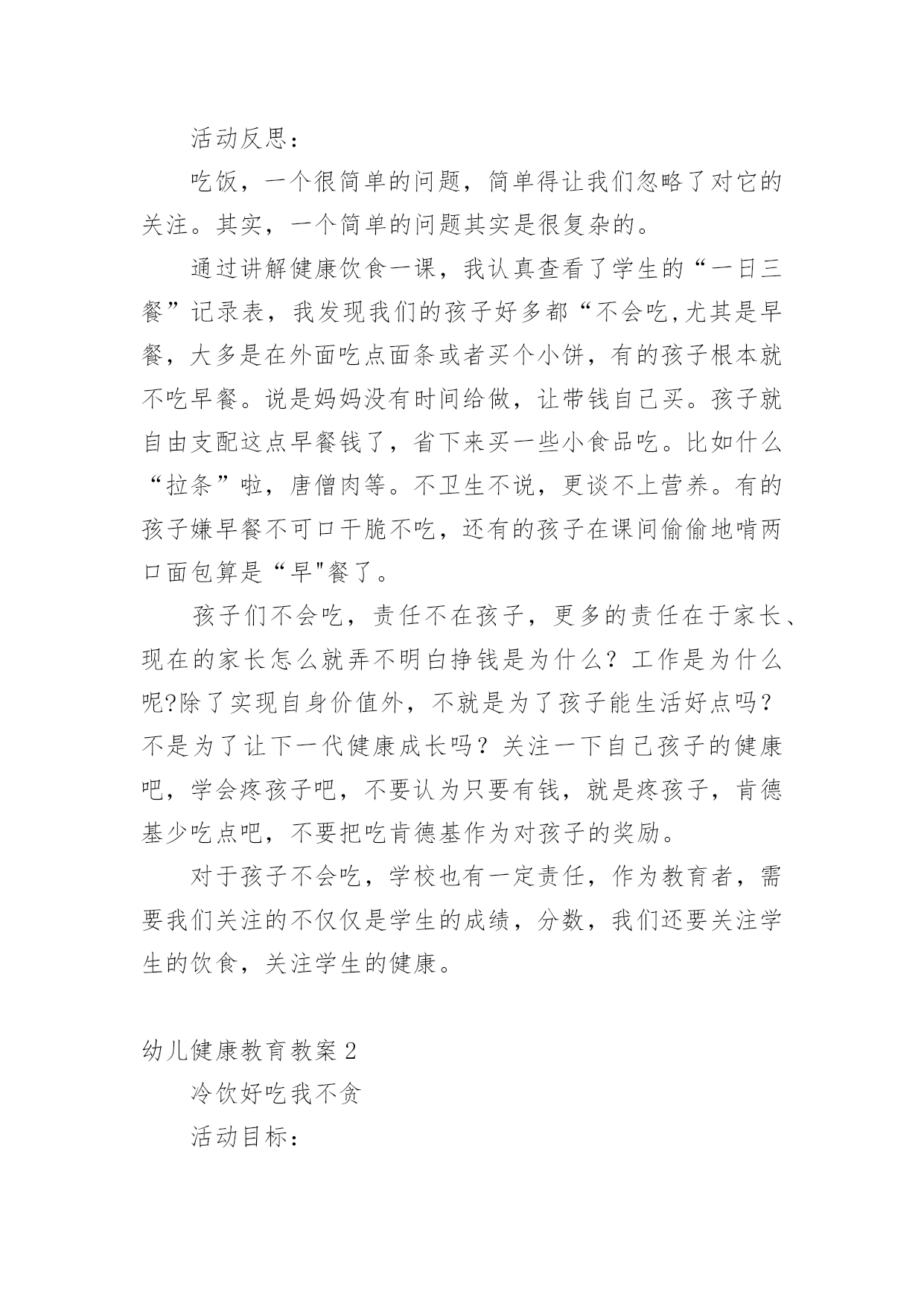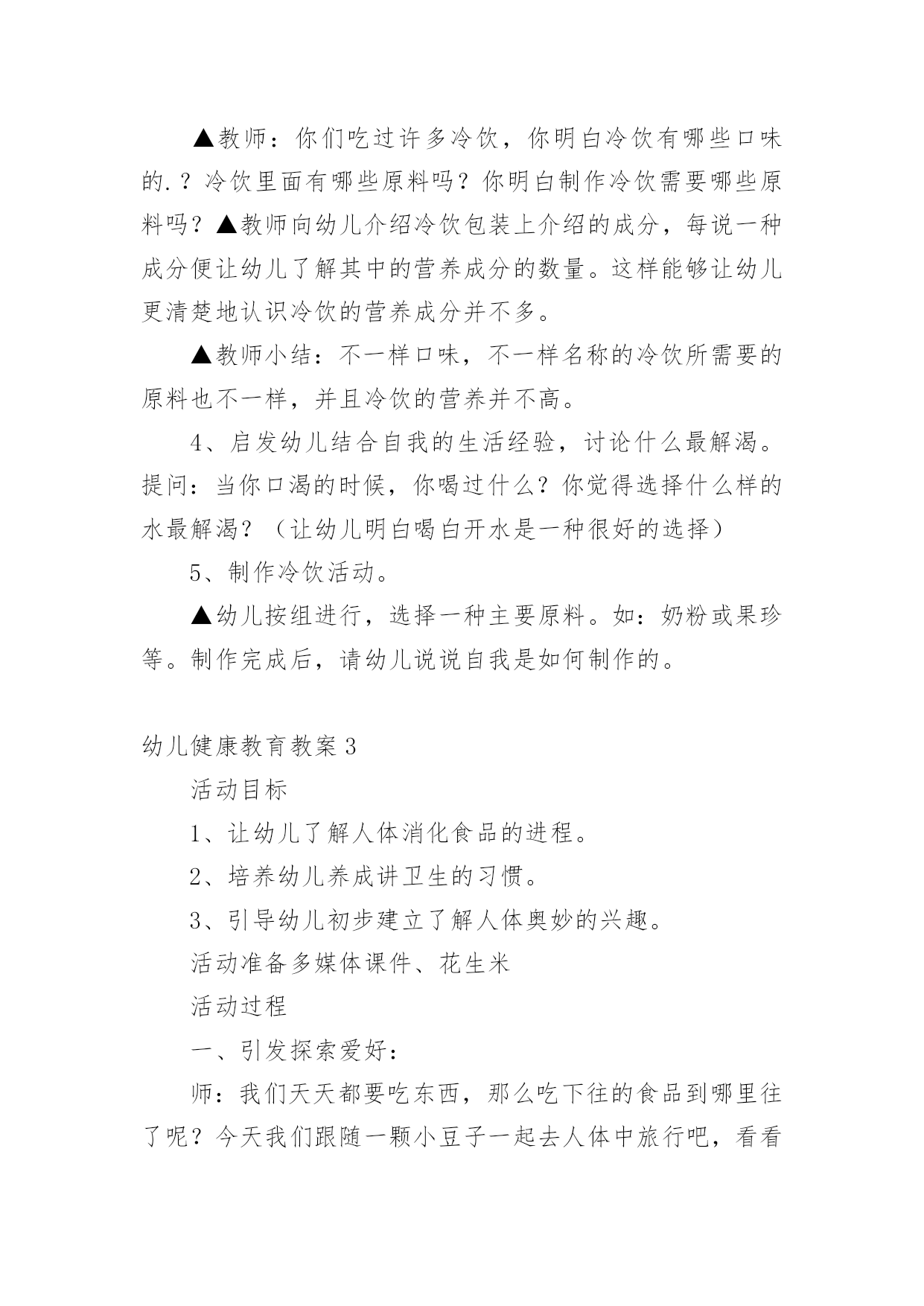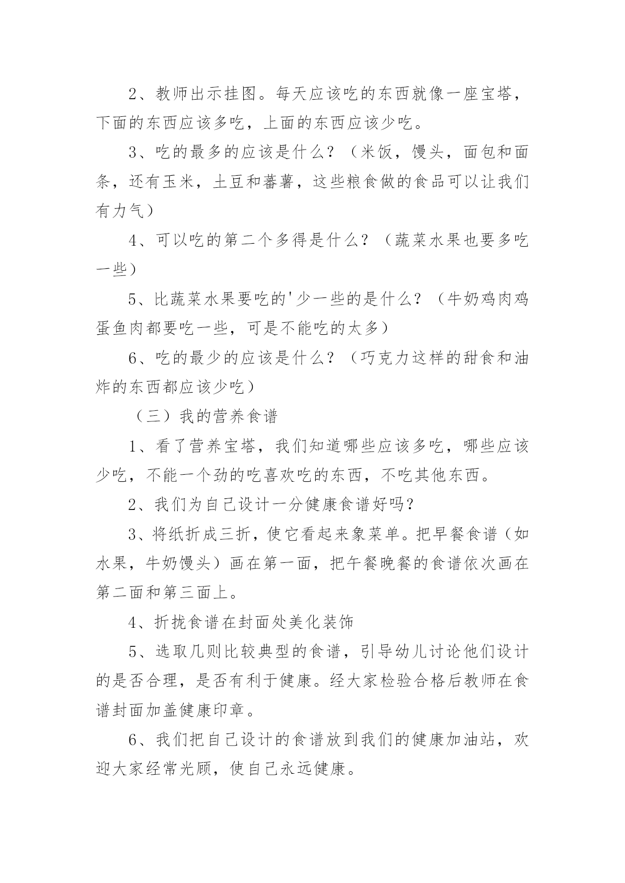 幼儿健康教育教案作为一名辛苦耕耘的教育工作者,常常需要准备教案,教案有利于教学水平的提高,有助于教研活动的开展。那么大家知道正规的教案是怎么写的吗?以下是小编收集整理的幼儿健康教育教案,仅供参考,希望能够帮助到大家。幼儿健康教育教案1活动目标:1、了解合理的营养结构。2、为自己设计营养食谱。3、积极的参与活动,大胆的说出自己的想法。4、初步养成良好的卫生习惯。活动准备:准备制作营养食谱的纸笔人手一份活动过程:(一)我最喜欢吃我们小朋友都以自己喜欢吃的东西,要是让你随便吃,您能吃多少?幼儿自由发言,可适当引导,如你喜欢吃冰激凌吗?你能吃下多少?(二)营养宝塔1、小朋友吃想吃很多很多喜欢的东西,这样合适吗?哪些东西应该多吃,哪些应该少吃?2、教师出示挂图。每天应该吃的东西就像一座宝塔,下面的东西应该多吃,上面的东西应该少吃。3、吃的最多的应该是什么?(米饭,馒头,面包和面条,还有玉米,土豆和蕃薯,这些粮食做的食品可以让我们有力气)4、可以吃的第二个多得是什么?(蔬菜水果也要多吃一些)5、比蔬菜水果要吃的'少一些的是什么?(牛奶鸡肉鸡蛋鱼肉都要吃一些,可是不能吃的太多)6、吃的最少的应该是什么?(巧克力这样的甜食和油炸的东西都应该少吃)(三)我的营养食谱1、看了营养宝塔,我们知道哪些应该多吃,哪些应该少吃,不能一个劲的吃喜欢吃的东西,不吃其他东西。2、我们为自己设计一分健康食谱好吗?3、将纸折成三折,使它看起来象菜单。把早餐食谱(如水果,牛奶馒头)画在第一面,把午餐晚餐的食谱依次画在第二面和第三面上。4、折拢食谱在封面处美化装饰5、选取几则比较典型的食谱,引导幼儿讨论他们设计的是否合理,是否有利于健康。经大家检验合格后教师在食谱封面加盖健康印章。6、我们把自己设计的食谱放到我们的健康加油站,欢迎大家经常光顾,使自己永远健康。活动反思:吃饭,一个很简单的问题,简单得让我们忽略了对它的关注。其实,一个简单的问题其实是很复杂的。通过讲解健康饮食一课,我认真查看了学生的“一日三餐”记录表,我发现我们的孩子好多都“不会吃,尤其是早餐,大多是在外面吃点面条或者买个小饼,有的孩子根本就不吃早餐。说是妈妈没有时间给做,让带钱自己买。孩子就自由支配这点早餐钱了,省下来买一些小食品吃。比如什么“拉条”啦,唐僧肉等。不卫生不说,更谈不上营养。有的孩子嫌早餐不可口干脆不吃,还有的孩子在课间偷偷地啃两口面包算是“早"餐了。孩子们不会吃,责任不在孩子,更多的责任在于家长、现在的家长怎么就弄不明白挣钱是为什么?工作是为什么呢?除了实现自身价值外,不就是为了孩子能生活好点吗?不是为了让下一代健康成长吗?关注一下自己孩子的健康吧,学会疼孩子吧,不要认为只要有钱,就是疼孩子,肯德基少吃点吧,不要把吃肯德基作为对孩子的奖励。对于孩子不会吃,学校也有一定责任,作为教育者,需要我们关注的不仅仅是学生的成绩,分数,我们还要关注学生的饮食,关注学生的健康。幼儿健康教育教案2冷饮好吃我不贪活动目标:1、了解冷饮中的一些成分,明白冷饮的一些小常识,能够有选择地食用冷饮。2、结合一些具体的事例,了解多吃冷饮害处多。3、在自制冷饮的过程中,体会操作的欢乐。活动准备:1、活动前请家长帮忙幼儿了解有关冷饮的一些小常识。如:冷饮中的多种成分,对身体有利的和无利的甚至是有害的成分┉2、自制冷饮的饮料:奶粉、不一样口味的果珍、苹果汁、蜂蜜、糖、筷子┉3、教师收集一些冷饮的外包装。活动过程:1、组织幼儿进行谈话活动。提议提下列问题:▲我明白小朋友都喜欢吃冷饮,你们都吃过哪些冷饮?▲你最喜欢吃哪些冷饮,它是什么味道的?▲你为什么喜欢吃冷饮?吃冷饮有哪些用处?▲吃冷饮又有哪些不好的地方?(幼儿自由讨论)2、教师小结:冷饮虽然好吃,异常是在夏天,吃了冷饮会让我们感觉很舒服、很凉爽,但冷饮吃多了,我们的肚子会提意见了,肚子不喜欢太冷的东西,它碰到太冷的食品就会生病。冷饮大多是很甜的,人体内如果有了太多甜的食物,会影响食欲,让我们不想吃其他的食物,长期下来我们身体没有了其他营养来补充,就生病了,会营养不良。3、了解冷饮中的成分和营养量。▲教师:你们吃过许多冷饮,你明白冷饮有哪些口味的.?冷饮里面有哪些原料吗?你明白制作冷饮需要哪些原料吗?▲教师向幼儿介绍冷饮包装上介绍的成分,每说一种成分便让幼儿了解其中的营养成分的数量。这样能够让幼儿更清楚地认识冷饮的营养成分并不多。▲教师小结:不一样口味,不一样名称的冷饮所需要的原料也不一样,并且冷饮的营养并不高。4、启发幼儿结合自我的生活经验,讨论什么最解渴。提问:当你口渴的时候,你喝过什么?你觉得选择什么样的水最解渴?(让幼儿明白喝白开水是一种很好的选择)5、制作冷饮活动。▲幼儿按组进行,选择一种主要原料。如:奶粉或果珍等。制作完成后,请幼儿说说自我是如何制作的。