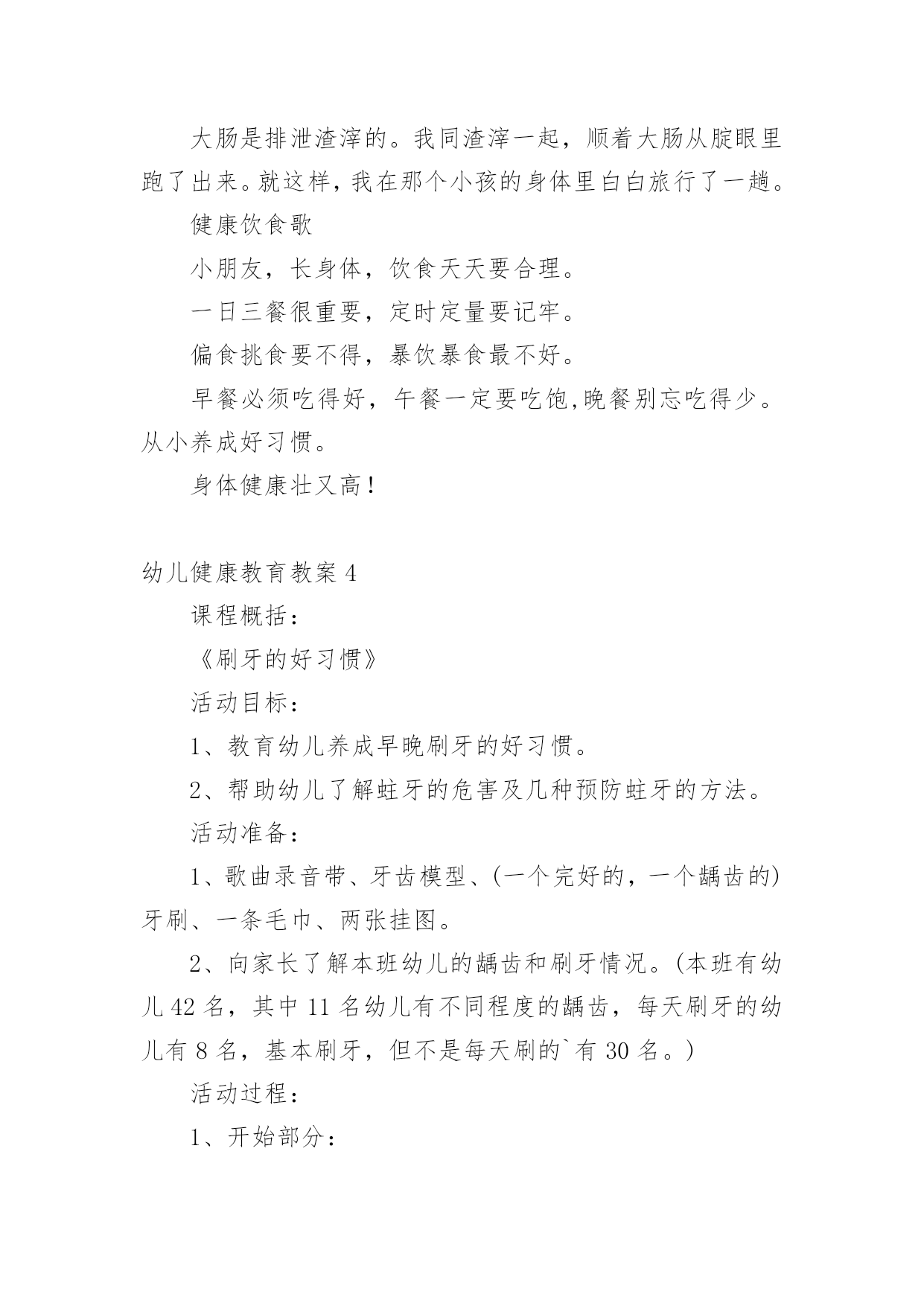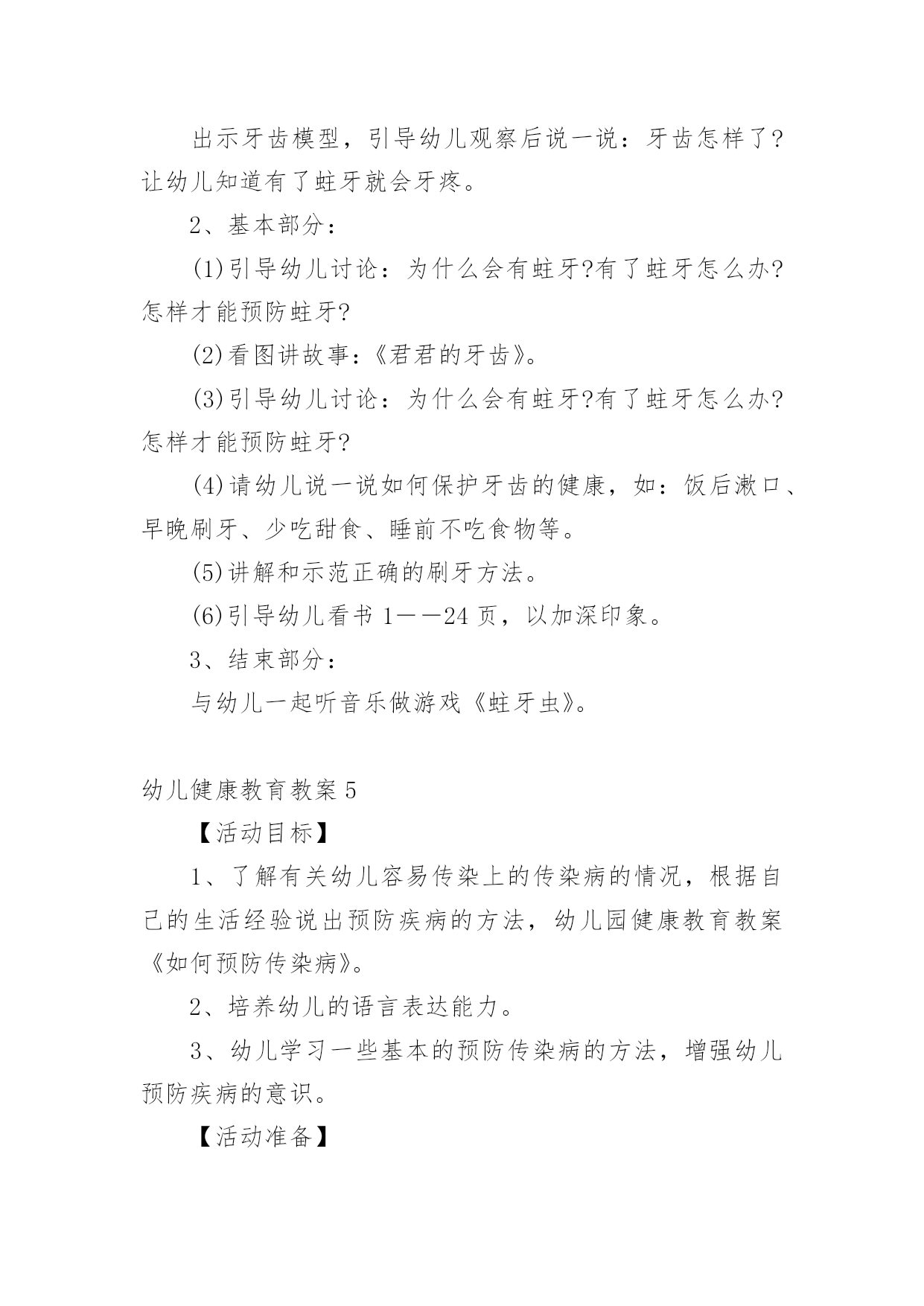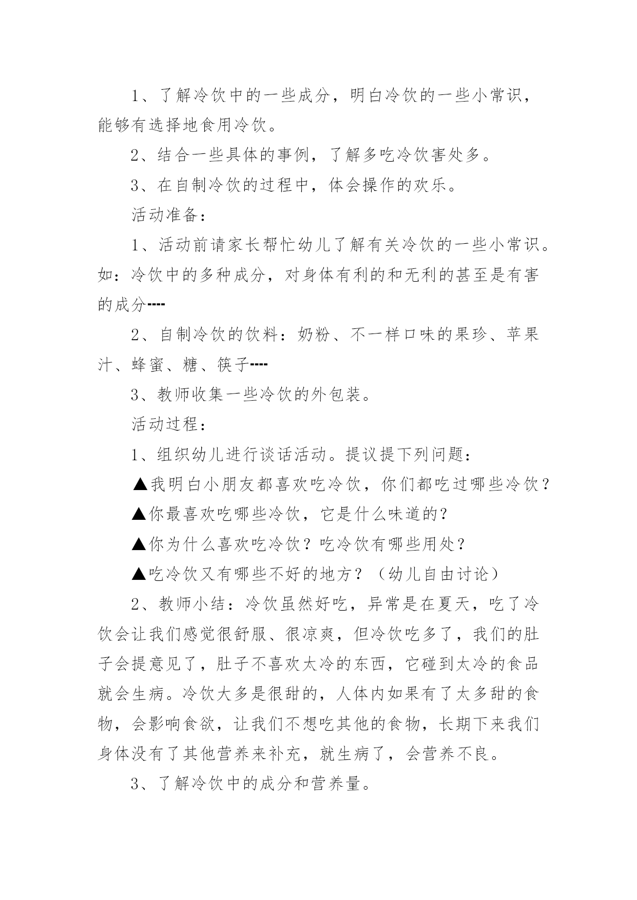 幼儿健康教育教案作为一名辛苦耕耘的教育工作者,常常需要准备教案,教案有利于教学水平的提高,有助于教研活动的开展。那么大家知道正规的教案是怎么写的吗?以下是小编收集整理的幼儿健康教育教案,仅供参考,希望能够帮助到大家。幼儿健康教育教案1活动目标:1、了解合理的营养结构。2、为自己设计营养食谱。3、积极的参与活动,大胆的说出自己的想法。4、初步养成良好的卫生习惯。活动准备:准备制作营养食谱的纸笔人手一份活动过程:(一)我最喜欢吃我们小朋友都以自己喜欢吃的东西,要是让你随便吃,您能吃多少?幼儿自由发言,可适当引导,如你喜欢吃冰激凌吗?你能吃下多少?(二)营养宝塔1、小朋友吃想吃很多很多喜欢的东西,这样合适吗?哪些东西应该多吃,哪些应该少吃?2、教师出示挂图。每天应该吃的东西就像一座宝塔,下面的东西应该多吃,上面的东西应该少吃。3、吃的最多的应该是什么?(米饭,馒头,面包和面条,还有玉米,土豆和蕃薯,这些粮食做的食品可以让我们有力气)4、可以吃的第二个多得是什么?(蔬菜水果也要多吃一些)5、比蔬菜水果要吃的'少一些的是什么?(牛奶鸡肉鸡蛋鱼肉都要吃一些,可是不能吃的太多)6、吃的最少的应该是什么?(巧克力这样的甜食和油炸的东西都应该少吃)(三)我的营养食谱1、看了营养宝塔,我们知道哪些应该多吃,哪些应该少吃,不能一个劲的吃喜欢吃的东西,不吃其他东西。2、我们为自己设计一分健康食谱好吗?3、将纸折成三折,使它看起来象菜单。把早餐食谱(如水果,牛奶馒头)画在第一面,把午餐晚餐的食谱依次画在第二面和第三面上。4、折拢食谱在封面处美化装饰5、选取几则比较典型的食谱,引导幼儿讨论他们设计的是否合理,是否有利于健康。经大家检验合格后教师在食谱封面加盖健康印章。6、我们把自己设计的食谱放到我们的健康加油站,欢迎大家经常光顾,使自己永远健康。活动反思:吃饭,一个很简单的问题,简单得让我们忽略了对它的关注。其实,一个简单的问题其实是很复杂的。通过讲解健康饮食一课,我认真查看了学生的“一日三餐”记录表,我发现我们的孩子好多都“不会吃,尤其是早餐,大多是在外面吃点面条或者买个小饼,有的孩子根本就不吃早餐。说是妈妈没有时间给做,让带钱自己买。孩子就自由支配这点早餐钱了,省下来买一些小食品吃。比如什么“拉条”啦,唐僧肉等。不卫生不说,更谈不上营养。有的孩子嫌早餐不可口干脆不吃,还有的孩子在课间偷偷地啃两口面包算是“早"餐了。孩子们不会吃,责任不在孩子,更多的责任在于家长、现在的家长怎么就弄不明白挣钱是为什么?工作是为什么呢?除了实现自身价值外,不就是为了孩子能生活好点吗?不是为了让下一代健康成长吗?关注一下自己孩子的健康吧,学会疼孩子吧,不要认为只要有钱,就是疼孩子,肯德基少吃点吧,不要把吃肯德基作为对孩子的奖励。对于孩子不会吃,学校也有一定责任,作为教育者,需要我们关注的不仅仅是学生的成绩,分数,我们还要关注学生的饮食,关注学生的健康。幼儿健康教育教案2冷饮好吃我不贪活动目标:1、了解冷饮中的一些成分,明白冷饮的一些小常识,能够有选择地食用冷饮。2、结合一些具体的事例,了解多吃冷饮害处多。3、在自制冷饮的过程中,体会操作的欢乐。活动准备:1、活动前请家长帮忙幼儿了解有关冷饮的一些小常识。如:冷饮中的多种成分,对身体有利的和无利的甚至是有害的成分┉2、自制冷饮的饮料:奶粉、不一样口味的果珍、苹果汁、蜂蜜、糖、筷子┉3、教师收集一些冷饮的外包装。活动过程:1、组织幼儿进行谈话活动。提议提下列问题:▲我明白小朋友都喜欢吃冷饮,你们都吃过哪些冷饮?▲你最喜欢吃哪些冷饮,它是什么味道的?▲你为什么喜欢吃冷饮?吃冷饮有哪些用处?▲吃冷饮又有哪些不好的地方?(幼儿自由讨论)2、教师小结:冷饮虽然好吃,异常是在夏天,吃了冷饮会让我们感觉很舒服、很凉爽,但冷饮吃多了,我们的肚子会提意见了,肚子不喜欢太冷的东西,它碰到太冷的食品就会生病。冷饮大多是很甜的,人体内如果有了太多甜的食物,会影响食欲,让我们不想吃其他的食物,长期下来我们身体没有了其他营养来补充,就生病了,会营养不良。3、了解冷饮中的成分和营养量。▲教师:你们吃过许多冷饮,你明白冷饮有哪些口味的.?冷饮里面有哪些原料吗?你明白制作冷饮需要哪些原料吗?▲教师向幼儿介绍冷饮包装上介绍的成分,每说一种成分便让幼儿了解其中的营养成分的数量。这样能够让幼儿更清楚地认识冷饮的营养成分并不多。▲教师小结:不一样口味,不一样名称的冷饮所需要的原料也不一样,并且冷饮的营养并不高。4、启发幼儿结合自我的生活经验,讨论什么最解渴。提问:当你口渴的时候,你喝过什么?你觉得选择什么样的水最解渴?(让幼儿明白喝白开水是一种很好的选择)5、制作冷饮活动。▲幼儿按组进行,选择一种主要原料。如:奶粉或果珍等。制作完成后,请幼儿说说自我是如何制作的。