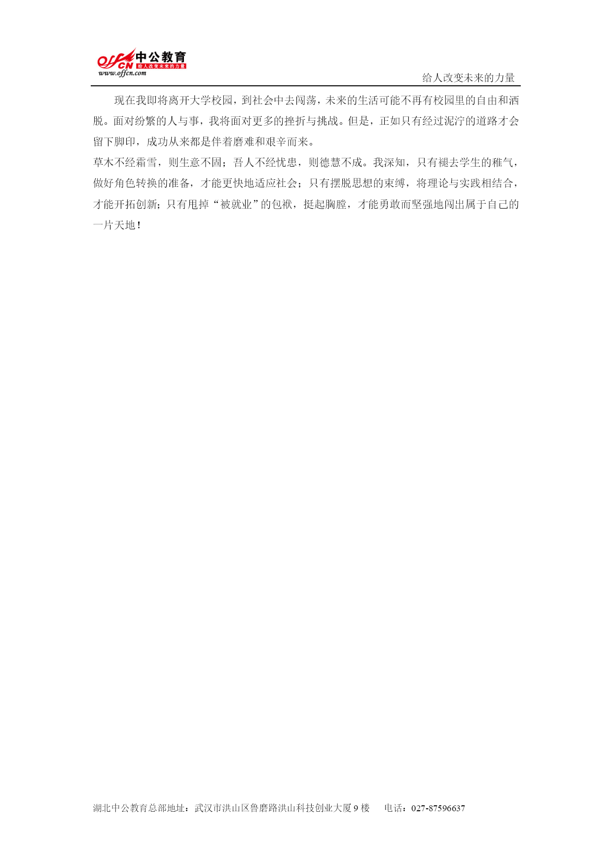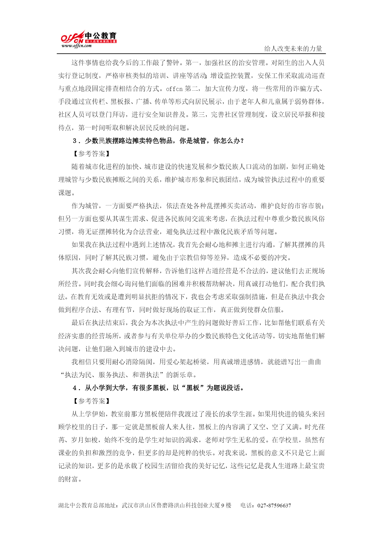 给人改变未来的力量湖北中公教育总部地址:武汉市洪山区鲁磨路洪山科技创业大厦9楼电话:027-87596637扫描我公考小助手(微信号:huoffcn)实时提供公考动态HYPERLINK"http://hu.offcn.com/zg/2013skmszt/index.html"\t"_blank"2013湖北公务员面试六步完美备考HYPERLINK"http://hu.offcn.com/zg/2013skcj/index.html"\t"_blank"15万助学基金免费领取HYPERLINK"http://hu.offcn.com/zg/2013cjcxyy/index.html"\t"_blank"湖北公务员笔试成绩查询预约HYPERLINK"http://hu.offcn.com/zg/2013hbgkjz/index.html"\t"_blank"湖北省公务员面试专业专项备考讲座HYPERLINK"http://hu.offcn.com/html/2013/04/23868.html"\t"_blank"湖北公务员笔试成绩及面试名单HYPERLINK"http://hu.offcn.com/zg/hbqq/index.html"\t"_blank"湖北公务员面试专业专项QQ群HYPERLINK"http://edu.offcn.com/13mszt/hubei.html"\l"mxb"\t"_blank"99元让你从面试0基础到领跑者名师主讲,限时抢购中...1.有人说,一个人的能力强,与竞争对手有关,你怎么看?【参考答案】这句话有一定的道理。竞争是我们所处时代的主题,竞争对手可以激发个人的潜力与斗志,促进个人能力的快速提升。以高考为例,由于录取人数恒定,考生只有自身实力超过对手,才有进入名牌院校的可能。这样,每个人都在不断与对手竞争的过程中迅速成长、变得更强。当然竞争对手只是促使个人能力提升的外因,内因在个人能力提升中起着更为关键的作用,即人们对待挫折、困难的态度,是否具有百折不挠的毅力和奋斗的精神。一个成功的竞争者应该经得起风雨,具有抗挫折的能力。在竞争中流泪是弱者,只有在困境中奋起,才能成为强者,获得认同。法国物理学家伦琴小时候学习成绩很好,但比较顽皮。一次,学校以不尊重师长为理由,开除了他的学籍,因为没有中学毕业证他丧失了报考大学的机会。几经挫折与努力,伦琴终于以优异的成绩考取苏黎士学院,可毕业时学校又因他的履历问题拒绝他作一位知名教授的助手。面对种种挫折,伦琴从来没有放弃,而是激流勇进、迎难而上。经过20年的努力,他终于担任了德国沃滋堡大学的校长。并且因为发现X射线获得诺贝尔物理学奖,在高手如林的物理学殿堂占据一席之地。因此,个人能力的提升与竞争对手有关,但是起决定作用的仍是自身的努力。2.你是社区负责人,有老年人上健康培训讲座受骗,你怎么办?【参考答案】作为社区的负责人,我有责任为居民排忧解难,维护每个公民的利益;同时配合相关部门的工作,共同为群众营造一个和谐安全的社区环境。老人受骗,首先我会向老人了解具体经过,受伤害程度,是身体受到了一定的伤害还是经济上受到了损失。如果身体上感到不适,我会马上和家属取得联系,在安抚情绪的同时送往医疗部门及时接受治疗,避免产生严重后果。如果是经济上受到损失,我会及时和公安机关取得联系,提供老人和相关参与者的口述资料和物证,积极配合其工作,争取早日将嫌疑人归案,平复老人的心灵创伤。这件事情也给我今后的工作敲了警钟。第一,加强社区的治安管理。对陌生的出入人员实行登记制度,严格审核类似的培训、讲座等活动;增设监控装置,安保工作采取流动巡查与重点地段固定排查相结合的方式。offcn第二,加大宣传力度,将一些常用的诈骗方式、手段通过宣传栏、黑板报、广播、传单等形式向居民展示,由于老年人和儿童属于弱势群体,社区人员可以登门拜访,进行安全知识普及。第三,完善社区管理制度,设立居民举报和接待点,第一时间听取和解决居民反映的问题。3.少数民族摆路边摊卖特色物品,你是城管,你怎么办?【参考答案】随着城市化进程的加快、城市建设的快速发展和少数民族人口流动的加剧,如何正确处理城管与少数民族摊贩之间的关系,维护城市形象和民族团结,成为城管执法过程中的重要课题。作为城管,一方面要严格执法,依法查处各种乱摆摊买卖活动,维护良好的市容市貌;但另一方面也要从其谋生需求、促进各民族间交流来考虑,在执法过程中尊重少数民族风俗习惯,将无证摆摊转化为合法营业,避免执法过程中激化民族矛盾等问题。如果我在执法过程中遇到上述情况,我首先会耐心地和摊主进行沟通,了解其摆摊的具体原因,同时了解其民族习惯,避免由于宗教信仰等差异,造成不必要的冲